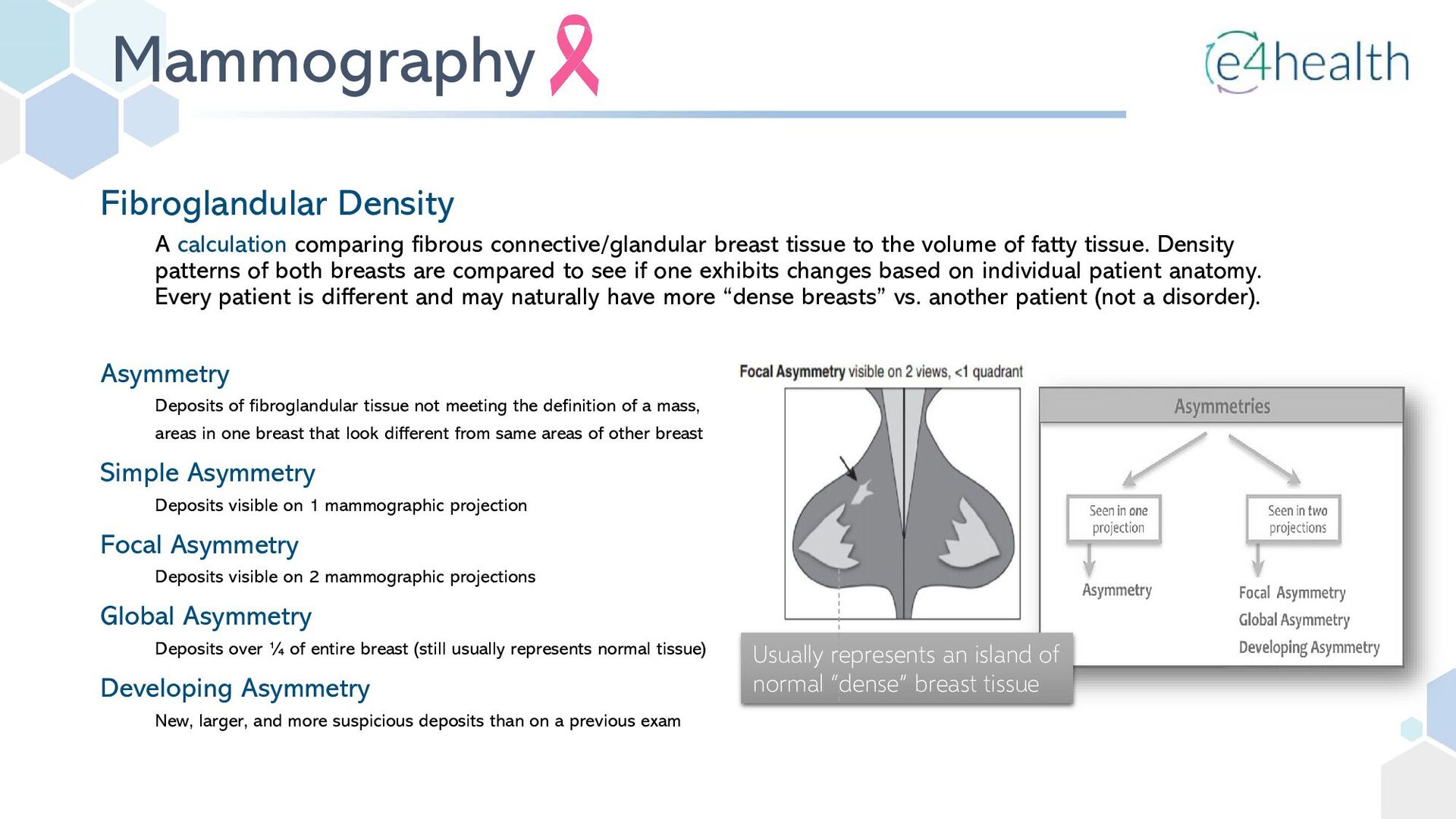 to the volume of fatty tissue. Density patterns of both breasts are compared to see if one exhibits changes based on individual patient anatomy. Every patient is different and may naturally have more “dense breasts” vs. another patient (not a disorder). Asymmetry Deposits of fibroglandular tissue not meeting the definition of a mass, areas in one breast that look different from same areas of other breast Simple Asymmetry Deposits visible on 1 mammographic projection Focal Asymmetry Deposits visible on 2 mammographic projections Global Asymmetry Deposits over ¼ of entire breast (still usually represents normal tissue) Developing Asymmetry New, larger, and more suspicious deposits than on a previous exam Usually represents an island of normal “dense” breast tissue