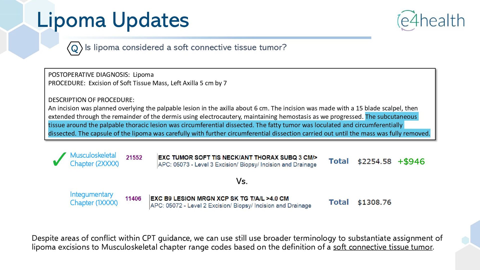 POSTOPERATIVE DIAGNOSIS: Lipoma PROCEDURE: Excision of Soft Tissue Mass, Left Axilla 5 cm by 7 DESCRIPTION OF PROCEDURE: An incision was planned overlying the palpable lesion in the axilla about 6 cm. The incision was made with a 15 blade scalpel, then extended through the remainder of the dermis using electrocautery, maintaining hemostasis as we progressed. The subcutaneous tissue around the palpable thoracic lesion was circumferential dissected. The fatty tumor was loculated and circumferentially dissected. The capsule of the lipoma was carefully with further circumferential dissection carried out until the mass was fully removed. Vs. Musculoskeletal Chapter (2XXXX) Integumentary Chapter (1XXXX) +$946 Despite areas of conflict within CPT guidance, we can use still use broader terminology to substantiate assignment of lipoma excisions to Musculoskeletal chapter range codes based on the definition of a soft connective tissue tumor.