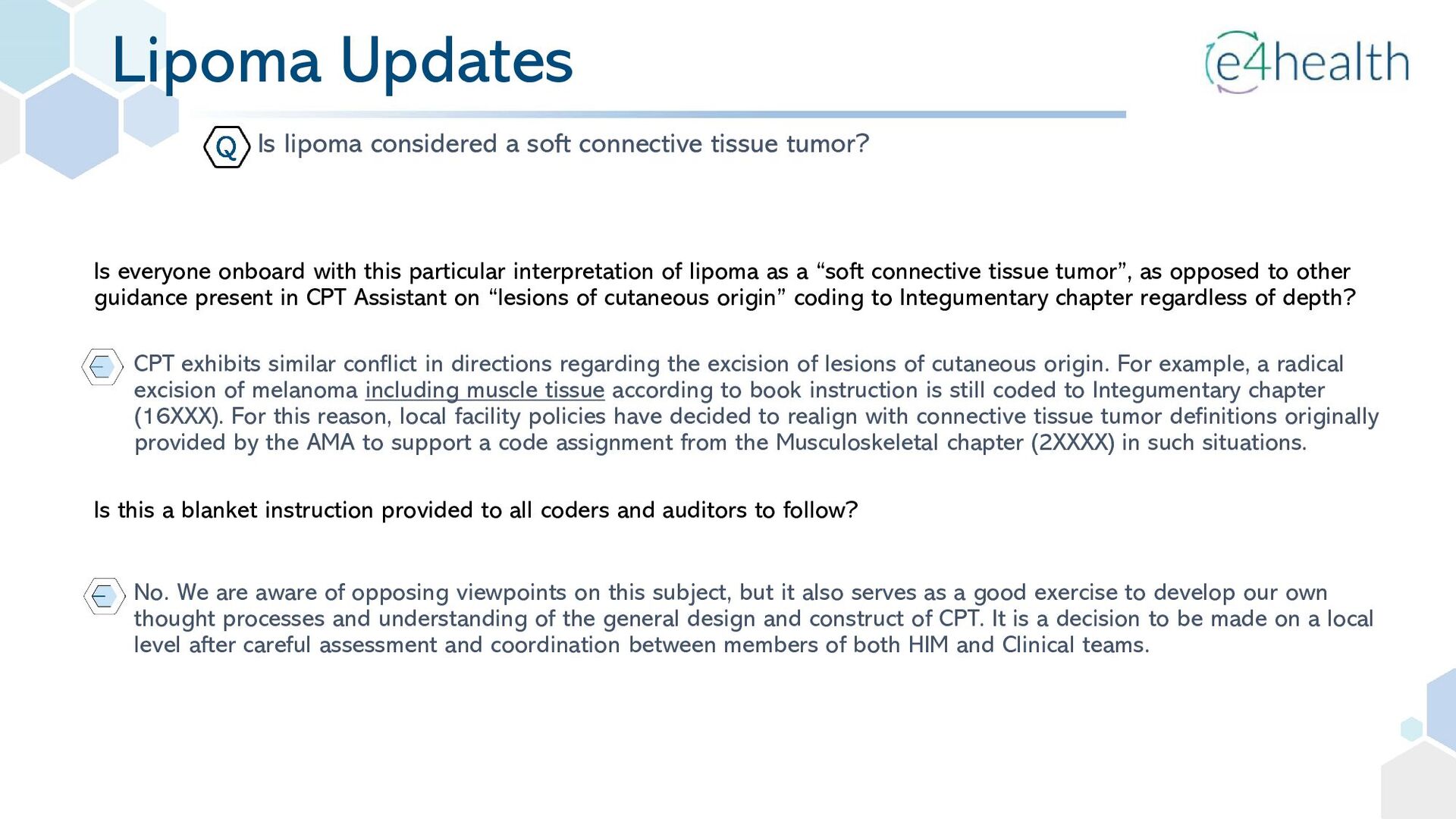 Is everyone onboard with this particular interpretation of lipoma as a “soft connective tissue tumor”, as opposed to other guidance present in CPT Assistant on “lesions of cutaneous origin” coding to Integumentary chapter regardless of depth? CPT exhibits similar conflict in directions regarding the excision of lesions of cutaneous origin. For example, a radical excision of melanoma including muscle tissue according to book instruction is still coded to Integumentary chapter (16XXX). For this reason, local facility policies have decided to realign with connective tissue tumor definitions originally provided by the AMA to support a code assignment from the Musculoskeletal chapter (2XXXX) in such situations. Is this a blanket instruction provided to all coders and auditors to follow? No. We are aware of opposing viewpoints on this subject, but it also serves as a good exercise to develop our own thought processes and understanding of the general design and construct of CPT. It is a decision to be made on a local level after careful assessment and coordination between members of both HIM and Clinical teams.