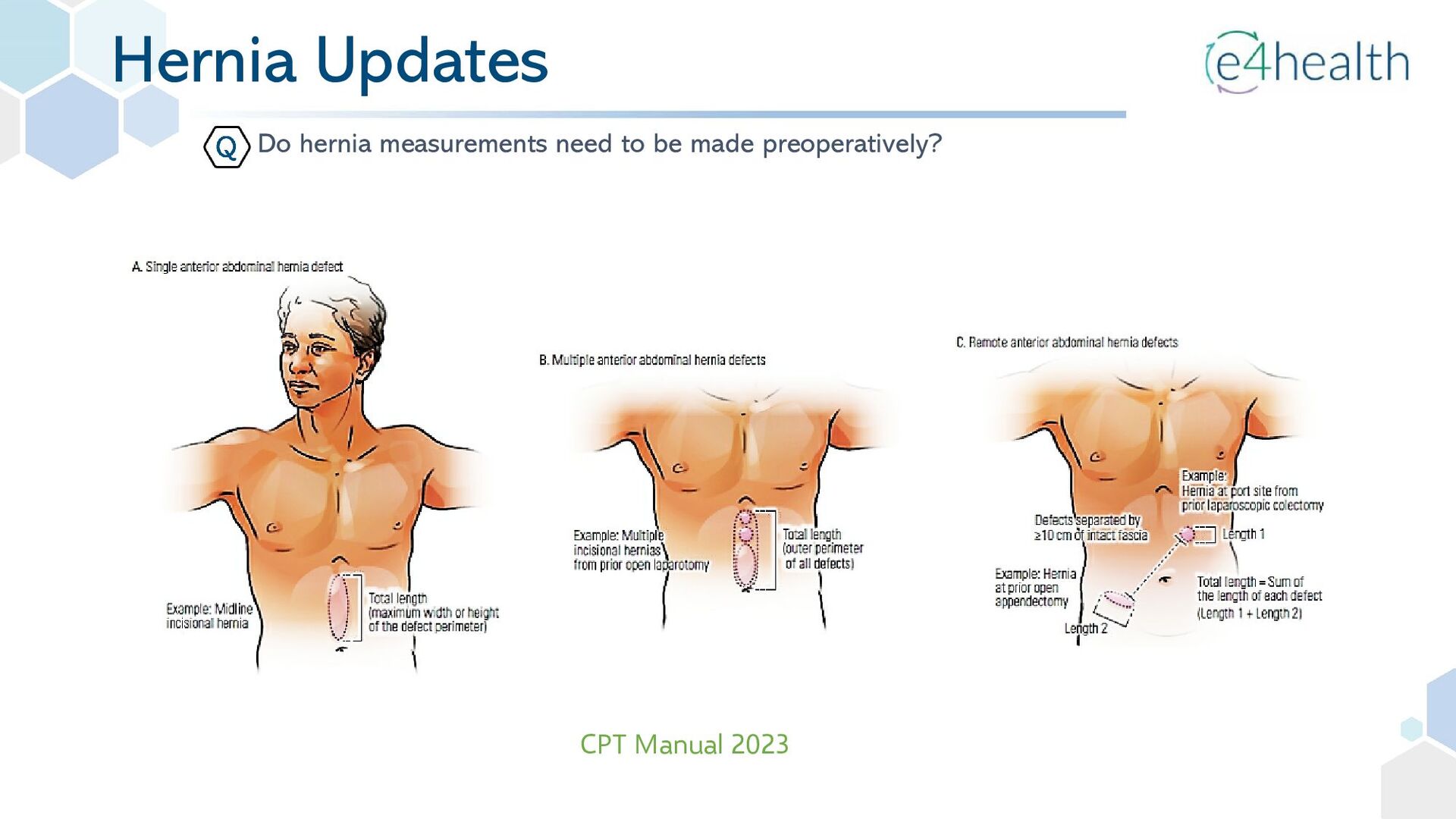•49591 Repair of anterior abdominal hernia(s) (ie, epigastric, incisional, ventral, umbilical, spigelian), any approach (ie, open, laparoscopic, robotic), initial, including implantation of mesh or other prosthesis when performed, total length of defect(s); less than 3 cm, reducible • 49592 less than 3 cm, incarcerated or strangulated • 49593 3 cm to 10 cm, reducible • 49594 3 cm to 10 cm, incarcerated or strangulated • 49595 greater than 10 cm, reducible • 49596 greater than 10 cm, incarcerated or strangulated Abdomen, Peritoneum, and Omentum (2023 CPT Revisions) “The width of the hernia defect was defined as the greatest horizontal distance in cm between the lateral margins of the hernia defect on both sides. In case of multiple hernia defects, the width is measured between the most laterally located margins of the most lateral defect on that side” “Because no consensus was reached on the variable “size of the hernia defect”, it was not possible to make a “grid format” for an EHS classification for incisional abdominal wall hernias”. -NLOM