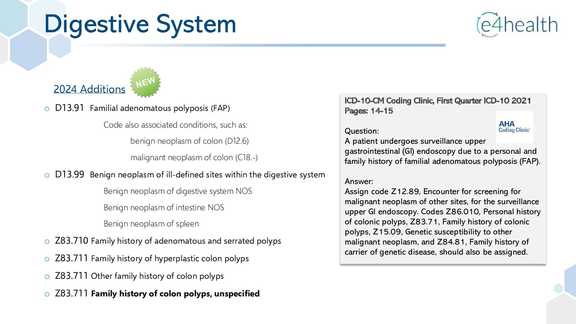 associated conditions, such as: benign neoplasm of colon (D12.6) malignant neoplasm of colon (C18.-) o D13.99 Benign neoplasm of ill-defined sites within the digestive system Benign neoplasm of digestive system NOS Benign neoplasm of intestine NOS Benign neoplasm of spleen o Z83.710 Family history of adenomatous and serrated polyps o Z83.711 Family history of hyperplastic colon polyps o Z83.711 Other family history of colon polyps o Z83.711 Family history of colon polyps, unspecified 2024 Additions ICD-10-CM Coding Clinic, First Quarter ICD-10 2021 Pages: 14-15 Question: A patient undergoes surveillance upper gastrointestinal (GI) endoscopy due to a personal and family history of familial adenomatous polyposis (FAP). Answer: Assign code Z12.89, Encounter for screening for malignant neoplasm of other sites, for the surveillance upper GI endoscopy. Codes Z86.010, Personal history of colonic polyps, Z83.71, Family history of colonic polyps, Z15.09, Genetic susceptibility to other malignant neoplasm, and Z84.81, Family history of carrier of genetic disease, should also be assigned.