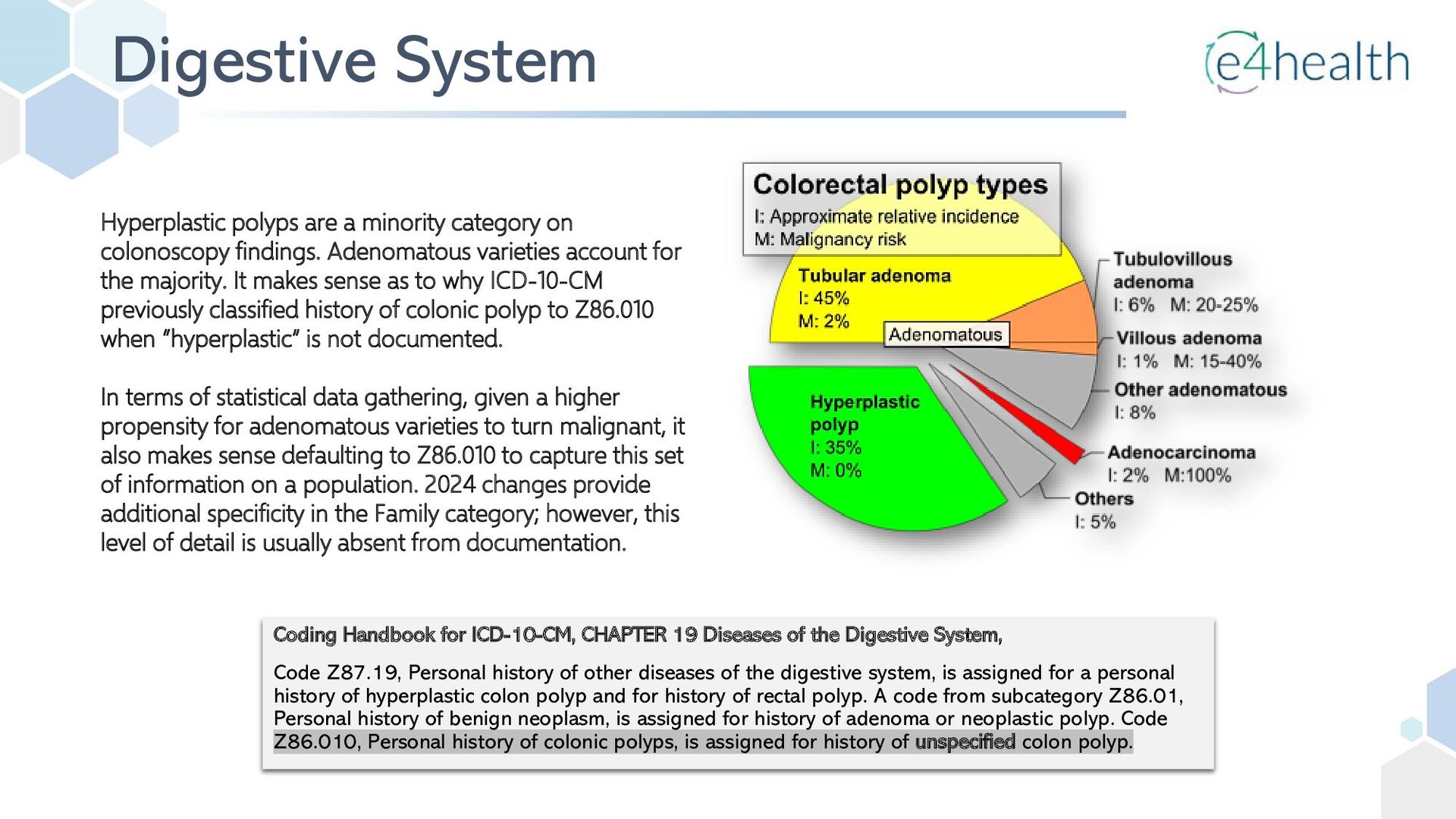 findings. Adenomatous varieties account for the majority. It makes sense as to why ICD-10-CM previously classified history of colonic polyp to Z86.010 when “hyperplastic” is not documented. In terms of statistical data gathering, given a higher propensity for adenomatous varieties to turn malignant, it also makes sense defaulting to Z86.010 to capture this set of information on a population. 2024 changes provide additional specificity in the Family category; however, this level of detail is usually absent from documentation. Coding Handbook for ICD-10-CM, CHAPTER 19 Diseases of the Digestive System, Code Z87.19, Personal history of other diseases of the digestive system, is assigned for a personal history of hyperplastic colon polyp and for history of rectal polyp. A code from subcategory Z86.01, Personal history of benign neoplasm, is assigned for history of adenoma or neoplastic polyp. Code Z86.010, Personal history of colonic polyps, is assigned for history of unspecified colon polyp.