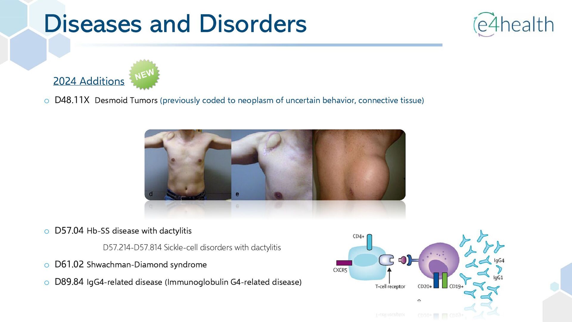 neoplasm of uncertain behavior, connective tissue) o D57.04 Hb-SS disease with dactylitis D57.214-D57.814 Sickle-cell disorders with dactylitis o D61.02 Shwachman-Diamond syndrome o D89.84 IgG4-related disease (Immunoglobulin G4-related disease) 2024 Additions