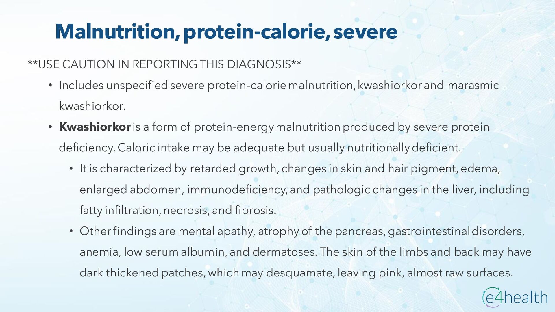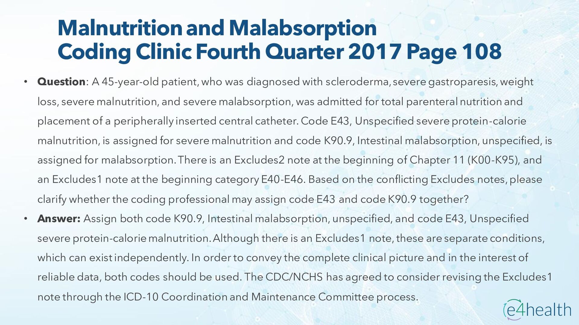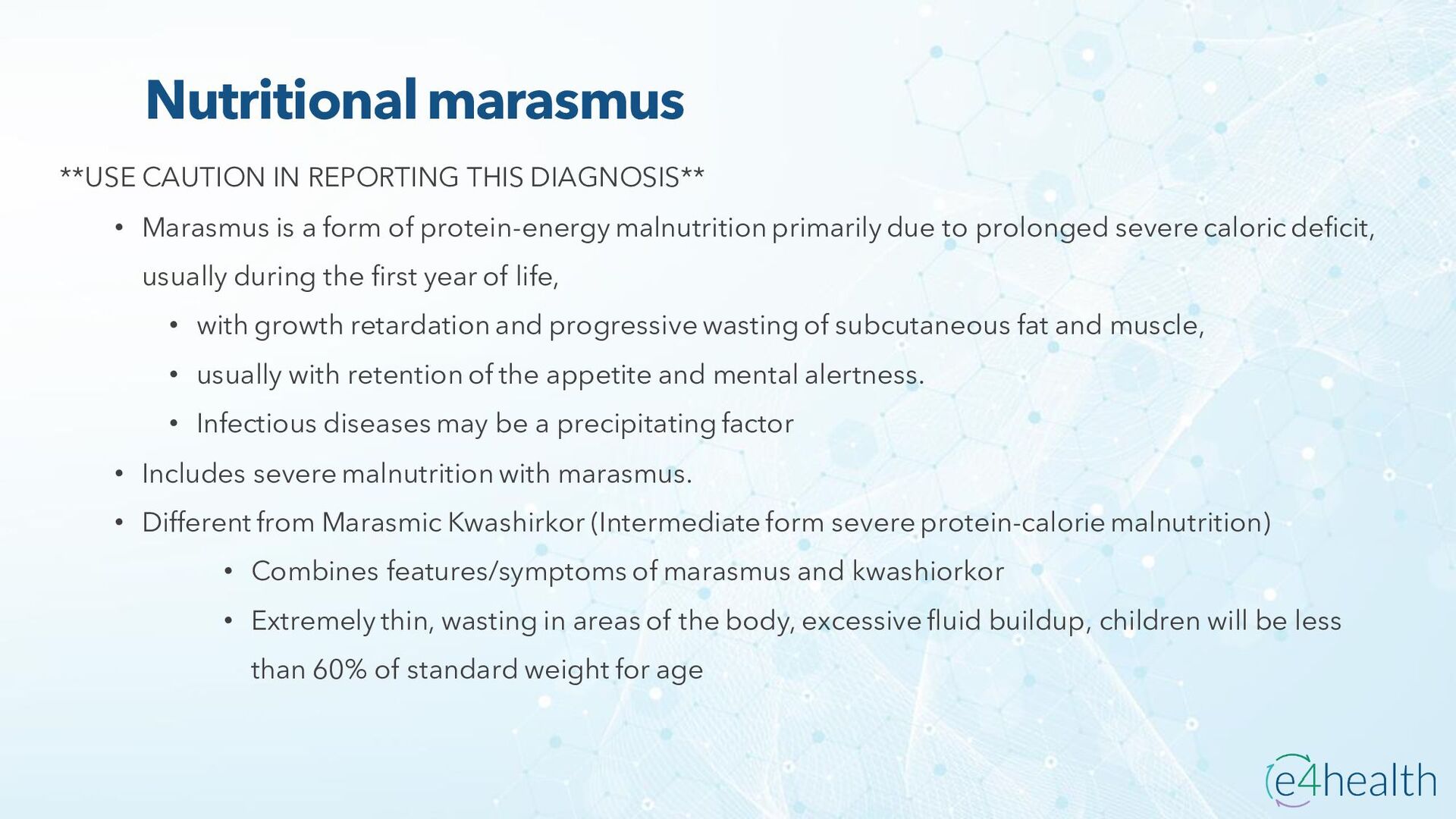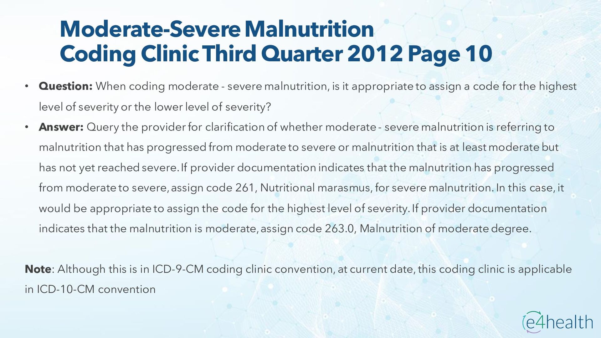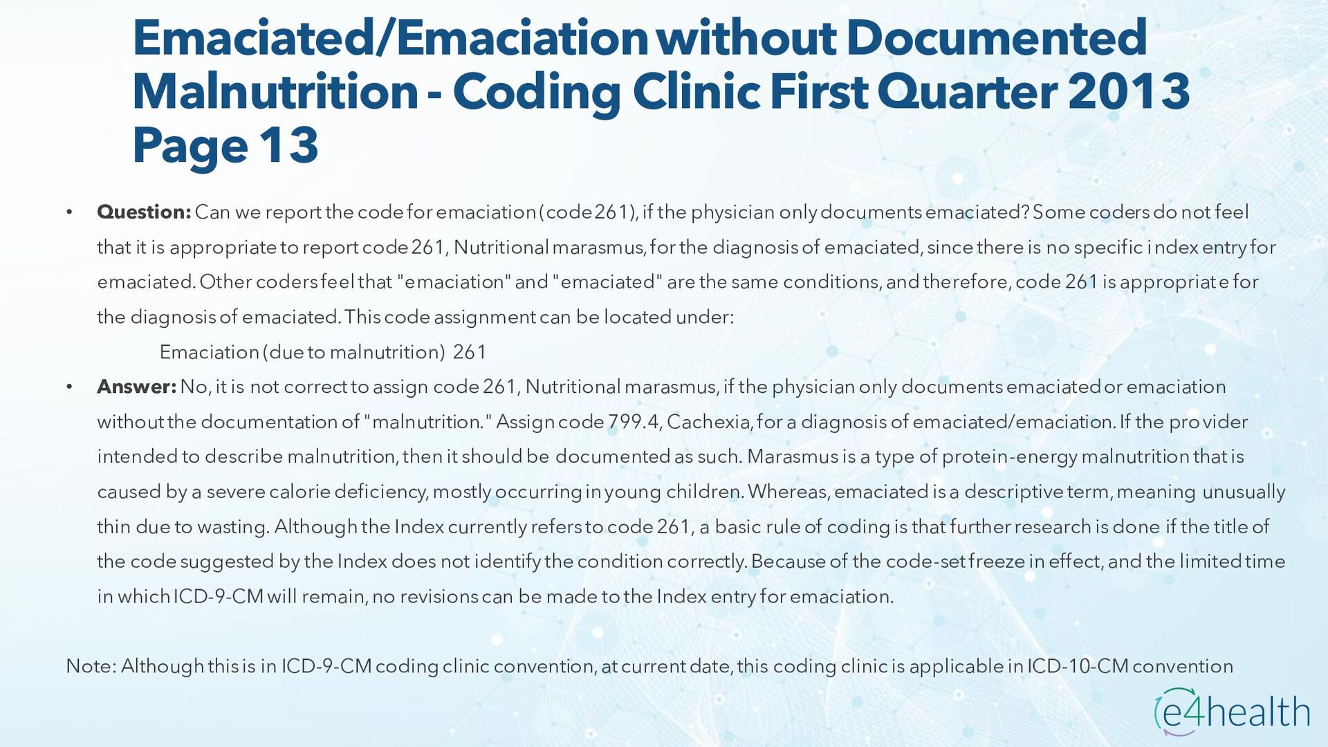 Page 13 • Question:Can we report the code for emaciation (code 261), if the physician only documents emaciated? Some coders do not feel that it is appropriate to report code 261, Nutritional marasmus, for the diagnosis of emaciated, since there is no specific index entry for emaciated. Other coders feel that "emaciation" and "emaciated" are the same conditions, and therefore, code 261 is appropriate for the diagnosis of emaciated. This code assignment can be located under: Emaciation (due to malnutrition) 261 • Answer:No, it is not correct to assign code 261, Nutritional marasmus, if the physician only documents emaciated or emaciation without the documentation of "malnutrition." Assign code 799.4, Cachexia, for a diagnosis of emaciated/emaciation. If the provider intended to describe malnutrition, then it should be documented as such. Marasmus is a type of protein-energy malnutrition that is caused by a severe calorie deficiency, mostly occurring in young children. Whereas, emaciated is a descriptive term, meaning unusually thin due to wasting. Although the Index currently refers to code 261, a basic rule of coding is that further research is done if the title of the code suggested by the Index does not identify the condition correctly. Because of the code-set freeze in effect, and the limited time in which ICD-9-CM will remain, no revisions can be made to the Index entry for emaciation. Note: Although this is in ICD-9-CM coding clinic convention, at current date, this coding clinic is applicable in ICD-10-CM convention