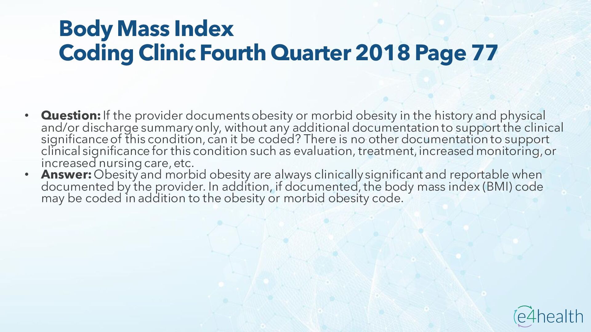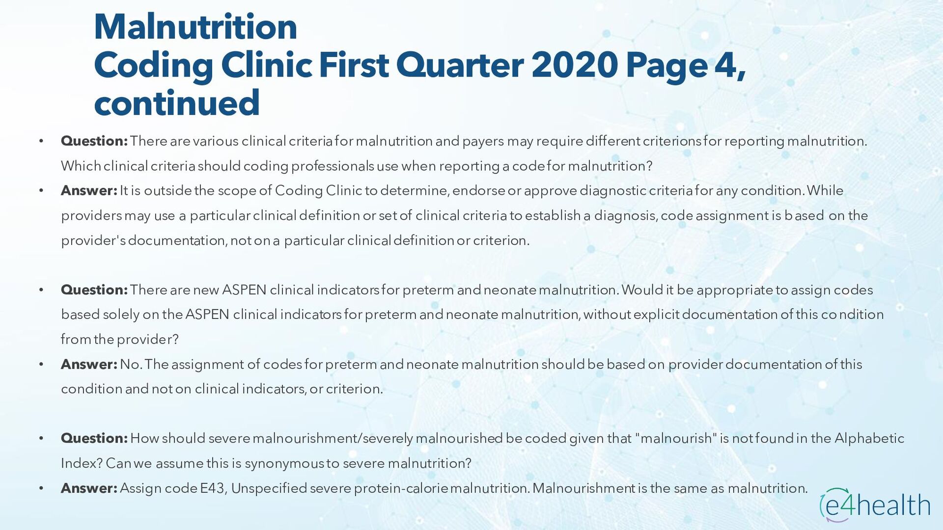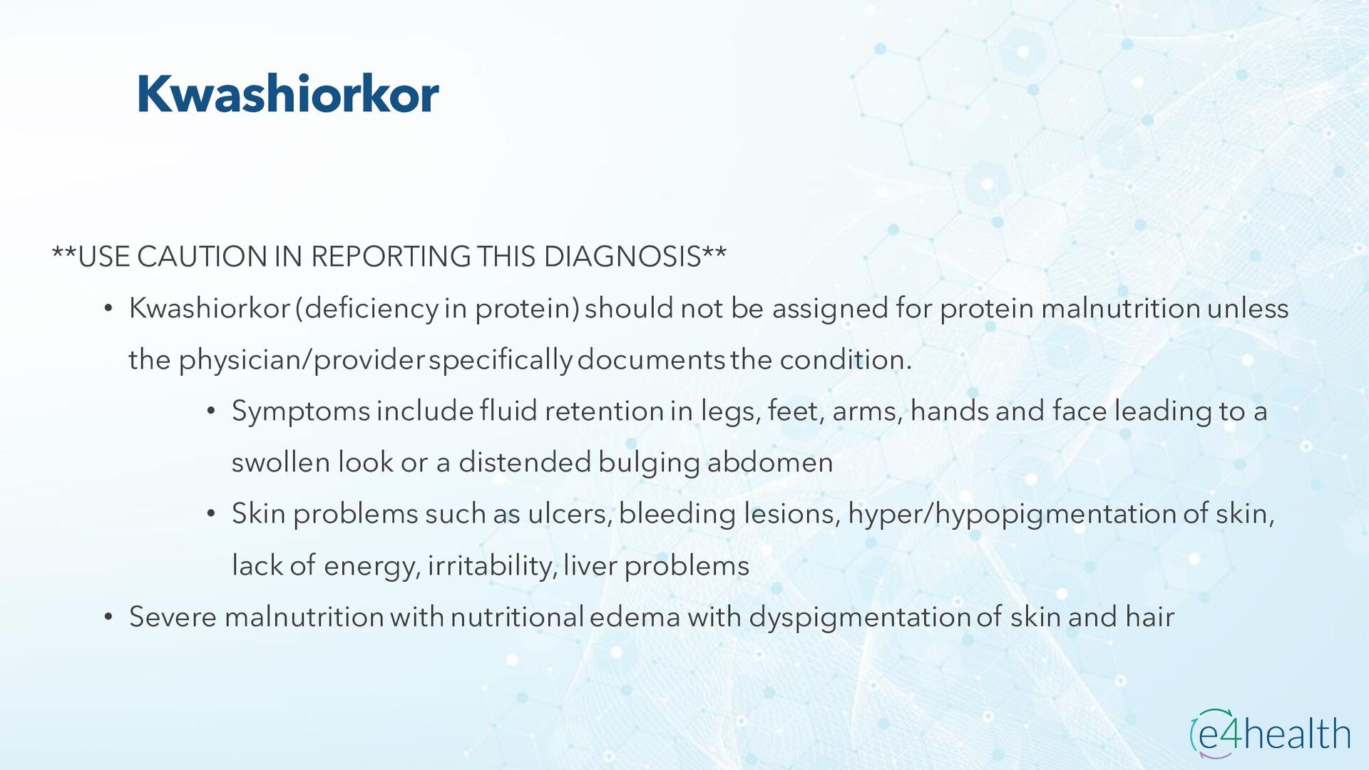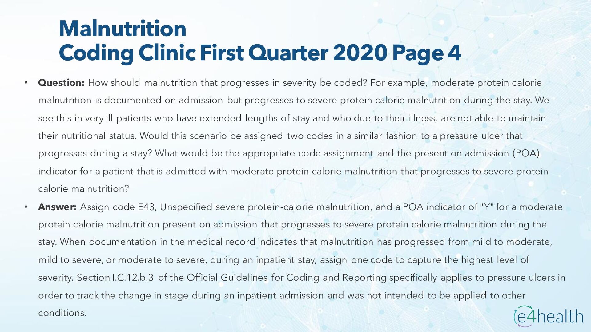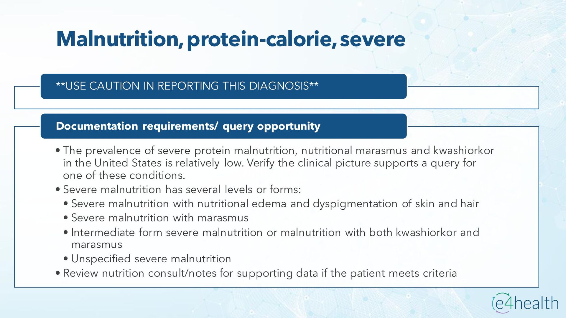 Page 13 • Question:Can we report the code for emaciation (code 261), if the physician only documents emaciated? Some coders do not feel that it is appropriate to report code 261, Nutritional marasmus, for the diagnosis of emaciated, since there is no specific index entry for emaciated. Other coders feel that "emaciation" and "emaciated" are the same conditions, and therefore, code 261 is appropriate for the diagnosis of emaciated. This code assignment can be located under: Emaciation (due to malnutrition) 261 • Answer:No, it is not correct to assign code 261, Nutritional marasmus, if the physician only documents emaciated or emaciation without the documentation of "malnutrition." Assign code 799.4, Cachexia, for a diagnosis of emaciated/emaciation. If the provider intended to describe malnutrition, then it should be documented as such. Marasmus is a type of protein-energy malnutrition that is caused by a severe calorie deficiency, mostly occurring in young children. Whereas, emaciated is a descriptive term, meaning unusually thin due to wasting. Although the Index currently refers to code 261, a basic rule of coding is that further research is done if the title of the code suggested by the Index does not identify the condition correctly. Because of the code-set freeze in effect, and the limited time in which ICD-9-CM will remain, no revisions can be made to the Index entry for emaciation. Note: Although this is in ICD-9-CM coding clinic convention, at current date, this coding clinic is applicable in ICD-10-CM convention