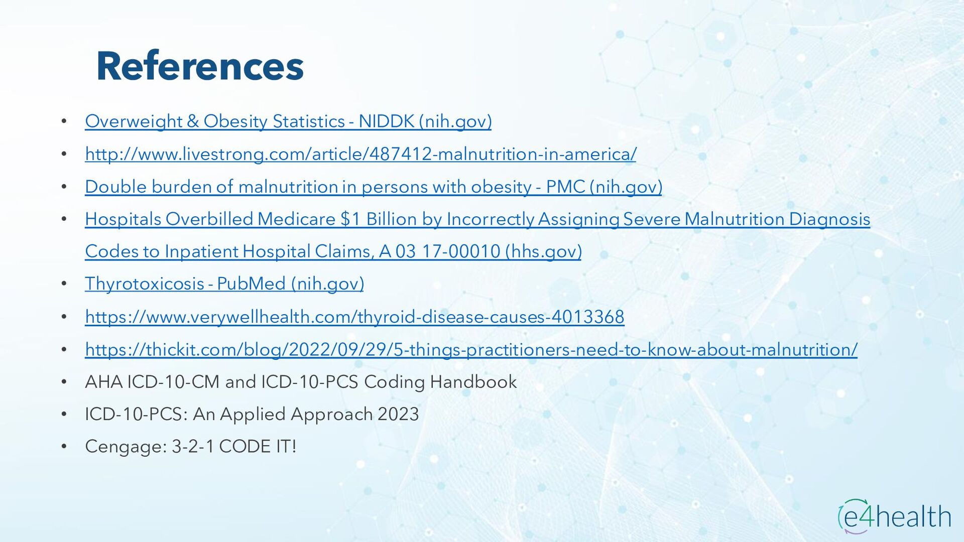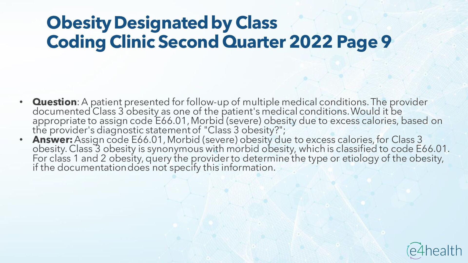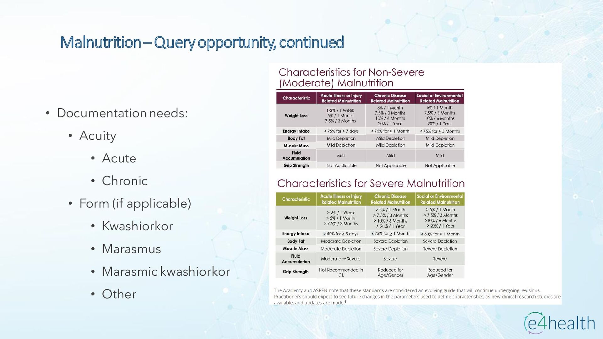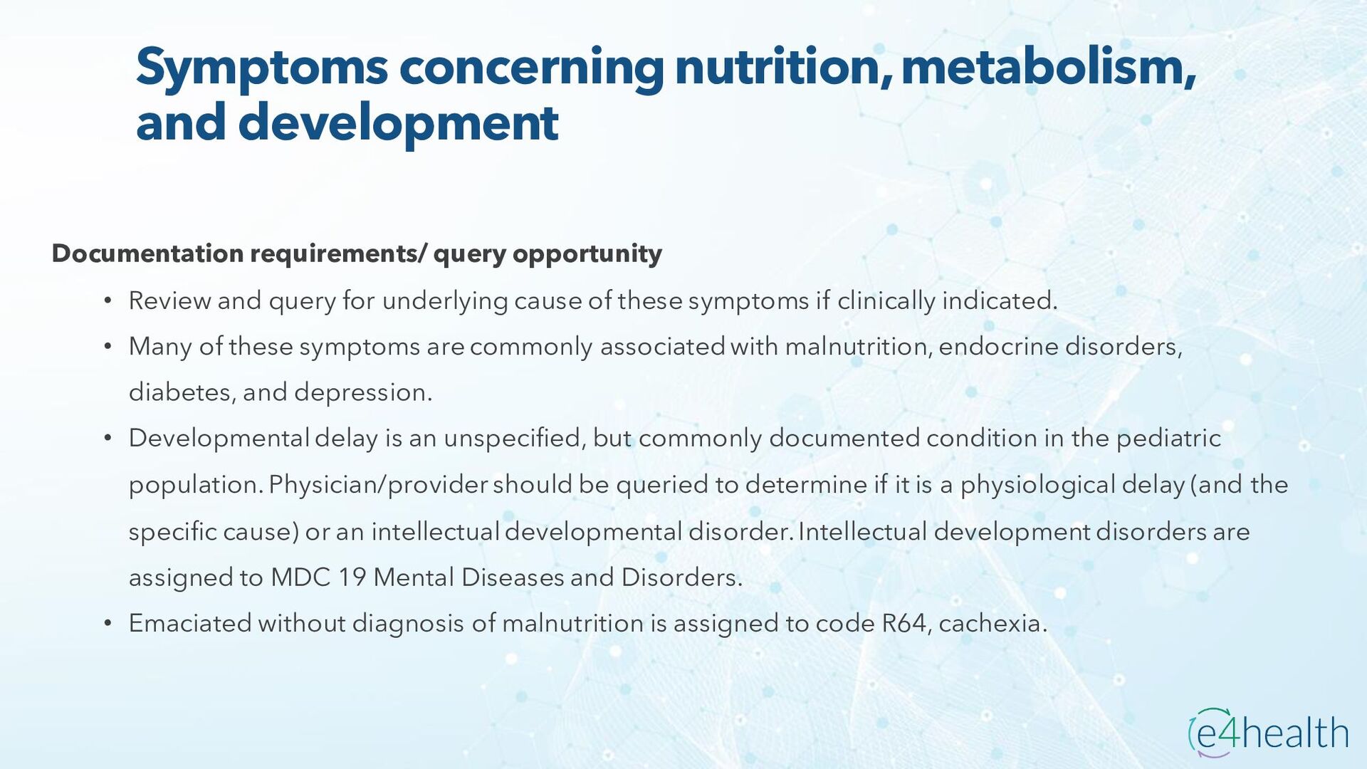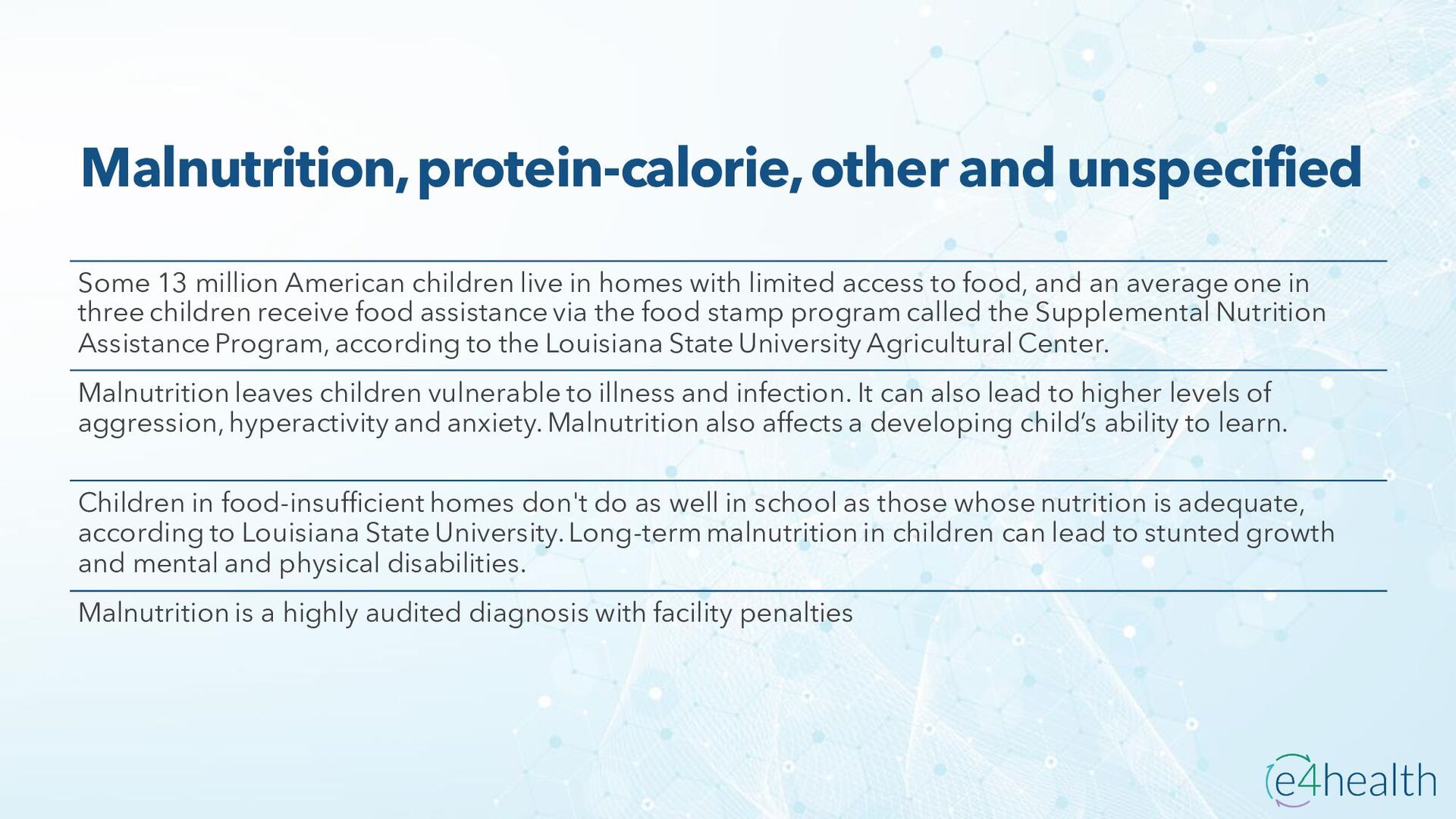 Page 13 • Question:Can we report the code for emaciation (code 261), if the physician only documents emaciated? Some coders do not feel that it is appropriate to report code 261, Nutritional marasmus, for the diagnosis of emaciated, since there is no specific index entry for emaciated. Other coders feel that "emaciation" and "emaciated" are the same conditions, and therefore, code 261 is appropriate for the diagnosis of emaciated. This code assignment can be located under: Emaciation (due to malnutrition) 261 • Answer:No, it is not correct to assign code 261, Nutritional marasmus, if the physician only documents emaciated or emaciation without the documentation of "malnutrition." Assign code 799.4, Cachexia, for a diagnosis of emaciated/emaciation. If the provider intended to describe malnutrition, then it should be documented as such. Marasmus is a type of protein-energy malnutrition that is caused by a severe calorie deficiency, mostly occurring in young children. Whereas, emaciated is a descriptive term, meaning unusually thin due to wasting. Although the Index currently refers to code 261, a basic rule of coding is that further research is done if the title of the code suggested by the Index does not identify the condition correctly. Because of the code-set freeze in effect, and the limited time in which ICD-9-CM will remain, no revisions can be made to the Index entry for emaciation. Note: Although this is in ICD-9-CM coding clinic convention, at current date, this coding clinic is applicable in ICD-10-CM convention