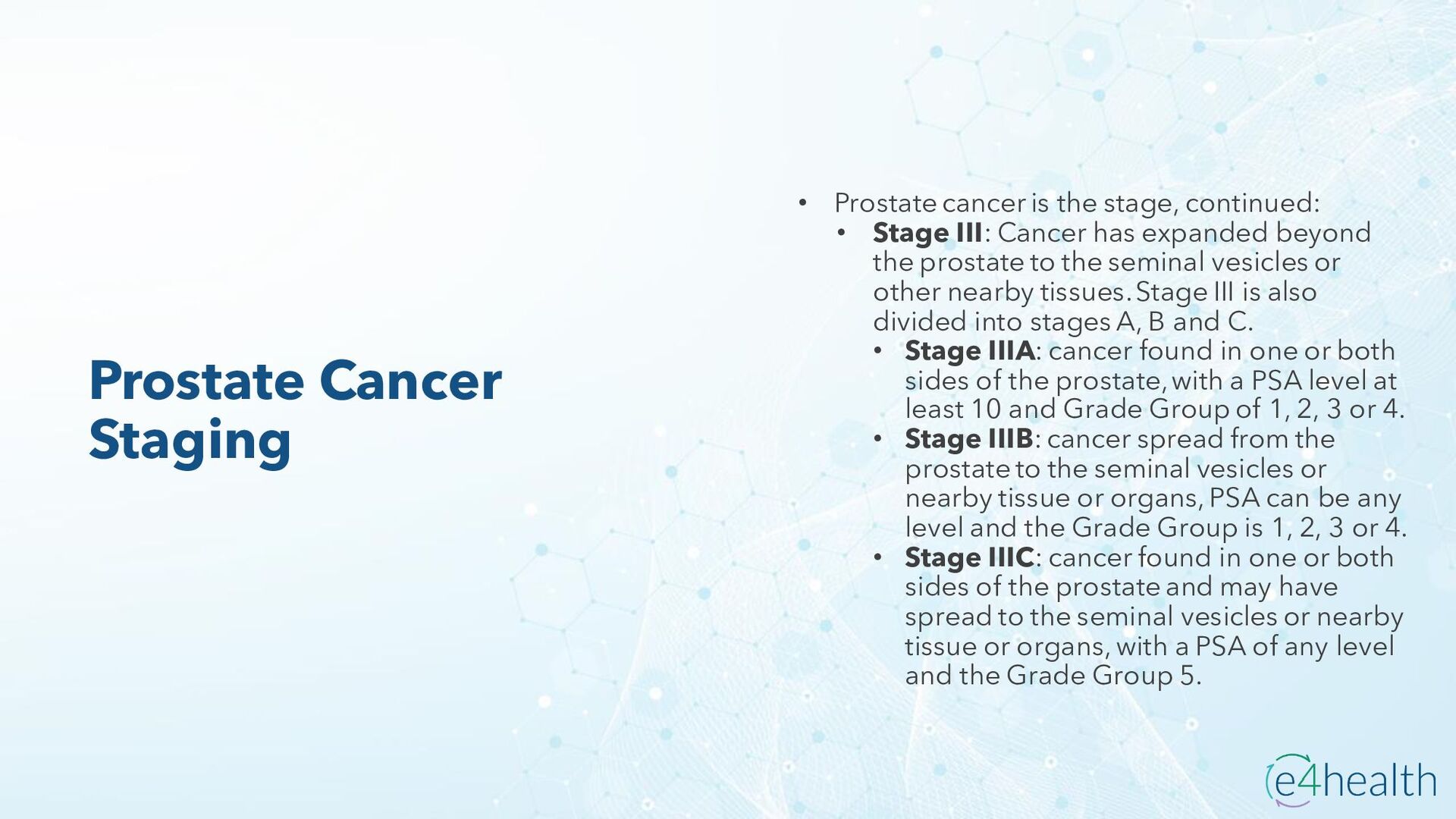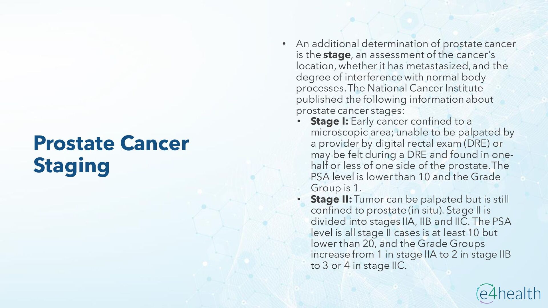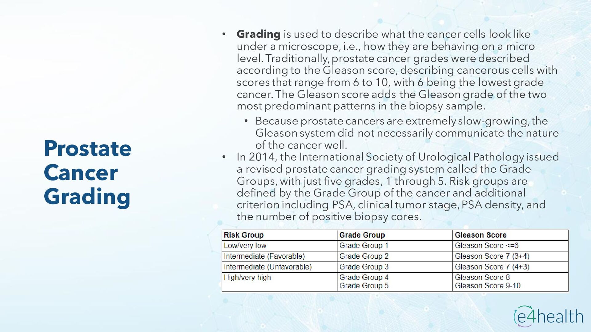 the cancer cells look like under a microscope, i.e., how they are behaving on a micro level. Traditionally, prostate cancer grades were described according to the Gleason score, describing cancerous cells with scores that range from 6 to 10, with 6 being the lowest grade cancer. The Gleason score adds the Gleason grade of the two most predominant patterns in the biopsy sample. • Because prostate cancers are extremely slow-growing, the Gleason system did not necessarily communicate the nature of the cancer well. • In 2014, the International Society of Urological Pathology issued a revised prostate cancer grading system called the Grade Groups, with just five grades, 1 through 5. Risk groups are defined by the Grade Group of the cancer and additional criterion including PSA, clinical tumor stage, PSA density, and the number of positive biopsy cores.