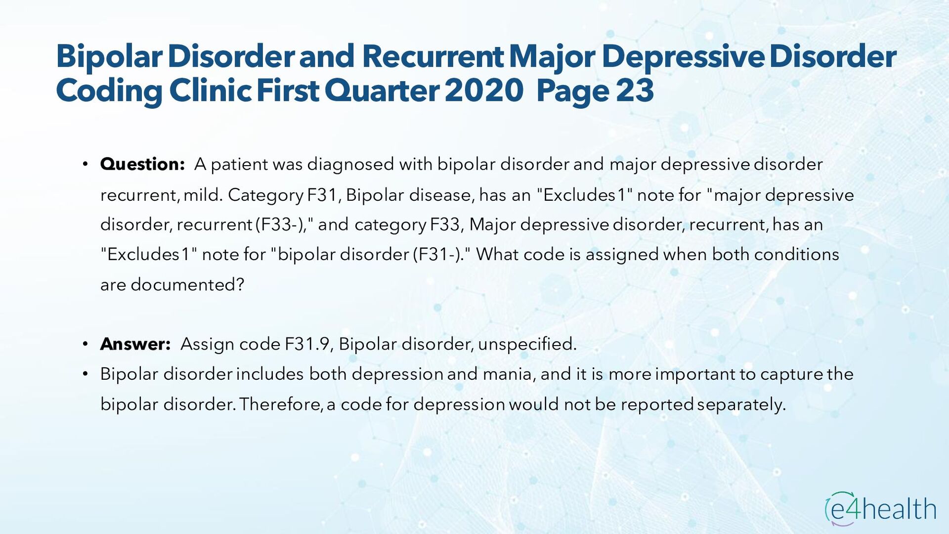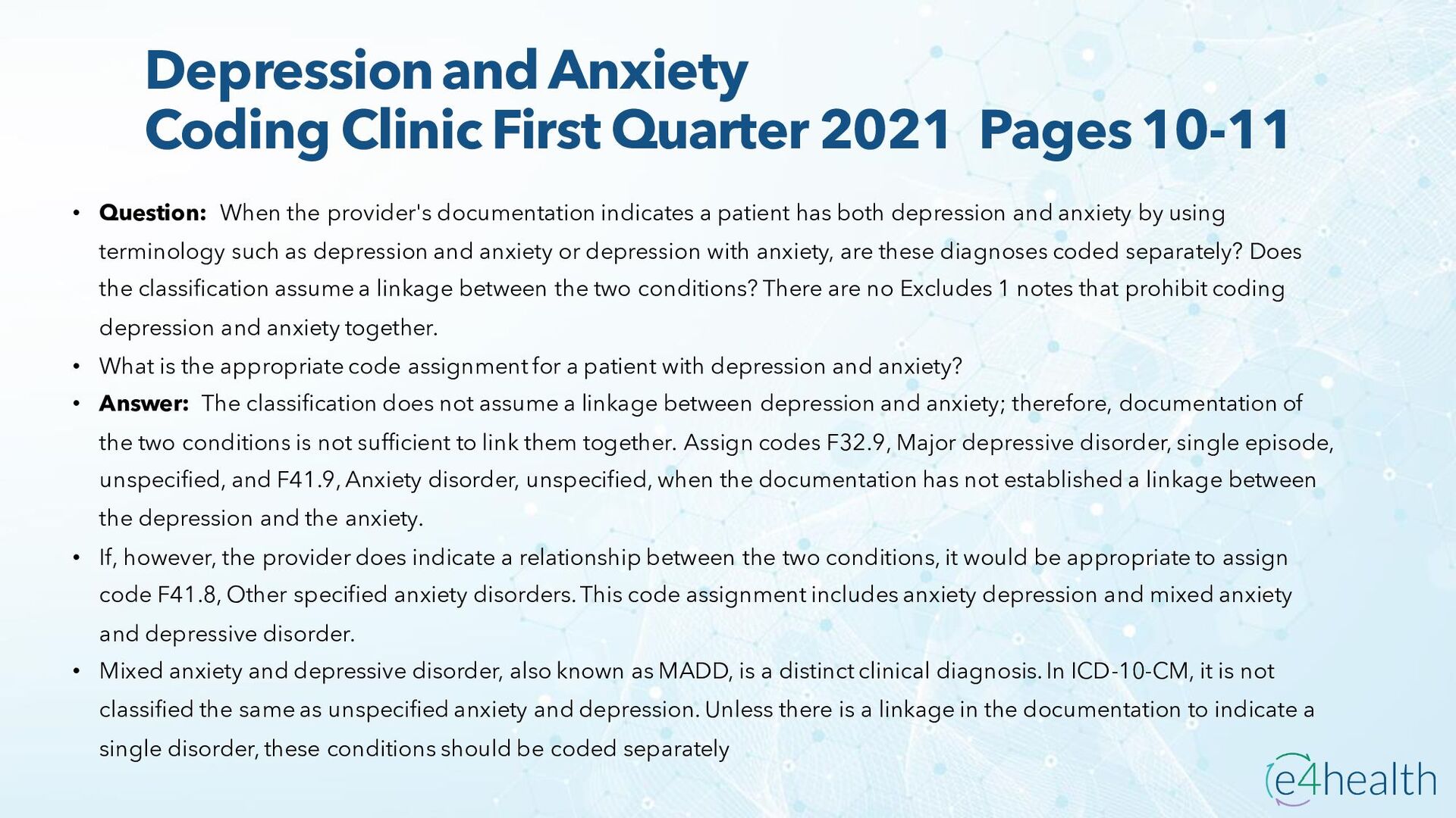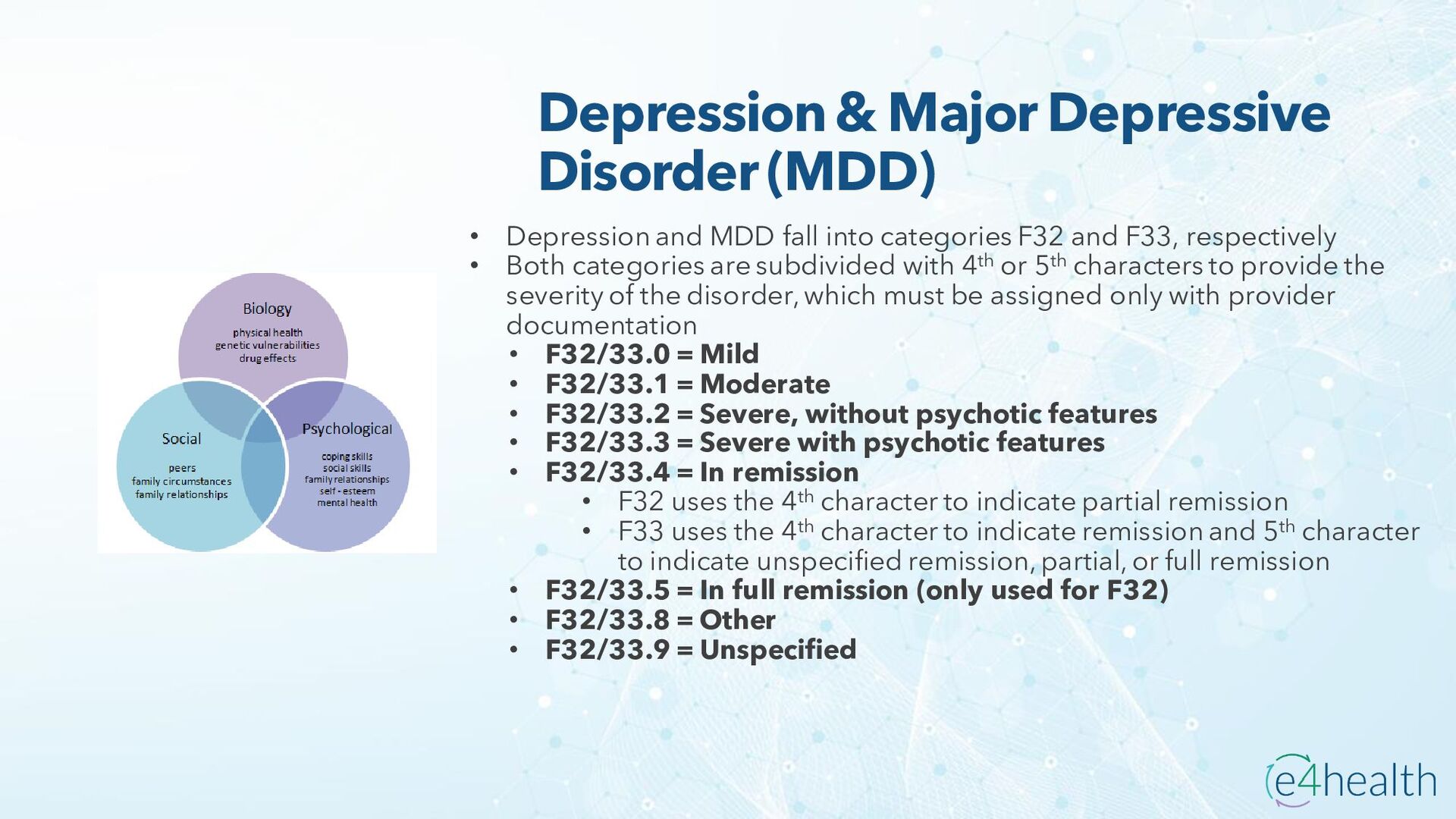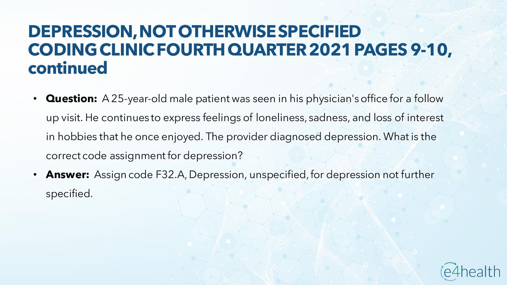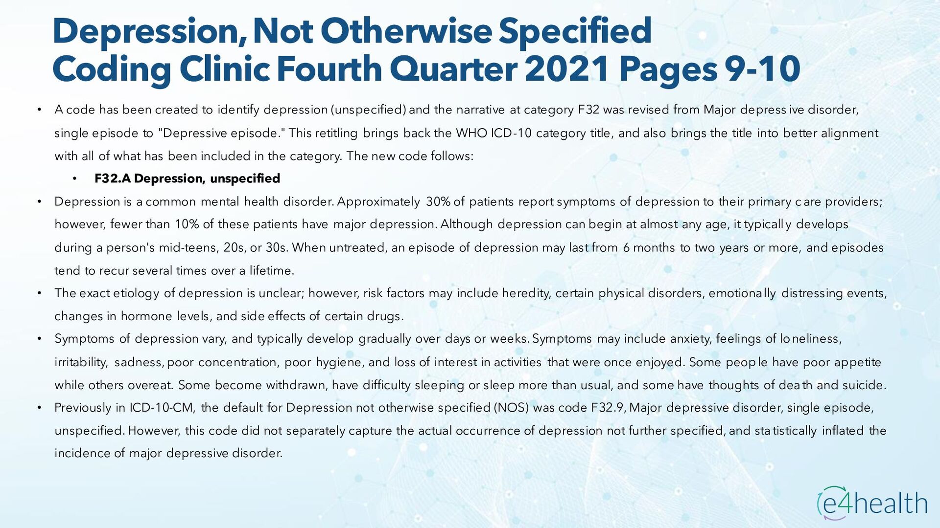 9-10 • A code has been created to identify depression (unspecified) and the narrative at category F32 was revised from Major depress ive disorder, single episode to "Depressive episode." This retitling brings back the WHO ICD-10 category title, and also brings the title into better alignment with all of what has been included in the category. The new code follows: • F32.A Depression, unspecified • Depression is a common mental health disorder. Approximately 30% of patients report symptoms of depression to their primary care providers; however, fewer than 10% of these patients have major depression. Although depression can begin at almost any age, it typically develops during a person's mid-teens, 20s, or 30s. When untreated, an episode of depression may last from 6 months to two years or more, and episodes tend to recur several times over a lifetime. • The exact etiology of depression is unclear; however, risk factors may include heredity, certain physical disorders, emotionally distressing events, changes in hormone levels, and side effects of certain drugs. • Symptoms of depression vary, and typically develop gradually over days or weeks. Symptoms may include anxiety, feelings of loneliness, irritability, sadness, poor concentration, poor hygiene, and loss of interest in activities that were once enjoyed. Some people have poor appetite while others overeat. Some become withdrawn, have difficulty sleeping or sleep more than usual, and some have thoughts of death and suicide. • Previously in ICD-10-CM, the default for Depression not otherwise specified (NOS) was code F32.9, Major depressive disorder, single episode, unspecified. However, this code did not separately capture the actual occurrence of depression not further specified, and statistically inflated the incidence of major depressive disorder.