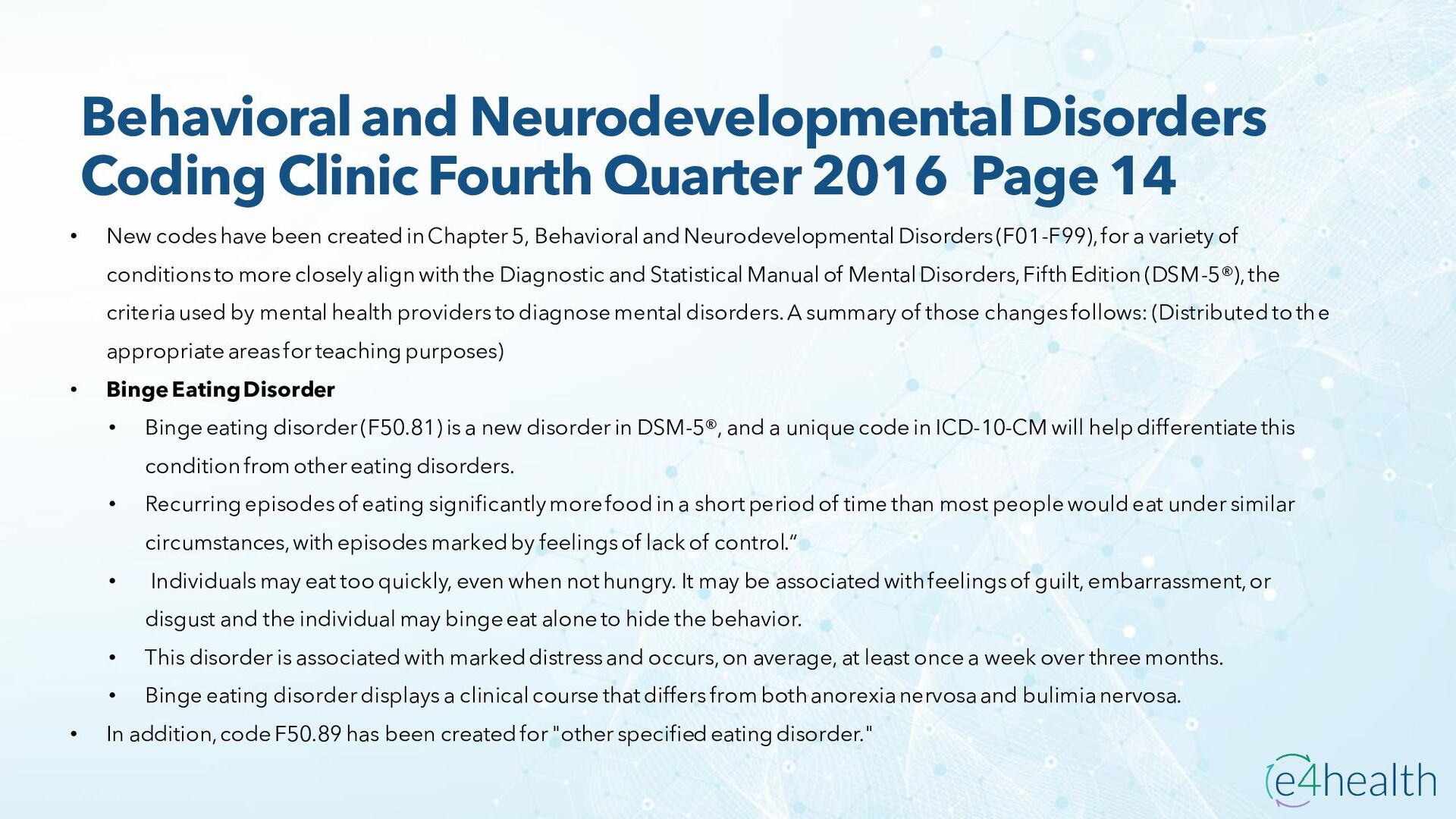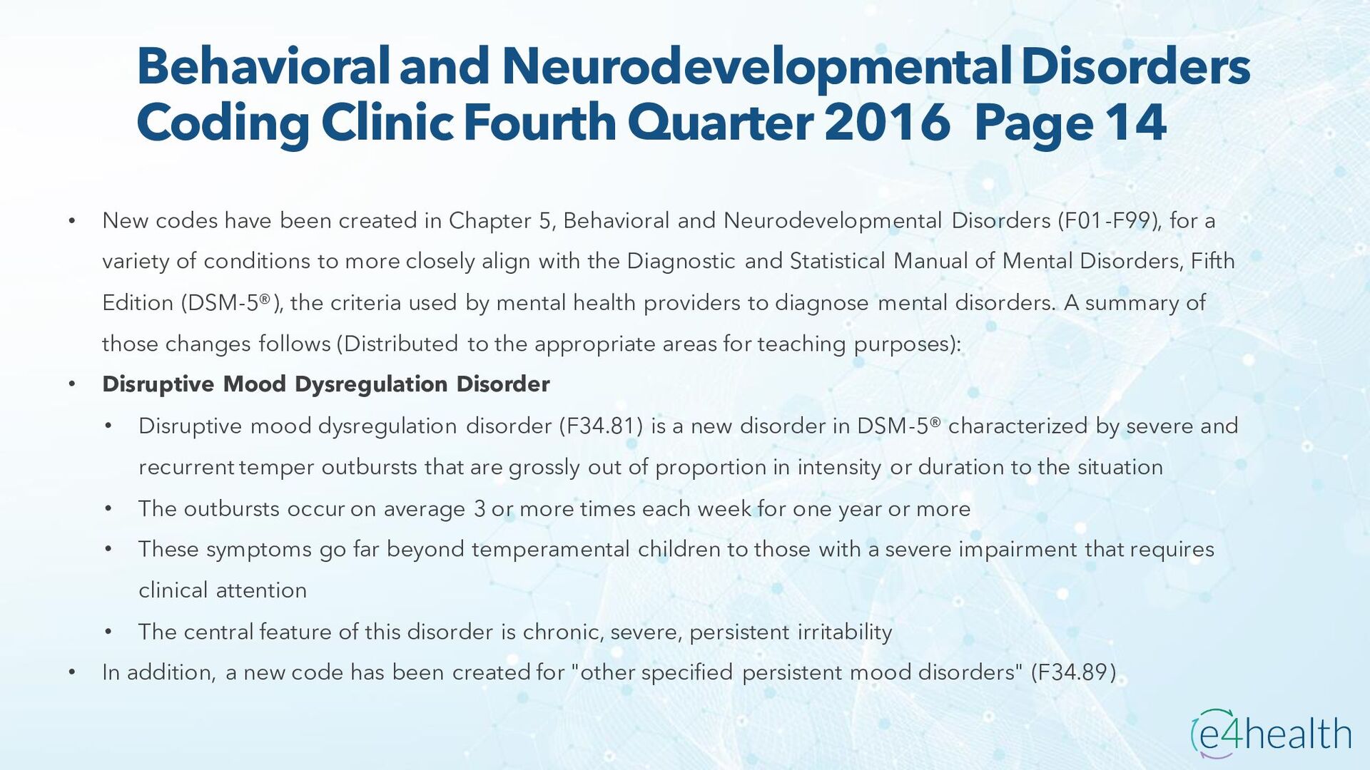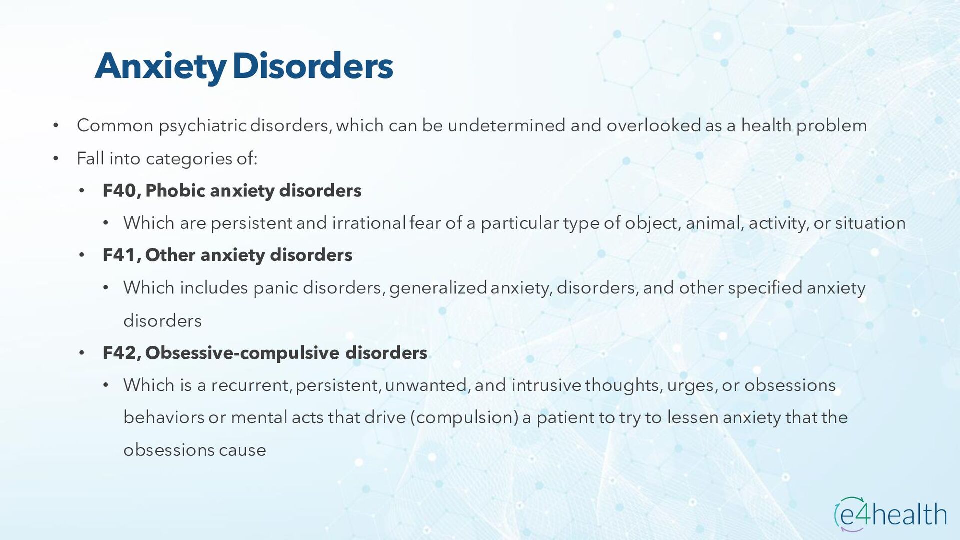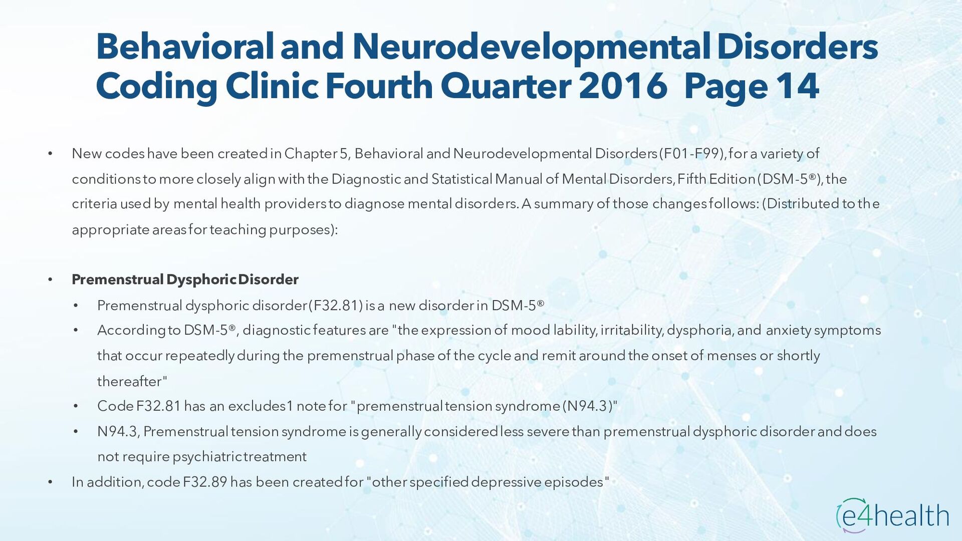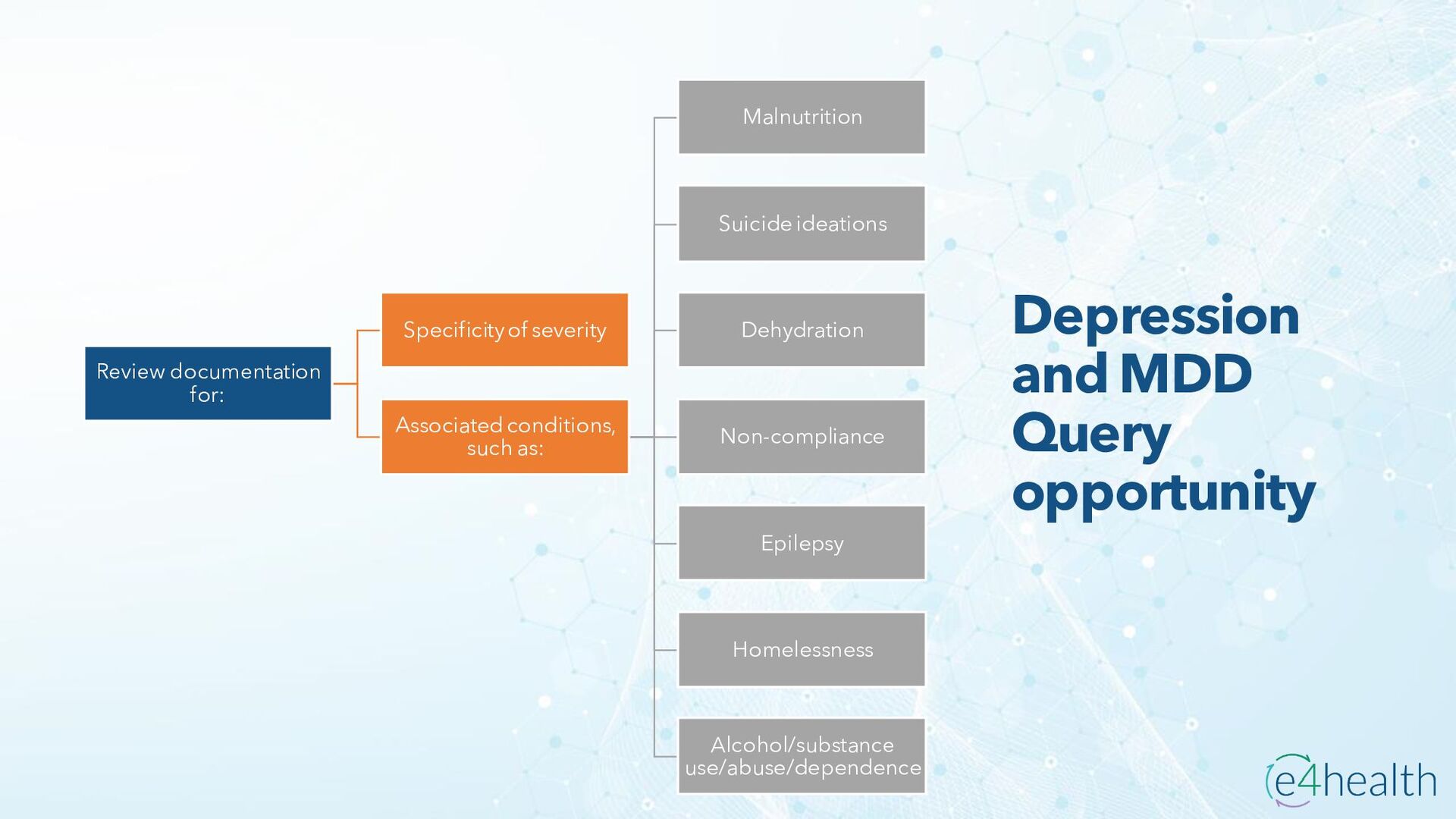9-10 • A code has been created to identify depression (unspecified) and the narrative at category F32 was revised from Major depress ive disorder, single episode to "Depressive episode." This retitling brings back the WHO ICD-10 category title, and also brings the title into better alignment with all of what has been included in the category. The new code follows: • F32.A Depression, unspecified • Depression is a common mental health disorder. Approximately 30% of patients report symptoms of depression to their primary care providers; however, fewer than 10% of these patients have major depression. Although depression can begin at almost any age, it typically develops during a person's mid-teens, 20s, or 30s. When untreated, an episode of depression may last from 6 months to two years or more, and episodes tend to recur several times over a lifetime. • The exact etiology of depression is unclear; however, risk factors may include heredity, certain physical disorders, emotionally distressing events, changes in hormone levels, and side effects of certain drugs. • Symptoms of depression vary, and typically develop gradually over days or weeks. Symptoms may include anxiety, feelings of loneliness, irritability, sadness, poor concentration, poor hygiene, and loss of interest in activities that were once enjoyed. Some people have poor appetite while others overeat. Some become withdrawn, have difficulty sleeping or sleep more than usual, and some have thoughts of death and suicide. • Previously in ICD-10-CM, the default for Depression not otherwise specified (NOS) was code F32.9, Major depressive disorder, single episode, unspecified. However, this code did not separately capture the actual occurrence of depression not further specified, and statistically inflated the incidence of major depressive disorder.