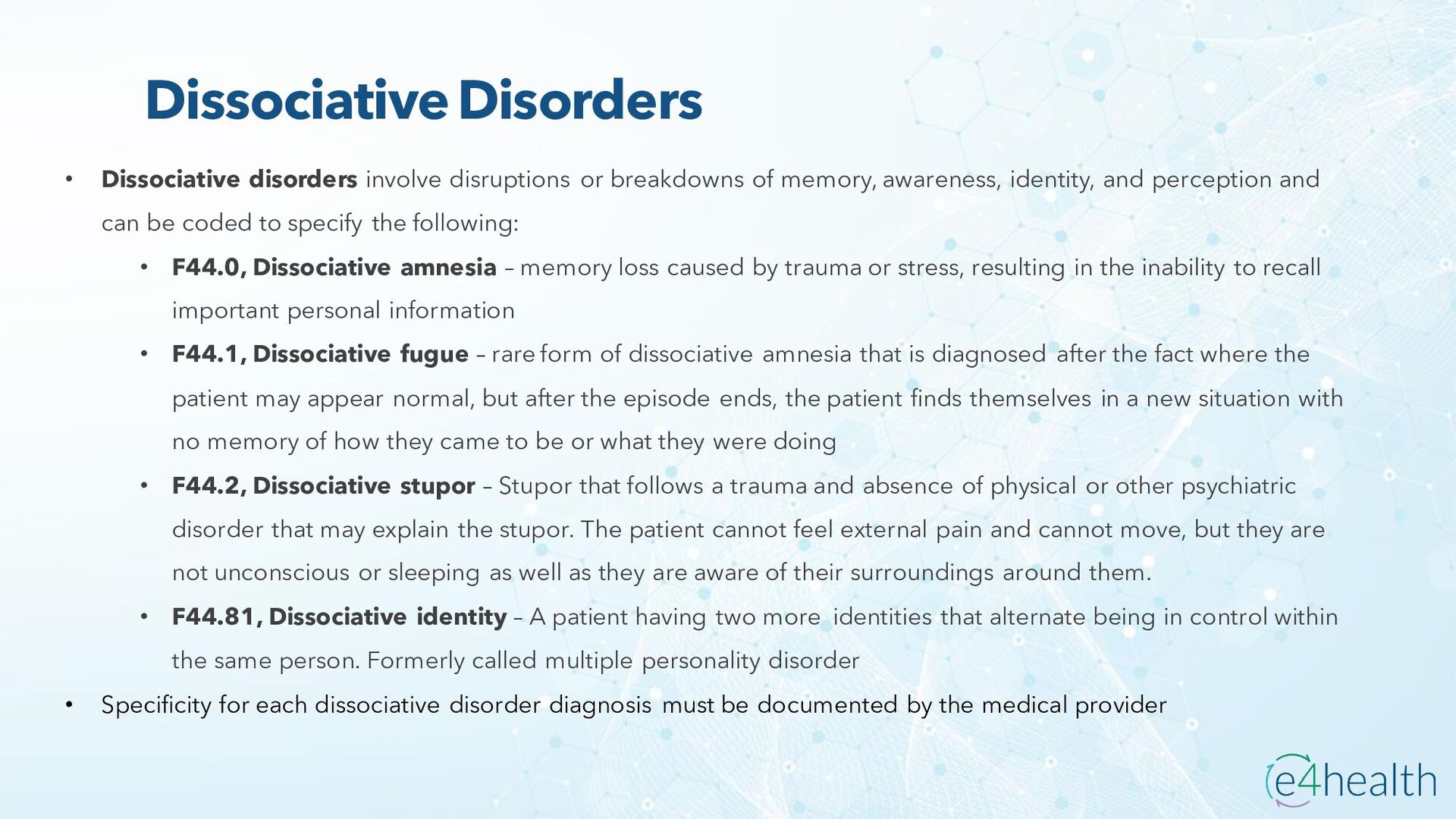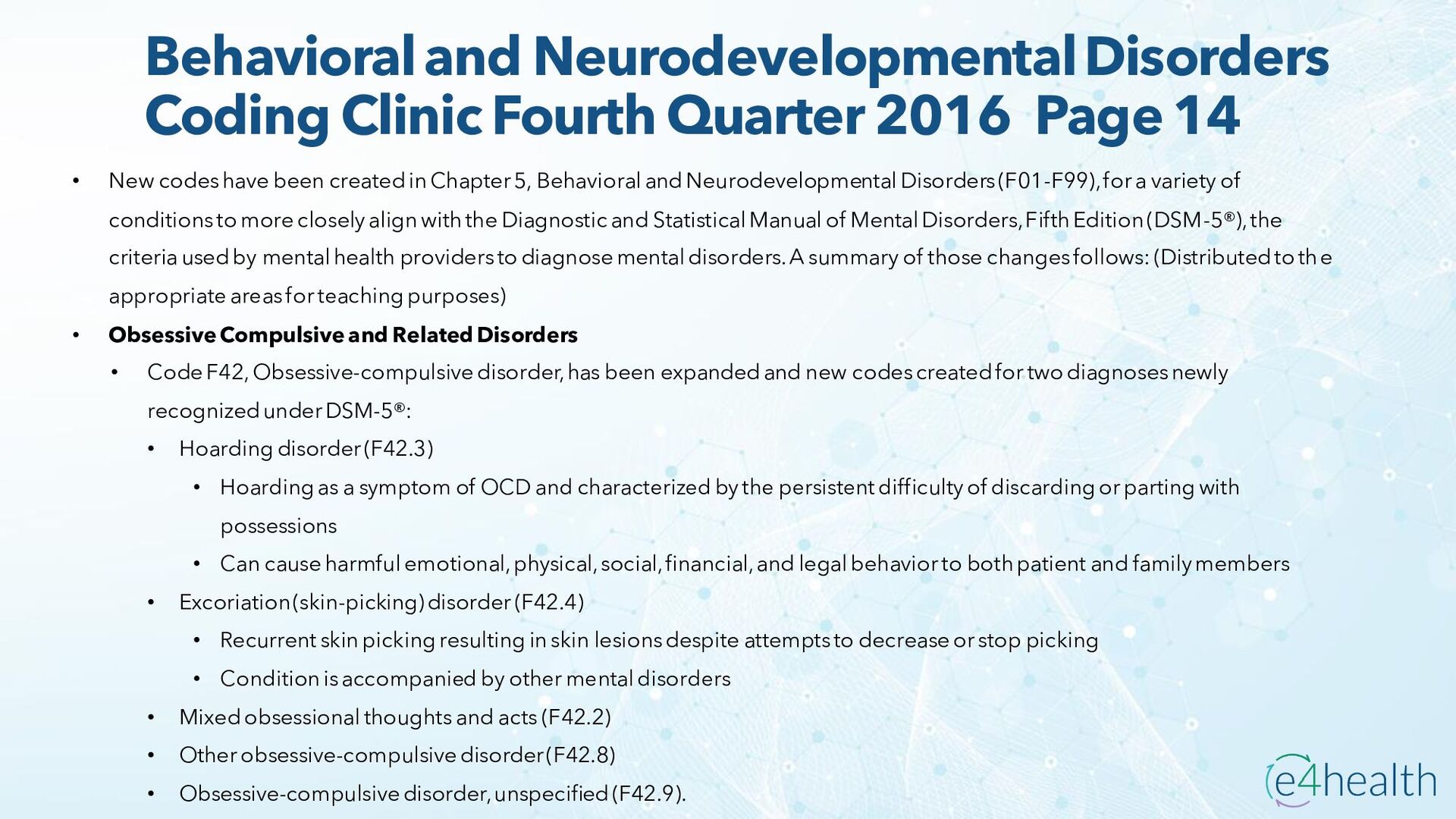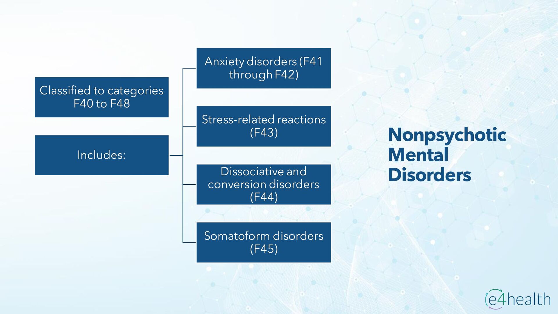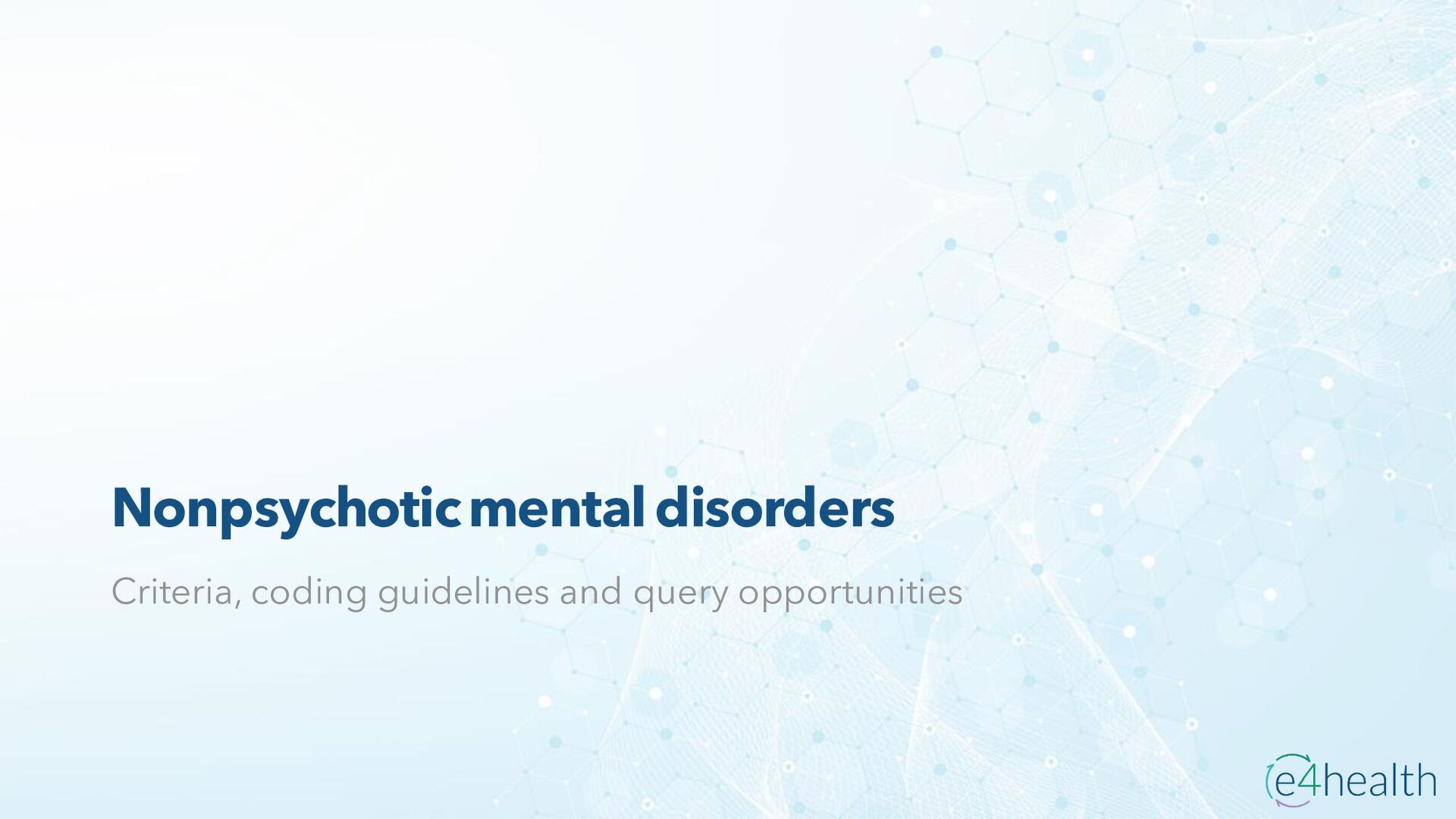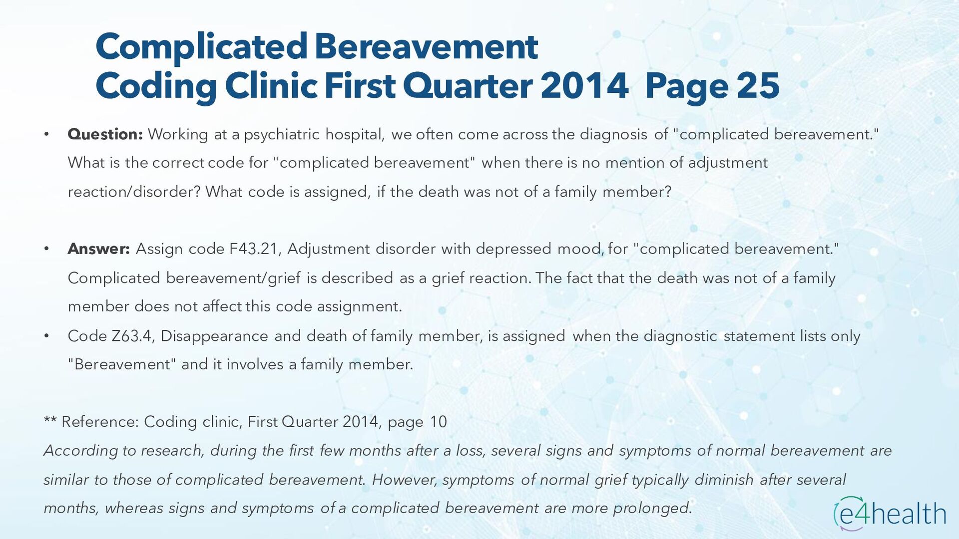 9-10 • A code has been created to identify depression (unspecified) and the narrative at category F32 was revised from Major depress ive disorder, single episode to "Depressive episode." This retitling brings back the WHO ICD-10 category title, and also brings the title into better alignment with all of what has been included in the category. The new code follows: • F32.A Depression, unspecified • Depression is a common mental health disorder. Approximately 30% of patients report symptoms of depression to their primary care providers; however, fewer than 10% of these patients have major depression. Although depression can begin at almost any age, it typically develops during a person's mid-teens, 20s, or 30s. When untreated, an episode of depression may last from 6 months to two years or more, and episodes tend to recur several times over a lifetime. • The exact etiology of depression is unclear; however, risk factors may include heredity, certain physical disorders, emotionally distressing events, changes in hormone levels, and side effects of certain drugs. • Symptoms of depression vary, and typically develop gradually over days or weeks. Symptoms may include anxiety, feelings of loneliness, irritability, sadness, poor concentration, poor hygiene, and loss of interest in activities that were once enjoyed. Some people have poor appetite while others overeat. Some become withdrawn, have difficulty sleeping or sleep more than usual, and some have thoughts of death and suicide. • Previously in ICD-10-CM, the default for Depression not otherwise specified (NOS) was code F32.9, Major depressive disorder, single episode, unspecified. However, this code did not separately capture the actual occurrence of depression not further specified, and statistically inflated the incidence of major depressive disorder.