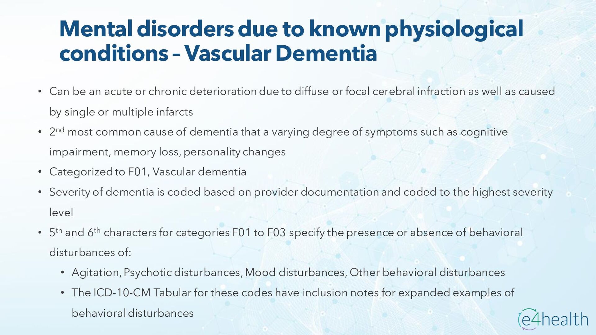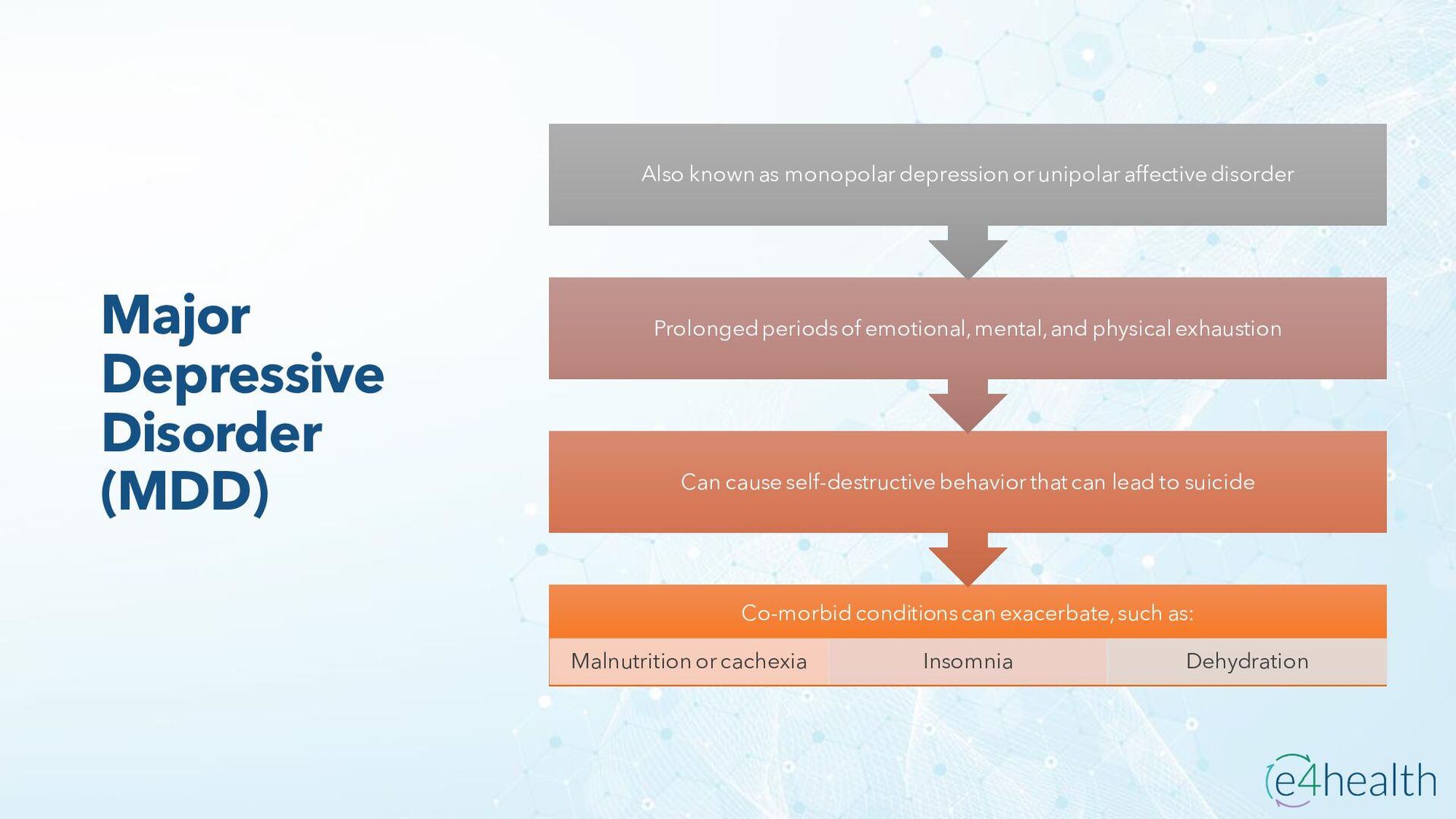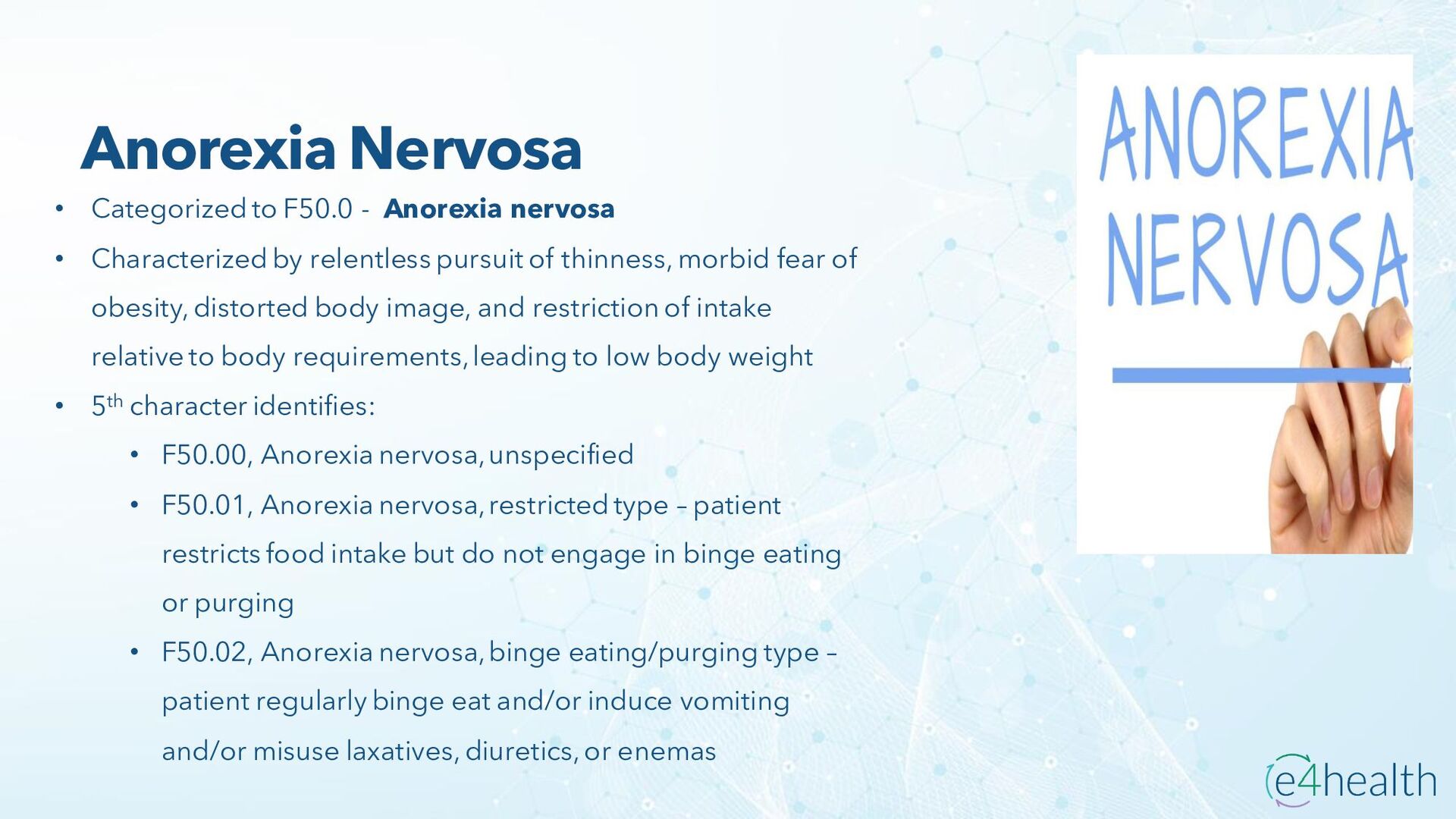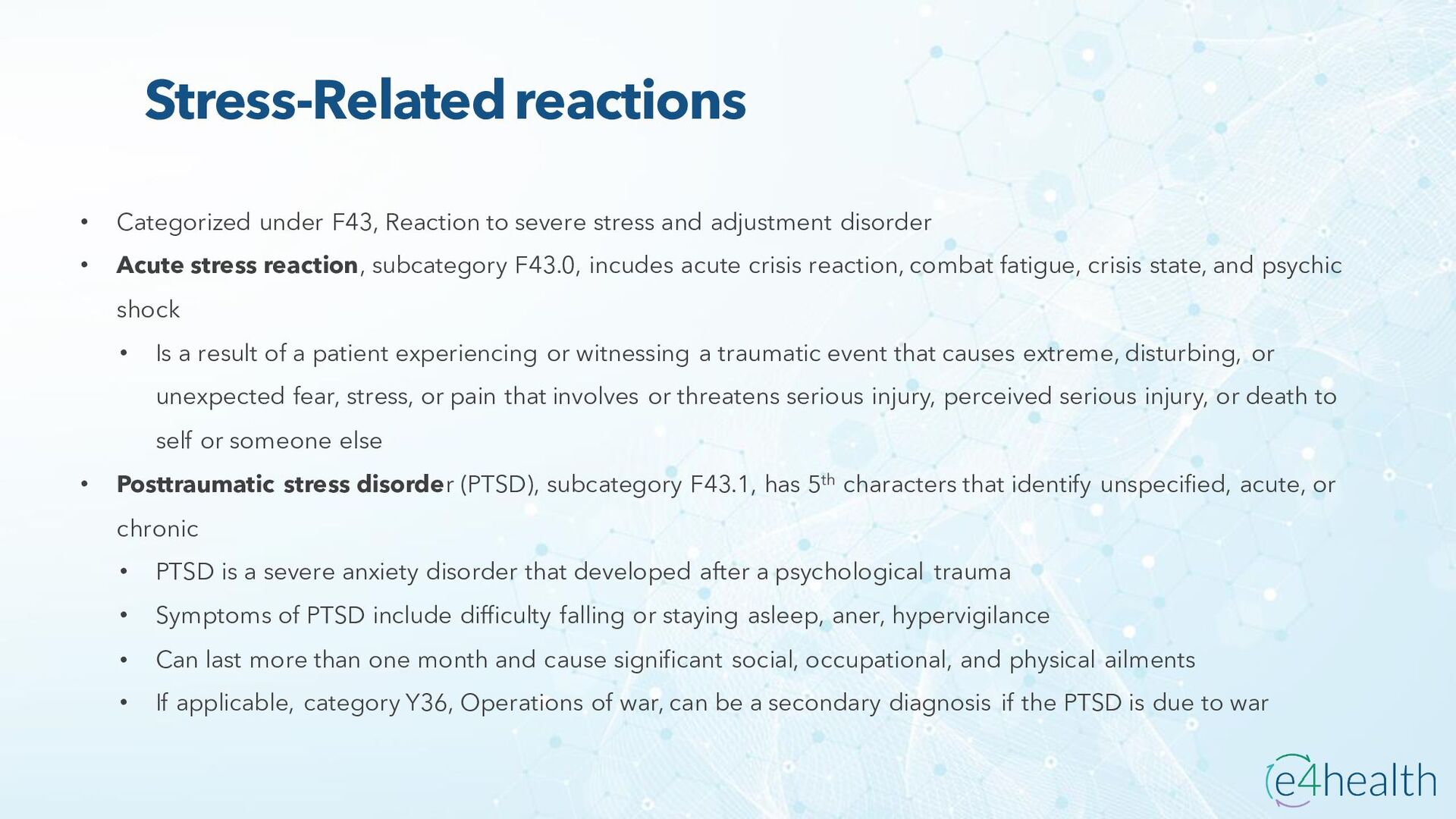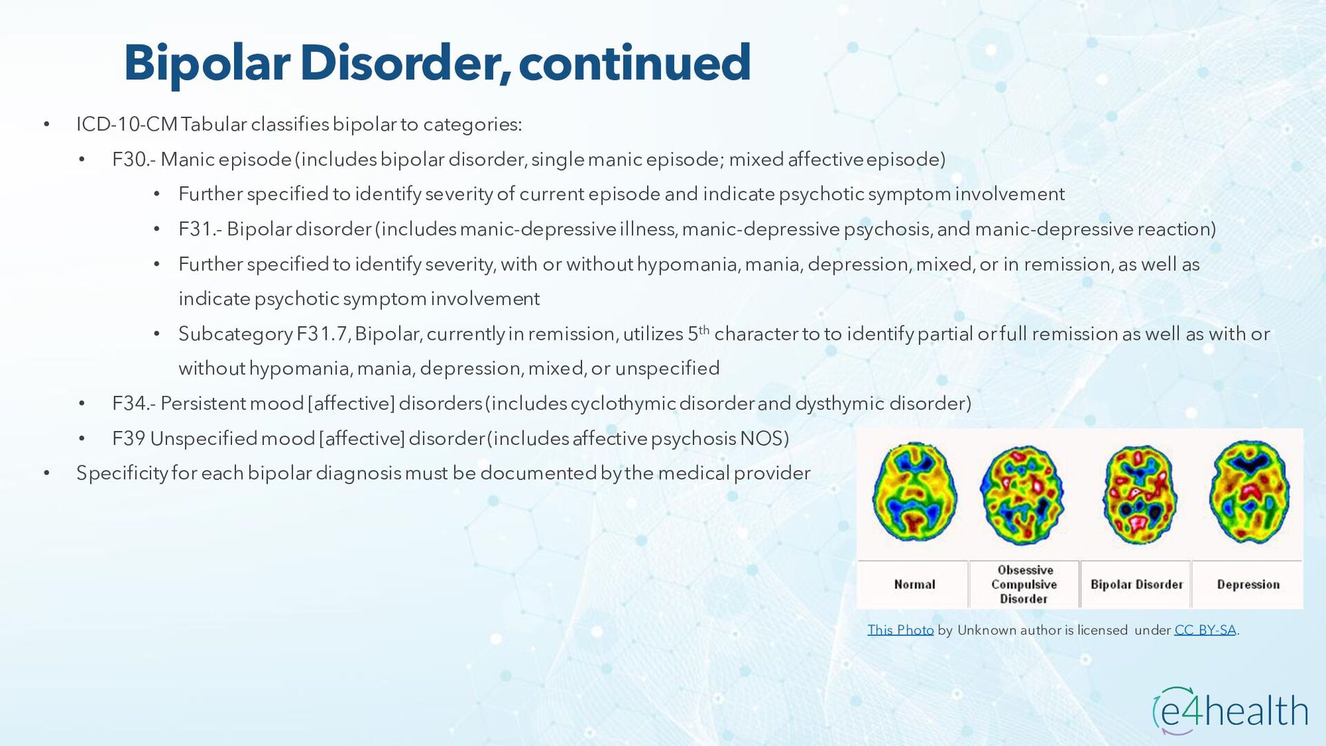 9-10 • A code has been created to identify depression (unspecified) and the narrative at category F32 was revised from Major depress ive disorder, single episode to "Depressive episode." This retitling brings back the WHO ICD-10 category title, and also brings the title into better alignment with all of what has been included in the category. The new code follows: • F32.A Depression, unspecified • Depression is a common mental health disorder. Approximately 30% of patients report symptoms of depression to their primary care providers; however, fewer than 10% of these patients have major depression. Although depression can begin at almost any age, it typically develops during a person's mid-teens, 20s, or 30s. When untreated, an episode of depression may last from 6 months to two years or more, and episodes tend to recur several times over a lifetime. • The exact etiology of depression is unclear; however, risk factors may include heredity, certain physical disorders, emotionally distressing events, changes in hormone levels, and side effects of certain drugs. • Symptoms of depression vary, and typically develop gradually over days or weeks. Symptoms may include anxiety, feelings of loneliness, irritability, sadness, poor concentration, poor hygiene, and loss of interest in activities that were once enjoyed. Some people have poor appetite while others overeat. Some become withdrawn, have difficulty sleeping or sleep more than usual, and some have thoughts of death and suicide. • Previously in ICD-10-CM, the default for Depression not otherwise specified (NOS) was code F32.9, Major depressive disorder, single episode, unspecified. However, this code did not separately capture the actual occurrence of depression not further specified, and statistically inflated the incidence of major depressive disorder.