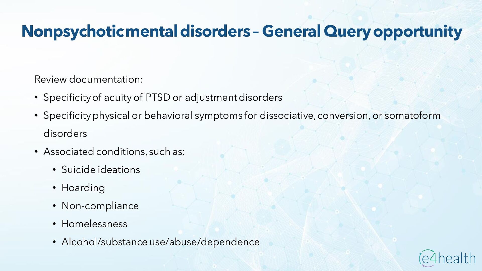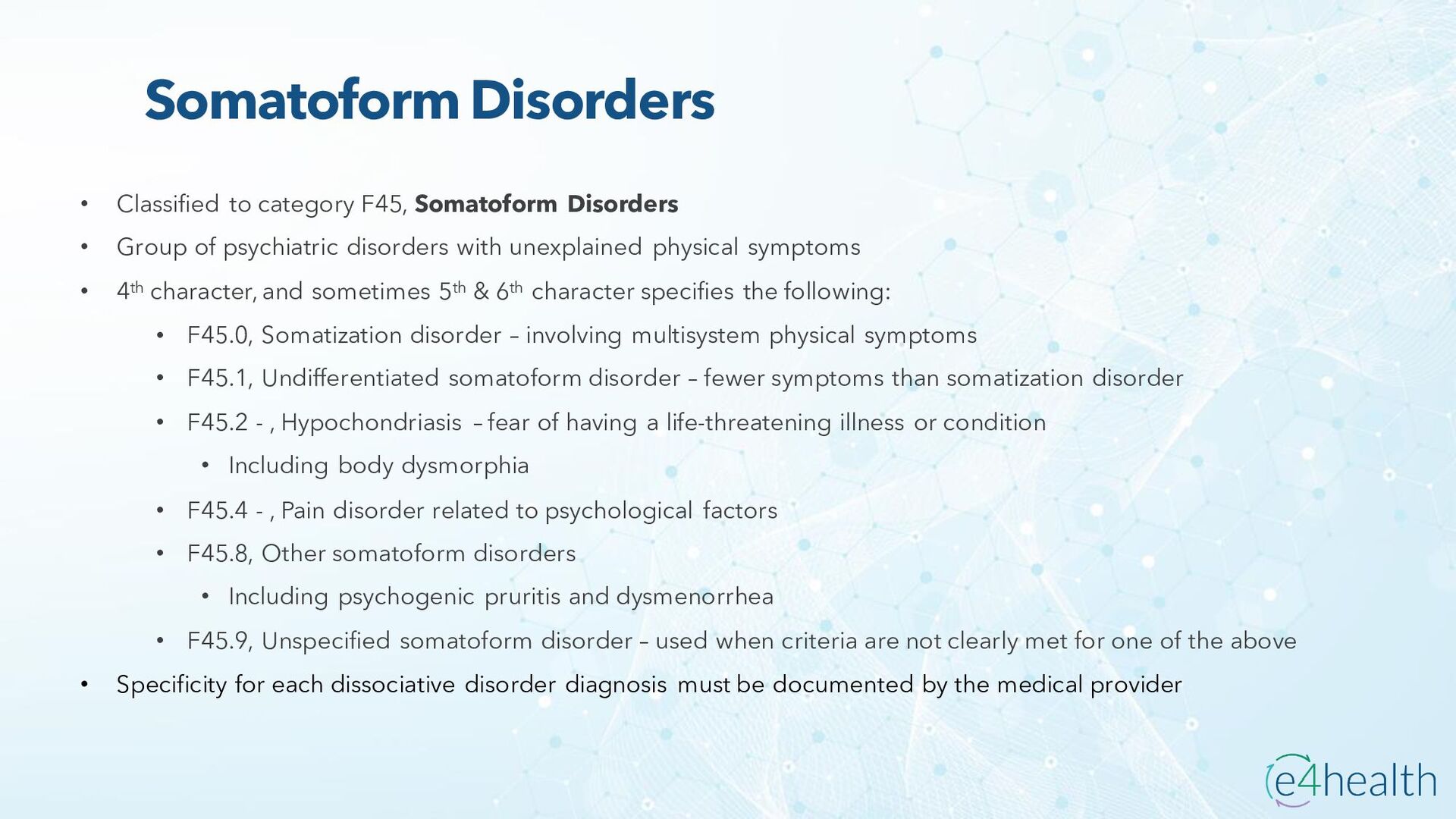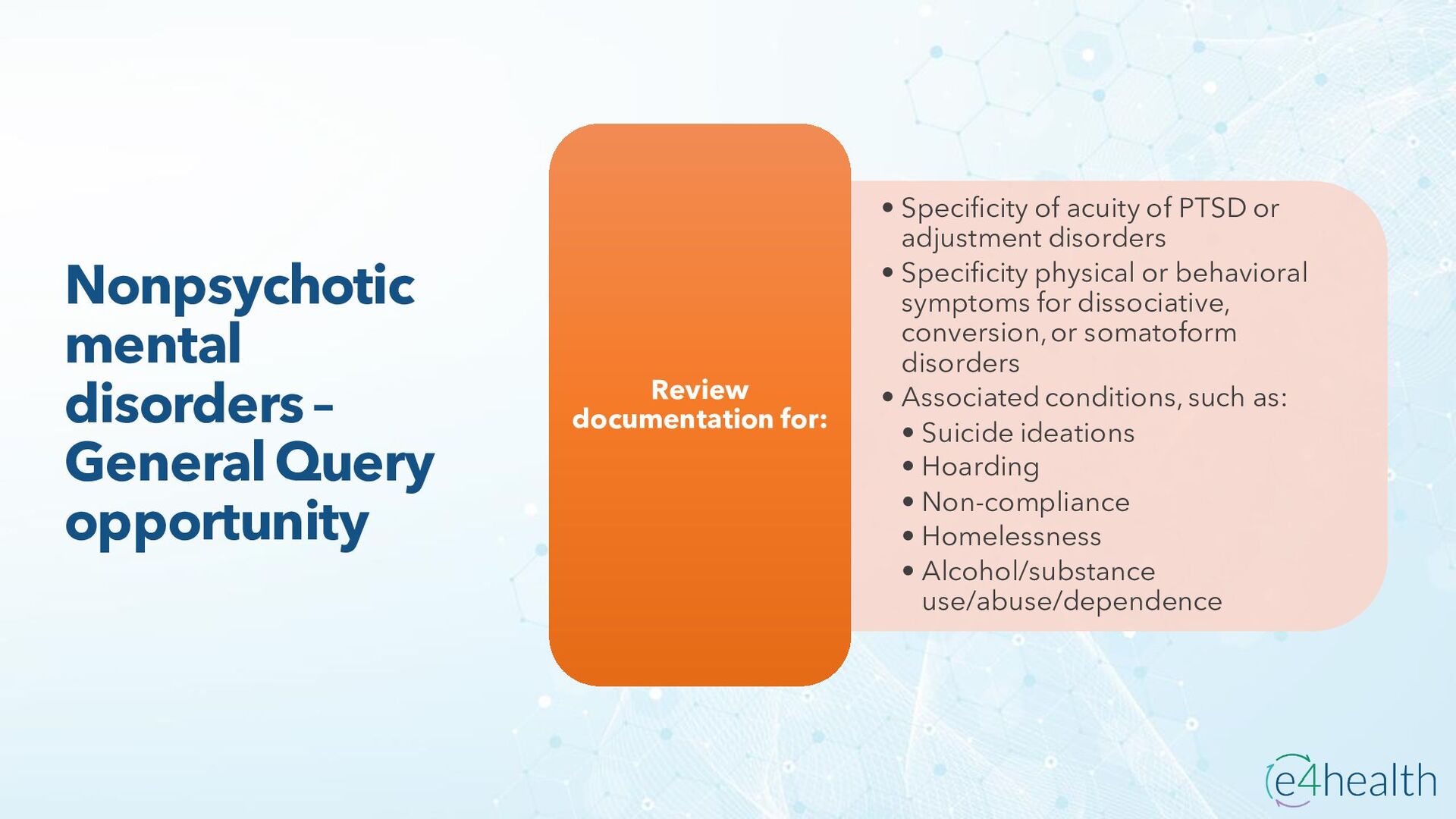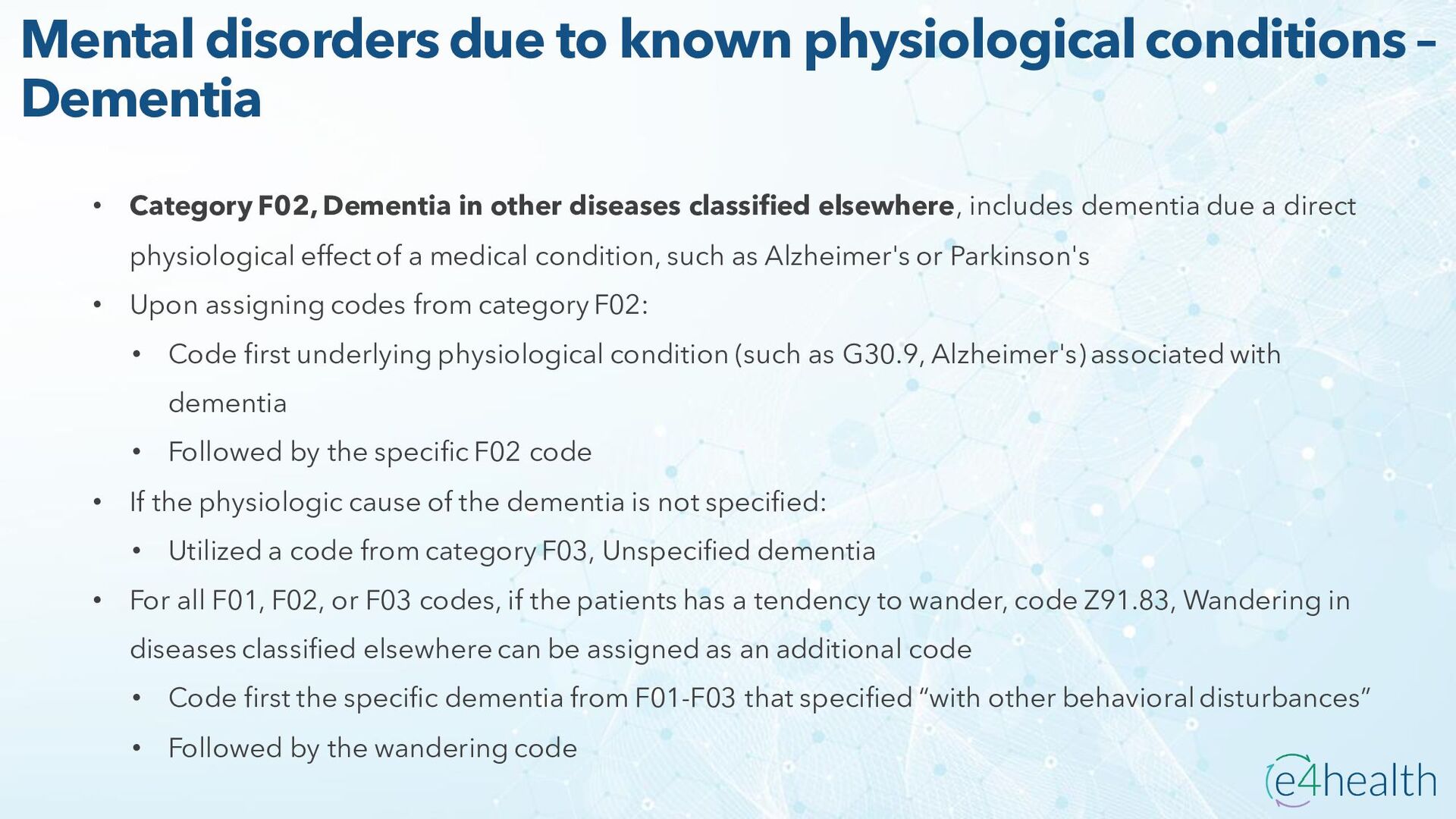 9-10 • A code has been created to identify depression (unspecified) and the narrative at category F32 was revised from Major depress ive disorder, single episode to "Depressive episode." This retitling brings back the WHO ICD-10 category title, and also brings the title into better alignment with all of what has been included in the category. The new code follows: • F32.A Depression, unspecified • Depression is a common mental health disorder. Approximately 30% of patients report symptoms of depression to their primary care providers; however, fewer than 10% of these patients have major depression. Although depression can begin at almost any age, it typically develops during a person's mid-teens, 20s, or 30s. When untreated, an episode of depression may last from 6 months to two years or more, and episodes tend to recur several times over a lifetime. • The exact etiology of depression is unclear; however, risk factors may include heredity, certain physical disorders, emotionally distressing events, changes in hormone levels, and side effects of certain drugs. • Symptoms of depression vary, and typically develop gradually over days or weeks. Symptoms may include anxiety, feelings of loneliness, irritability, sadness, poor concentration, poor hygiene, and loss of interest in activities that were once enjoyed. Some people have poor appetite while others overeat. Some become withdrawn, have difficulty sleeping or sleep more than usual, and some have thoughts of death and suicide. • Previously in ICD-10-CM, the default for Depression not otherwise specified (NOS) was code F32.9, Major depressive disorder, single episode, unspecified. However, this code did not separately capture the actual occurrence of depression not further specified, and statistically inflated the incidence of major depressive disorder.