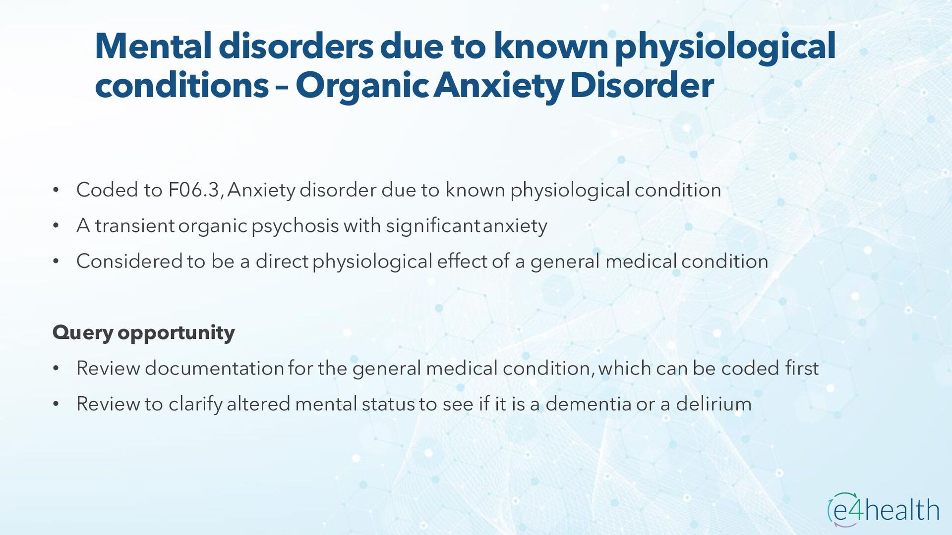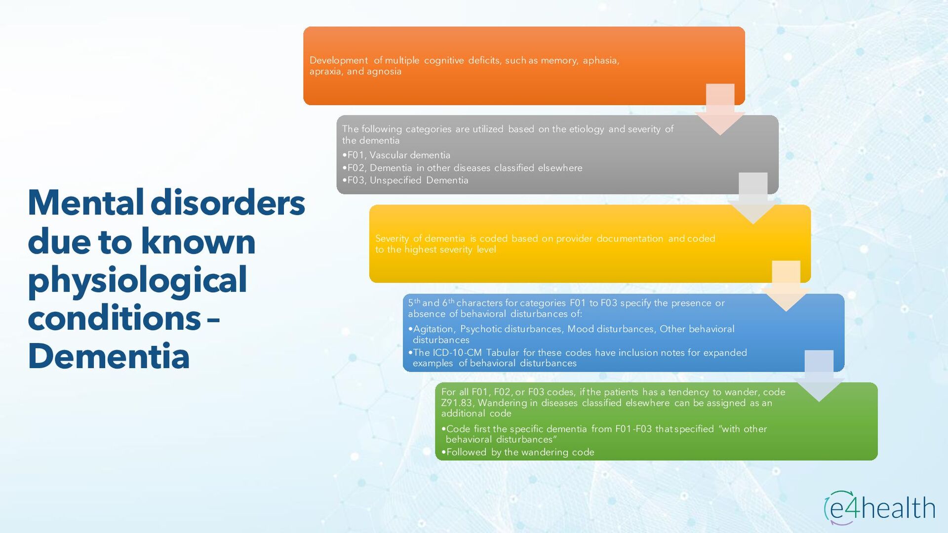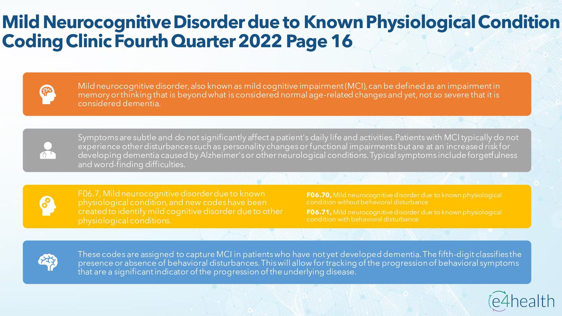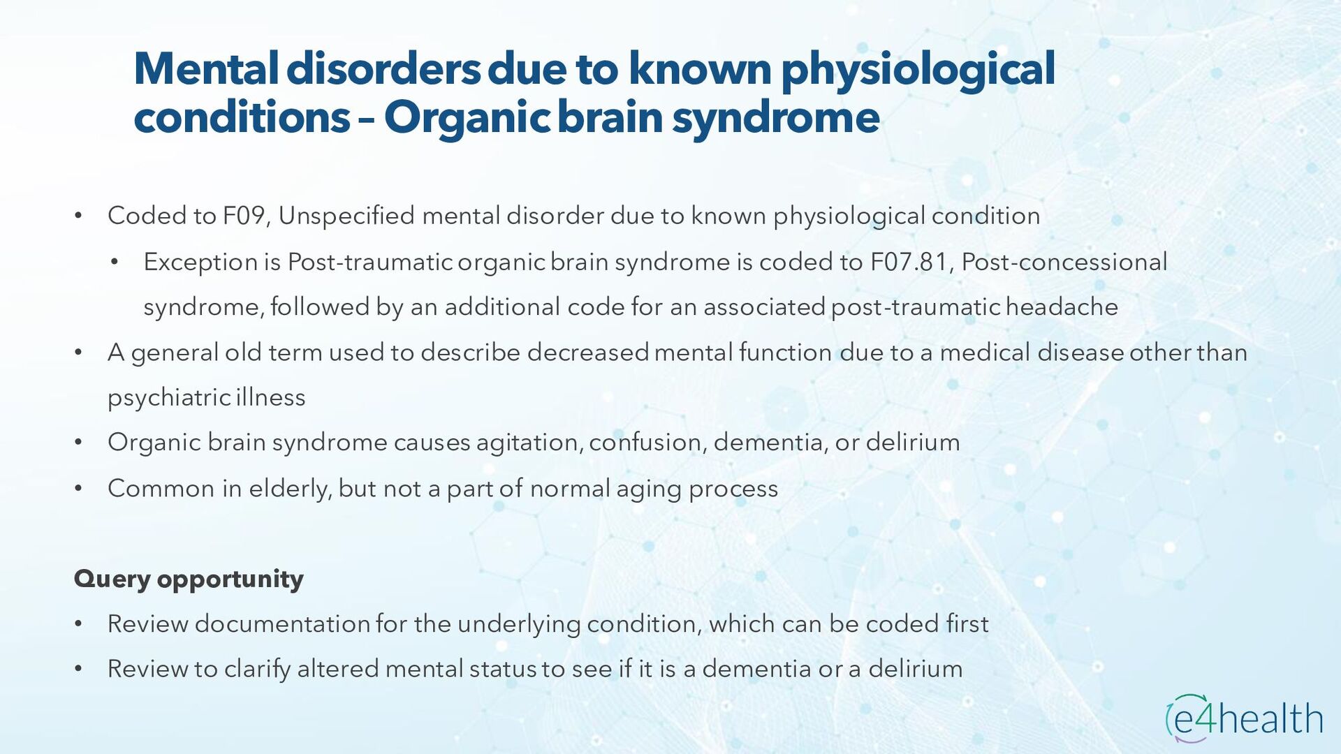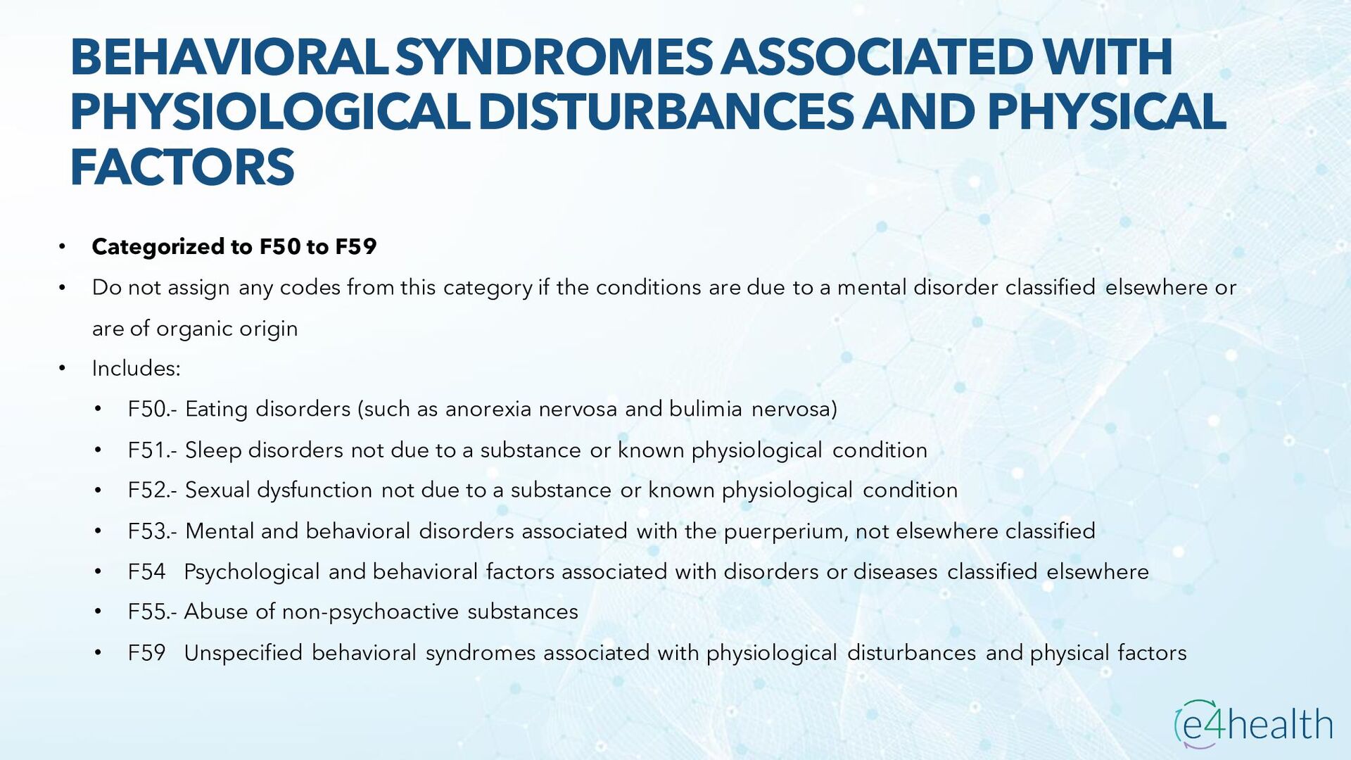 9-10 • A code has been created to identify depression (unspecified) and the narrative at category F32 was revised from Major depress ive disorder, single episode to "Depressive episode." This retitling brings back the WHO ICD-10 category title, and also brings the title into better alignment with all of what has been included in the category. The new code follows: • F32.A Depression, unspecified • Depression is a common mental health disorder. Approximately 30% of patients report symptoms of depression to their primary care providers; however, fewer than 10% of these patients have major depression. Although depression can begin at almost any age, it typically develops during a person's mid-teens, 20s, or 30s. When untreated, an episode of depression may last from 6 months to two years or more, and episodes tend to recur several times over a lifetime. • The exact etiology of depression is unclear; however, risk factors may include heredity, certain physical disorders, emotionally distressing events, changes in hormone levels, and side effects of certain drugs. • Symptoms of depression vary, and typically develop gradually over days or weeks. Symptoms may include anxiety, feelings of loneliness, irritability, sadness, poor concentration, poor hygiene, and loss of interest in activities that were once enjoyed. Some people have poor appetite while others overeat. Some become withdrawn, have difficulty sleeping or sleep more than usual, and some have thoughts of death and suicide. • Previously in ICD-10-CM, the default for Depression not otherwise specified (NOS) was code F32.9, Major depressive disorder, single episode, unspecified. However, this code did not separately capture the actual occurrence of depression not further specified, and statistically inflated the incidence of major depressive disorder.