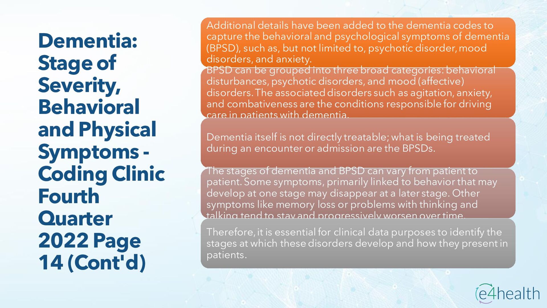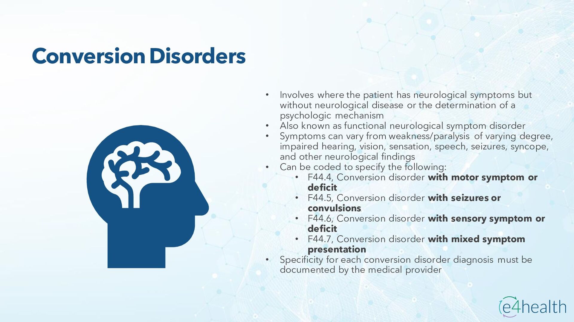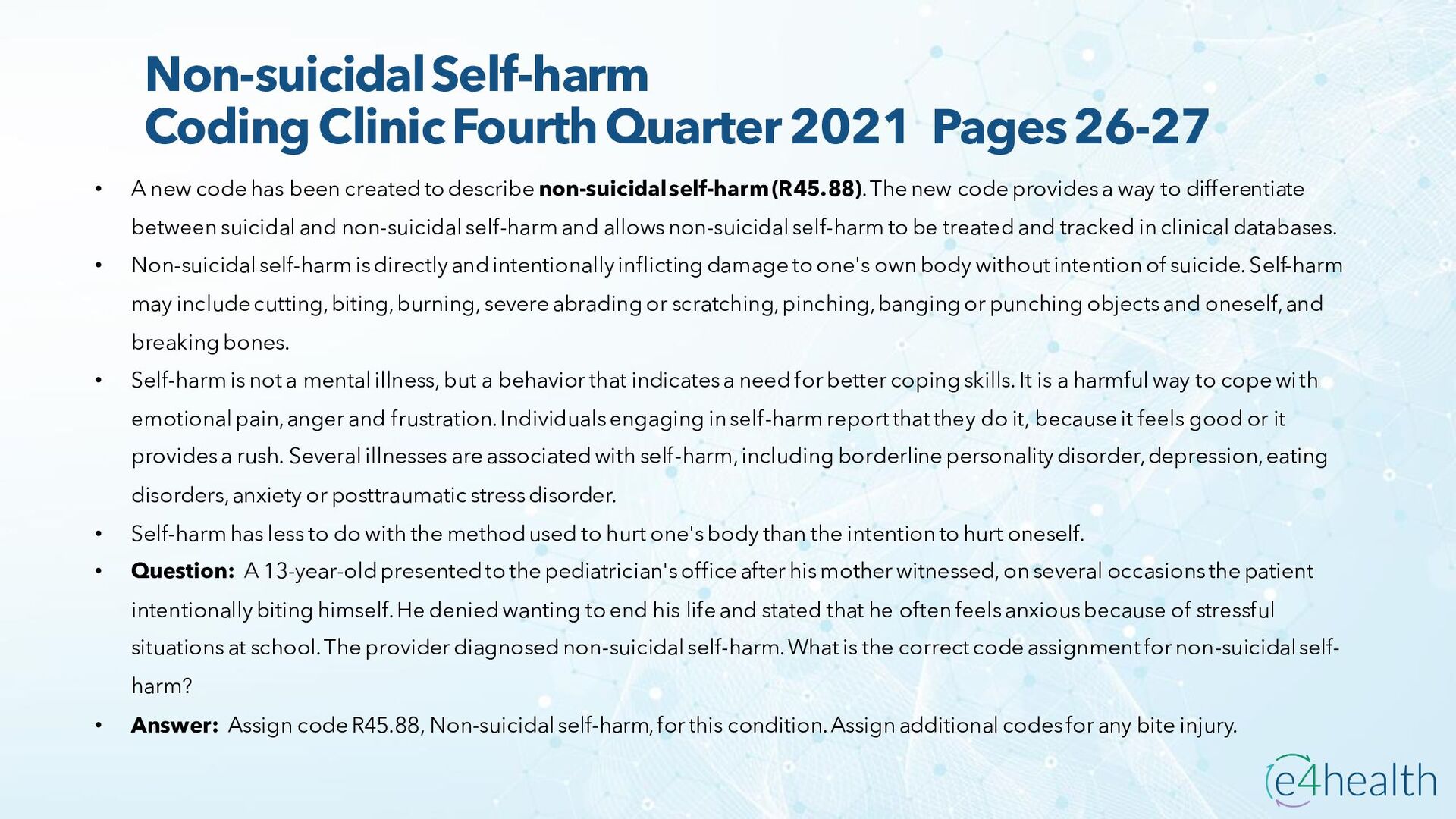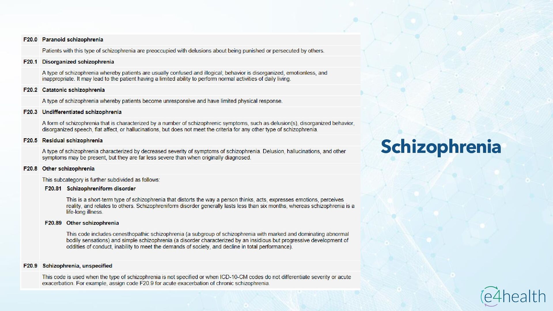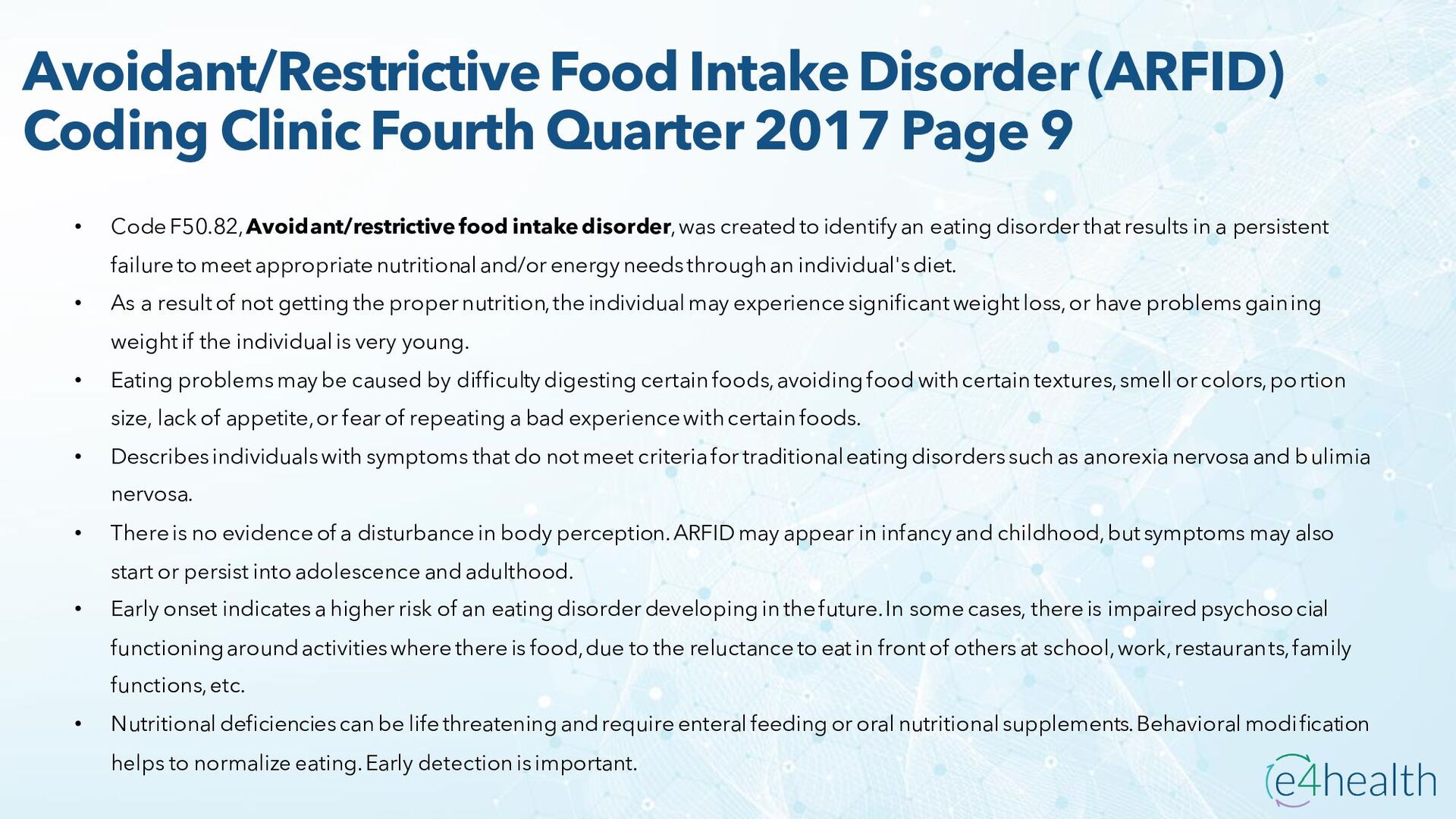 9-10 • A code has been created to identify depression (unspecified) and the narrative at category F32 was revised from Major depress ive disorder, single episode to "Depressive episode." This retitling brings back the WHO ICD-10 category title, and also brings the title into better alignment with all of what has been included in the category. The new code follows: • F32.A Depression, unspecified • Depression is a common mental health disorder. Approximately 30% of patients report symptoms of depression to their primary care providers; however, fewer than 10% of these patients have major depression. Although depression can begin at almost any age, it typically develops during a person's mid-teens, 20s, or 30s. When untreated, an episode of depression may last from 6 months to two years or more, and episodes tend to recur several times over a lifetime. • The exact etiology of depression is unclear; however, risk factors may include heredity, certain physical disorders, emotionally distressing events, changes in hormone levels, and side effects of certain drugs. • Symptoms of depression vary, and typically develop gradually over days or weeks. Symptoms may include anxiety, feelings of loneliness, irritability, sadness, poor concentration, poor hygiene, and loss of interest in activities that were once enjoyed. Some people have poor appetite while others overeat. Some become withdrawn, have difficulty sleeping or sleep more than usual, and some have thoughts of death and suicide. • Previously in ICD-10-CM, the default for Depression not otherwise specified (NOS) was code F32.9, Major depressive disorder, single episode, unspecified. However, this code did not separately capture the actual occurrence of depression not further specified, and statistically inflated the incidence of major depressive disorder.