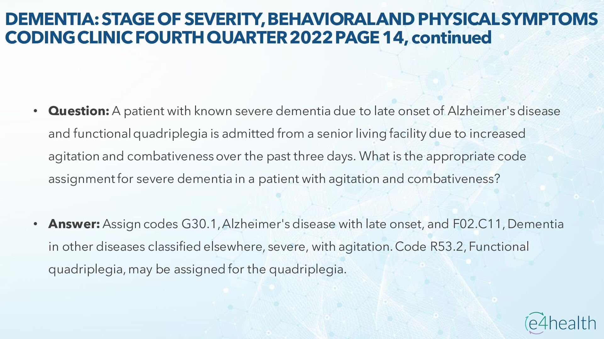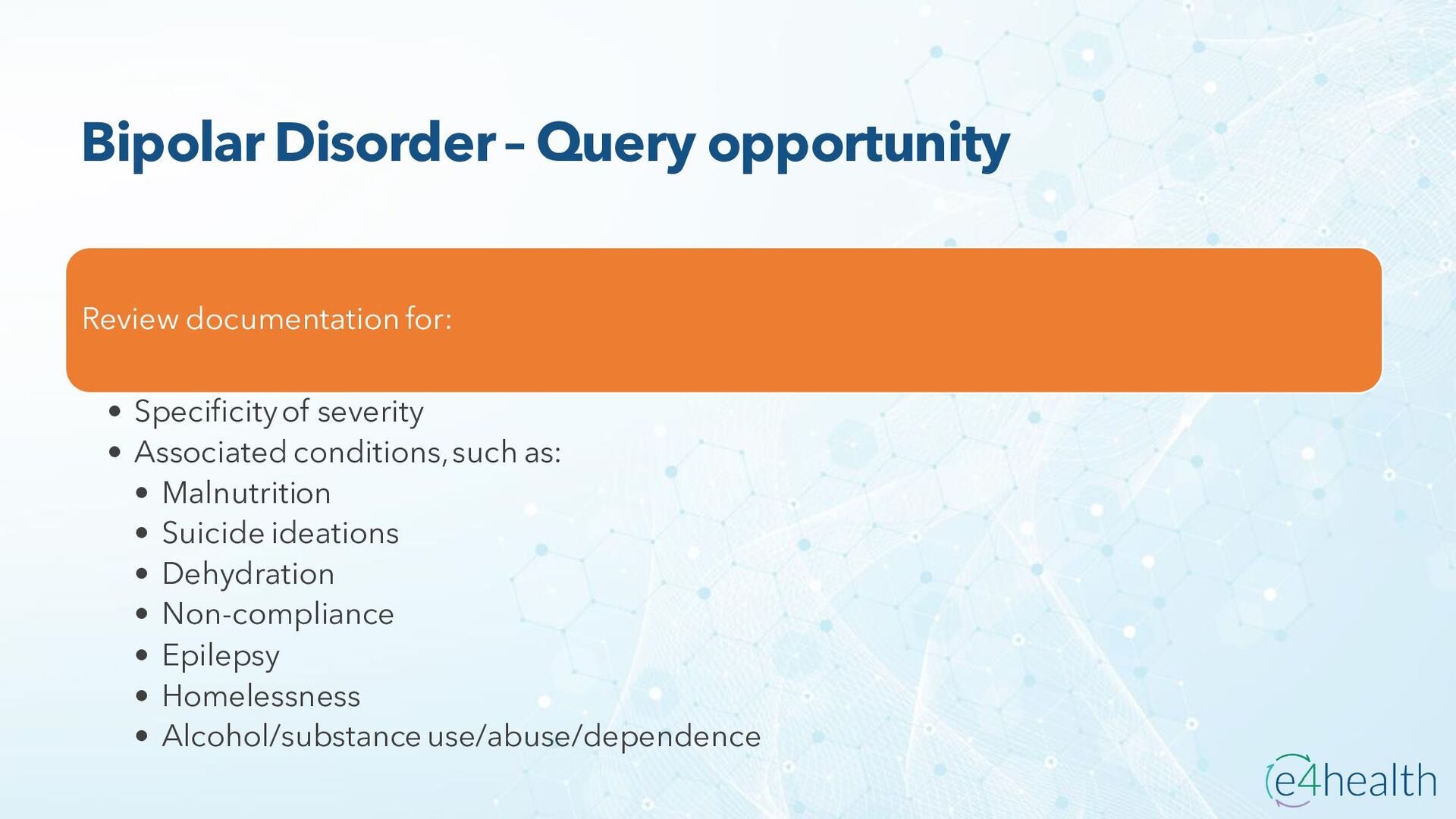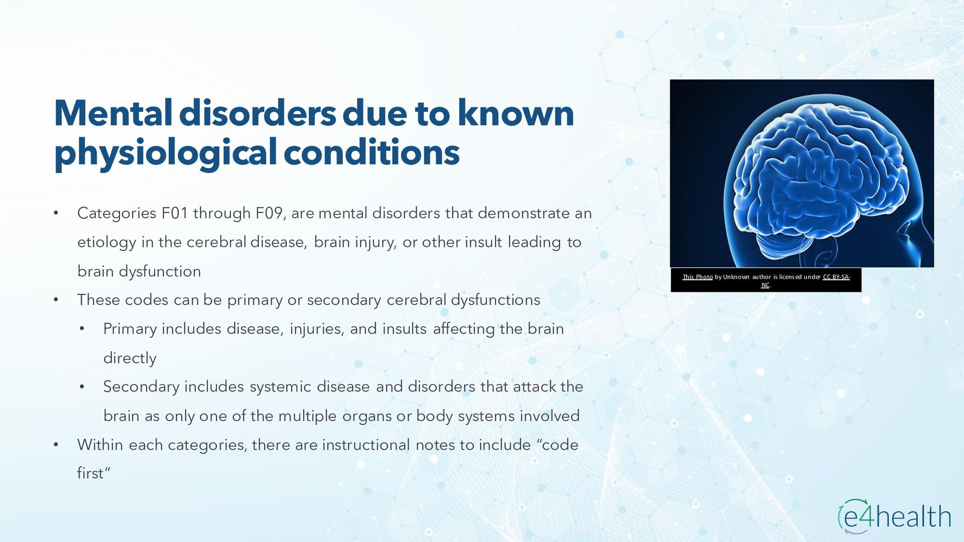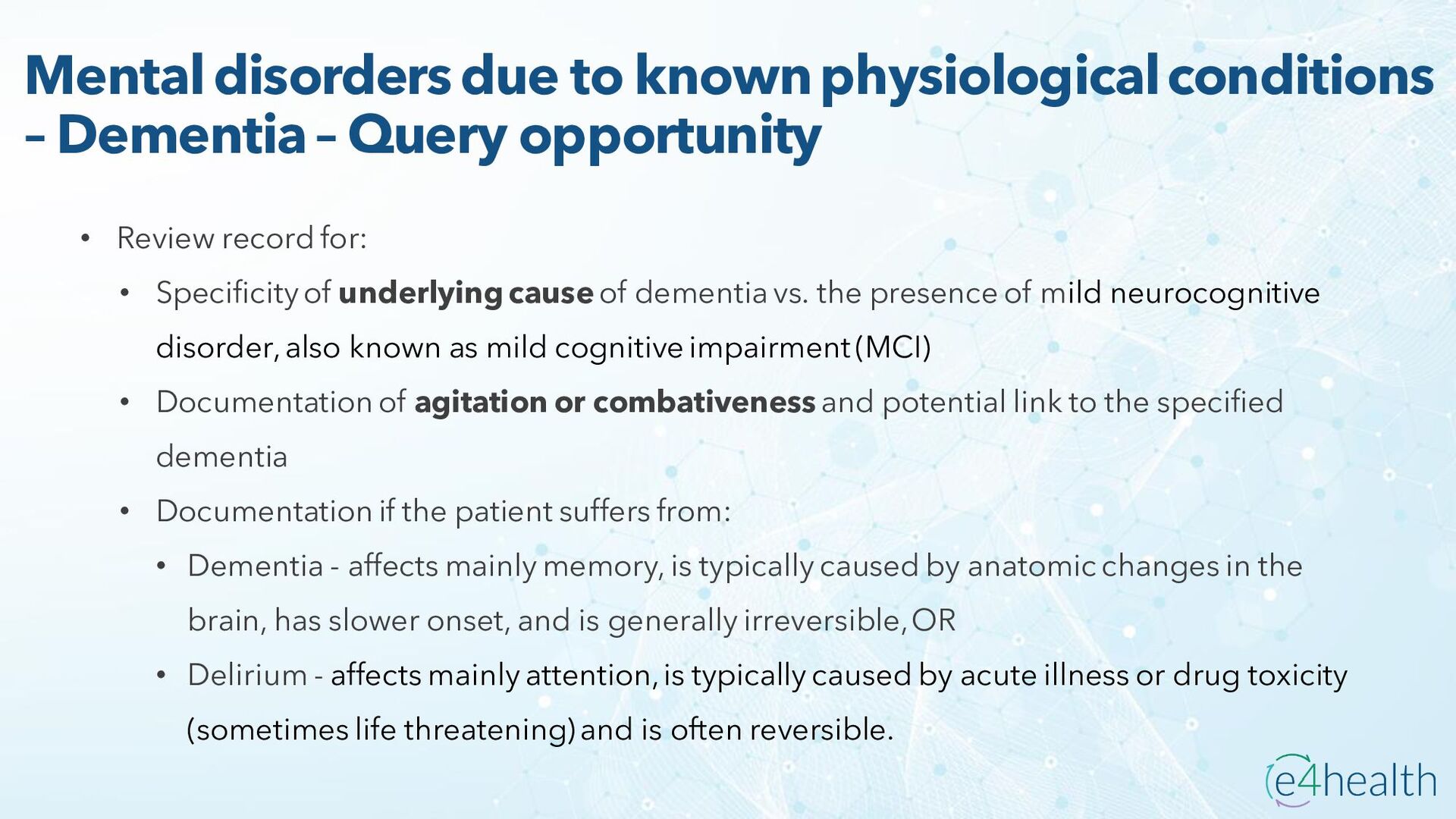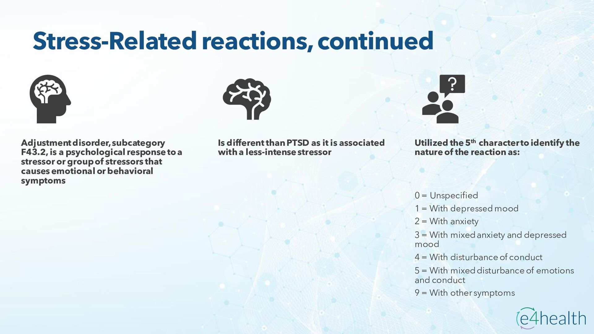 9-10 • A code has been created to identify depression (unspecified) and the narrative at category F32 was revised from Major depress ive disorder, single episode to "Depressive episode." This retitling brings back the WHO ICD-10 category title, and also brings the title into better alignment with all of what has been included in the category. The new code follows: • F32.A Depression, unspecified • Depression is a common mental health disorder. Approximately 30% of patients report symptoms of depression to their primary care providers; however, fewer than 10% of these patients have major depression. Although depression can begin at almost any age, it typically develops during a person's mid-teens, 20s, or 30s. When untreated, an episode of depression may last from 6 months to two years or more, and episodes tend to recur several times over a lifetime. • The exact etiology of depression is unclear; however, risk factors may include heredity, certain physical disorders, emotionally distressing events, changes in hormone levels, and side effects of certain drugs. • Symptoms of depression vary, and typically develop gradually over days or weeks. Symptoms may include anxiety, feelings of loneliness, irritability, sadness, poor concentration, poor hygiene, and loss of interest in activities that were once enjoyed. Some people have poor appetite while others overeat. Some become withdrawn, have difficulty sleeping or sleep more than usual, and some have thoughts of death and suicide. • Previously in ICD-10-CM, the default for Depression not otherwise specified (NOS) was code F32.9, Major depressive disorder, single episode, unspecified. However, this code did not separately capture the actual occurrence of depression not further specified, and statistically inflated the incidence of major depressive disorder.
