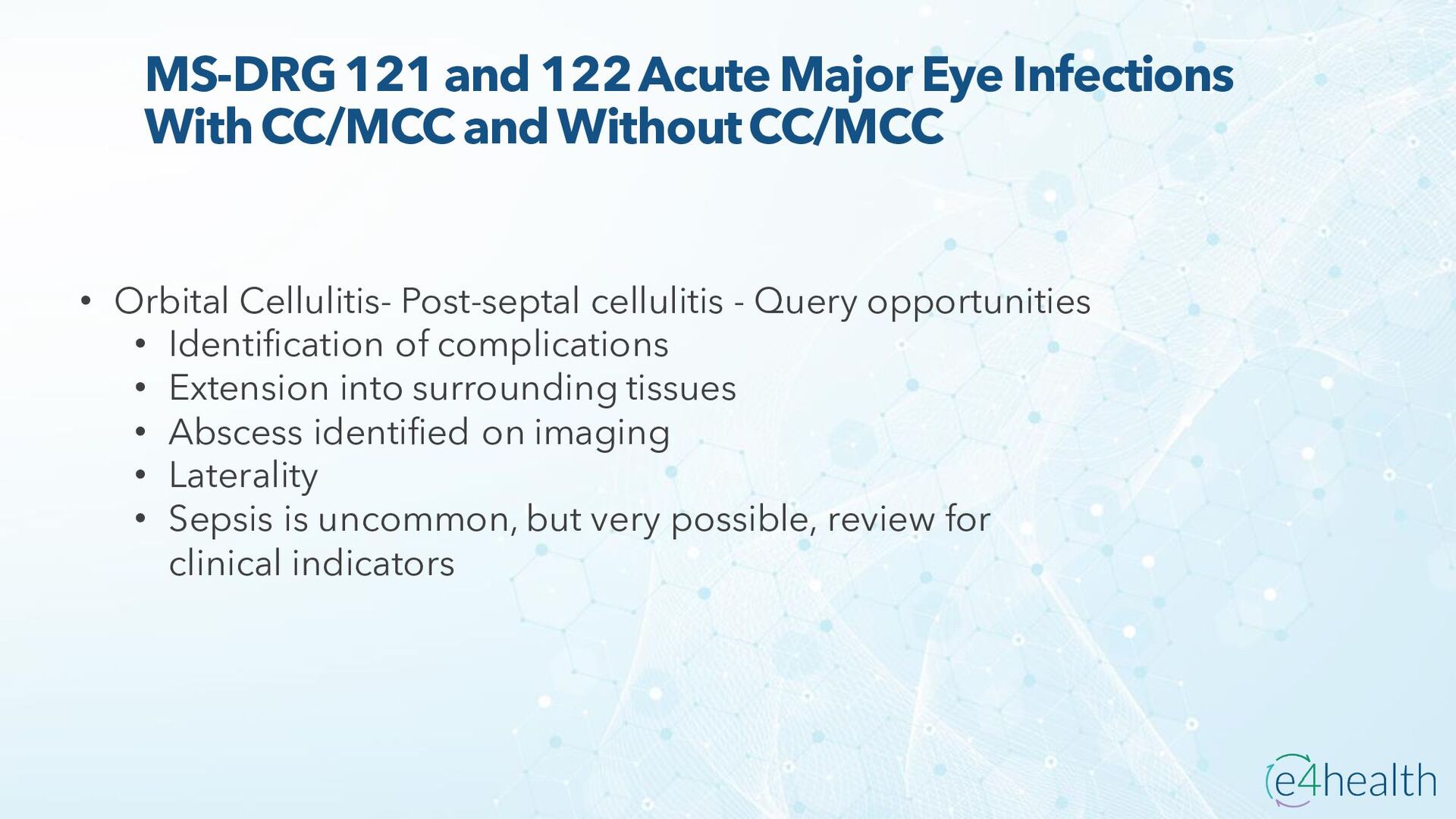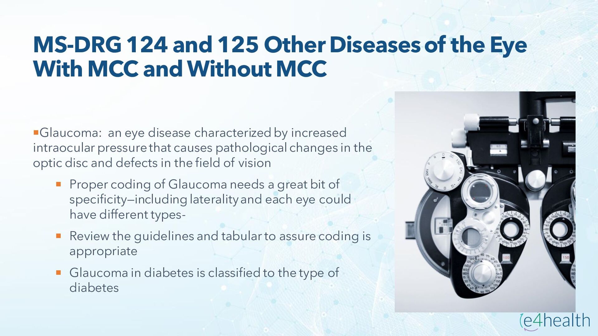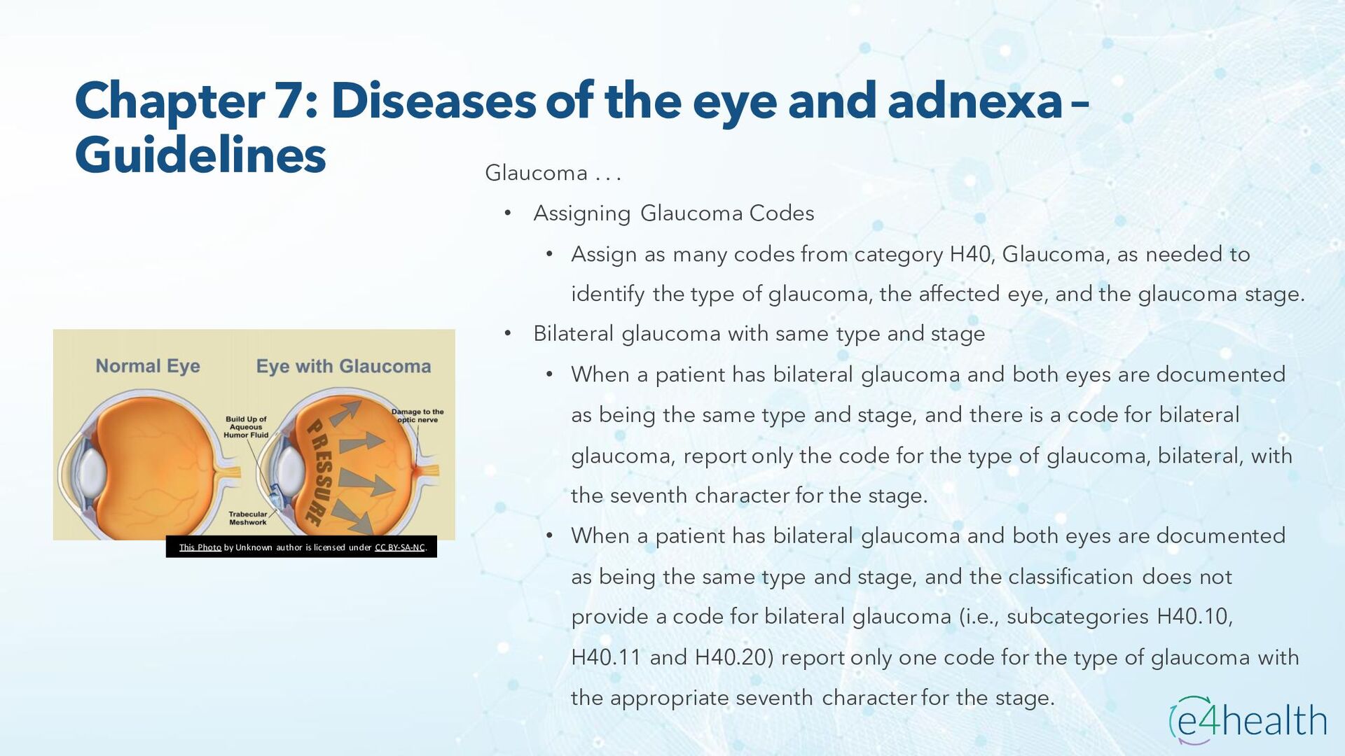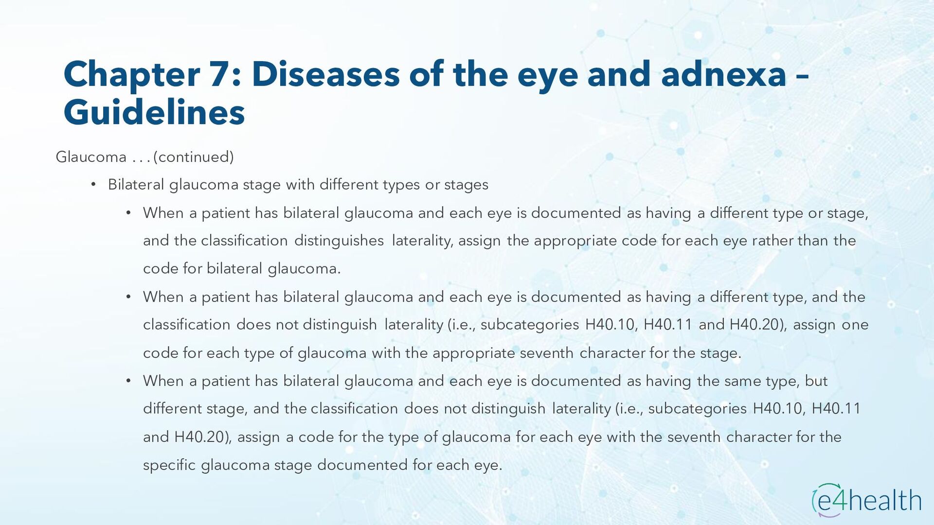 different types or stages • When a patient has bilateral glaucoma and each eye is documented as having a different type or stage, and the classification distinguishes laterality, assign the appropriate code for each eye rather than the code for bilateral glaucoma. • When a patient has bilateral glaucoma and each eye is documented as having a different type, and the classification does not distinguish laterality (i.e., subcategories H40.10, H40.11 and H40.20), assign one code for each type of glaucoma with the appropriate seventh character for the stage. • When a patient has bilateral glaucoma and each eye is documented as having the same type, but different stage, and the classification does not distinguish laterality (i.e., subcategories H40.10, H40.11 and H40.20), assign a code for the type of glaucoma for each eye with the seventh character for the specific glaucoma stage documented for each eye. Chapter 7: Diseases of the eye and adnexa – Guidelines