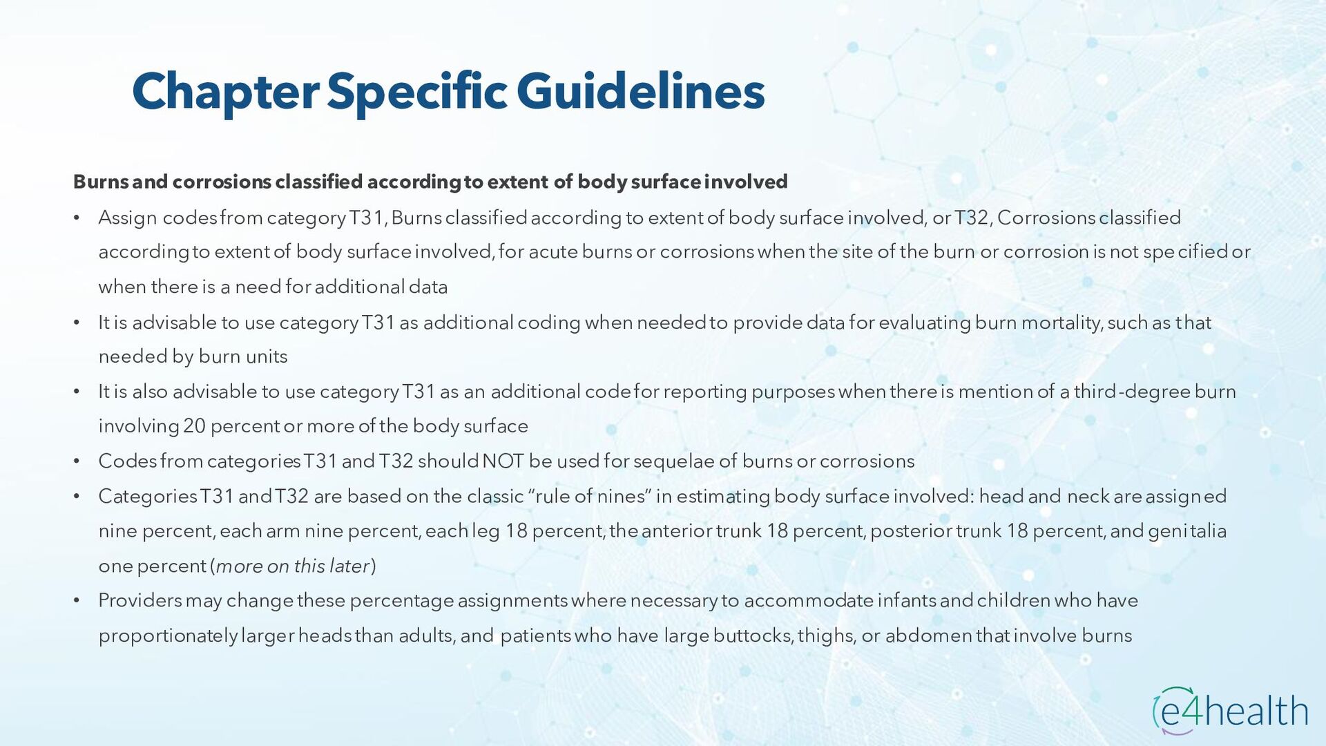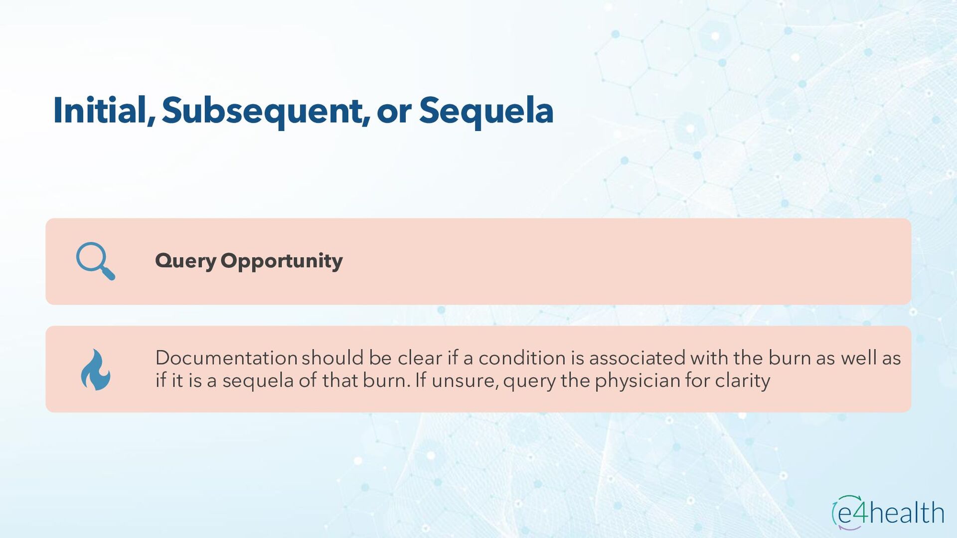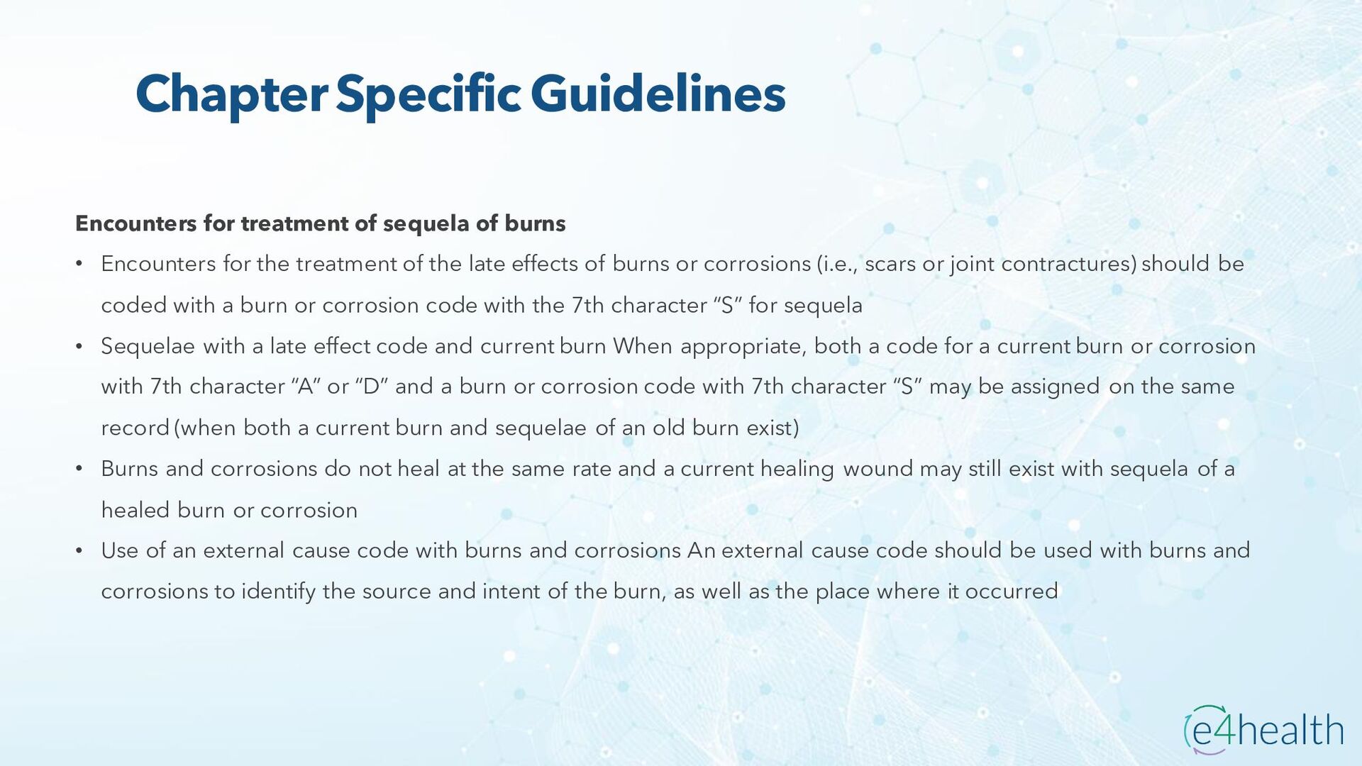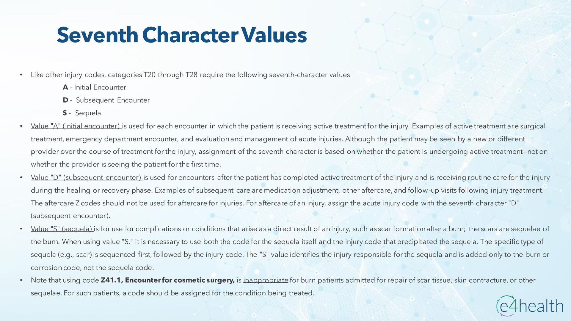 through T28 require the following seventh-character values A - Initial Encounter D - Subsequent Encounter S - Sequela • Value "A" (initial encounter) is used for each encounter in which the patient is receiving active treatment for the injury. Examples of active treatment are surgical treatment, emergency department encounter, and evaluation and management of acute injuries. Although the patient may be seen by a new or different provider over the course of treatment for the injury, assignment of the seventh character is based on whether the patient is undergoing active treatment—not on whether the provider is seeing the patient for the first time. • Value "D" (subsequent encounter) is used for encounters after the patient has completed active treatment of the injury and is receiving routine care for the injury during the healing or recovery phase. Examples of subsequent care are medication adjustment, other aftercare, and follow-up visits following injury treatment. The aftercare Z codes should not be used for aftercare for injuries. For aftercare of an injury, assign the acute injury code with the seventh character "D" (subsequent encounter). • Value "S" (sequela) is for use for complications or conditions that arise as a direct result of an injury, such as scar formation after a burn; the scars are sequelae of the burn. When using value "S," it is necessary to use both the code for the sequela itself and the injury code that precipitated the sequela. The specific type of sequela (e.g., scar) is sequenced first, followed by the injury code. The "S" value identifies the injury responsible for the sequela and is added only to the burn or corrosion code, not the sequela code. • Note that using code Z41.1, Encounter for cosmetic surgery, is inappropriate for burn patients admitted for repair of scar tissue, skin contracture, or other sequelae. For such patients, a code should be assigned for the condition being treated.