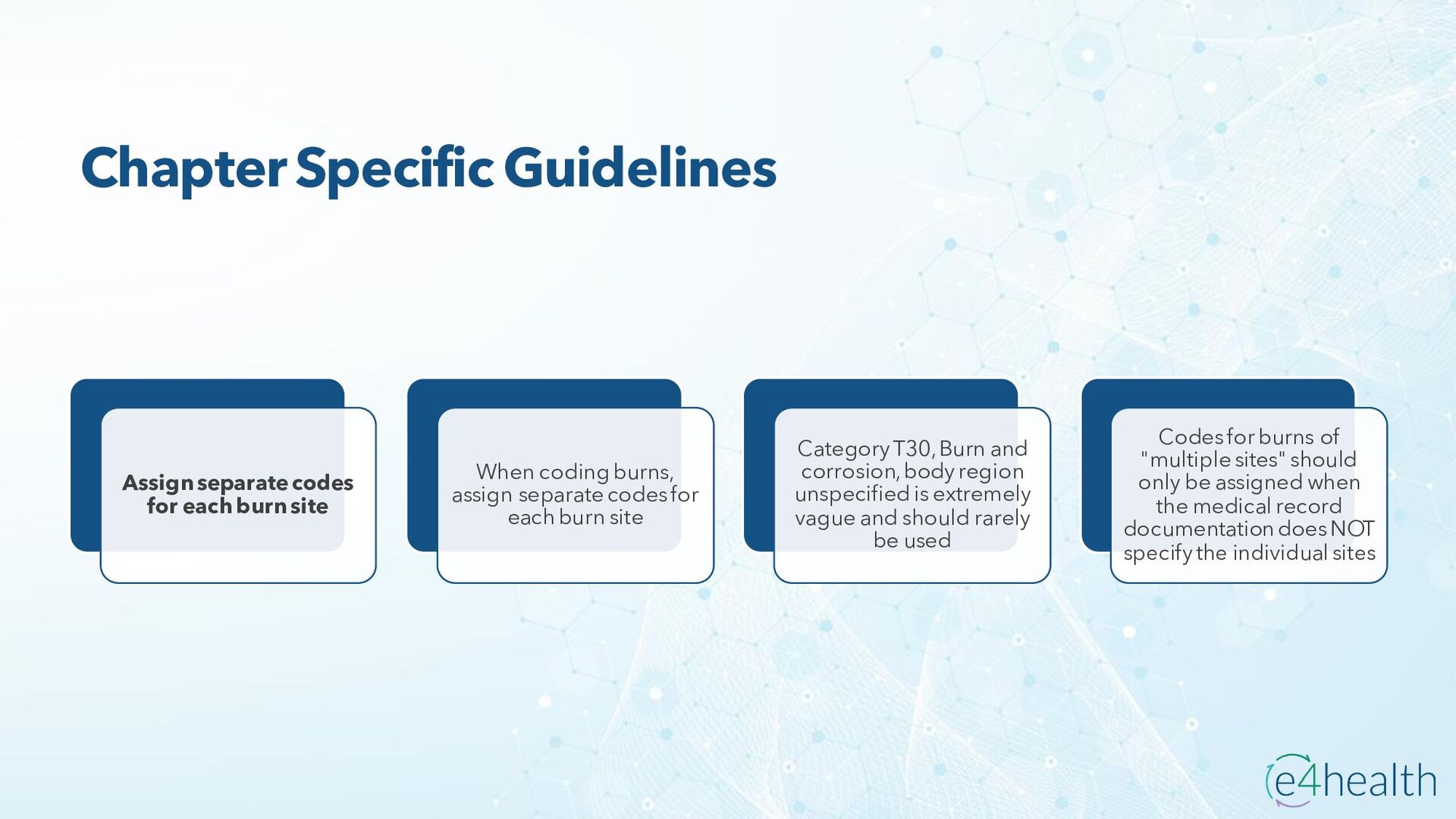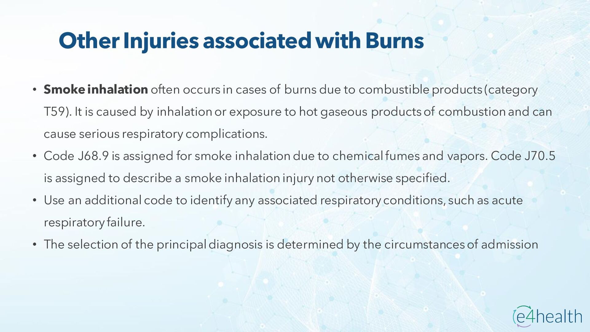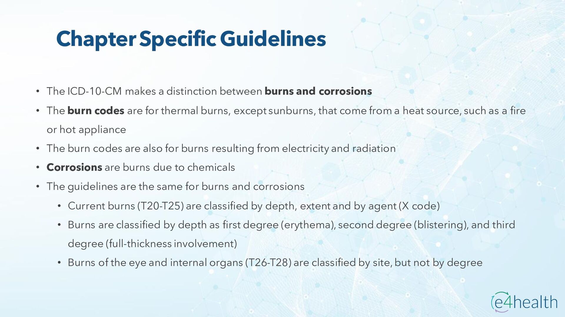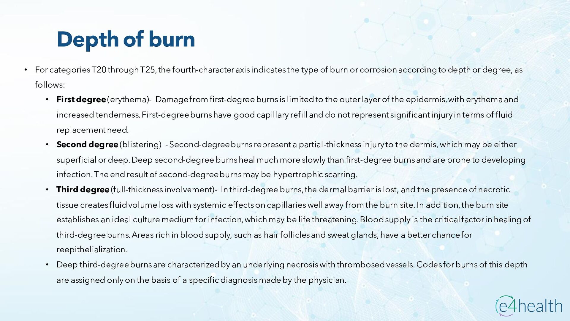 through T28 require the following seventh-character values A - Initial Encounter D - Subsequent Encounter S - Sequela • Value "A" (initial encounter) is used for each encounter in which the patient is receiving active treatment for the injury. Examples of active treatment are surgical treatment, emergency department encounter, and evaluation and management of acute injuries. Although the patient may be seen by a new or different provider over the course of treatment for the injury, assignment of the seventh character is based on whether the patient is undergoing active treatment—not on whether the provider is seeing the patient for the first time. • Value "D" (subsequent encounter) is used for encounters after the patient has completed active treatment of the injury and is receiving routine care for the injury during the healing or recovery phase. Examples of subsequent care are medication adjustment, other aftercare, and follow-up visits following injury treatment. The aftercare Z codes should not be used for aftercare for injuries. For aftercare of an injury, assign the acute injury code with the seventh character "D" (subsequent encounter). • Value "S" (sequela) is for use for complications or conditions that arise as a direct result of an injury, such as scar formation after a burn; the scars are sequelae of the burn. When using value "S," it is necessary to use both the code for the sequela itself and the injury code that precipitated the sequela. The specific type of sequela (e.g., scar) is sequenced first, followed by the injury code. The "S" value identifies the injury responsible for the sequela and is added only to the burn or corrosion code, not the sequela code. • Note that using code Z41.1, Encounter for cosmetic surgery, is inappropriate for burn patients admitted for repair of scar tissue, skin contracture, or other sequelae. For such patients, a code should be assigned for the condition being treated.