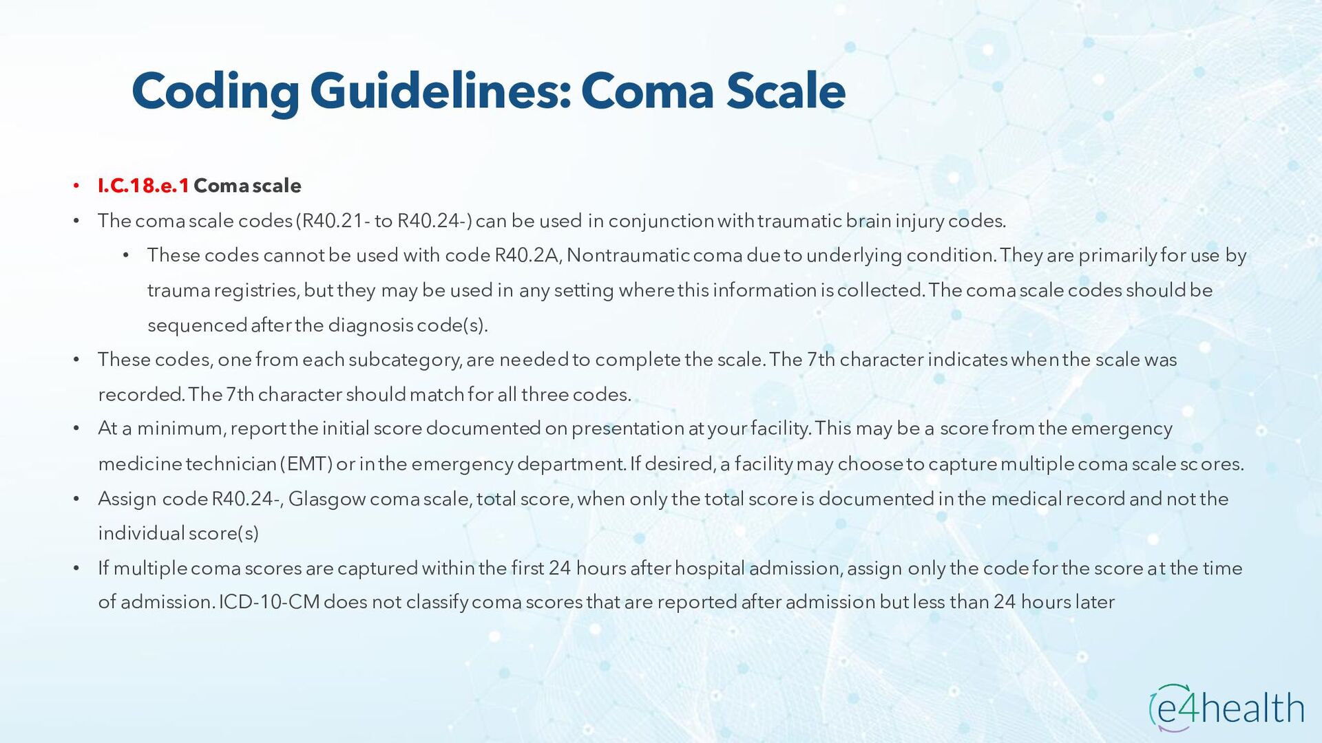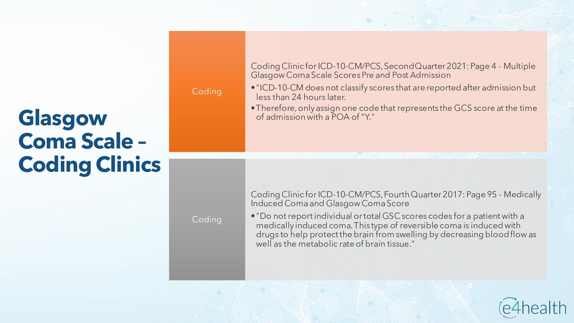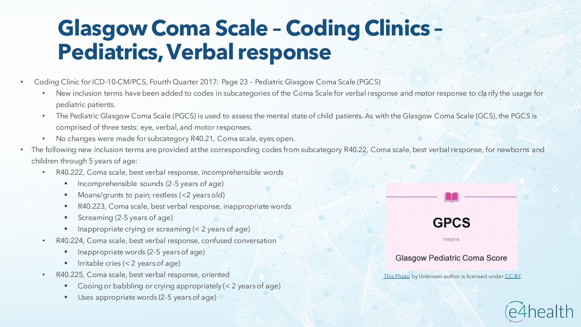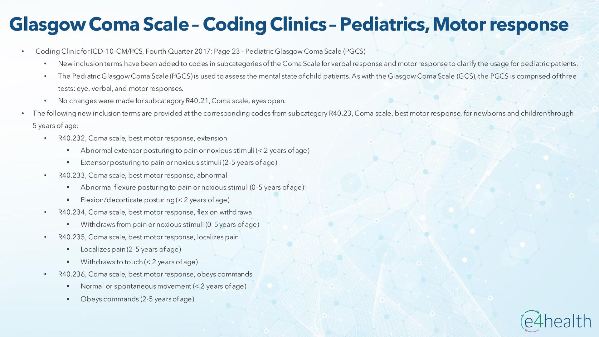 • Coding Clinic for ICD-10-CM/PCS, Fourth Quarter 2017: Page 23 – Pediatric Glasgow Coma Scale (PGCS) • New inclusion terms have been added to codes in subcategories of the Coma Scale for verbal response and motor response to clarify the usage for pediatric patients. • The Pediatric Glasgow Coma Scale (PGCS) is used to assess the mental state of child patients. As with the Glasgow Coma Scale (GCS), the PGCS is comprised of three tests: eye, verbal, and motor responses. • No changes were made for subcategory R40.21, Coma scale, eyes open. • The following new inclusion terms are provided at the corresponding codes from subcategory R40.23, Coma scale, best motor response, for newborns and children through 5 years of age: • R40.232, Coma scale, best motor response, extension ▪ Abnormal extensor posturing to pain or noxious stimuli (< 2 years of age) ▪ Extensor posturing to pain or noxious stimuli (2-5 years of age) • R40.233, Coma scale, best motor response, abnormal ▪ Abnormal flexure posturing to pain or noxious stimuli (0-5 years of age) ▪ Flexion/decorticate posturing (< 2 years of age) • R40.234, Coma scale, best motor response, flexion withdrawal ▪ Withdraws from pain or noxious stimuli (0-5 years of age) • R40.235, Coma scale, best motor response, localizes pain ▪ Localizes pain (2-5 years of age) ▪ Withdraws to touch (< 2 years of age) • R40.236, Coma scale, best motor response, obeys commands ▪ Normal or spontaneous movement (< 2 years of age) ▪ Obeys commands (2-5 years of age)