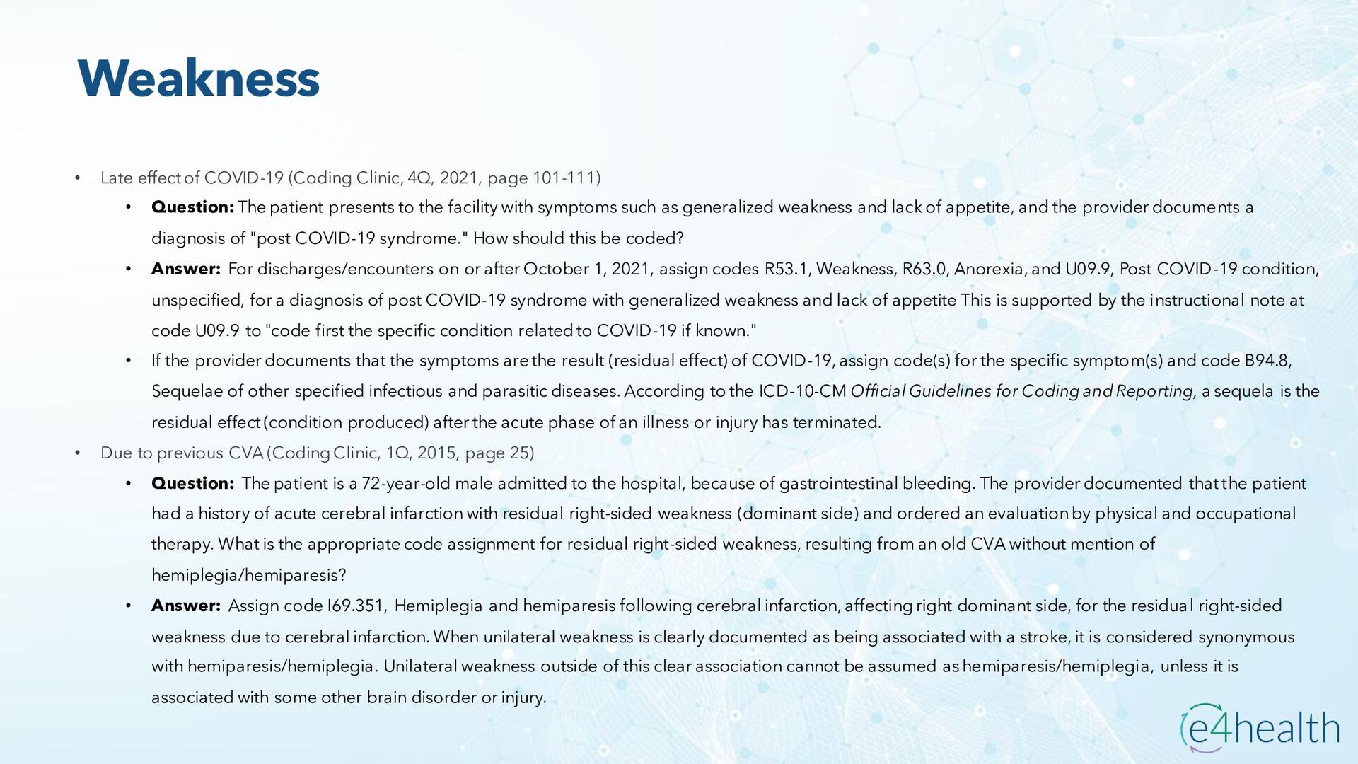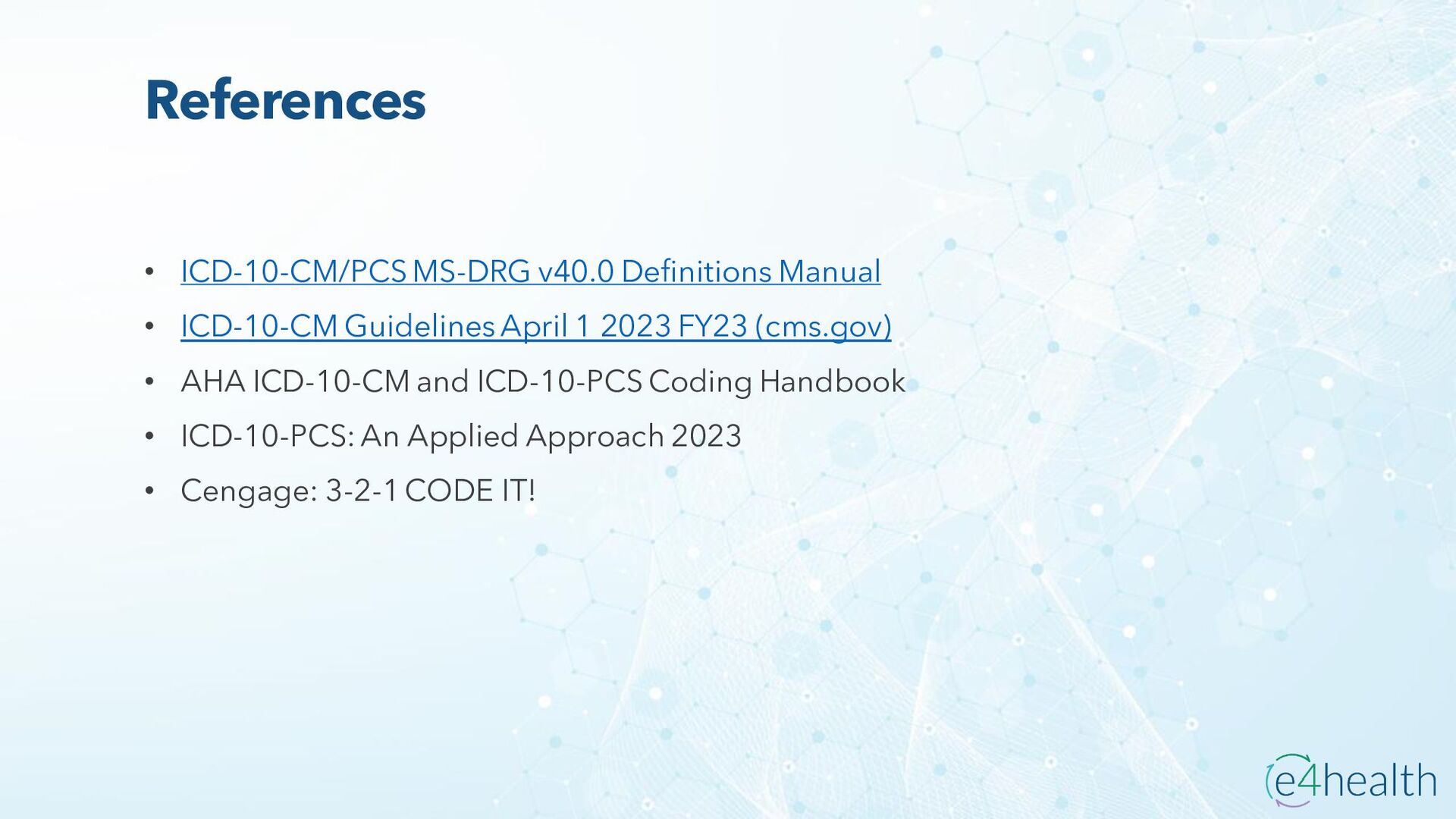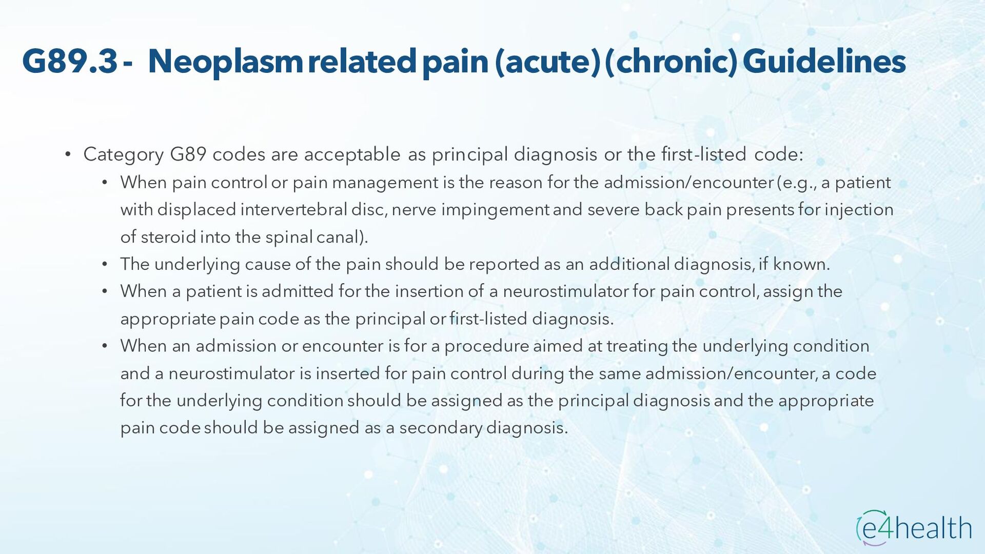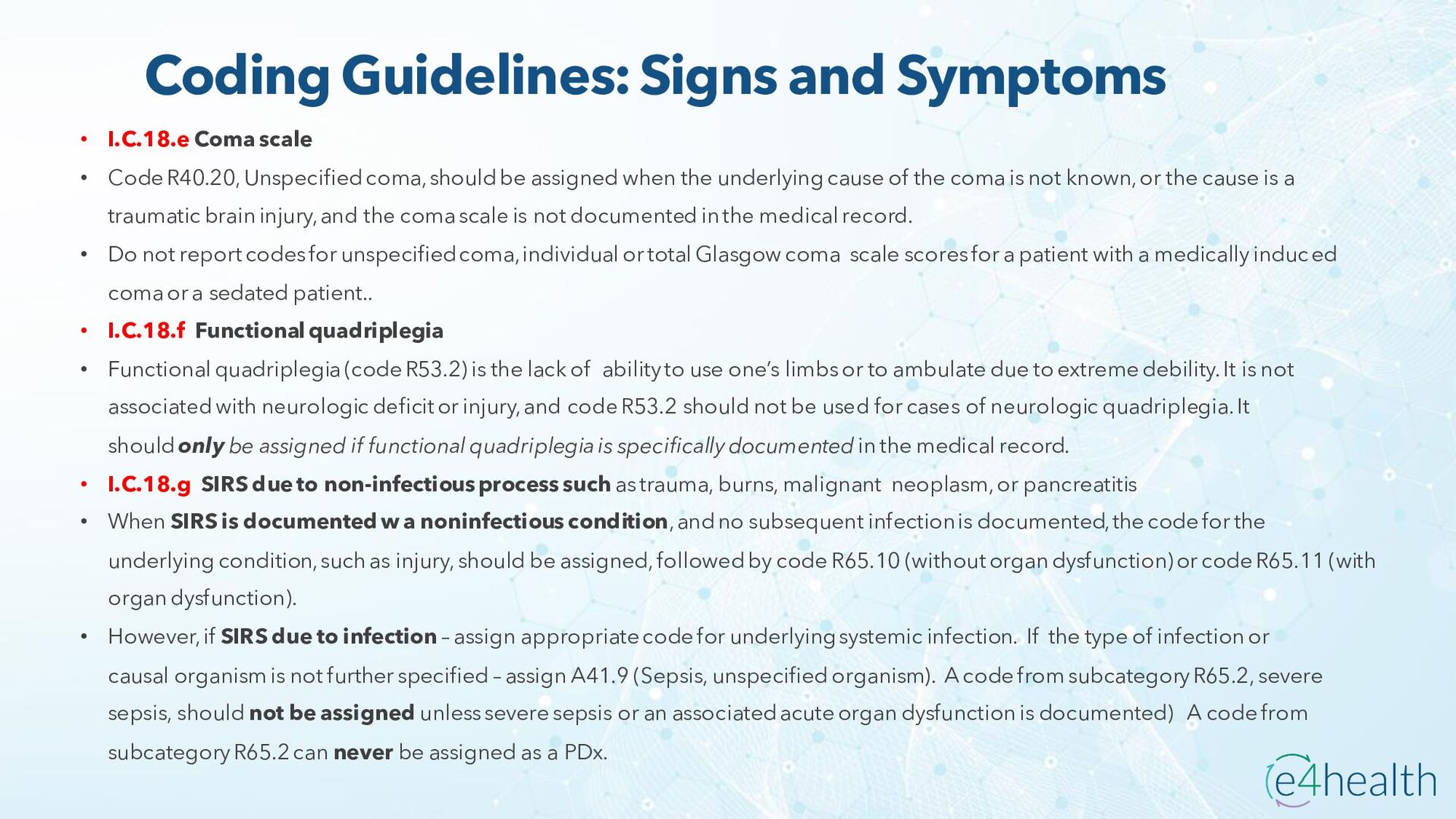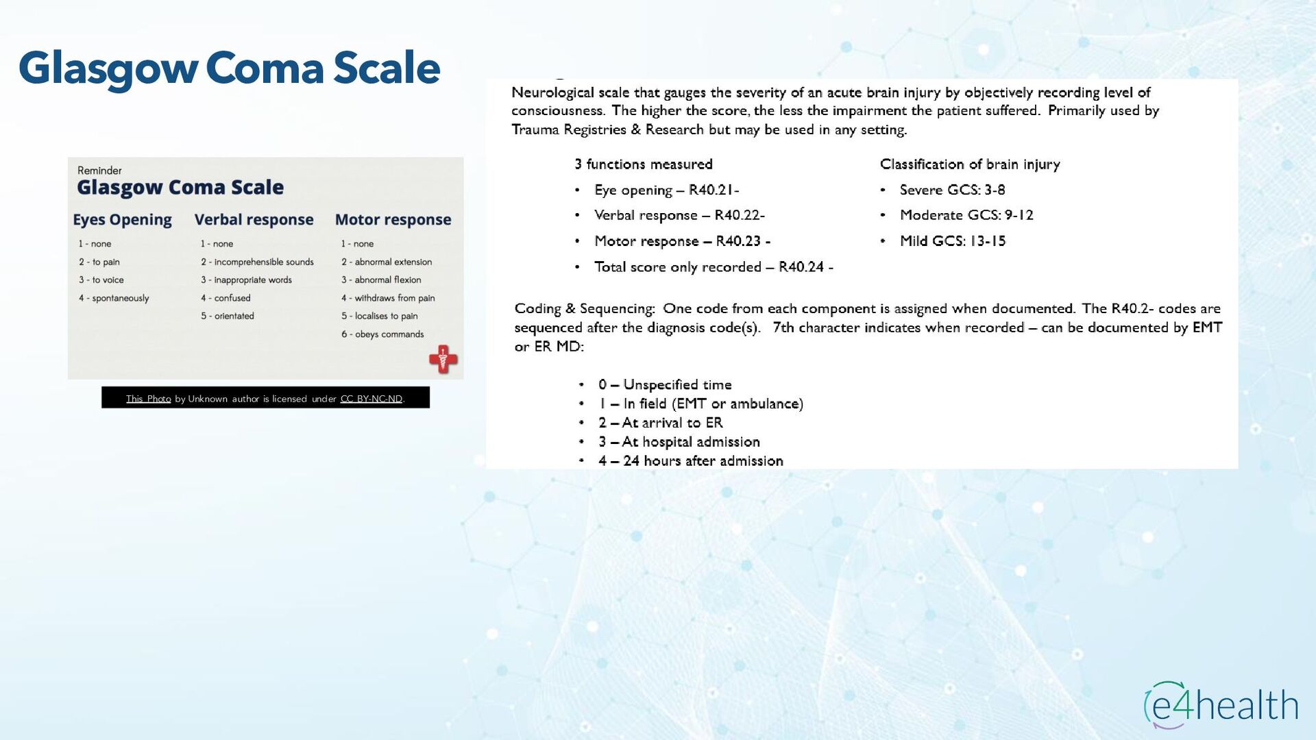 • Coding Clinic for ICD-10-CM/PCS, Fourth Quarter 2017: Page 23 – Pediatric Glasgow Coma Scale (PGCS) • New inclusion terms have been added to codes in subcategories of the Coma Scale for verbal response and motor response to clarify the usage for pediatric patients. • The Pediatric Glasgow Coma Scale (PGCS) is used to assess the mental state of child patients. As with the Glasgow Coma Scale (GCS), the PGCS is comprised of three tests: eye, verbal, and motor responses. • No changes were made for subcategory R40.21, Coma scale, eyes open. • The following new inclusion terms are provided at the corresponding codes from subcategory R40.23, Coma scale, best motor response, for newborns and children through 5 years of age: • R40.232, Coma scale, best motor response, extension ▪ Abnormal extensor posturing to pain or noxious stimuli (< 2 years of age) ▪ Extensor posturing to pain or noxious stimuli (2-5 years of age) • R40.233, Coma scale, best motor response, abnormal ▪ Abnormal flexure posturing to pain or noxious stimuli (0-5 years of age) ▪ Flexion/decorticate posturing (< 2 years of age) • R40.234, Coma scale, best motor response, flexion withdrawal ▪ Withdraws from pain or noxious stimuli (0-5 years of age) • R40.235, Coma scale, best motor response, localizes pain ▪ Localizes pain (2-5 years of age) ▪ Withdraws to touch (< 2 years of age) • R40.236, Coma scale, best motor response, obeys commands ▪ Normal or spontaneous movement (< 2 years of age) ▪ Obeys commands (2-5 years of age)