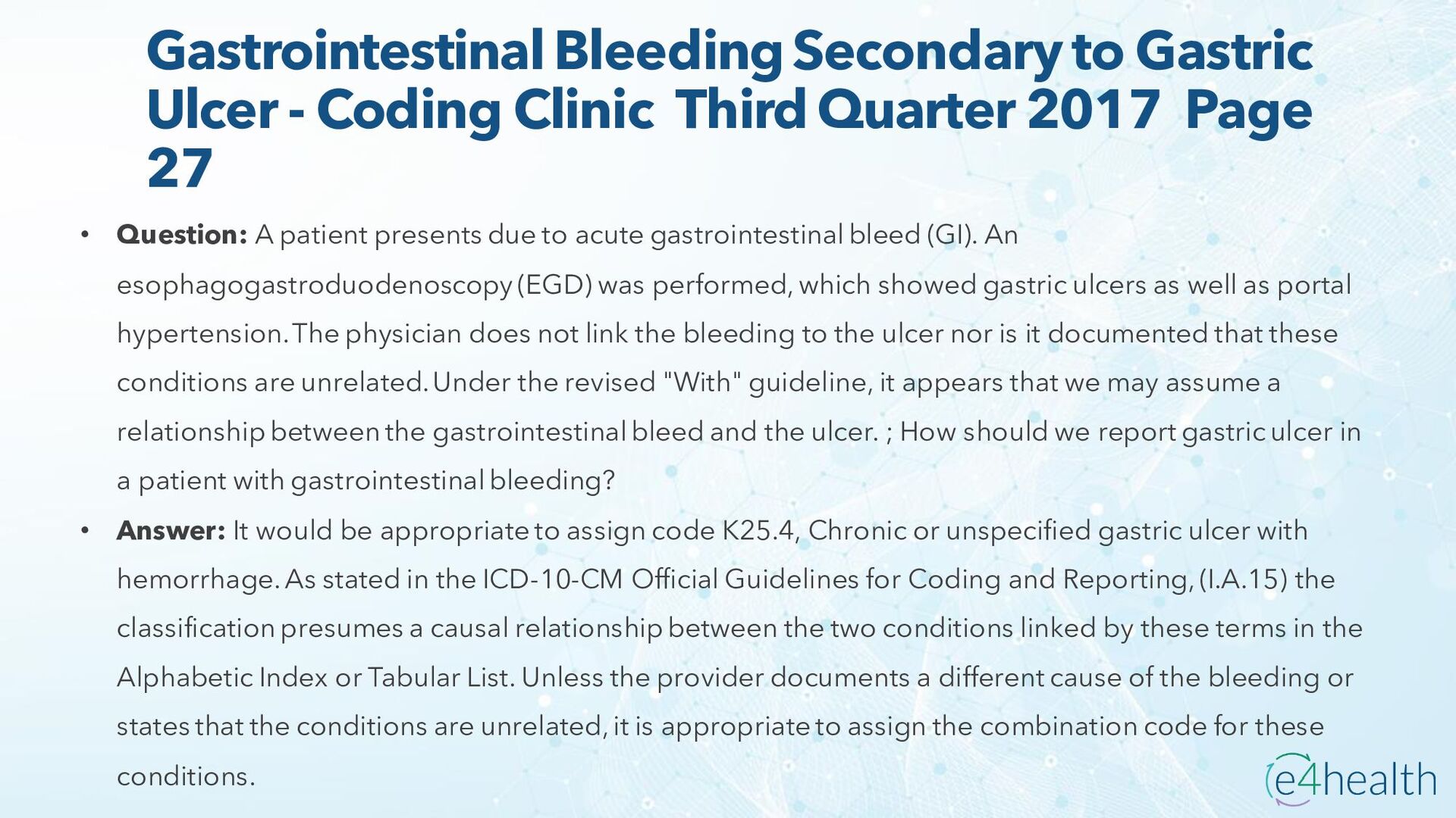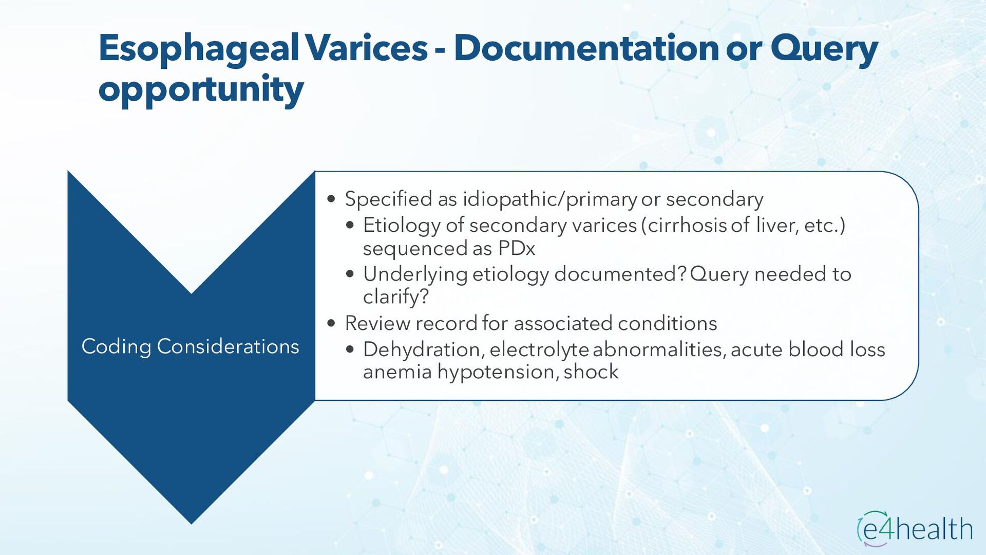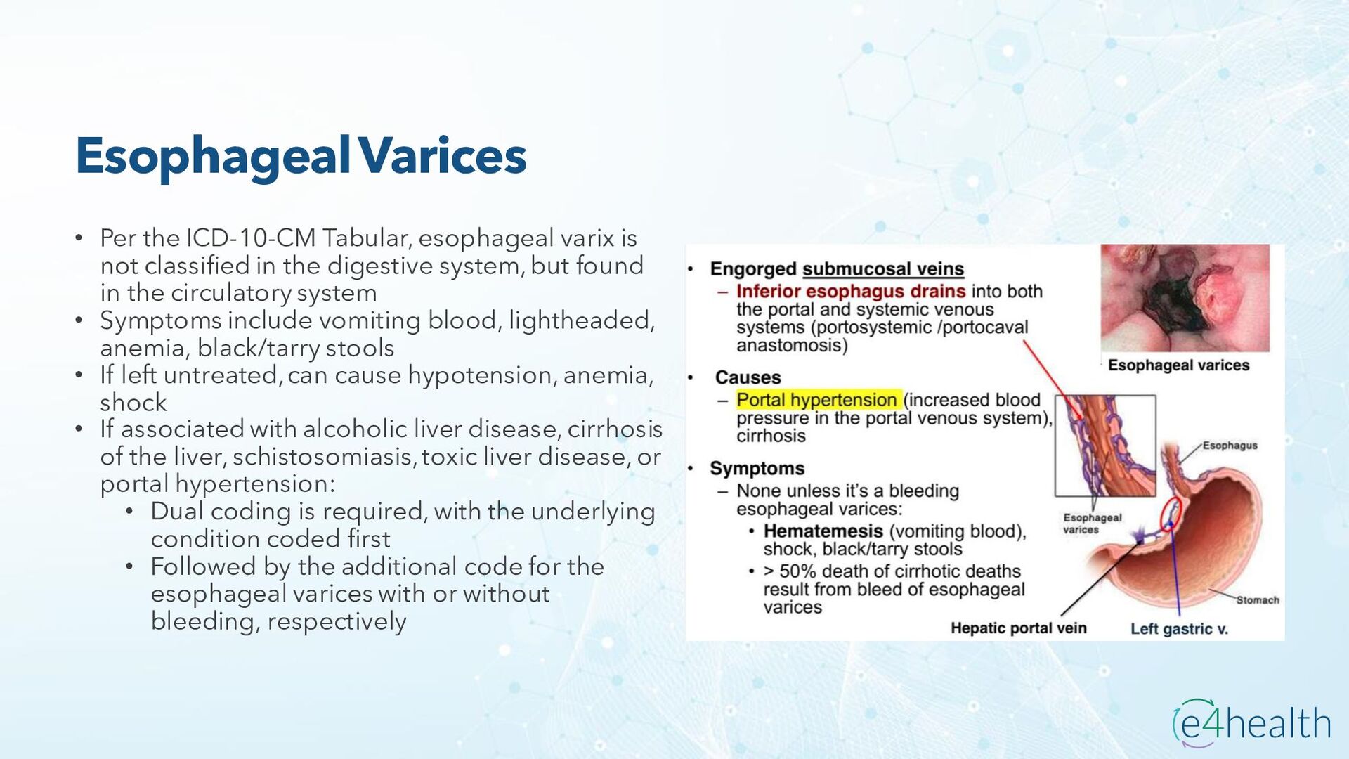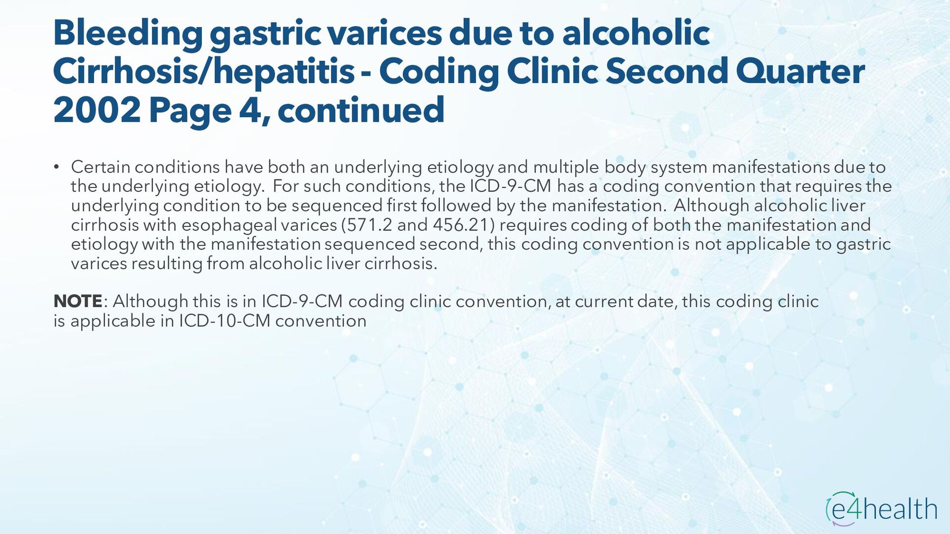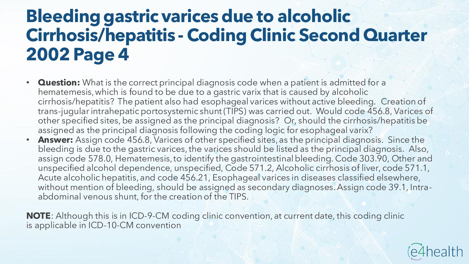 Second Quarter 2002 Page 4 • Question: What is the correct principal diagnosis code when a patient is admitted for a hematemesis, which is found to be due to a gastric varix that is caused by alcoholic cirrhosis/hepatitis? The patient also had esophageal varices without active bleeding. Creation of trans-jugular intrahepatic portosystemic shunt (TIPS) was carried out. Would code 456.8, Varices of other specified sites, be assigned as the principal diagnosis? Or, should the cirrhosis/hepatitis be assigned as the principal diagnosis following the coding logic for esophageal varix? • Answer: Assign code 456.8, Varices of other specified sites, as the principal diagnosis. Since the bleeding is due to the gastric varices, the varices should be listed as the principal diagnosis. Also, assign code 578.0, Hematemesis, to identify the gastrointestinal bleeding. Code 303.90, Other and unspecified alcohol dependence, unspecified, Code 571.2, Alcoholic cirrhosis of liver, code 571.1, Acute alcoholic hepatitis, and code 456.21, Esophageal varices in diseases classified elsewhere, without mention of bleeding, should be assigned as secondary diagnoses. Assign code 39.1, Intra- abdominal venous shunt, for the creation of the TIPS. NOTE: Although this is in ICD-9-CM coding clinic convention, at current date, this coding clinic is applicable in ICD-10-CM convention