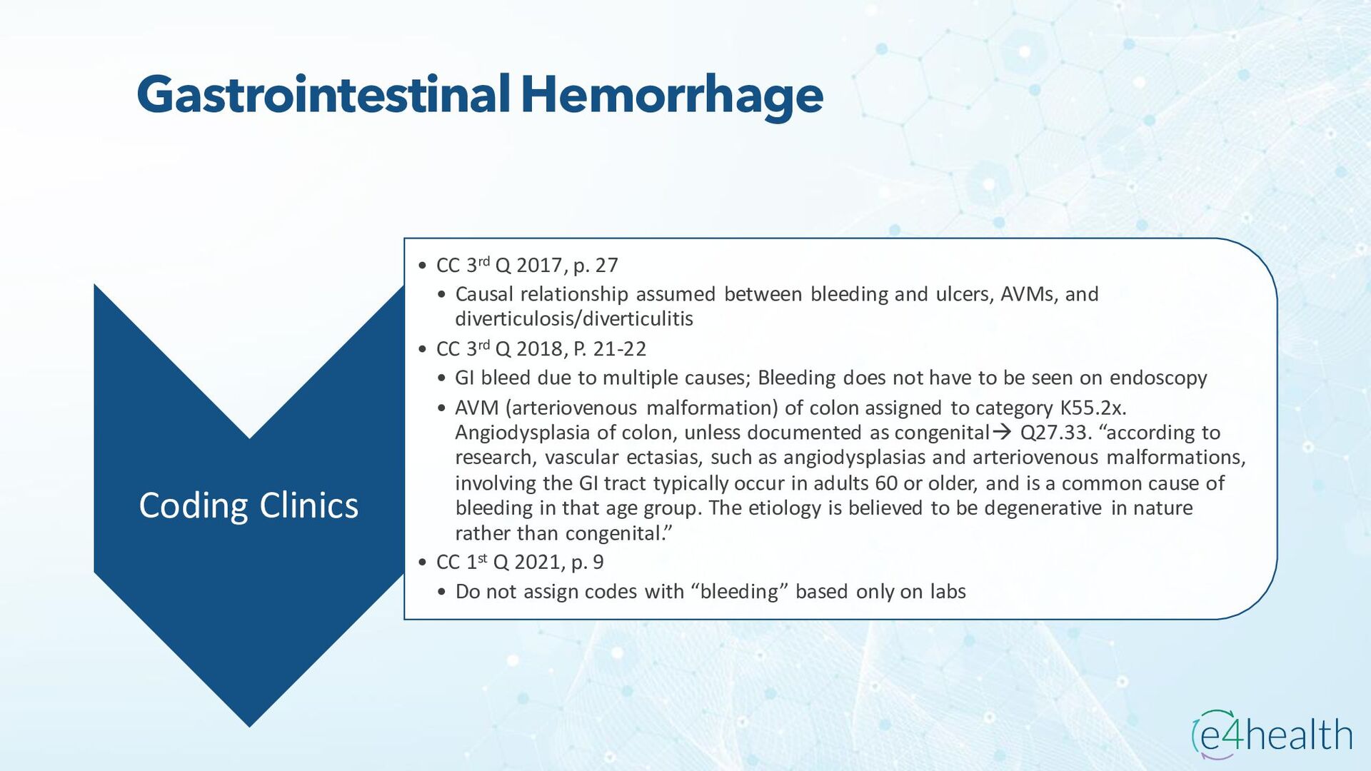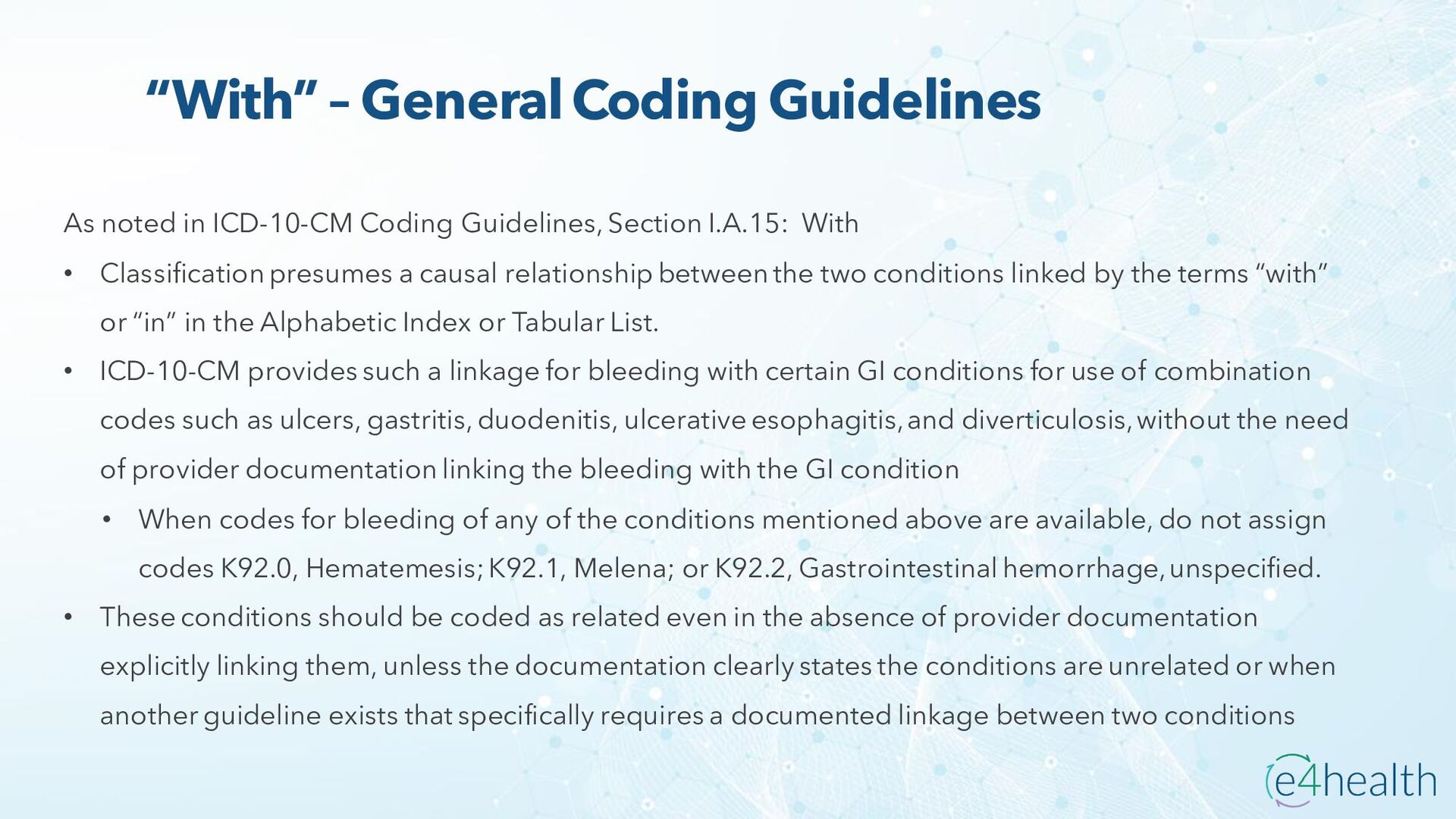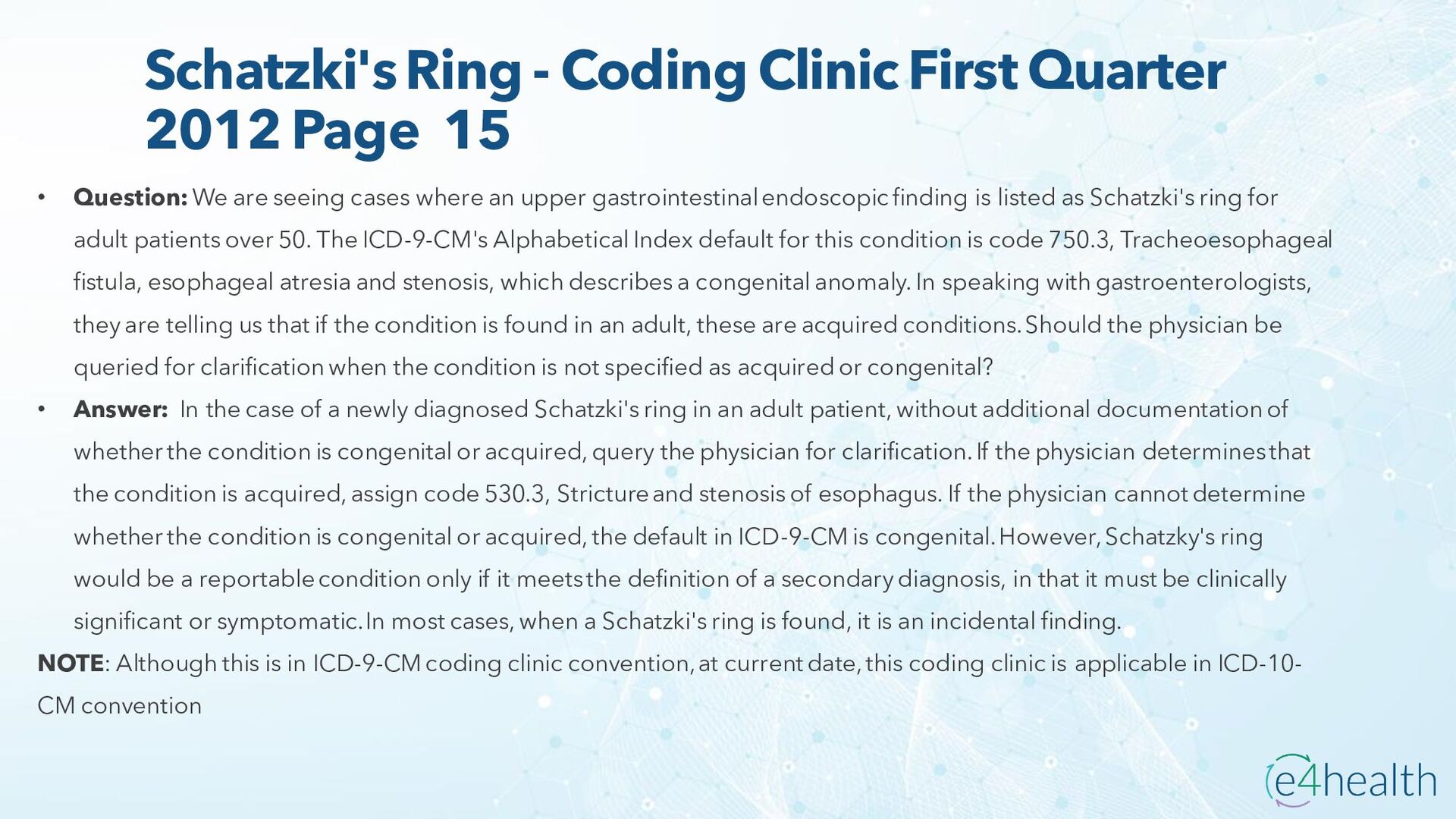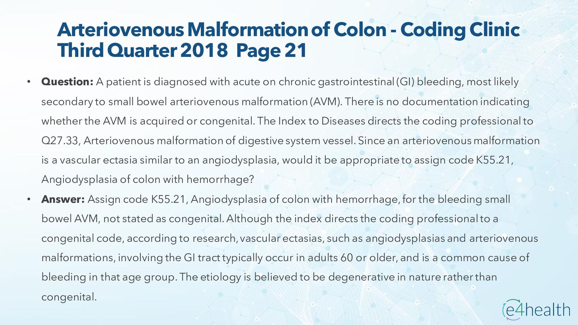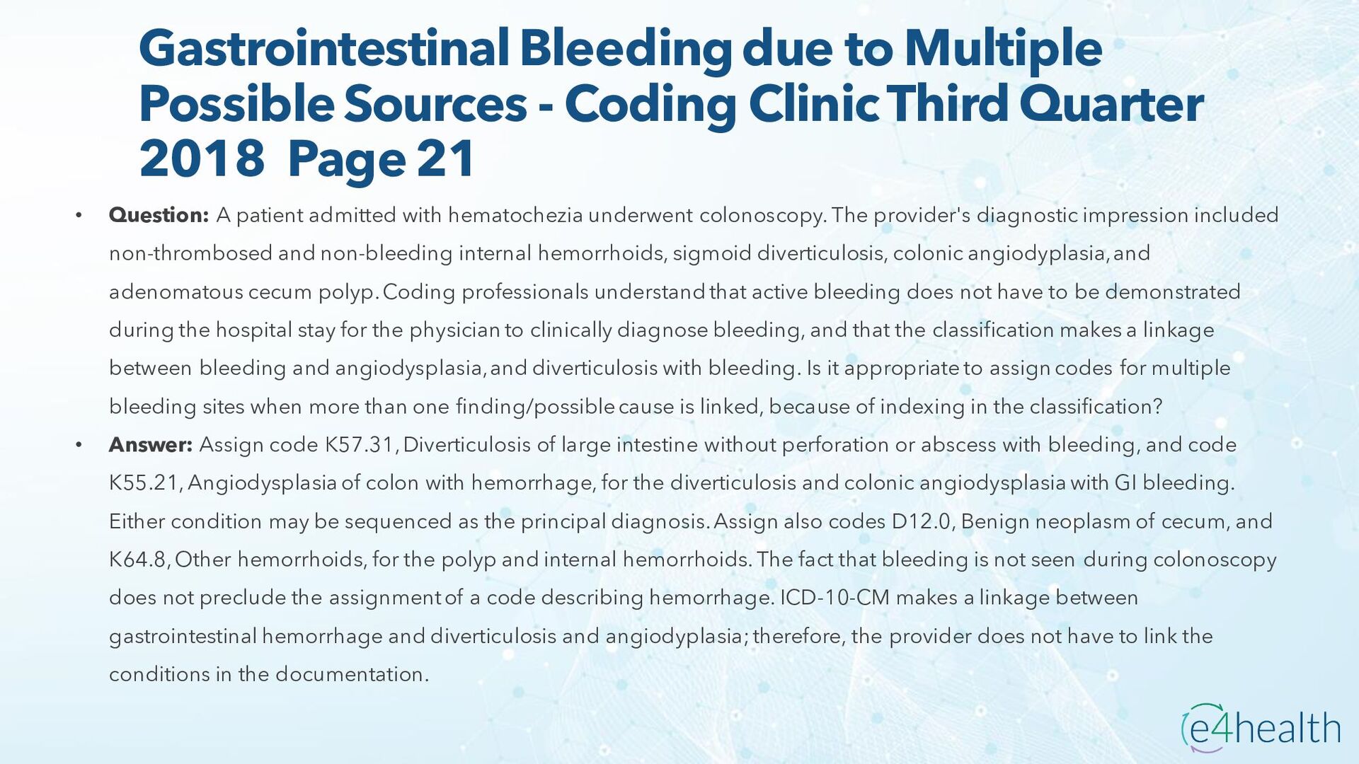 Second Quarter 2002 Page 4 • Question: What is the correct principal diagnosis code when a patient is admitted for a hematemesis, which is found to be due to a gastric varix that is caused by alcoholic cirrhosis/hepatitis? The patient also had esophageal varices without active bleeding. Creation of trans-jugular intrahepatic portosystemic shunt (TIPS) was carried out. Would code 456.8, Varices of other specified sites, be assigned as the principal diagnosis? Or, should the cirrhosis/hepatitis be assigned as the principal diagnosis following the coding logic for esophageal varix? • Answer: Assign code 456.8, Varices of other specified sites, as the principal diagnosis. Since the bleeding is due to the gastric varices, the varices should be listed as the principal diagnosis. Also, assign code 578.0, Hematemesis, to identify the gastrointestinal bleeding. Code 303.90, Other and unspecified alcohol dependence, unspecified, Code 571.2, Alcoholic cirrhosis of liver, code 571.1, Acute alcoholic hepatitis, and code 456.21, Esophageal varices in diseases classified elsewhere, without mention of bleeding, should be assigned as secondary diagnoses. Assign code 39.1, Intra- abdominal venous shunt, for the creation of the TIPS. NOTE: Although this is in ICD-9-CM coding clinic convention, at current date, this coding clinic is applicable in ICD-10-CM convention