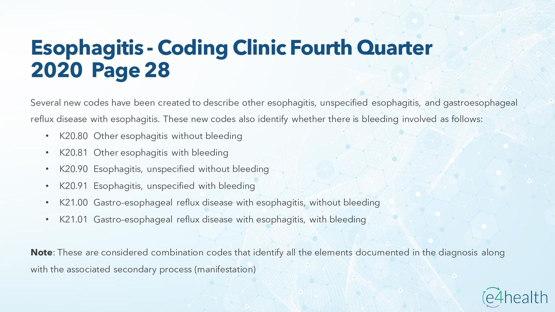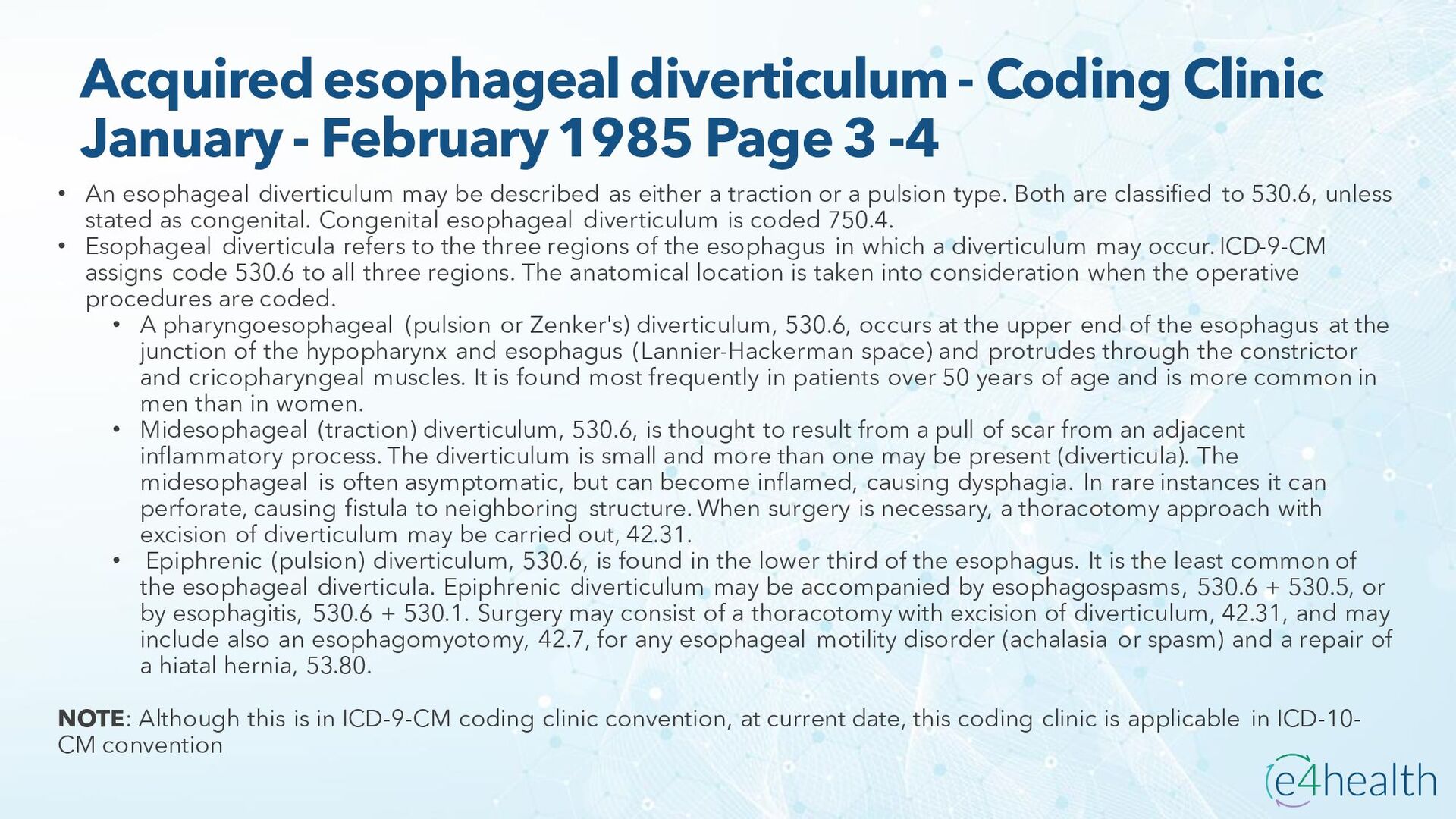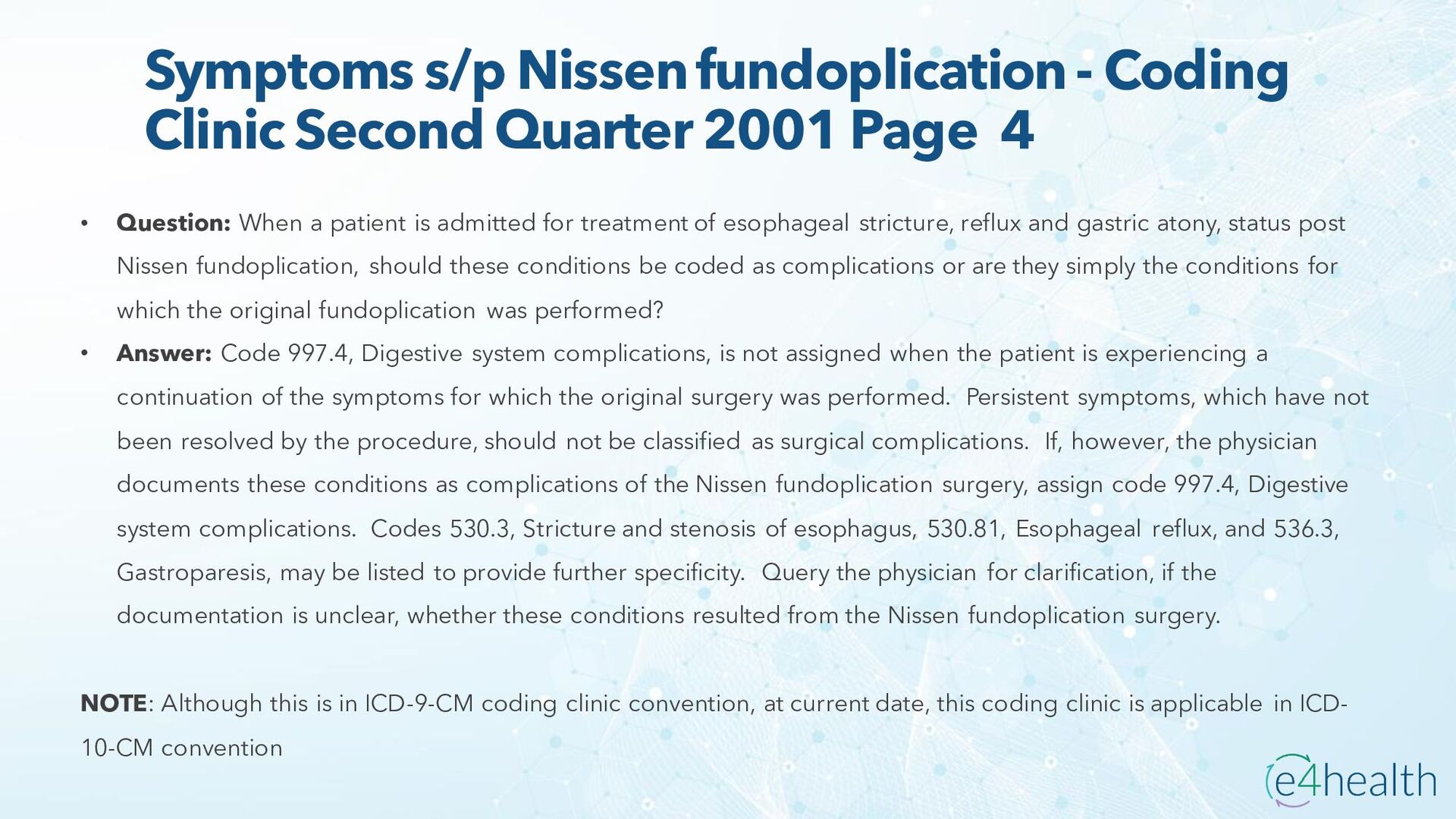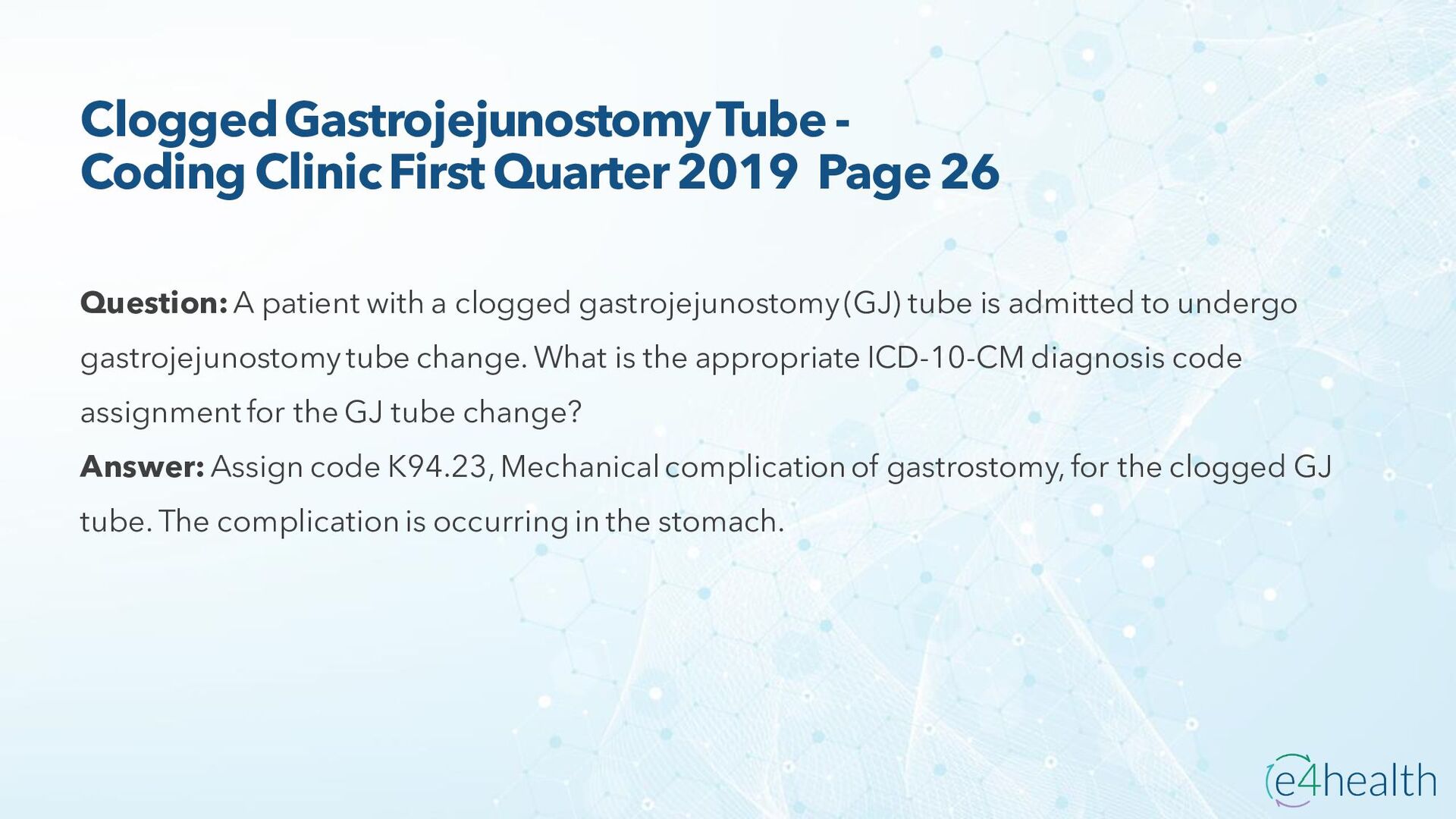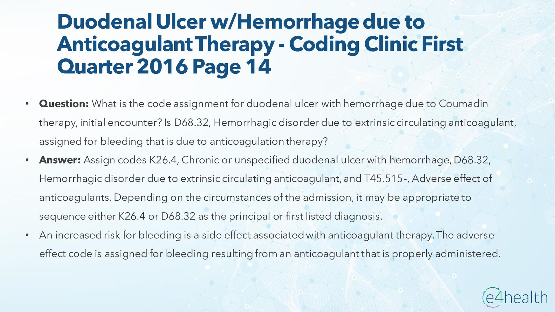 Second Quarter 2002 Page 4 • Question: What is the correct principal diagnosis code when a patient is admitted for a hematemesis, which is found to be due to a gastric varix that is caused by alcoholic cirrhosis/hepatitis? The patient also had esophageal varices without active bleeding. Creation of trans-jugular intrahepatic portosystemic shunt (TIPS) was carried out. Would code 456.8, Varices of other specified sites, be assigned as the principal diagnosis? Or, should the cirrhosis/hepatitis be assigned as the principal diagnosis following the coding logic for esophageal varix? • Answer: Assign code 456.8, Varices of other specified sites, as the principal diagnosis. Since the bleeding is due to the gastric varices, the varices should be listed as the principal diagnosis. Also, assign code 578.0, Hematemesis, to identify the gastrointestinal bleeding. Code 303.90, Other and unspecified alcohol dependence, unspecified, Code 571.2, Alcoholic cirrhosis of liver, code 571.1, Acute alcoholic hepatitis, and code 456.21, Esophageal varices in diseases classified elsewhere, without mention of bleeding, should be assigned as secondary diagnoses. Assign code 39.1, Intra- abdominal venous shunt, for the creation of the TIPS. NOTE: Although this is in ICD-9-CM coding clinic convention, at current date, this coding clinic is applicable in ICD-10-CM convention