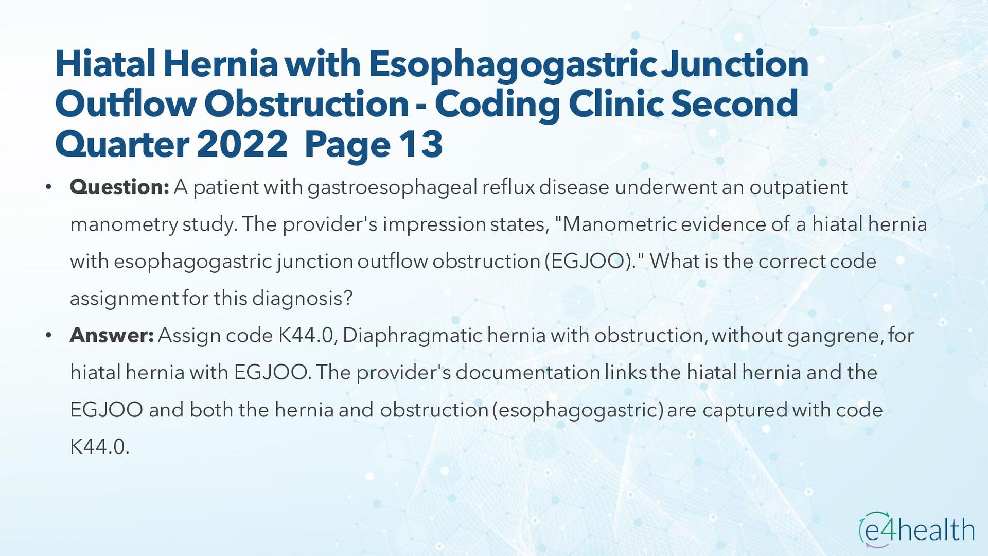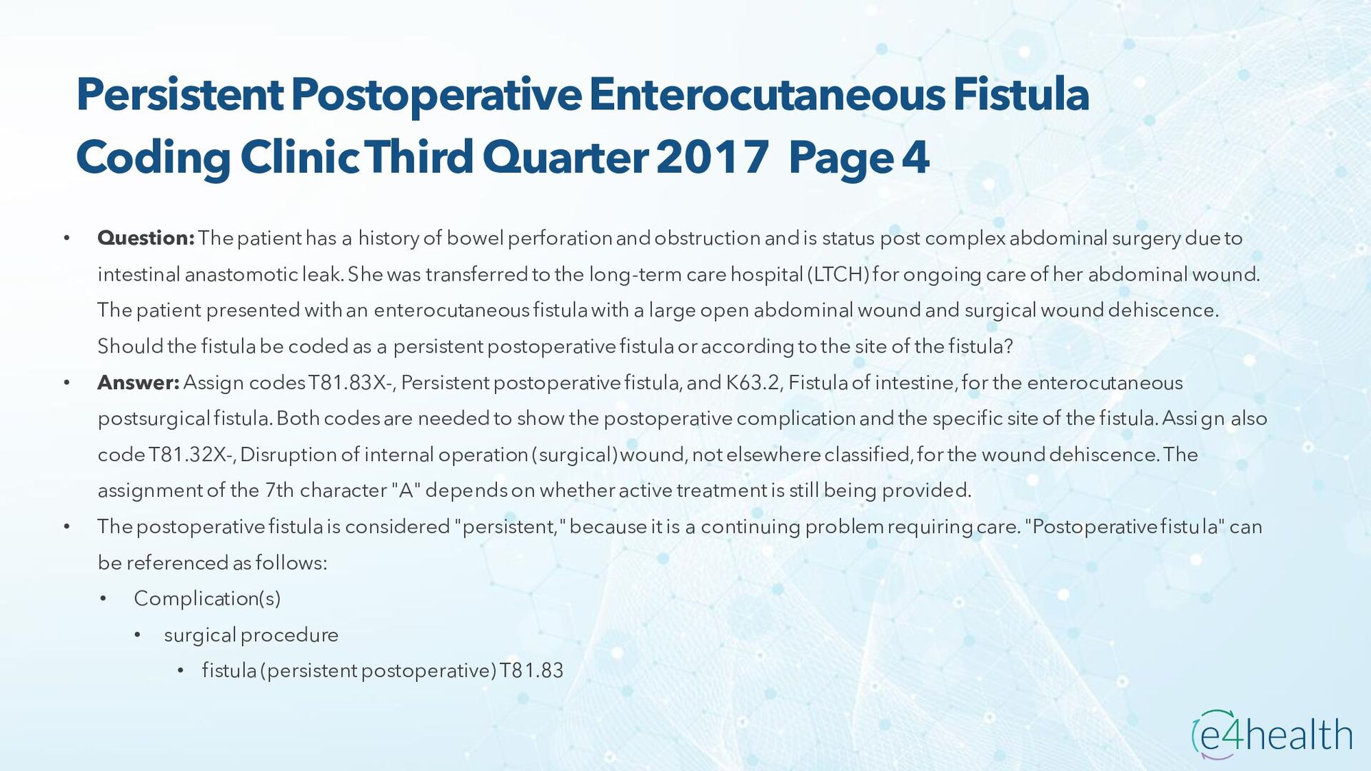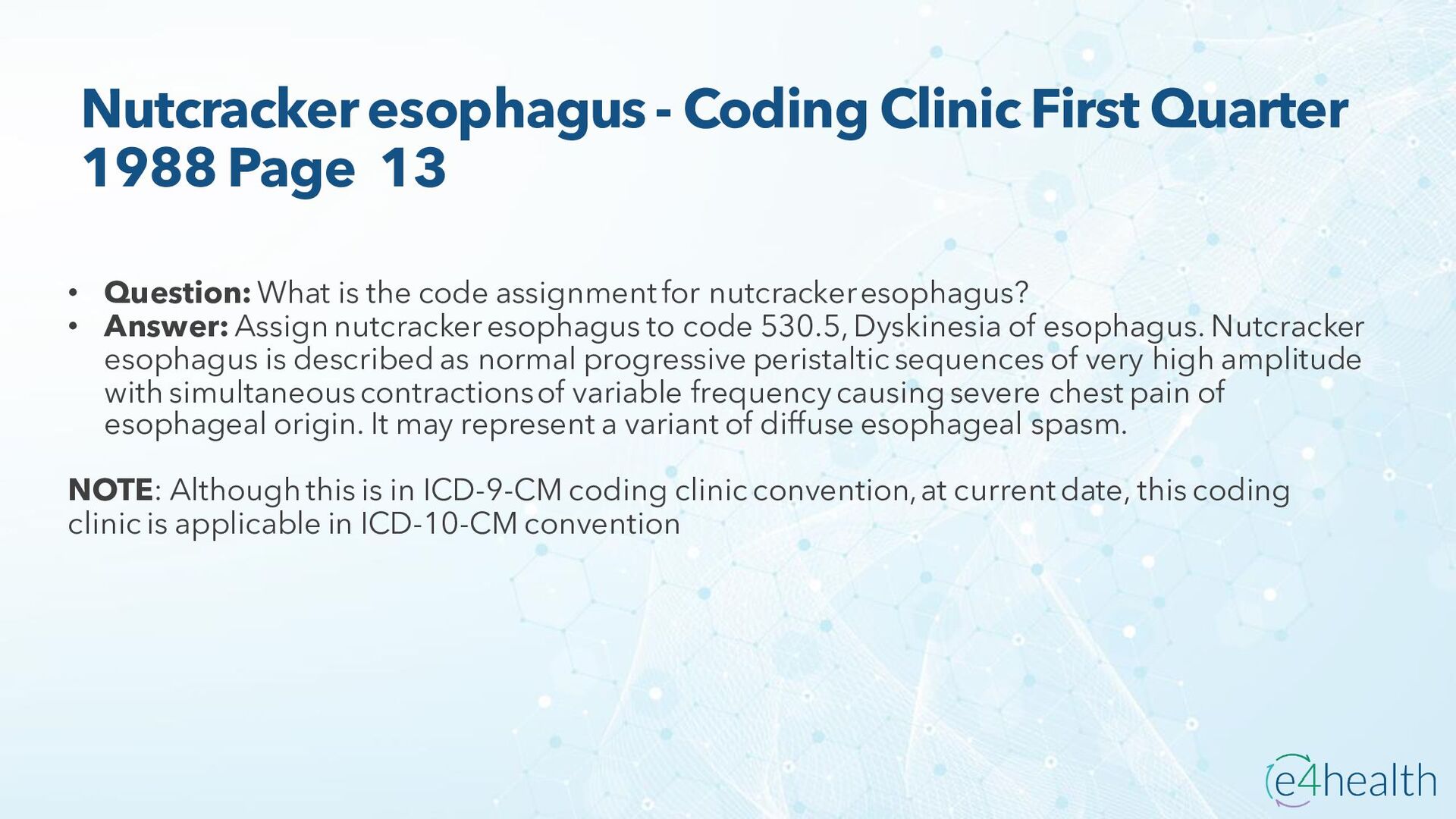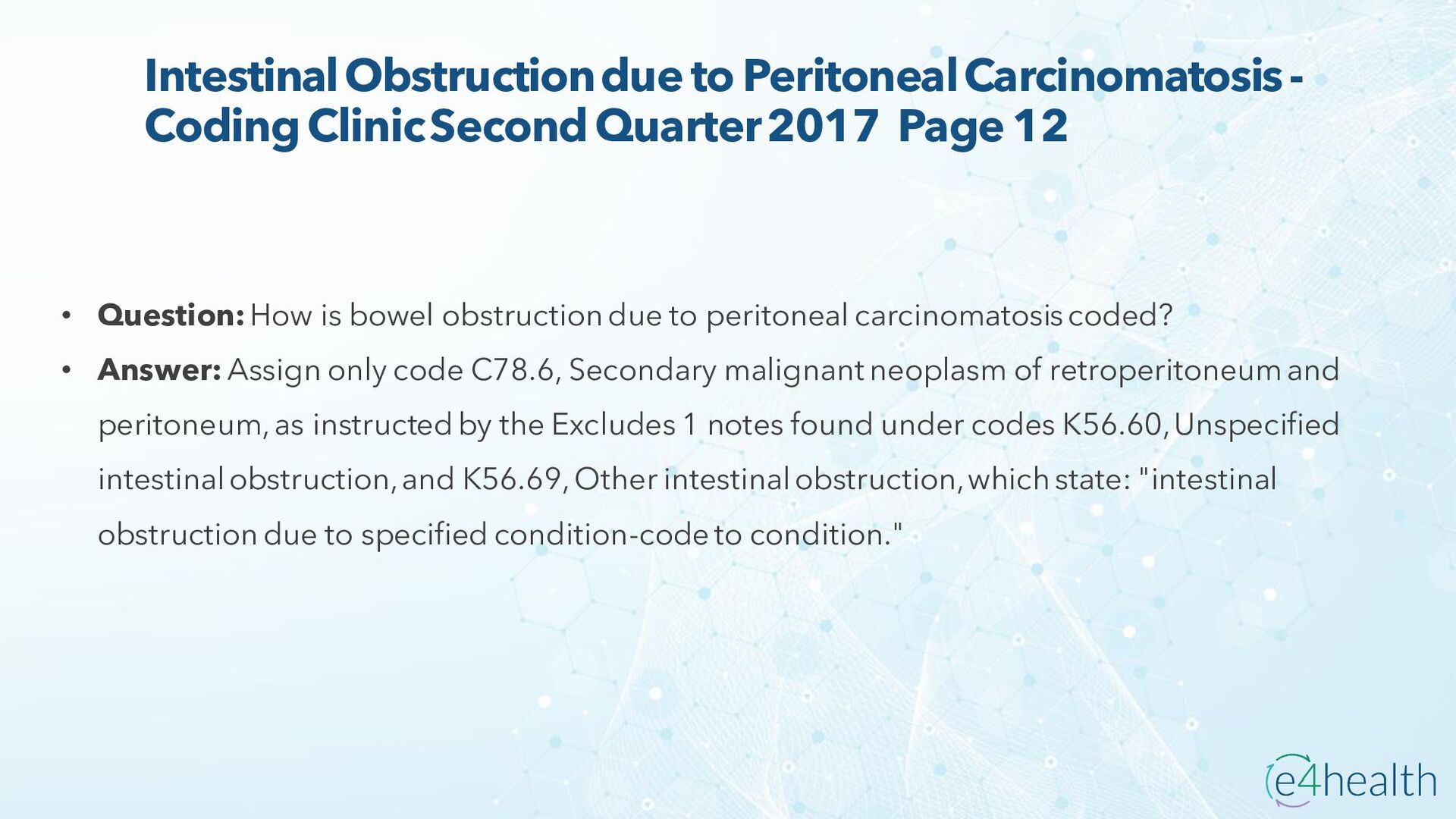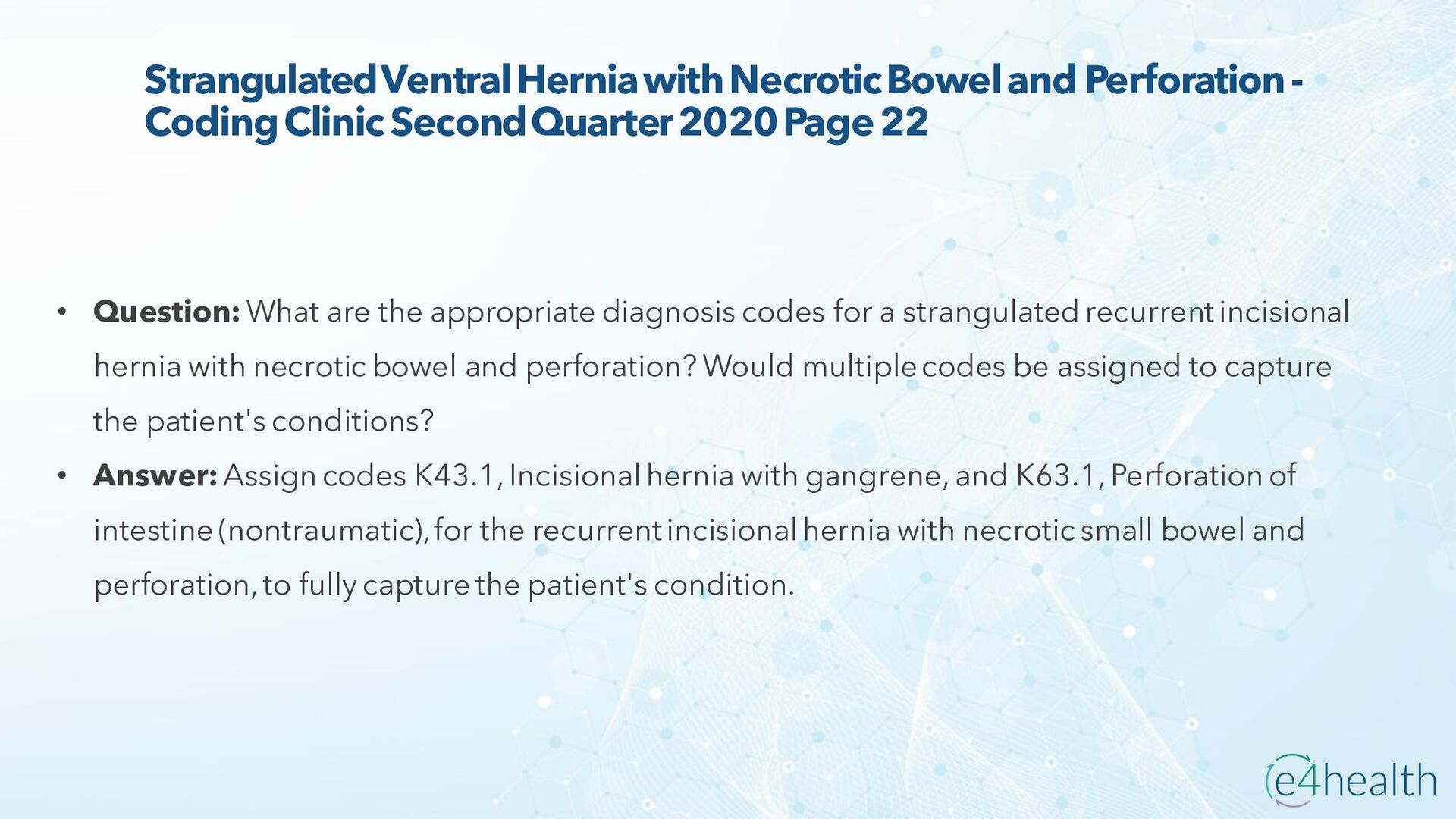 Second Quarter 2002 Page 4 • Question: What is the correct principal diagnosis code when a patient is admitted for a hematemesis, which is found to be due to a gastric varix that is caused by alcoholic cirrhosis/hepatitis? The patient also had esophageal varices without active bleeding. Creation of trans-jugular intrahepatic portosystemic shunt (TIPS) was carried out. Would code 456.8, Varices of other specified sites, be assigned as the principal diagnosis? Or, should the cirrhosis/hepatitis be assigned as the principal diagnosis following the coding logic for esophageal varix? • Answer: Assign code 456.8, Varices of other specified sites, as the principal diagnosis. Since the bleeding is due to the gastric varices, the varices should be listed as the principal diagnosis. Also, assign code 578.0, Hematemesis, to identify the gastrointestinal bleeding. Code 303.90, Other and unspecified alcohol dependence, unspecified, Code 571.2, Alcoholic cirrhosis of liver, code 571.1, Acute alcoholic hepatitis, and code 456.21, Esophageal varices in diseases classified elsewhere, without mention of bleeding, should be assigned as secondary diagnoses. Assign code 39.1, Intra- abdominal venous shunt, for the creation of the TIPS. NOTE: Although this is in ICD-9-CM coding clinic convention, at current date, this coding clinic is applicable in ICD-10-CM convention