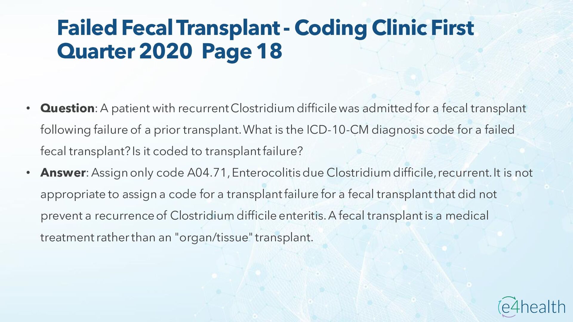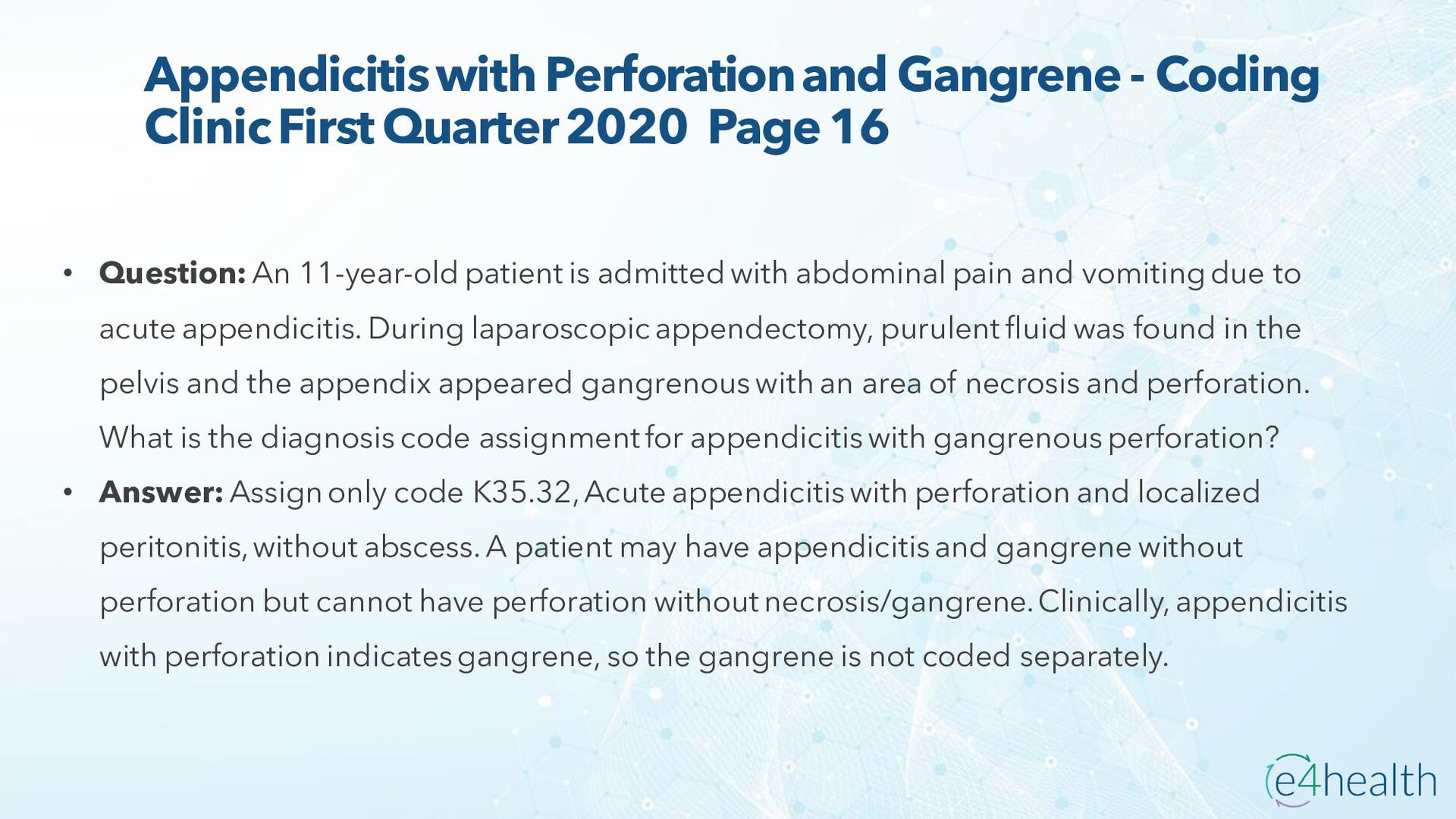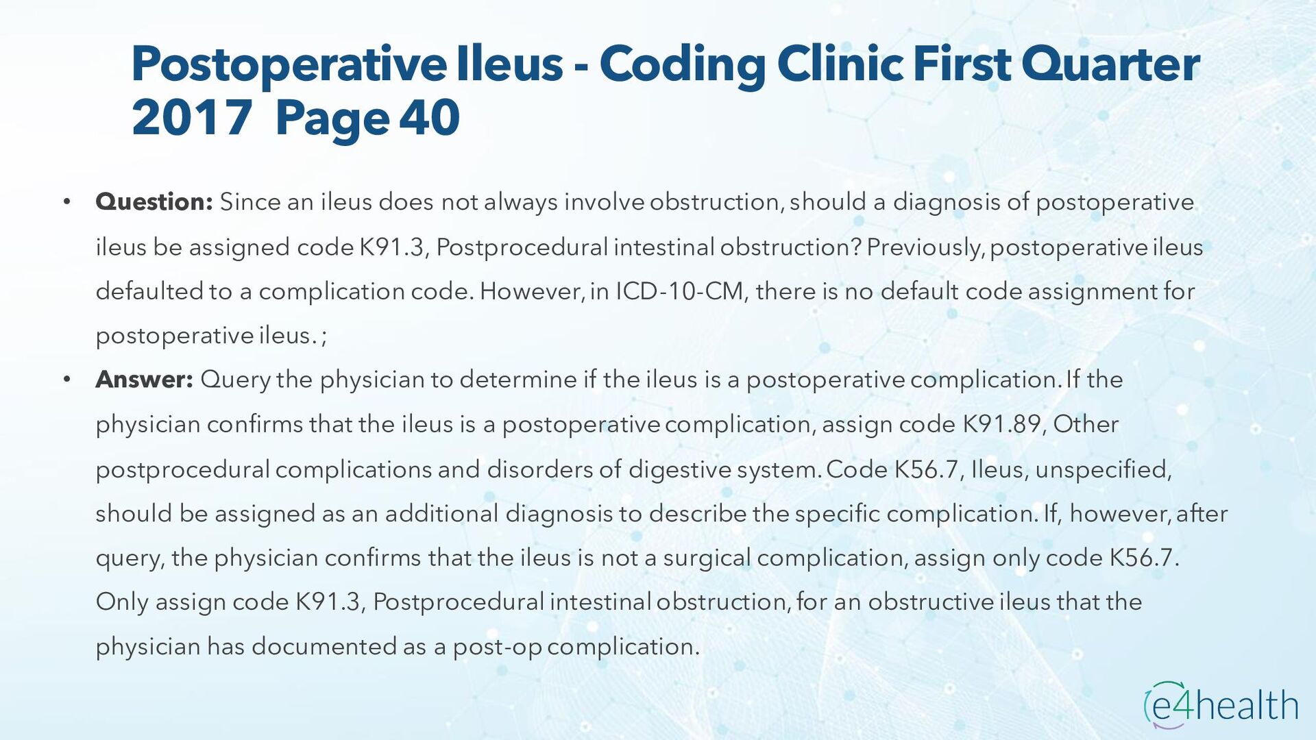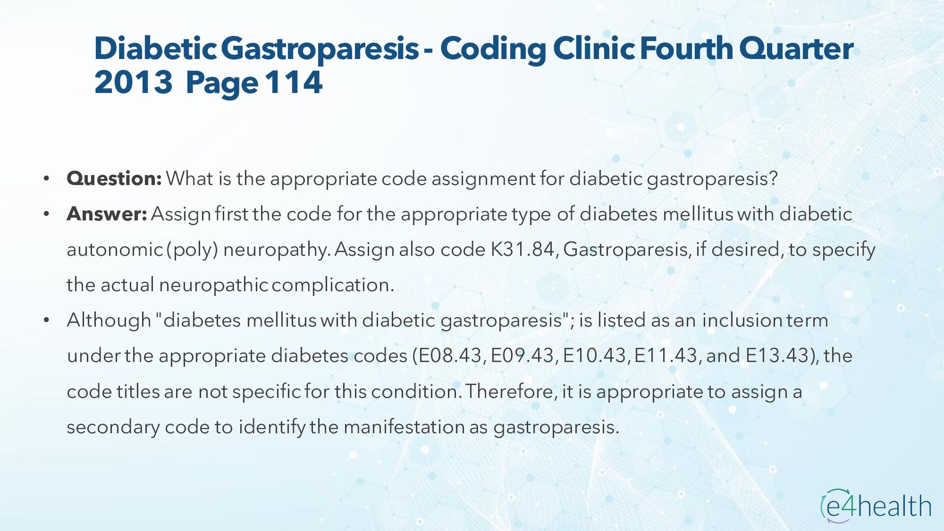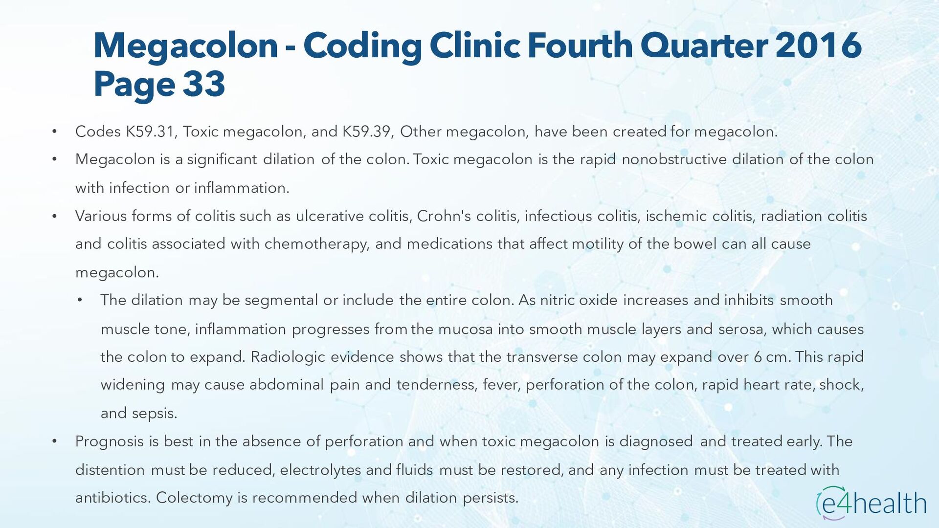 Second Quarter 2002 Page 4 • Question: What is the correct principal diagnosis code when a patient is admitted for a hematemesis, which is found to be due to a gastric varix that is caused by alcoholic cirrhosis/hepatitis? The patient also had esophageal varices without active bleeding. Creation of trans-jugular intrahepatic portosystemic shunt (TIPS) was carried out. Would code 456.8, Varices of other specified sites, be assigned as the principal diagnosis? Or, should the cirrhosis/hepatitis be assigned as the principal diagnosis following the coding logic for esophageal varix? • Answer: Assign code 456.8, Varices of other specified sites, as the principal diagnosis. Since the bleeding is due to the gastric varices, the varices should be listed as the principal diagnosis. Also, assign code 578.0, Hematemesis, to identify the gastrointestinal bleeding. Code 303.90, Other and unspecified alcohol dependence, unspecified, Code 571.2, Alcoholic cirrhosis of liver, code 571.1, Acute alcoholic hepatitis, and code 456.21, Esophageal varices in diseases classified elsewhere, without mention of bleeding, should be assigned as secondary diagnoses. Assign code 39.1, Intra- abdominal venous shunt, for the creation of the TIPS. NOTE: Although this is in ICD-9-CM coding clinic convention, at current date, this coding clinic is applicable in ICD-10-CM convention