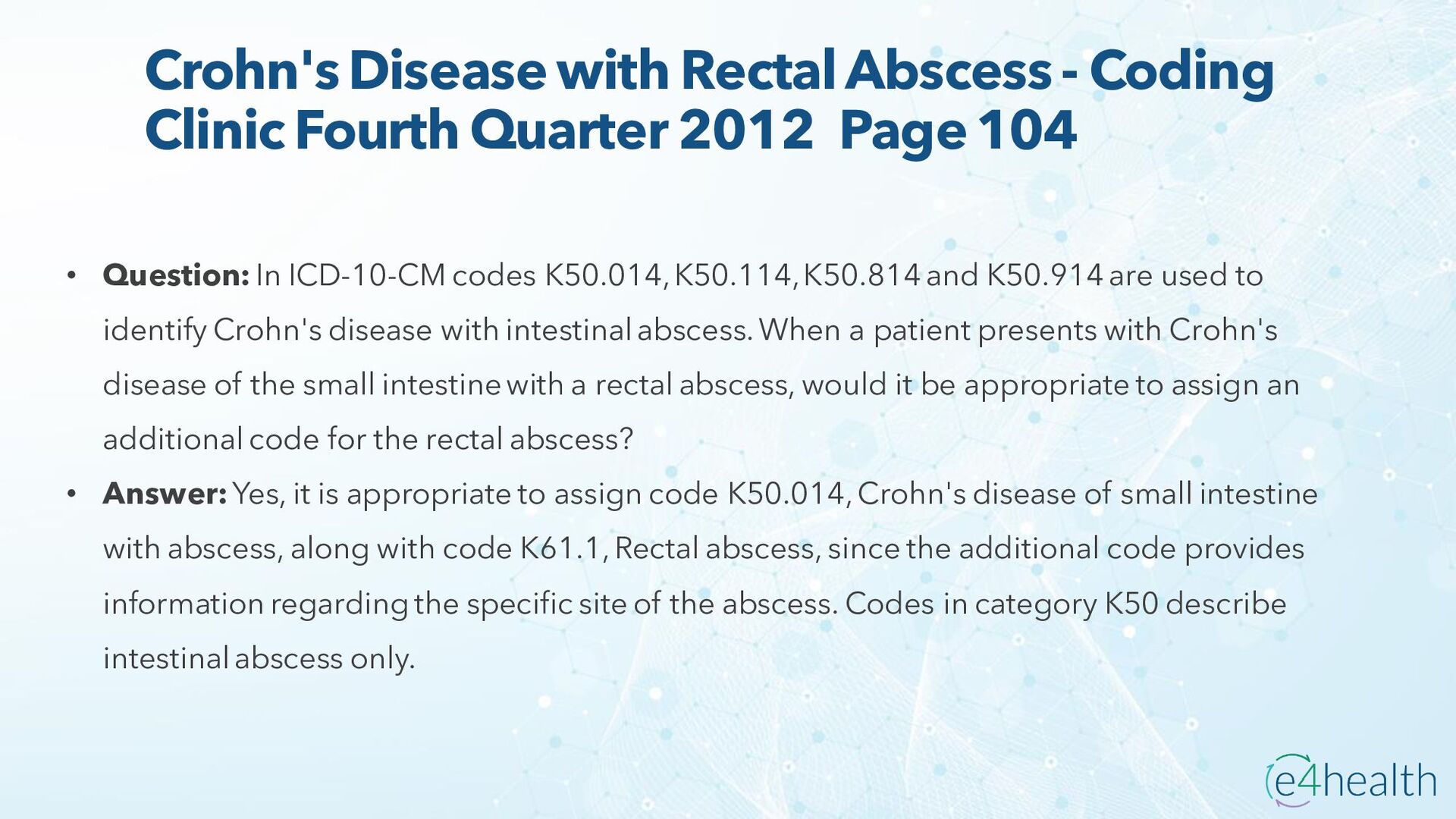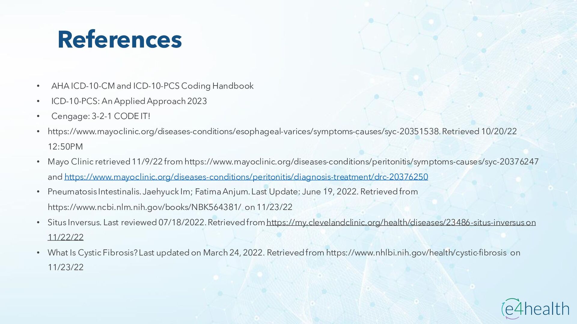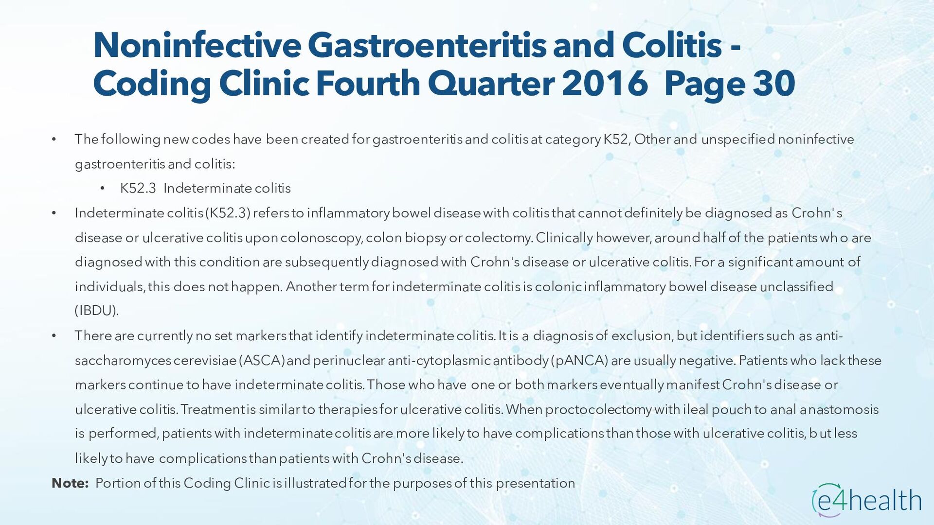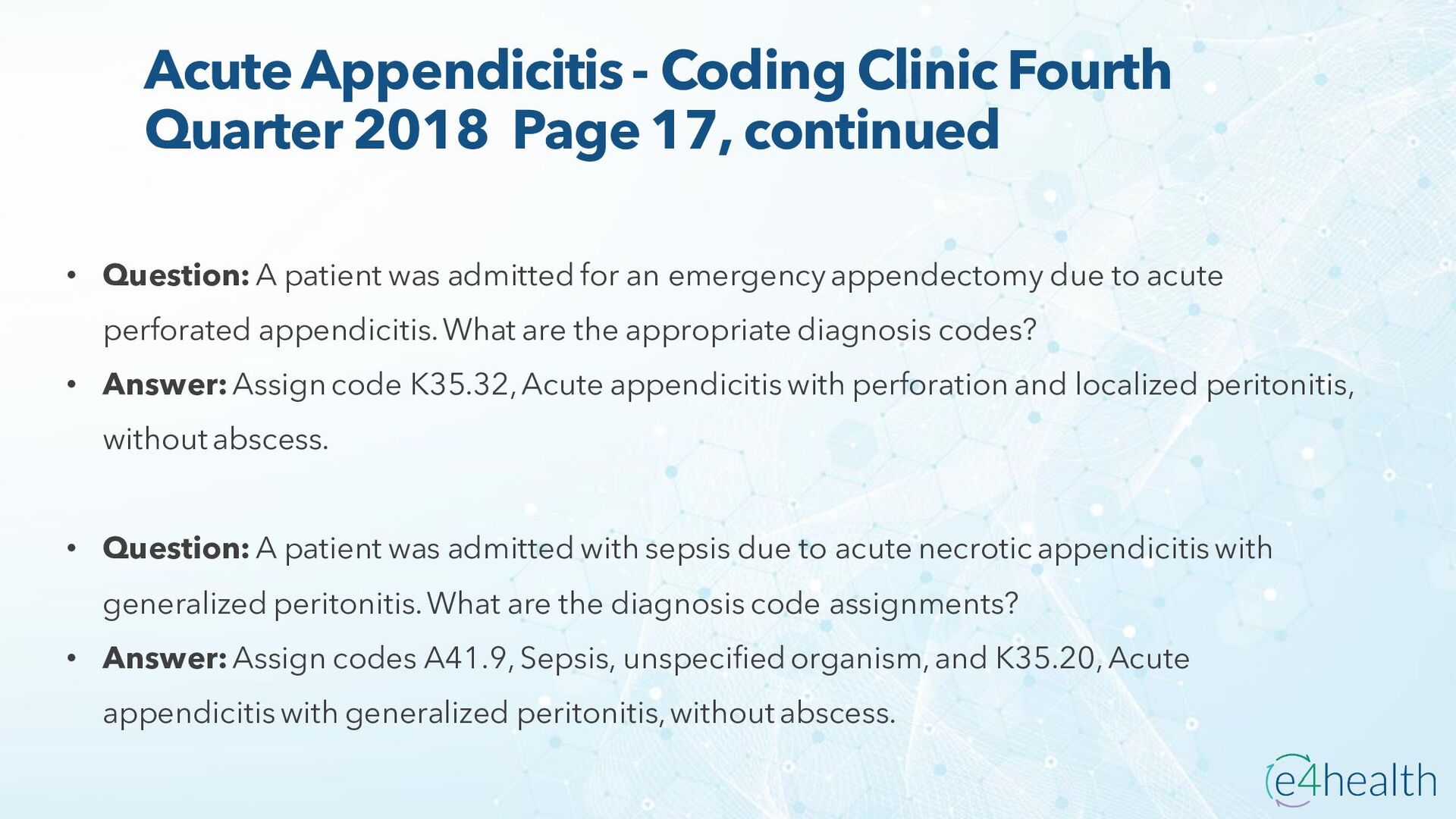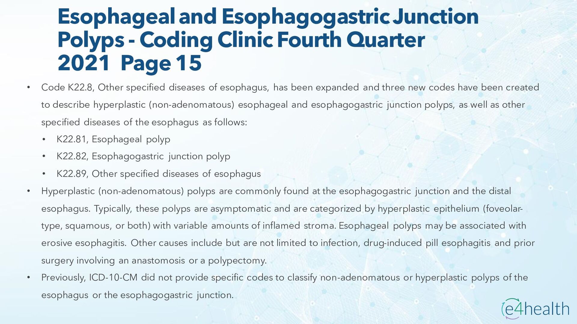 Second Quarter 2002 Page 4 • Question: What is the correct principal diagnosis code when a patient is admitted for a hematemesis, which is found to be due to a gastric varix that is caused by alcoholic cirrhosis/hepatitis? The patient also had esophageal varices without active bleeding. Creation of trans-jugular intrahepatic portosystemic shunt (TIPS) was carried out. Would code 456.8, Varices of other specified sites, be assigned as the principal diagnosis? Or, should the cirrhosis/hepatitis be assigned as the principal diagnosis following the coding logic for esophageal varix? • Answer: Assign code 456.8, Varices of other specified sites, as the principal diagnosis. Since the bleeding is due to the gastric varices, the varices should be listed as the principal diagnosis. Also, assign code 578.0, Hematemesis, to identify the gastrointestinal bleeding. Code 303.90, Other and unspecified alcohol dependence, unspecified, Code 571.2, Alcoholic cirrhosis of liver, code 571.1, Acute alcoholic hepatitis, and code 456.21, Esophageal varices in diseases classified elsewhere, without mention of bleeding, should be assigned as secondary diagnoses. Assign code 39.1, Intra- abdominal venous shunt, for the creation of the TIPS. NOTE: Although this is in ICD-9-CM coding clinic convention, at current date, this coding clinic is applicable in ICD-10-CM convention