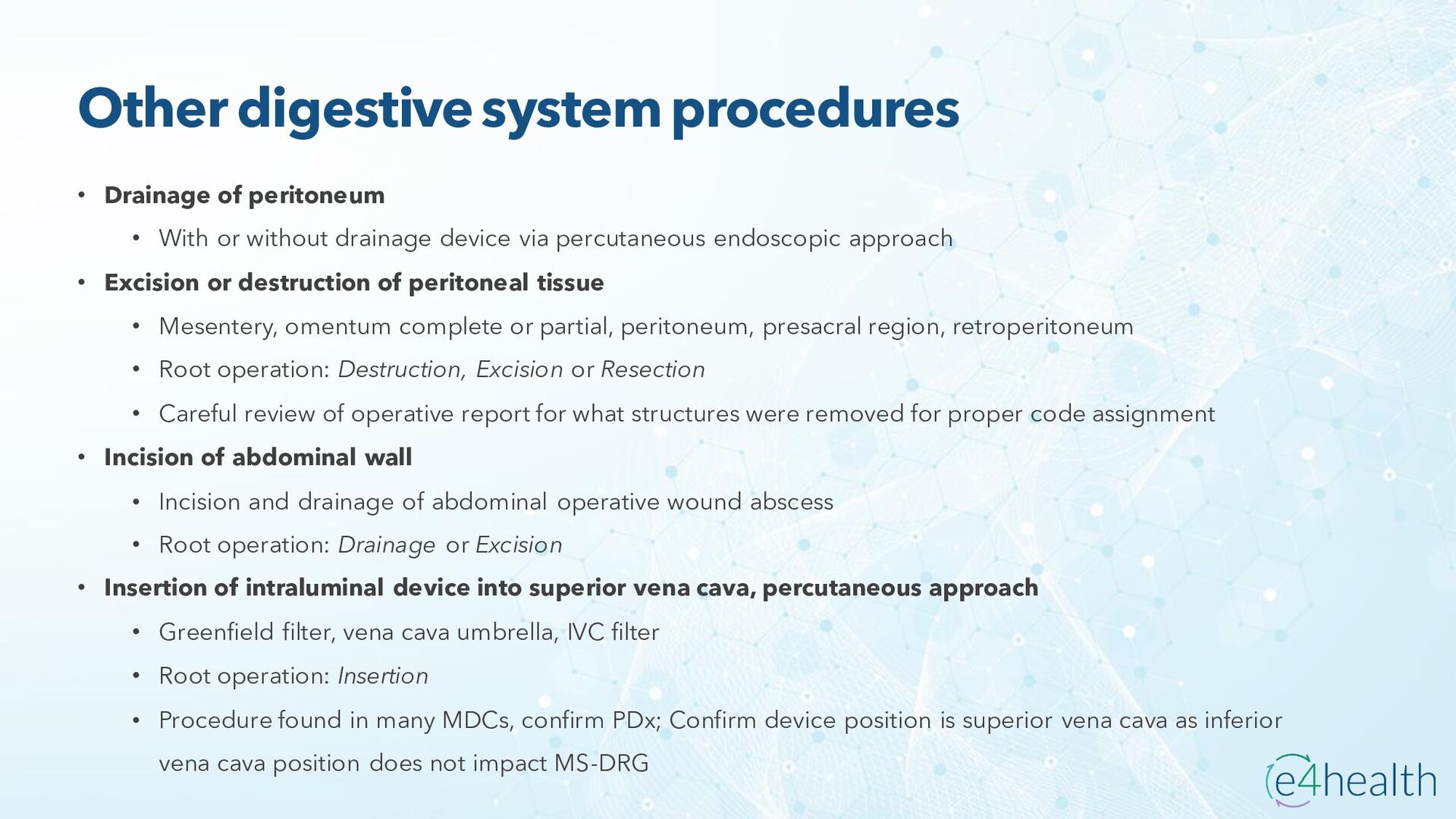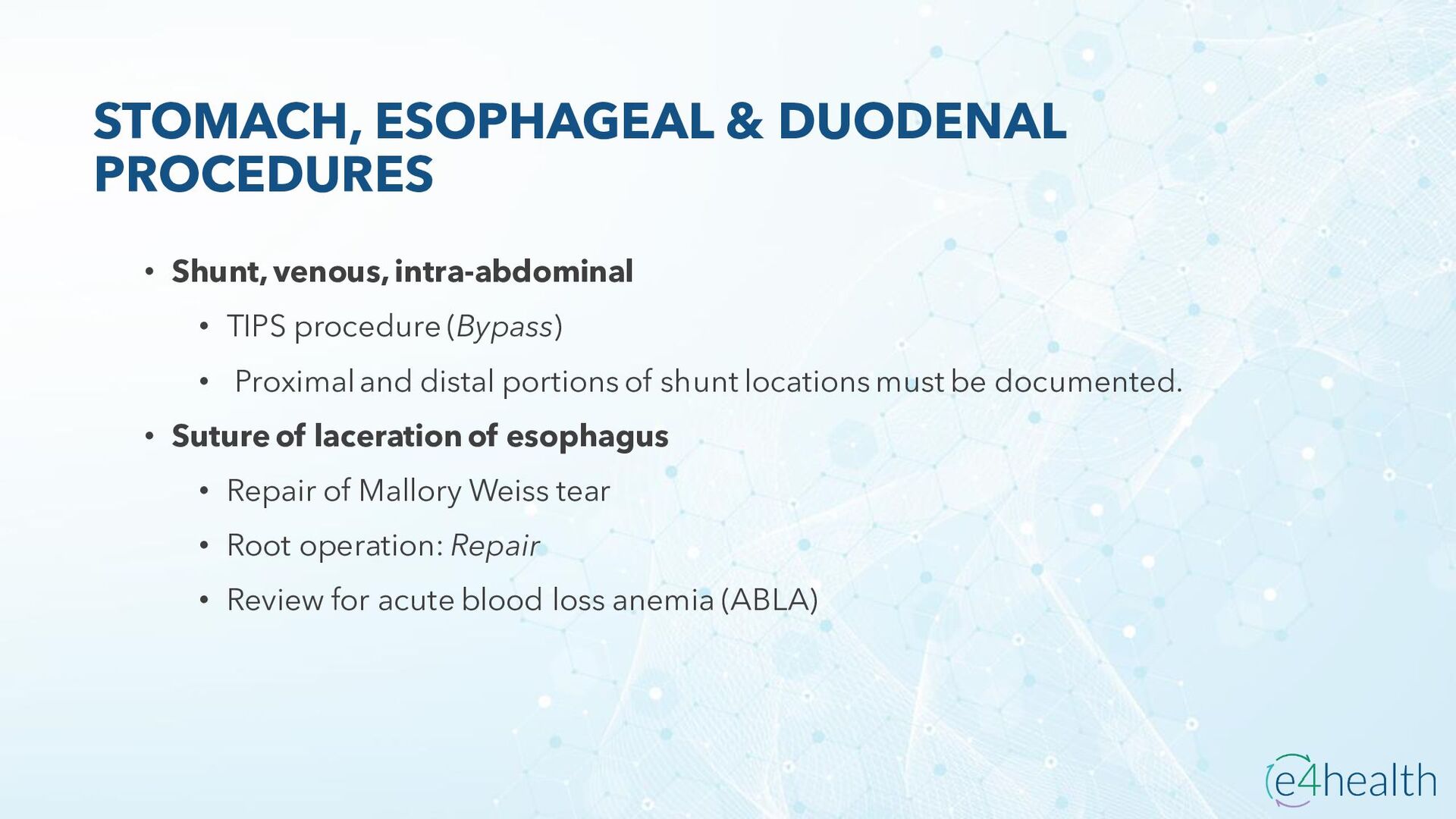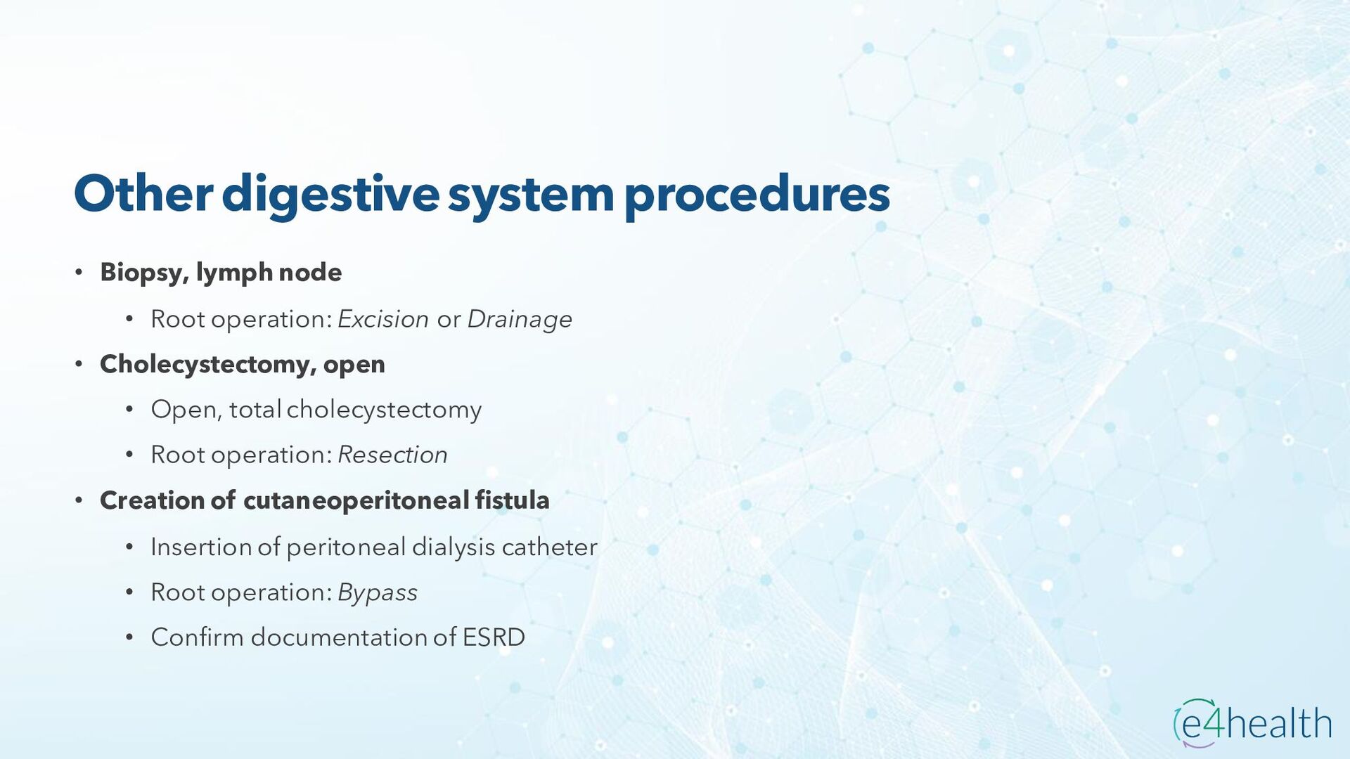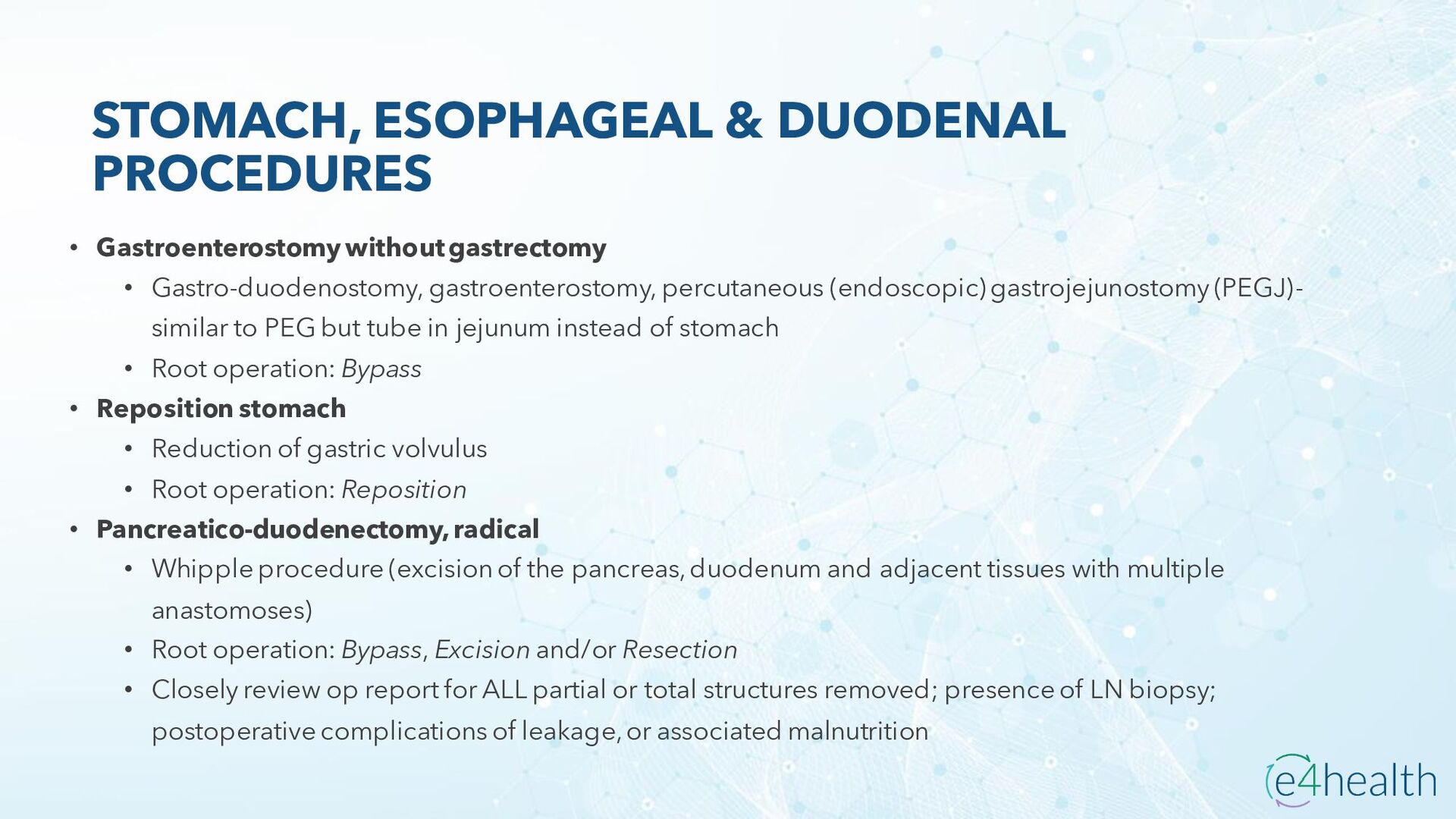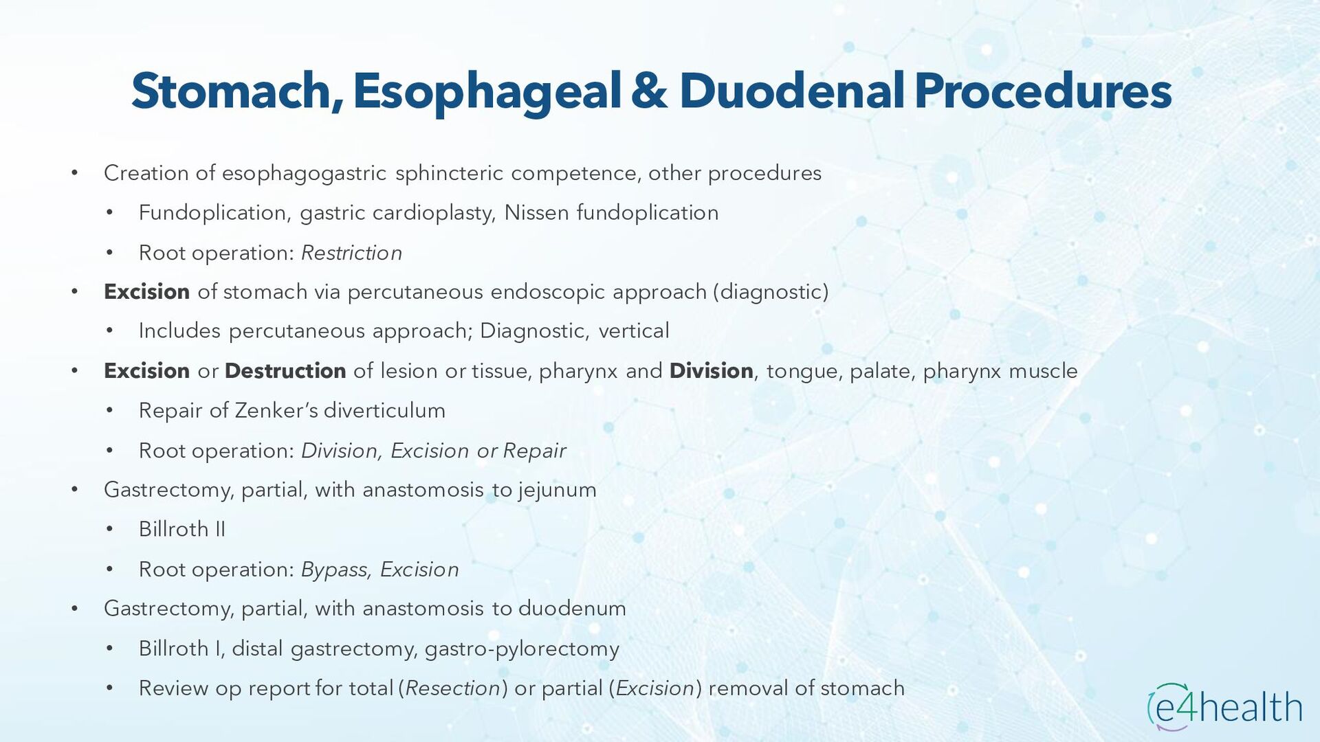 competence, other procedures • Fundoplication, gastric cardioplasty, Nissen fundoplication • Root operation: Restriction • Excision of stomach via percutaneous endoscopic approach (diagnostic) • Includes percutaneous approach; Diagnostic, vertical • Excision or Destruction of lesion or tissue, pharynx and Division, tongue, palate, pharynx muscle • Repair of Zenker’s diverticulum • Root operation: Division, Excision or Repair • Gastrectomy, partial, with anastomosis to jejunum • Billroth II • Root operation: Bypass, Excision • Gastrectomy, partial, with anastomosis to duodenum • Billroth I, distal gastrectomy, gastro-pylorectomy • Review op report for total (Resection) or partial (Excision) removal of stomach