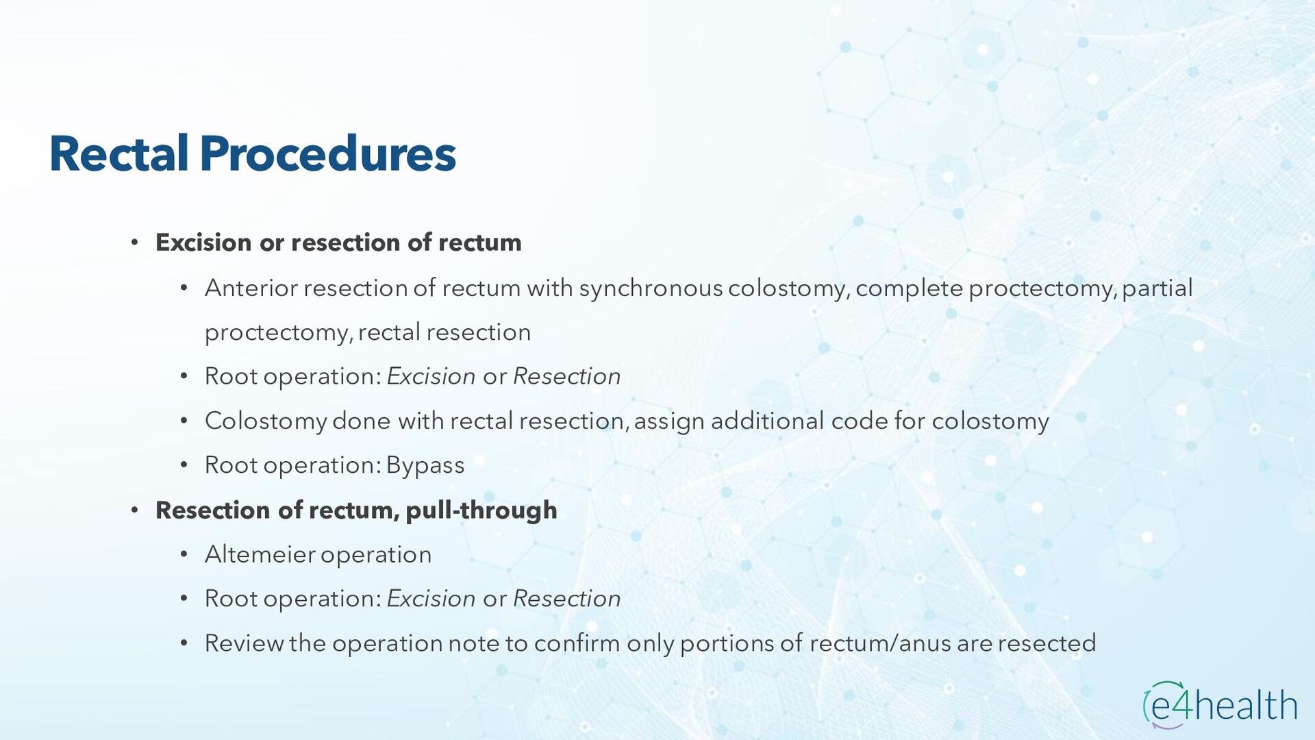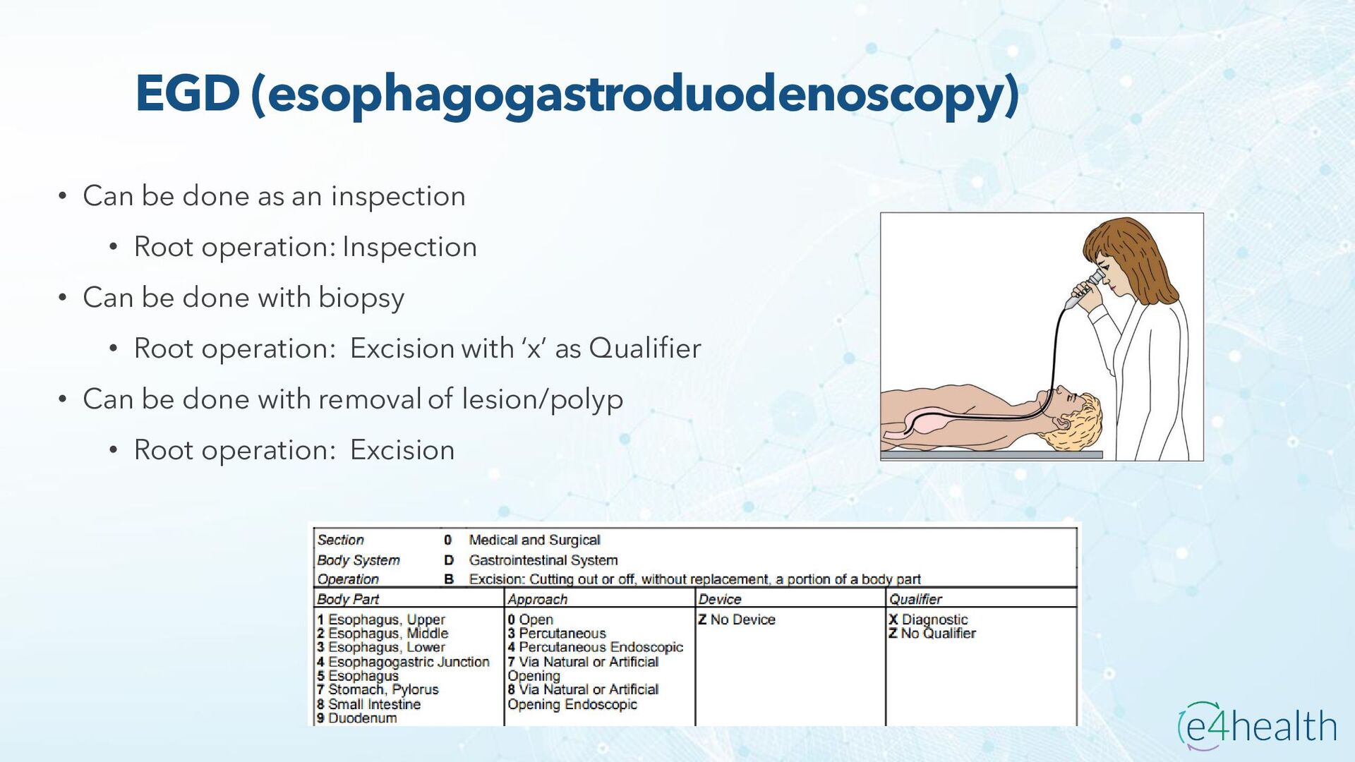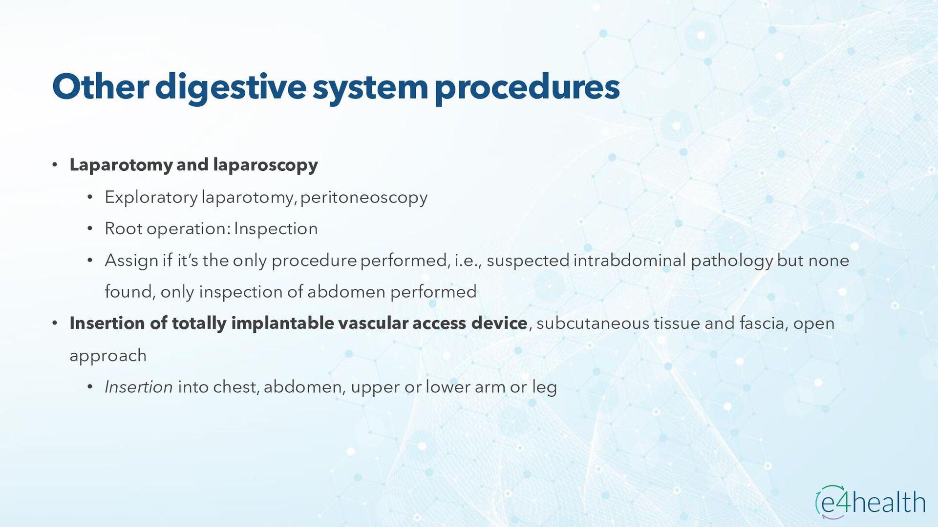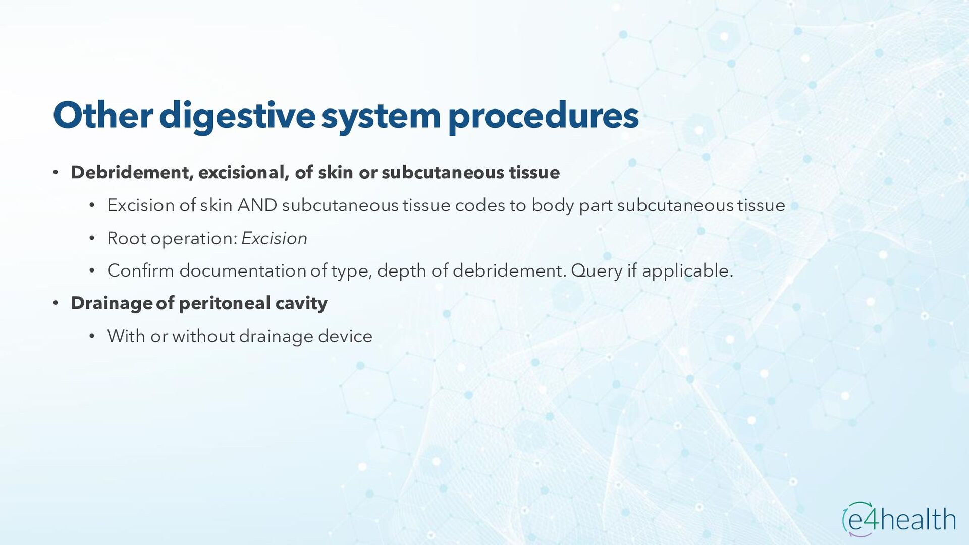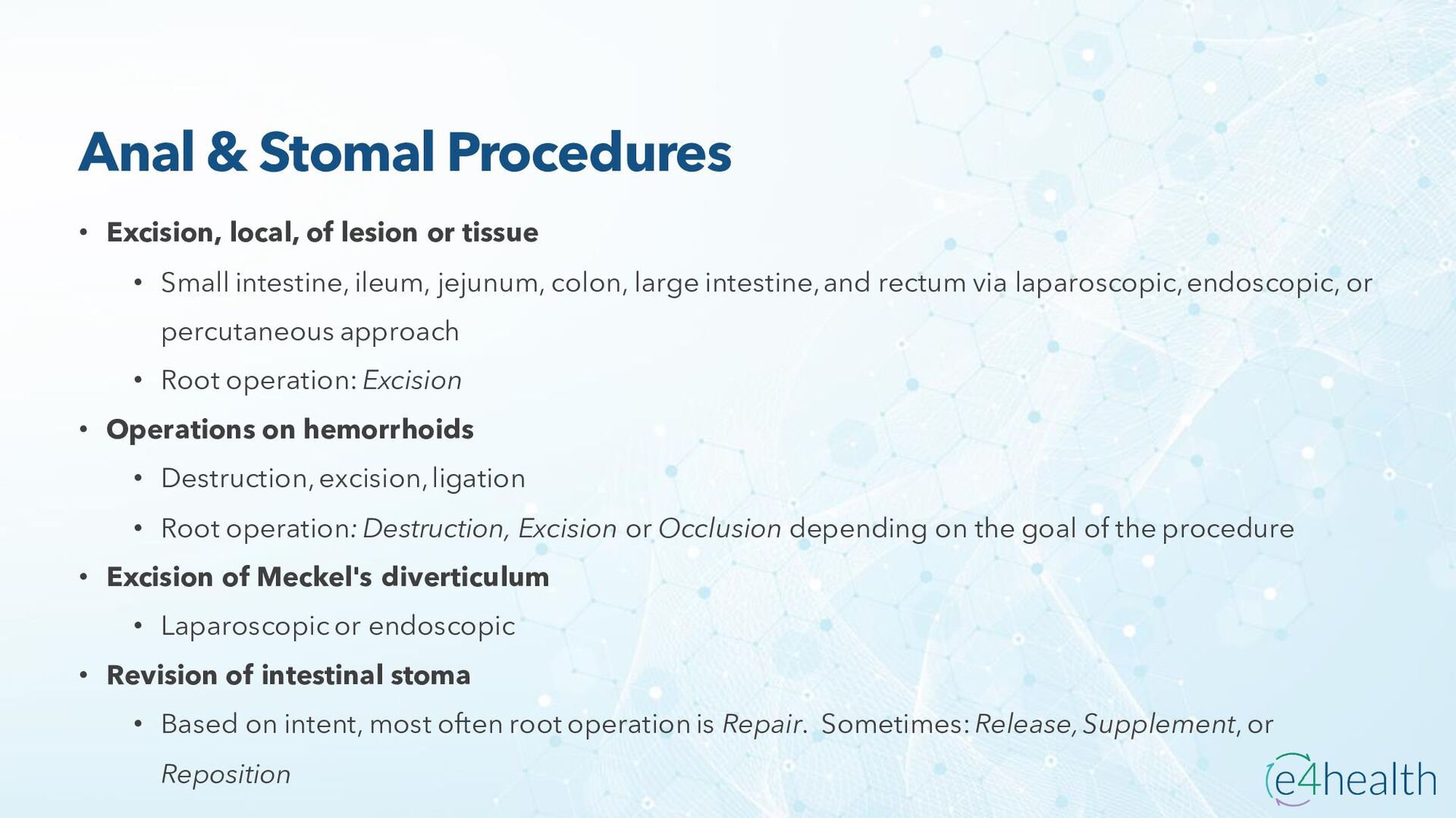 competence, other procedures • Fundoplication, gastric cardioplasty, Nissen fundoplication • Root operation: Restriction • Excision of stomach via percutaneous endoscopic approach (diagnostic) • Includes percutaneous approach; Diagnostic, vertical • Excision or Destruction of lesion or tissue, pharynx and Division, tongue, palate, pharynx muscle • Repair of Zenker’s diverticulum • Root operation: Division, Excision or Repair • Gastrectomy, partial, with anastomosis to jejunum • Billroth II • Root operation: Bypass, Excision • Gastrectomy, partial, with anastomosis to duodenum • Billroth I, distal gastrectomy, gastro-pylorectomy • Review op report for total (Resection) or partial (Excision) removal of stomach