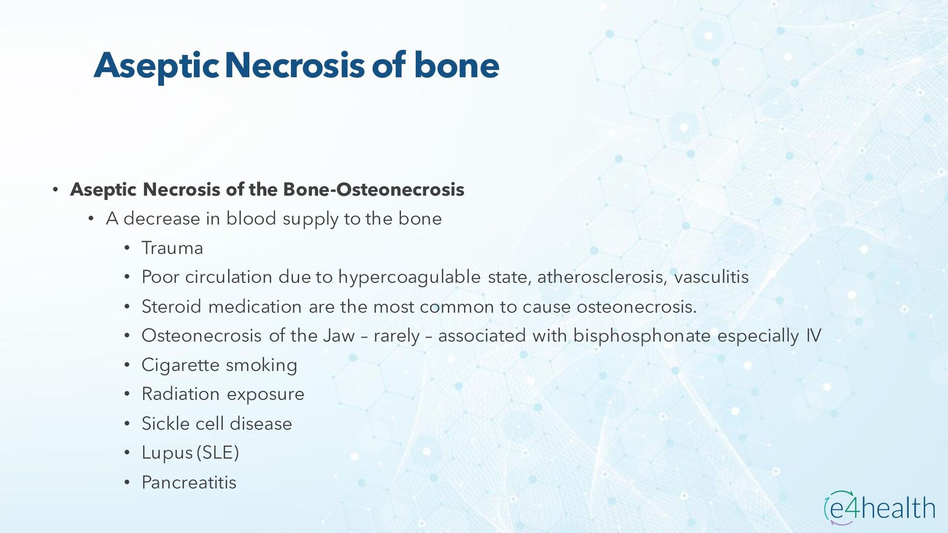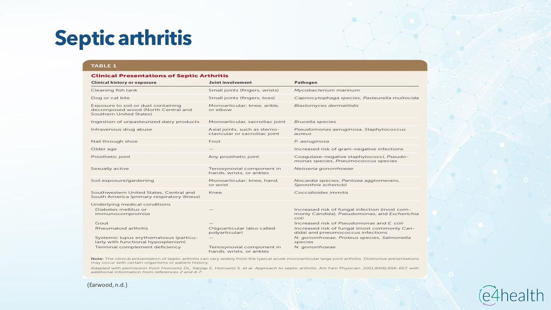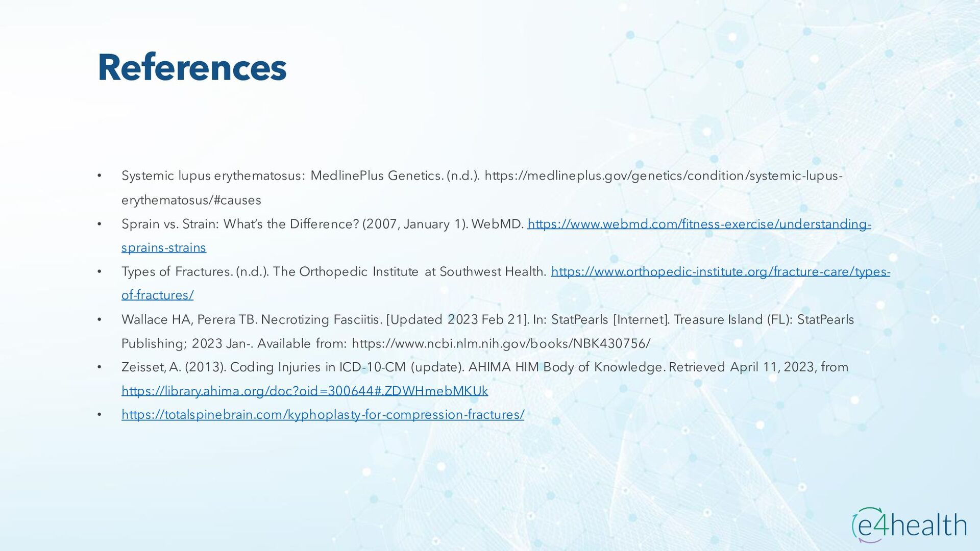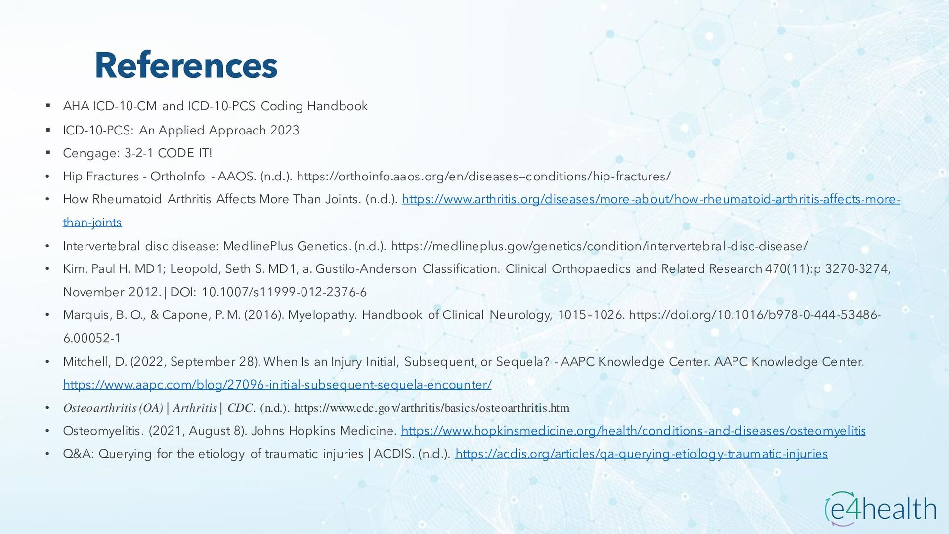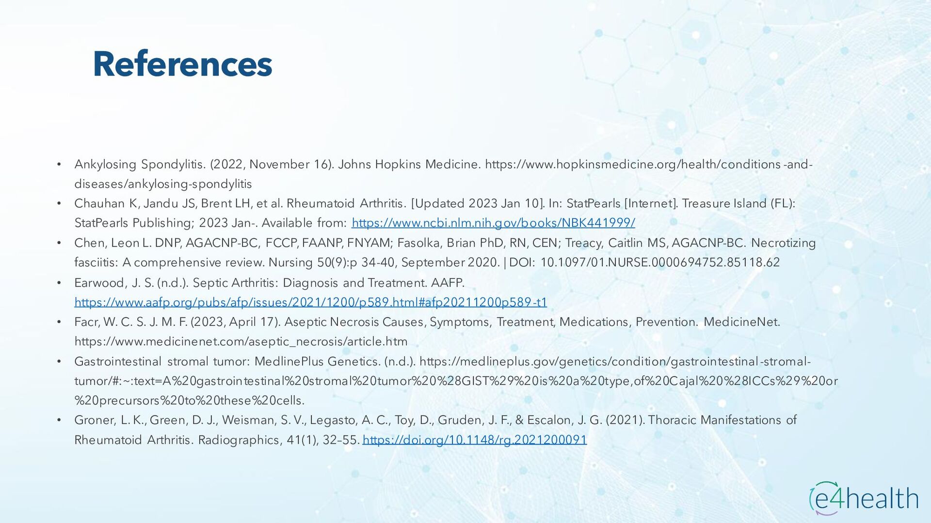 https://www.hopkinsmedicine.org/health/conditions -and- diseases/ankylosing-spondylitis • Chauhan K, Jandu JS, Brent LH, et al. Rheumatoid Arthritis. [Updated 2023 Jan 10]. In: StatPearls [Internet]. Treasure Island (FL): StatPearls Publishing; 2023 Jan-. Available from: https://www.ncbi.nlm.nih.gov/books/NBK441999/ • Chen, Leon L. DNP, AGACNP-BC, FCCP, FAANP, FNYAM; Fasolka, Brian PhD, RN, CEN; Treacy, Caitlin MS, AGACNP-BC. Necrotizing fasciitis: A comprehensive review. Nursing 50(9):p 34-40, September 2020. | DOI: 10.1097/01.NURSE.0000694752.85118.62 • Earwood, J. S. (n.d.). Septic Arthritis: Diagnosis and Treatment. AAFP. https://www.aafp.org/pubs/afp/issues/2021/1200/p589.html#afp20211200p589-t1 • Facr, W. C. S. J. M. F. (2023, April 17). Aseptic Necrosis Causes, Symptoms, Treatment, Medications, Prevention. MedicineNet. https://www.medicinenet.com/aseptic_necrosis/article.htm • Gastrointestinal stromal tumor: MedlinePlus Genetics. (n.d.). https://medlineplus.gov/genetics/condition/gastrointestinal-stromal- tumor/#:~:text=A%20gastrointestinal%20stromal%20tumor%20%28GIST%29%20is%20a%20type,of%20Cajal%20%28ICCs%29%20or %20precursors%20to%20these%20cells. • Groner, L. K., Green, D. J., Weisman, S. V., Legasto, A. C., Toy, D., Gruden, J. F., & Escalon, J. G. (2021). Thoracic Manifestations of Rheumatoid Arthritis. Radiographics, 41(1), 32–55. https://doi.org/10.1148/rg.2021200091