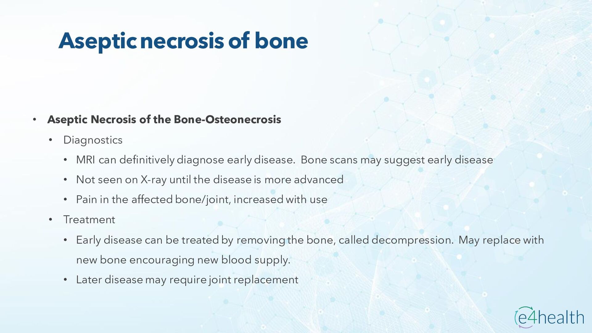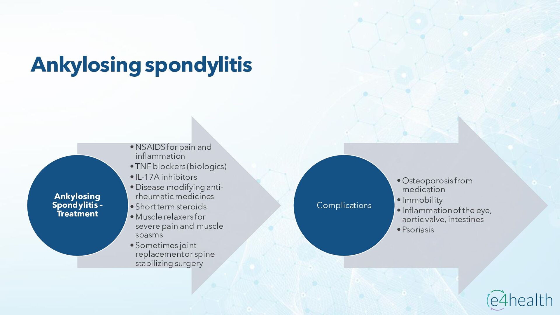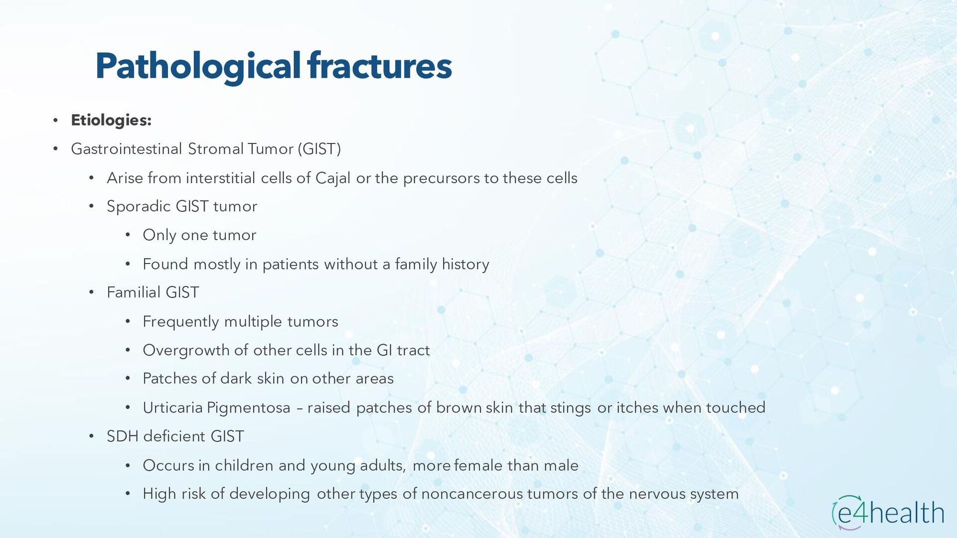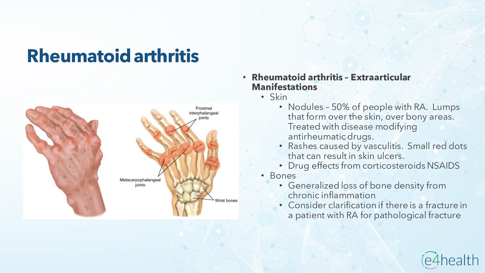 https://www.hopkinsmedicine.org/health/conditions -and- diseases/ankylosing-spondylitis • Chauhan K, Jandu JS, Brent LH, et al. Rheumatoid Arthritis. [Updated 2023 Jan 10]. In: StatPearls [Internet]. Treasure Island (FL): StatPearls Publishing; 2023 Jan-. Available from: https://www.ncbi.nlm.nih.gov/books/NBK441999/ • Chen, Leon L. DNP, AGACNP-BC, FCCP, FAANP, FNYAM; Fasolka, Brian PhD, RN, CEN; Treacy, Caitlin MS, AGACNP-BC. Necrotizing fasciitis: A comprehensive review. Nursing 50(9):p 34-40, September 2020. | DOI: 10.1097/01.NURSE.0000694752.85118.62 • Earwood, J. S. (n.d.). Septic Arthritis: Diagnosis and Treatment. AAFP. https://www.aafp.org/pubs/afp/issues/2021/1200/p589.html#afp20211200p589-t1 • Facr, W. C. S. J. M. F. (2023, April 17). Aseptic Necrosis Causes, Symptoms, Treatment, Medications, Prevention. MedicineNet. https://www.medicinenet.com/aseptic_necrosis/article.htm • Gastrointestinal stromal tumor: MedlinePlus Genetics. (n.d.). https://medlineplus.gov/genetics/condition/gastrointestinal-stromal- tumor/#:~:text=A%20gastrointestinal%20stromal%20tumor%20%28GIST%29%20is%20a%20type,of%20Cajal%20%28ICCs%29%20or %20precursors%20to%20these%20cells. • Groner, L. K., Green, D. J., Weisman, S. V., Legasto, A. C., Toy, D., Gruden, J. F., & Escalon, J. G. (2021). Thoracic Manifestations of Rheumatoid Arthritis. Radiographics, 41(1), 32–55. https://doi.org/10.1148/rg.2021200091