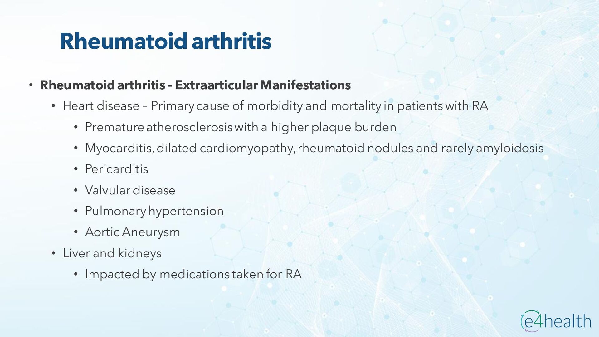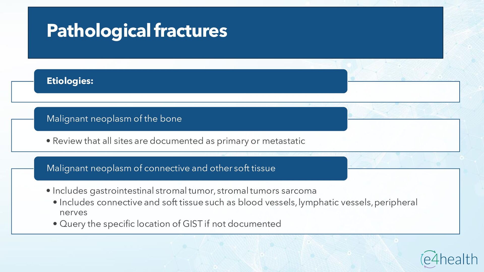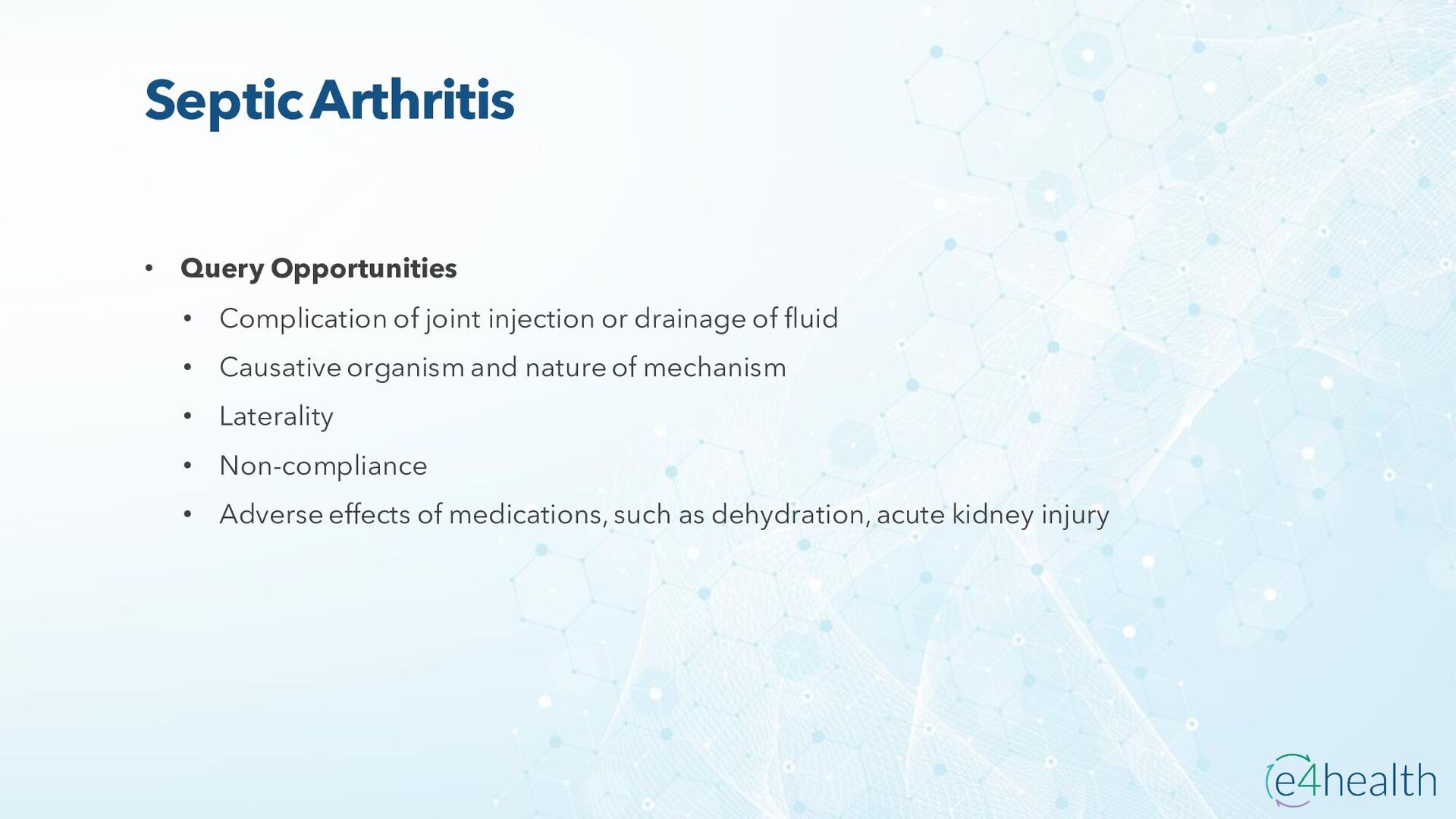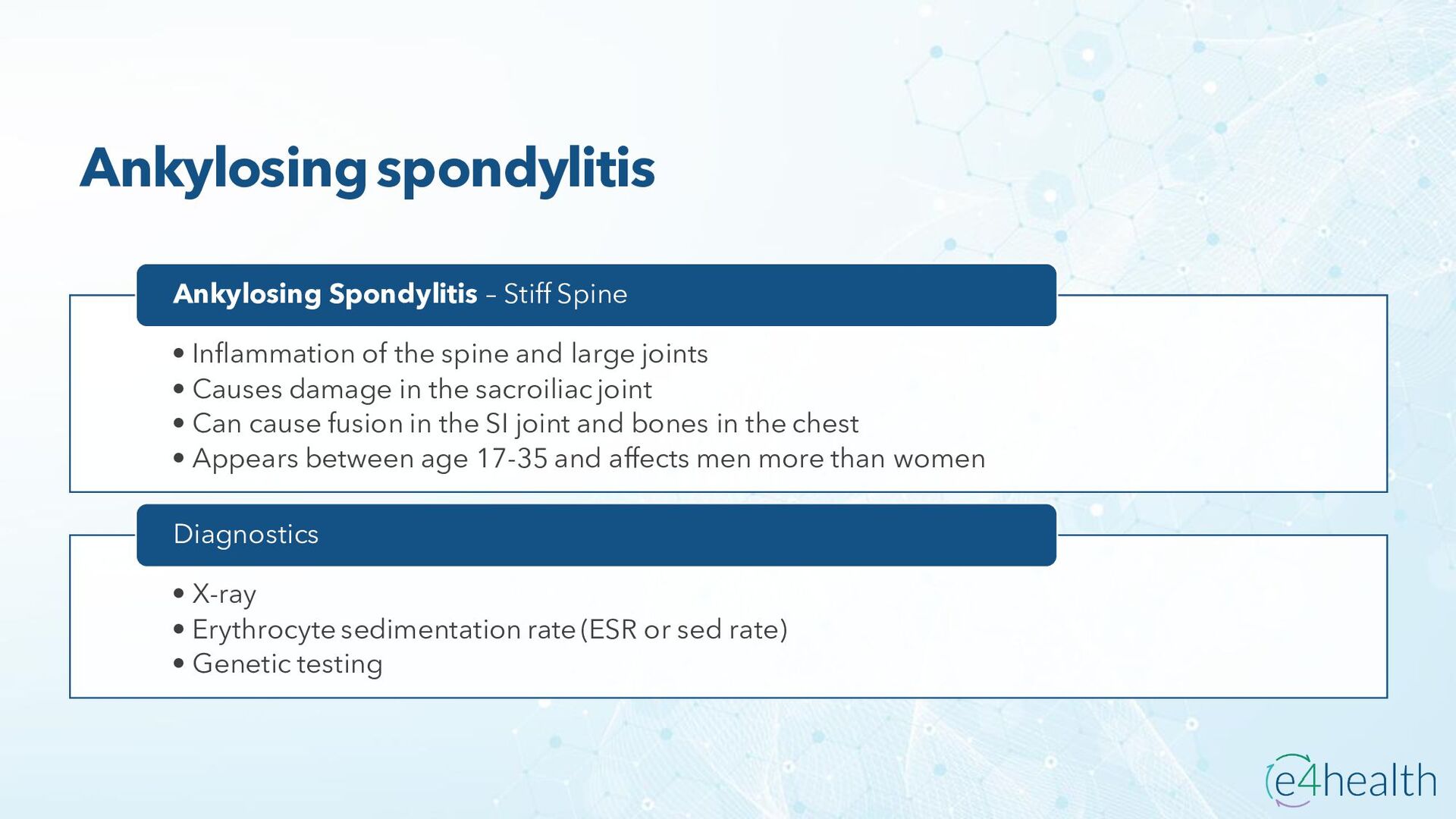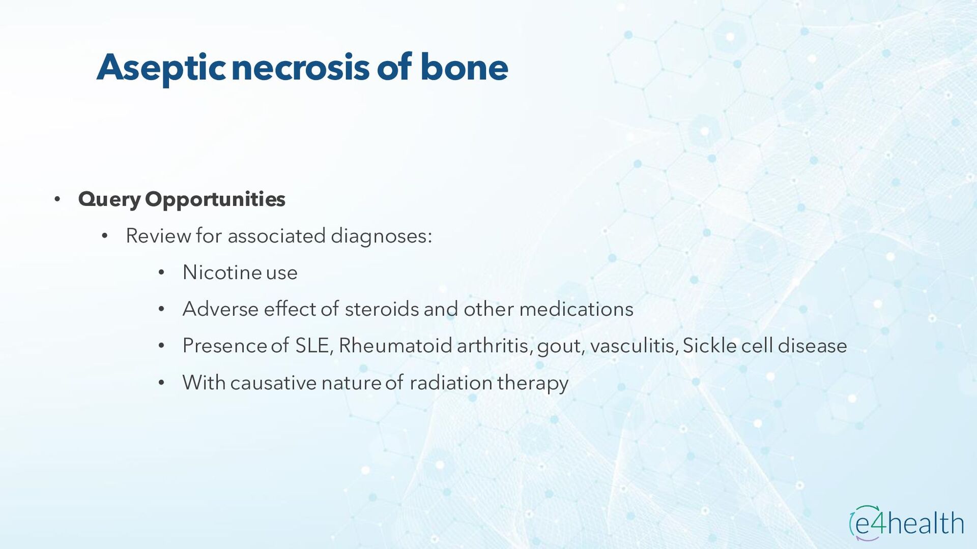 https://www.hopkinsmedicine.org/health/conditions -and- diseases/ankylosing-spondylitis • Chauhan K, Jandu JS, Brent LH, et al. Rheumatoid Arthritis. [Updated 2023 Jan 10]. In: StatPearls [Internet]. Treasure Island (FL): StatPearls Publishing; 2023 Jan-. Available from: https://www.ncbi.nlm.nih.gov/books/NBK441999/ • Chen, Leon L. DNP, AGACNP-BC, FCCP, FAANP, FNYAM; Fasolka, Brian PhD, RN, CEN; Treacy, Caitlin MS, AGACNP-BC. Necrotizing fasciitis: A comprehensive review. Nursing 50(9):p 34-40, September 2020. | DOI: 10.1097/01.NURSE.0000694752.85118.62 • Earwood, J. S. (n.d.). Septic Arthritis: Diagnosis and Treatment. AAFP. https://www.aafp.org/pubs/afp/issues/2021/1200/p589.html#afp20211200p589-t1 • Facr, W. C. S. J. M. F. (2023, April 17). Aseptic Necrosis Causes, Symptoms, Treatment, Medications, Prevention. MedicineNet. https://www.medicinenet.com/aseptic_necrosis/article.htm • Gastrointestinal stromal tumor: MedlinePlus Genetics. (n.d.). https://medlineplus.gov/genetics/condition/gastrointestinal-stromal- tumor/#:~:text=A%20gastrointestinal%20stromal%20tumor%20%28GIST%29%20is%20a%20type,of%20Cajal%20%28ICCs%29%20or %20precursors%20to%20these%20cells. • Groner, L. K., Green, D. J., Weisman, S. V., Legasto, A. C., Toy, D., Gruden, J. F., & Escalon, J. G. (2021). Thoracic Manifestations of Rheumatoid Arthritis. Radiographics, 41(1), 32–55. https://doi.org/10.1148/rg.2021200091