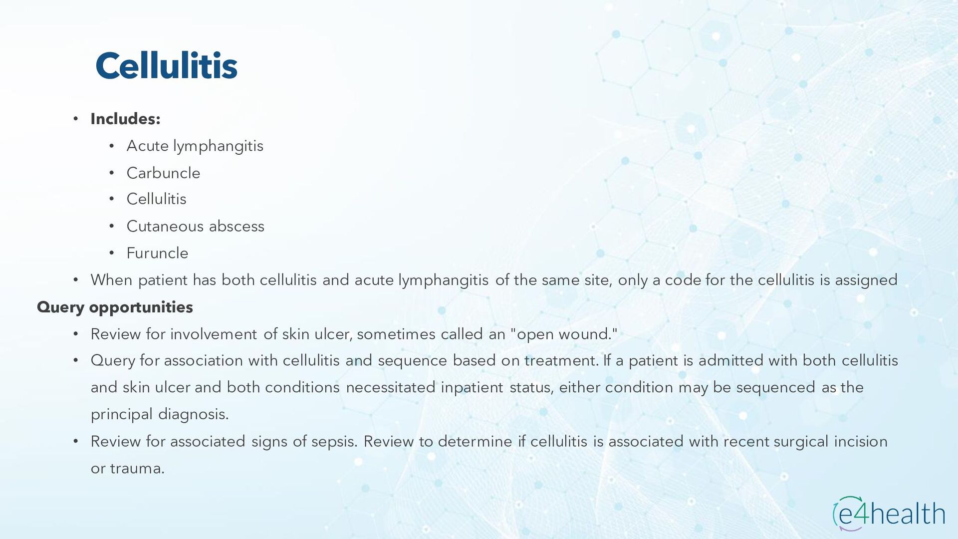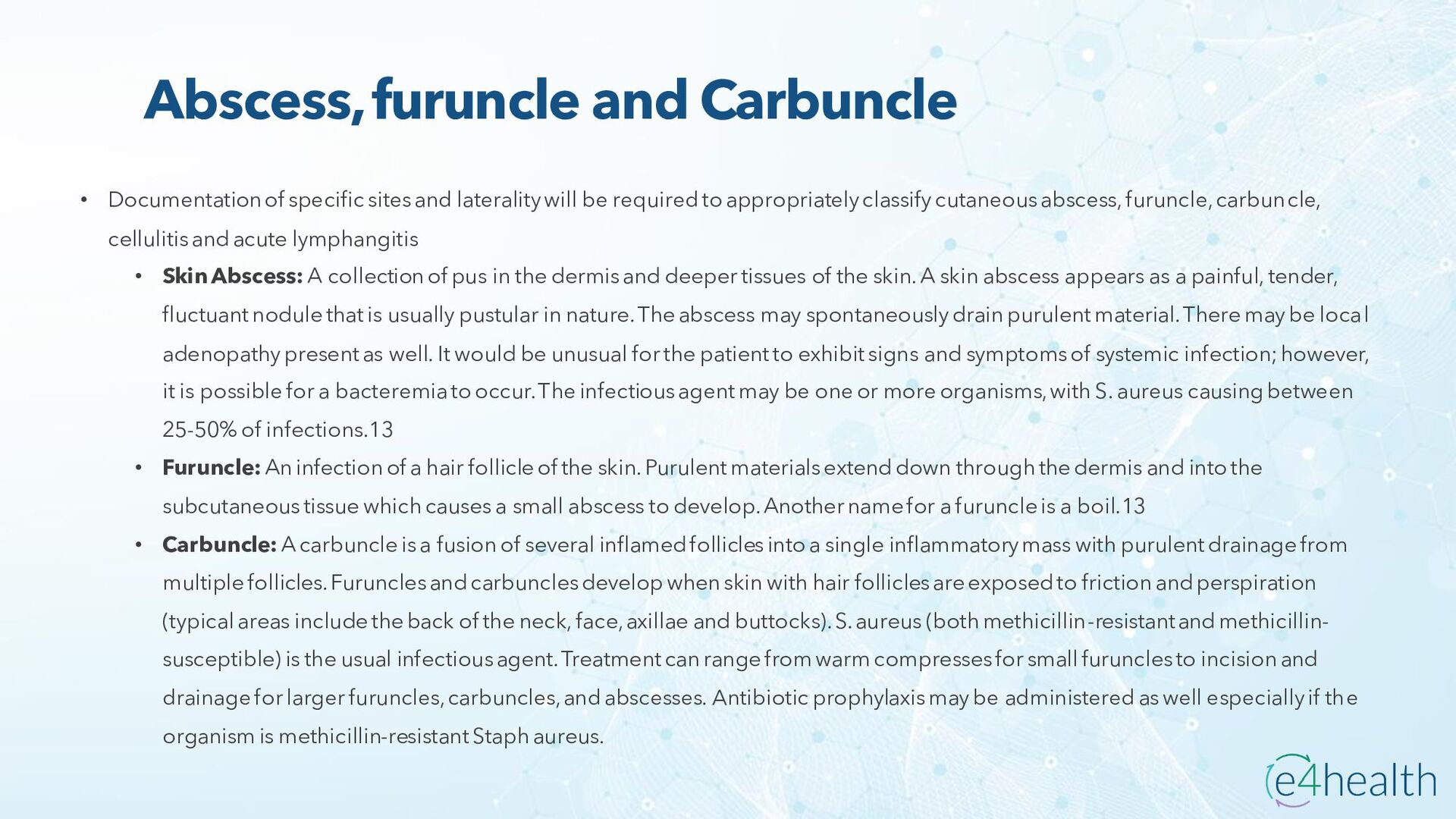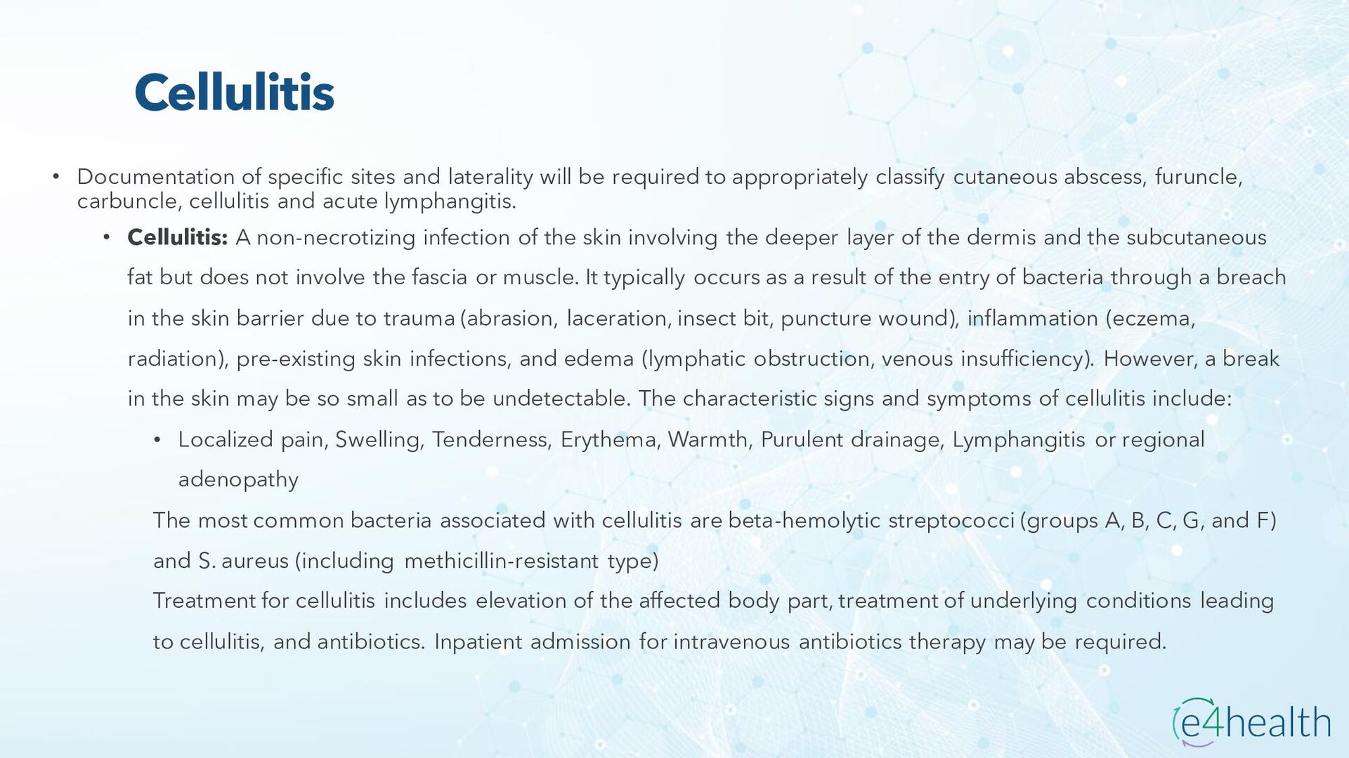 required to appropriately classify cutaneous abscess, furuncle, carbuncle, cellulitis and acute lymphangitis. • Cellulitis: A non-necrotizing infection of the skin involving the deeper layer of the dermis and the subcutaneous fat but does not involve the fascia or muscle. It typically occurs as a result of the entry of bacteria through a breach in the skin barrier due to trauma (abrasion, laceration, insect bit, puncture wound), inflammation (eczema, radiation), pre-existing skin infections, and edema (lymphatic obstruction, venous insufficiency). However, a break in the skin may be so small as to be undetectable. The characteristic signs and symptoms of cellulitis include: • Localized pain, Swelling, Tenderness, Erythema, Warmth, Purulent drainage, Lymphangitis or regional adenopathy The most common bacteria associated with cellulitis are beta-hemolytic streptococci (groups A, B, C, G, and F) and S. aureus (including methicillin-resistant type) Treatment for cellulitis includes elevation of the affected body part, treatment of underlying conditions leading to cellulitis, and antibiotics. Inpatient admission for intravenous antibiotics therapy may be required.