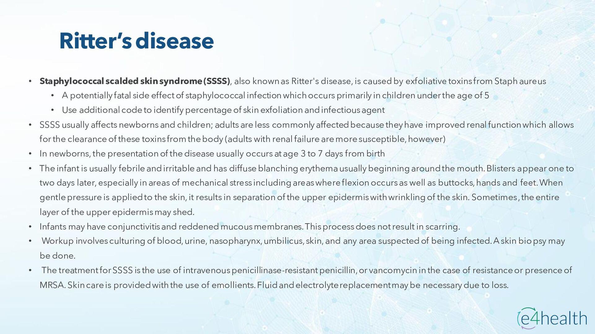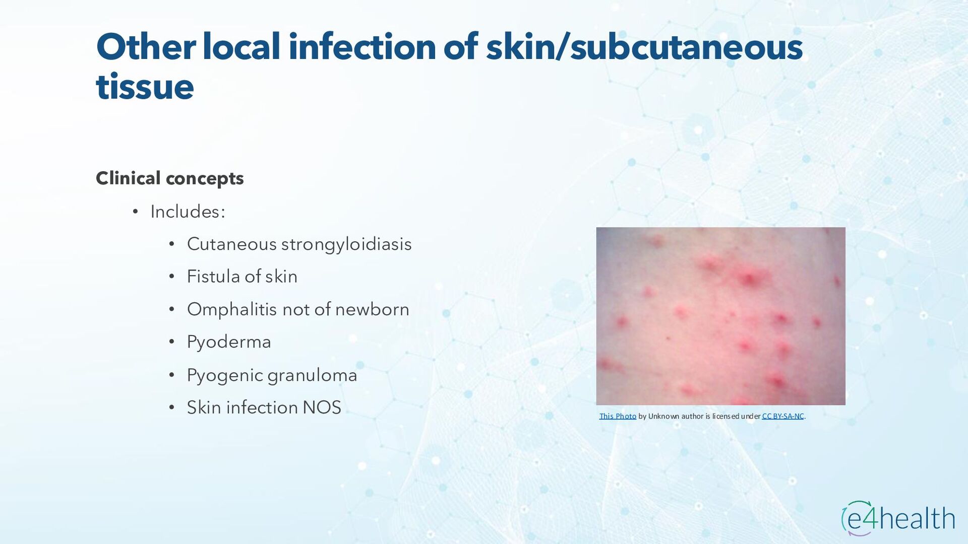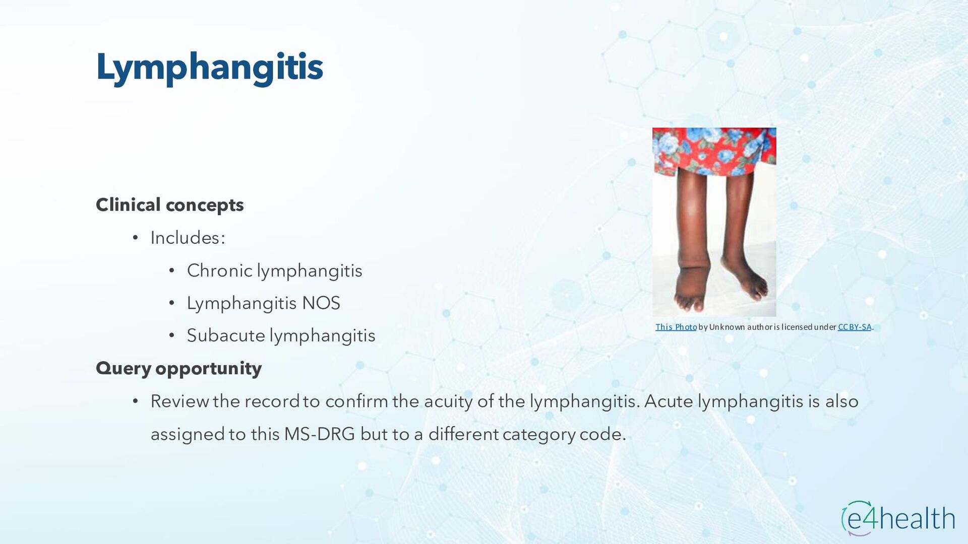 required to appropriately classify cutaneous abscess, furuncle, carbuncle, cellulitis and acute lymphangitis. • Cellulitis: A non-necrotizing infection of the skin involving the deeper layer of the dermis and the subcutaneous fat but does not involve the fascia or muscle. It typically occurs as a result of the entry of bacteria through a breach in the skin barrier due to trauma (abrasion, laceration, insect bit, puncture wound), inflammation (eczema, radiation), pre-existing skin infections, and edema (lymphatic obstruction, venous insufficiency). However, a break in the skin may be so small as to be undetectable. The characteristic signs and symptoms of cellulitis include: • Localized pain, Swelling, Tenderness, Erythema, Warmth, Purulent drainage, Lymphangitis or regional adenopathy The most common bacteria associated with cellulitis are beta-hemolytic streptococci (groups A, B, C, G, and F) and S. aureus (including methicillin-resistant type) Treatment for cellulitis includes elevation of the affected body part, treatment of underlying conditions leading to cellulitis, and antibiotics. Inpatient admission for intravenous antibiotics therapy may be required.