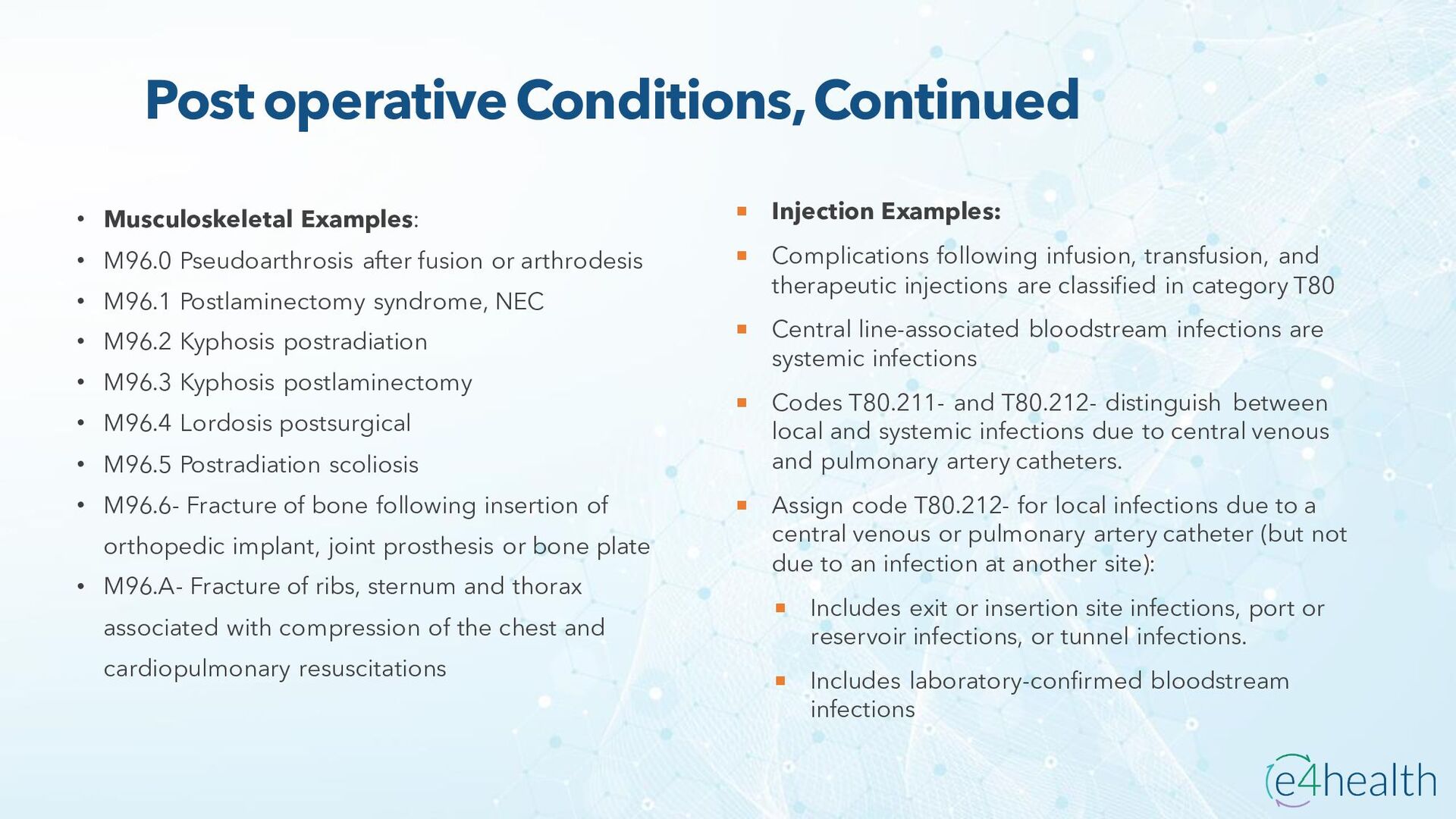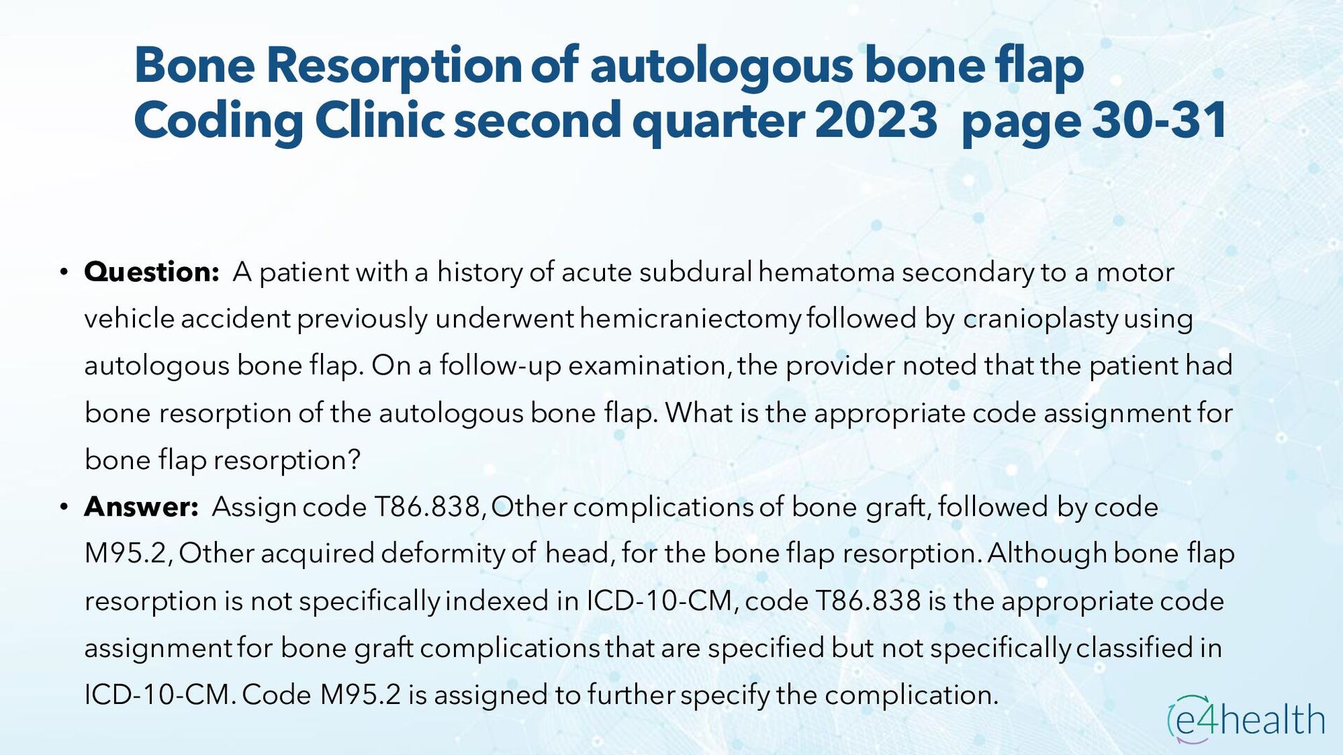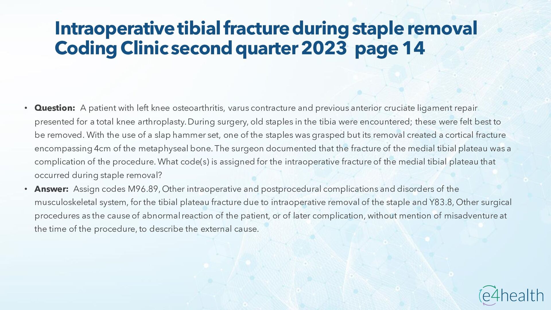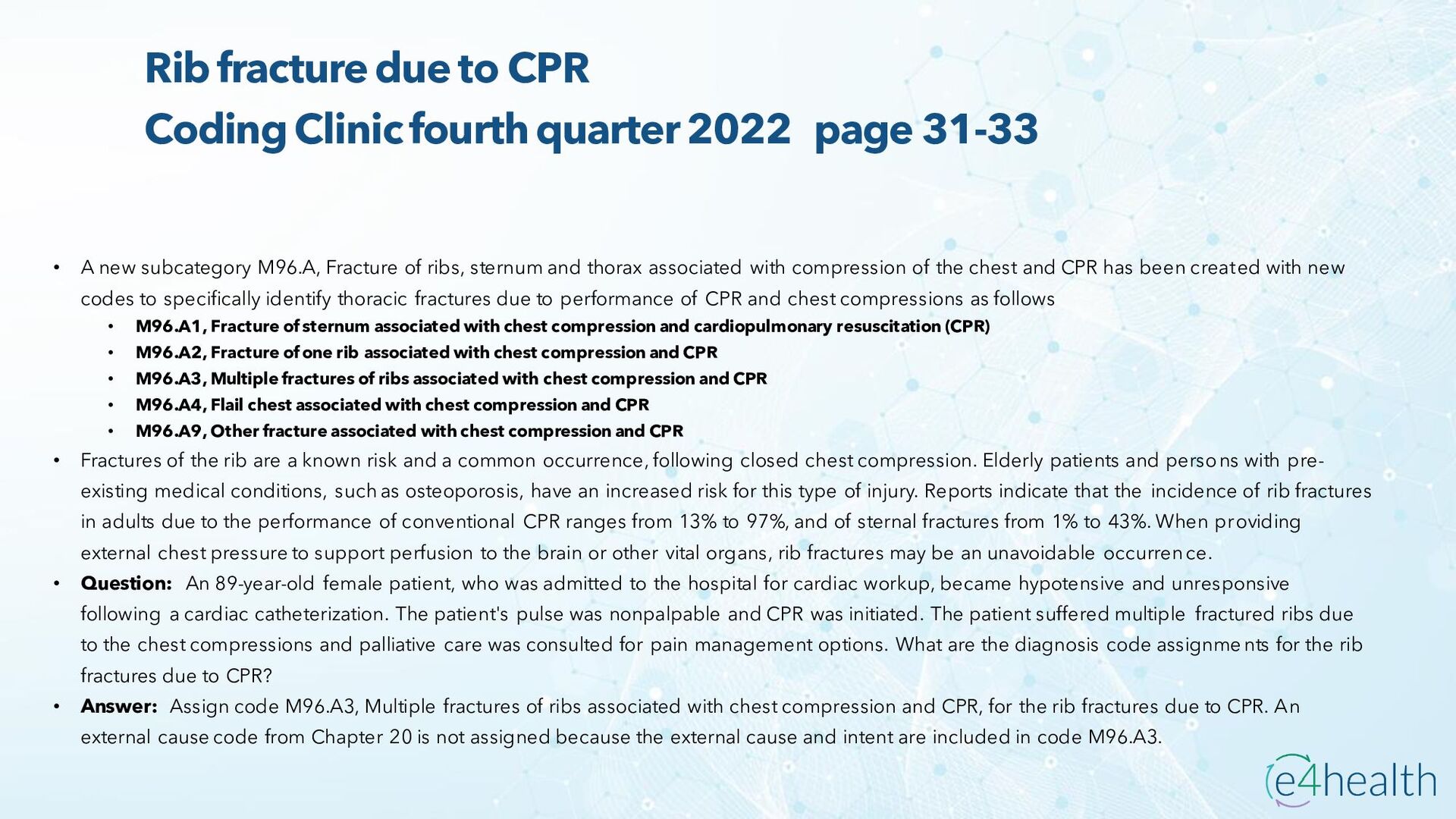 page 31-33 • A new subcategory M96.A, Fracture of ribs, sternum and thorax associated with compression of the chest and CPR has been created with new codes to specifically identify thoracic fractures due to performance of CPR and chest compressions as follows • M96.A1, Fracture of sternum associated with chest compression and cardiopulmonary resuscitation (CPR) • M96.A2, Fracture of one rib associated with chest compression and CPR • M96.A3, Multiple fractures of ribs associated with chest compression and CPR • M96.A4, Flail chest associated with chest compression and CPR • M96.A9, Other fracture associated with chest compression and CPR • Fractures of the rib are a known risk and a common occurrence, following closed chest compression. Elderly patients and persons with pre- existing medical conditions, such as osteoporosis, have an increased risk for this type of injury. Reports indicate that the incidence of rib fractures in adults due to the performance of conventional CPR ranges from 13% to 97%, and of sternal fractures from 1% to 43%. When providing external chest pressure to support perfusion to the brain or other vital organs, rib fractures may be an unavoidable occurrence. • Question: An 89-year-old female patient, who was admitted to the hospital for cardiac workup, became hypotensive and unresponsive following a cardiac catheterization. The patient's pulse was nonpalpable and CPR was initiated. The patient suffered multiple fractured ribs due to the chest compressions and palliative care was consulted for pain management options. What are the diagnosis code assignments for the rib fractures due to CPR? • Answer: Assign code M96.A3, Multiple fractures of ribs associated with chest compression and CPR, for the rib fractures due to CPR. An external cause code from Chapter 20 is not assigned because the external cause and intent are included in code M96.A3.