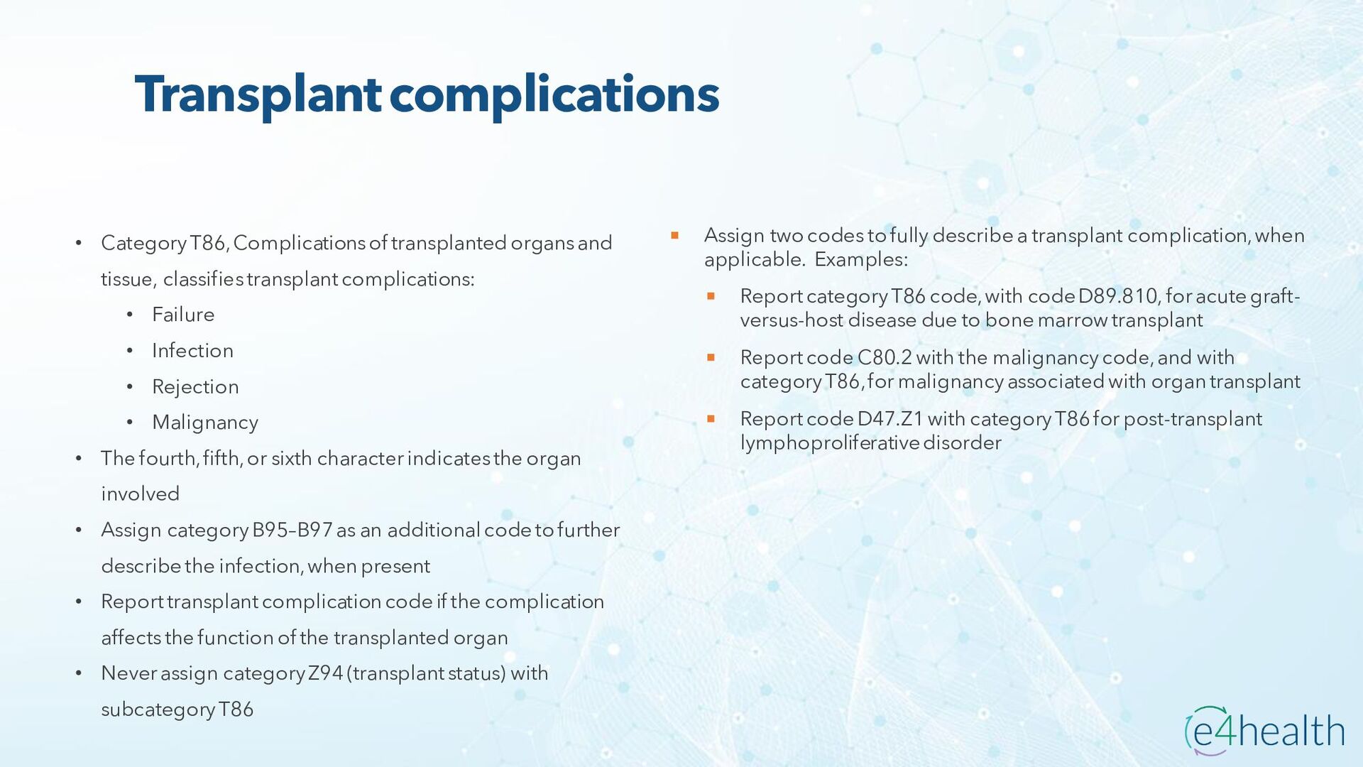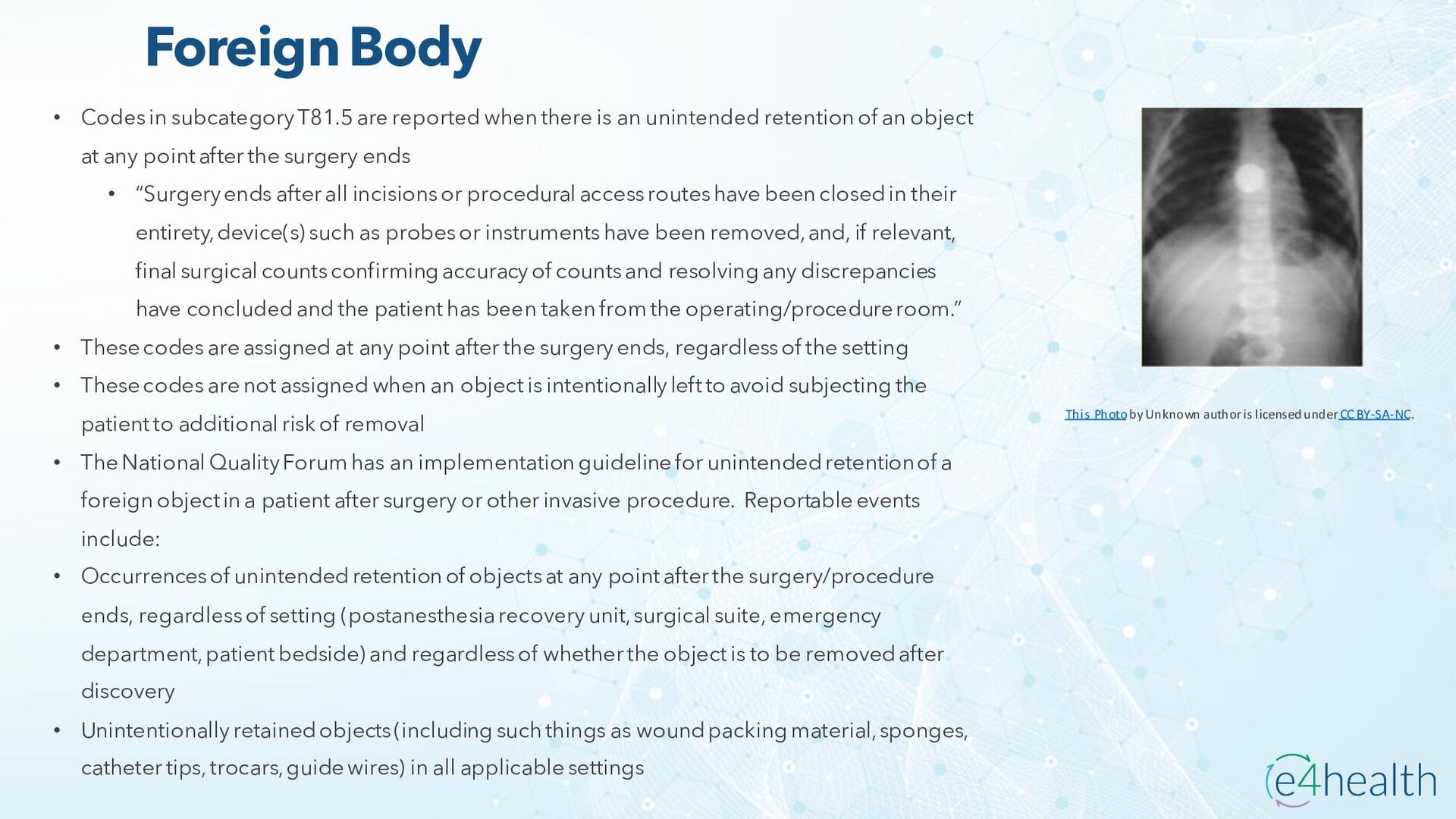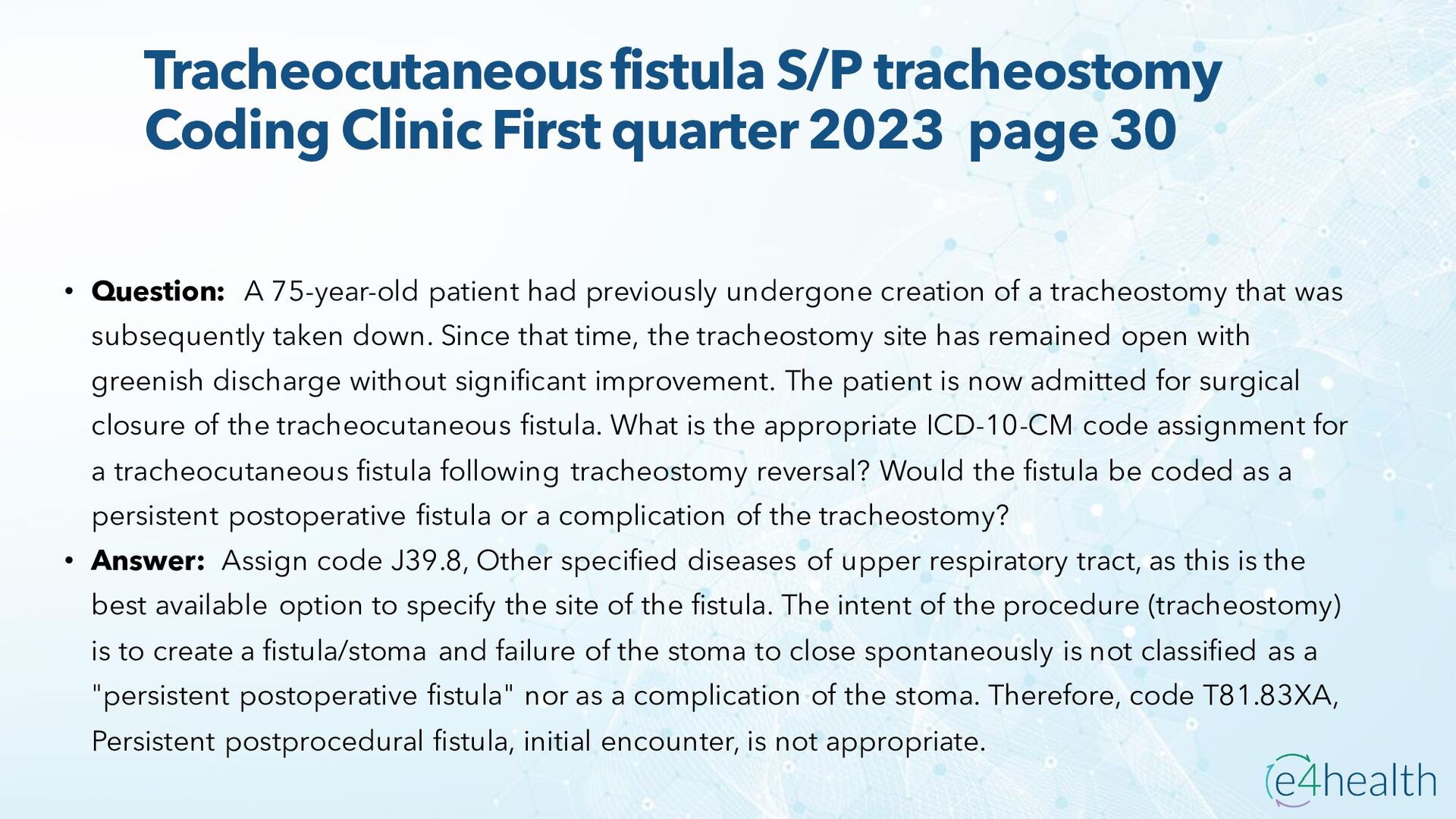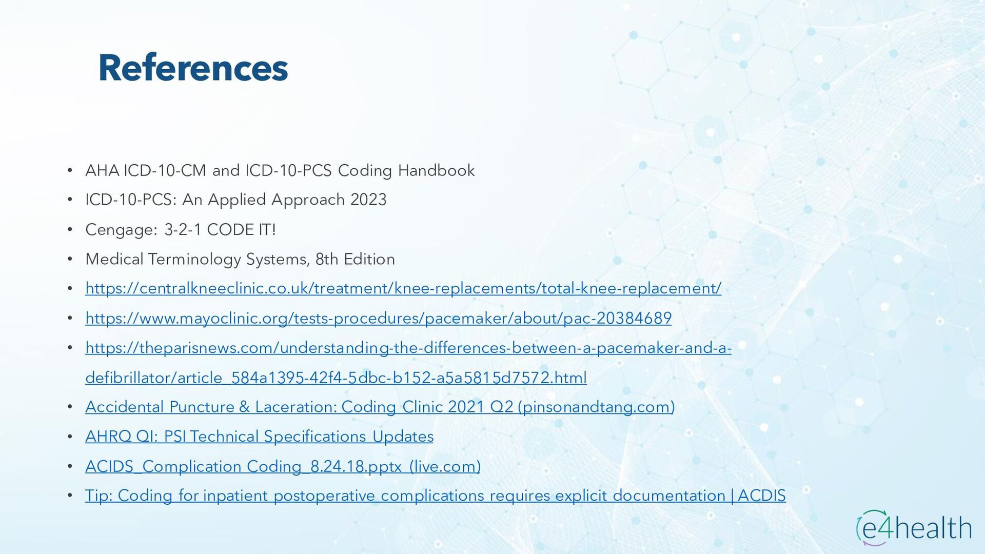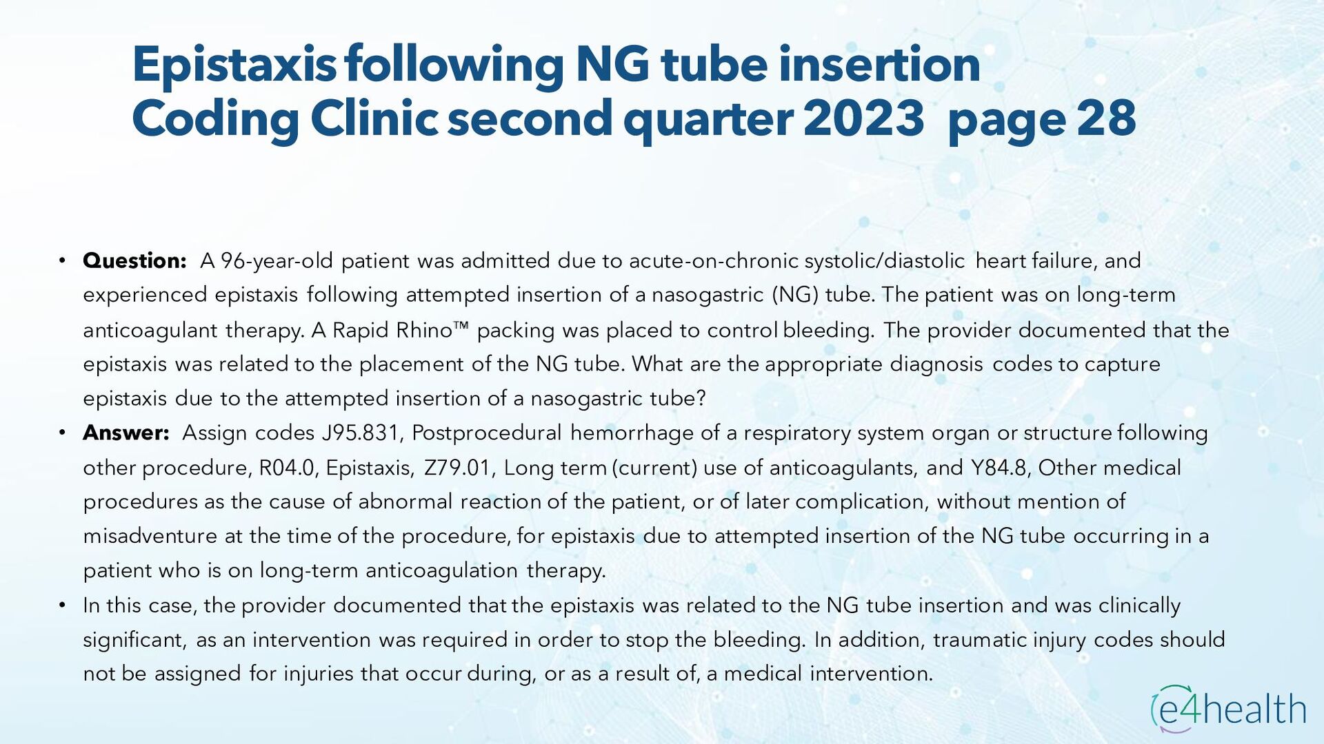 page 31-33 • A new subcategory M96.A, Fracture of ribs, sternum and thorax associated with compression of the chest and CPR has been created with new codes to specifically identify thoracic fractures due to performance of CPR and chest compressions as follows • M96.A1, Fracture of sternum associated with chest compression and cardiopulmonary resuscitation (CPR) • M96.A2, Fracture of one rib associated with chest compression and CPR • M96.A3, Multiple fractures of ribs associated with chest compression and CPR • M96.A4, Flail chest associated with chest compression and CPR • M96.A9, Other fracture associated with chest compression and CPR • Fractures of the rib are a known risk and a common occurrence, following closed chest compression. Elderly patients and persons with pre- existing medical conditions, such as osteoporosis, have an increased risk for this type of injury. Reports indicate that the incidence of rib fractures in adults due to the performance of conventional CPR ranges from 13% to 97%, and of sternal fractures from 1% to 43%. When providing external chest pressure to support perfusion to the brain or other vital organs, rib fractures may be an unavoidable occurrence. • Question: An 89-year-old female patient, who was admitted to the hospital for cardiac workup, became hypotensive and unresponsive following a cardiac catheterization. The patient's pulse was nonpalpable and CPR was initiated. The patient suffered multiple fractured ribs due to the chest compressions and palliative care was consulted for pain management options. What are the diagnosis code assignments for the rib fractures due to CPR? • Answer: Assign code M96.A3, Multiple fractures of ribs associated with chest compression and CPR, for the rib fractures due to CPR. An external cause code from Chapter 20 is not assigned because the external cause and intent are included in code M96.A3.