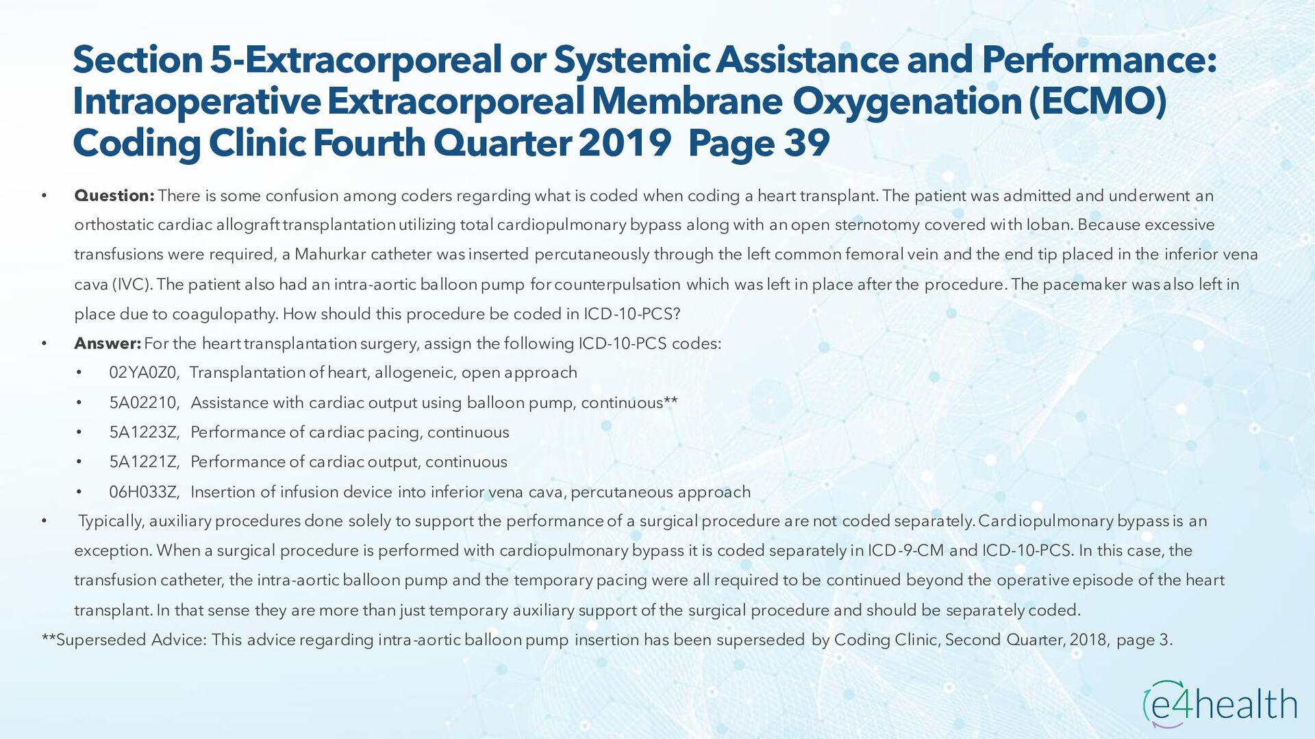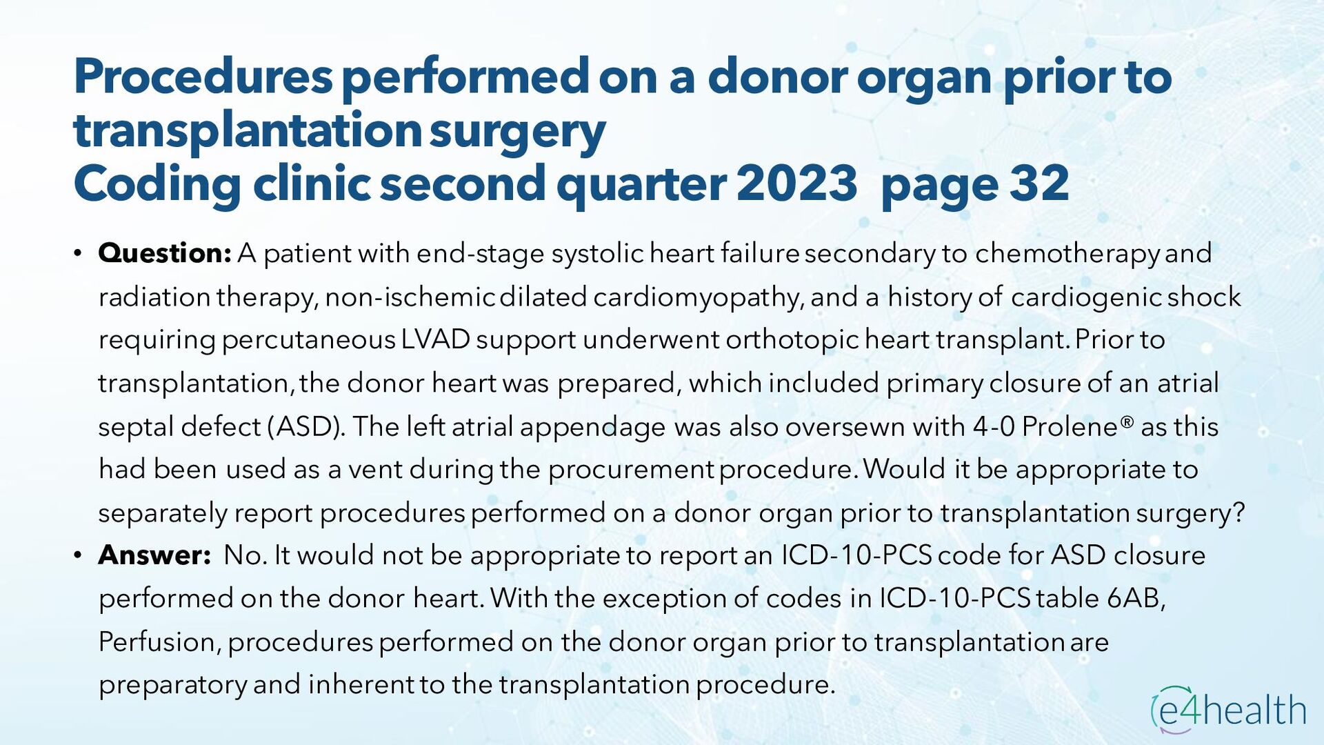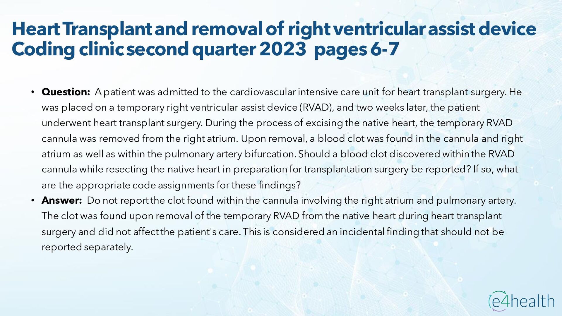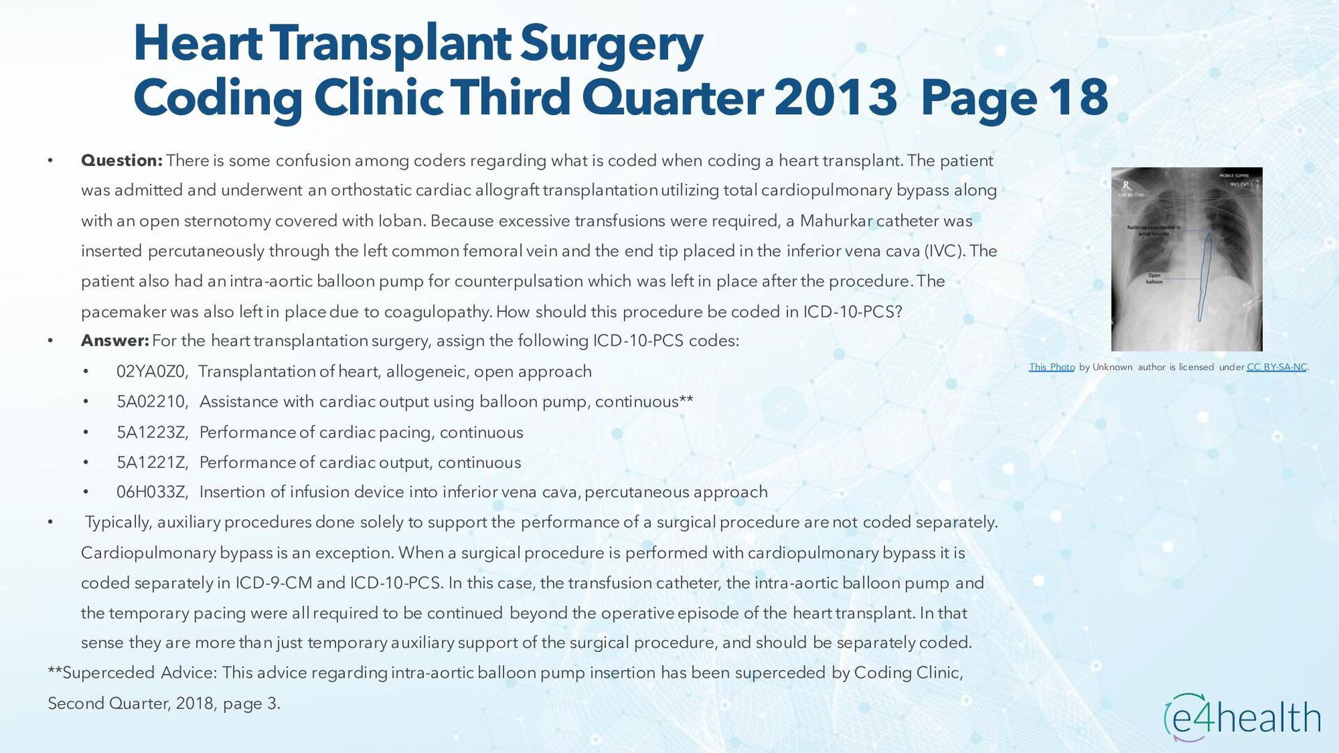 • Question: There is some confusion among coders regarding what is coded when coding a heart transplant. The patient was admitted and underwent an orthostatic cardiac allograft transplantation utilizing total cardiopulmonary bypass along with an open sternotomy covered with Ioban. Because excessive transfusions were required, a Mahurkar catheter was inserted percutaneously through the left common femoral vein and the end tip placed in the inferior vena cava (IVC). The patient also had an intra-aortic balloon pump for counterpulsation which was left in place after the procedure. The pacemaker was also left in place due to coagulopathy. How should this procedure be coded in ICD-10-PCS? • Answer: For the heart transplantation surgery, assign the following ICD-10-PCS codes: • 02YA0Z0, Transplantation of heart, allogeneic, open approach • 5A02210, Assistance with cardiac output using balloon pump, continuous** • 5A1223Z, Performance of cardiac pacing, continuous • 5A1221Z, Performance of cardiac output, continuous • 06H033Z, Insertion of infusion device into inferior vena cava, percutaneous approach • Typically, auxiliary procedures done solely to support the performance of a surgical procedure are not coded separately. Cardiopulmonary bypass is an exception. When a surgical procedure is performed with cardiopulmonary bypass it is coded separately in ICD-9-CM and ICD-10-PCS. In this case, the transfusion catheter, the intra-aortic balloon pump and the temporary pacing were all required to be continued beyond the operative episode of the heart transplant. In that sense they are more than just temporary auxiliary support of the surgical procedure, and should be separately coded. **Superceded Advice: This advice regarding intra-aortic balloon pump insertion has been superceded by Coding Clinic, Second Quarter, 2018, page 3. This Photo by Unknown author is licensed under CC BY-SA-NC.