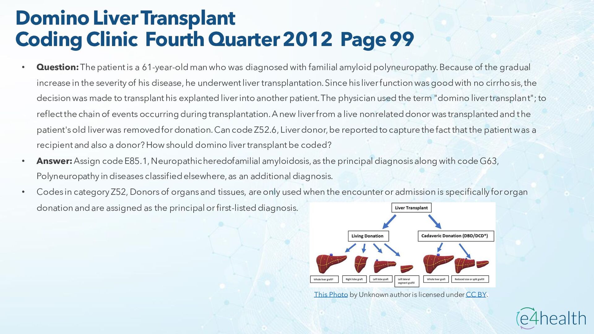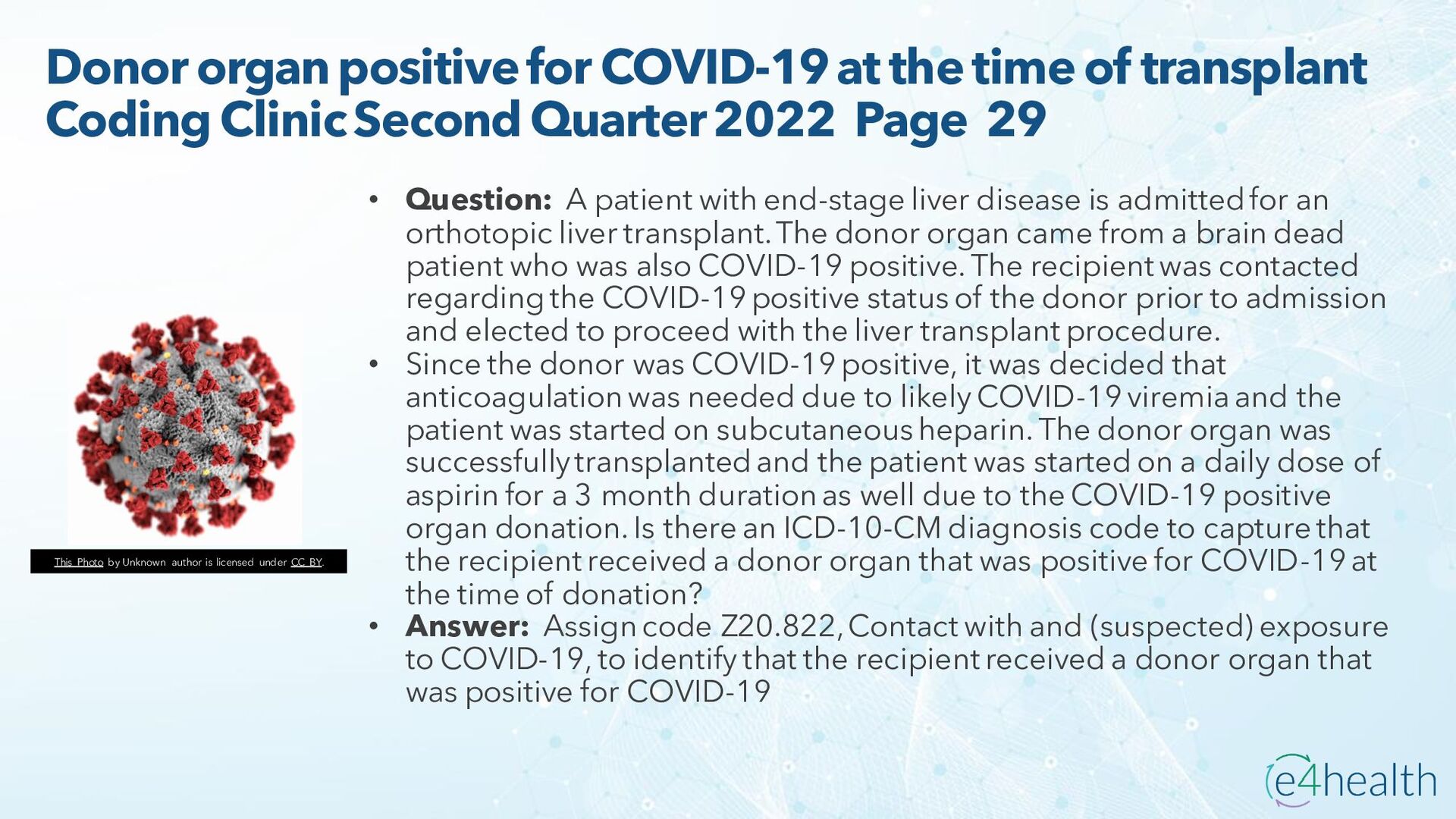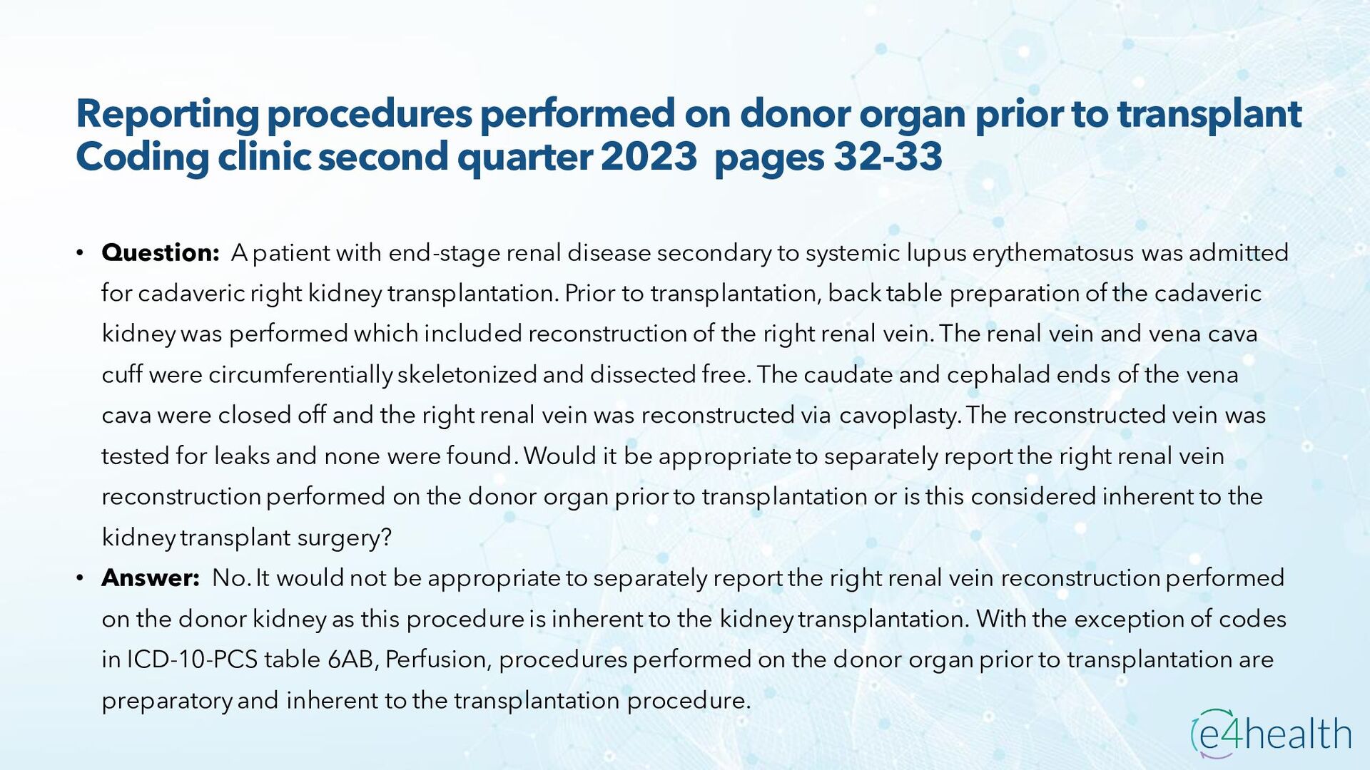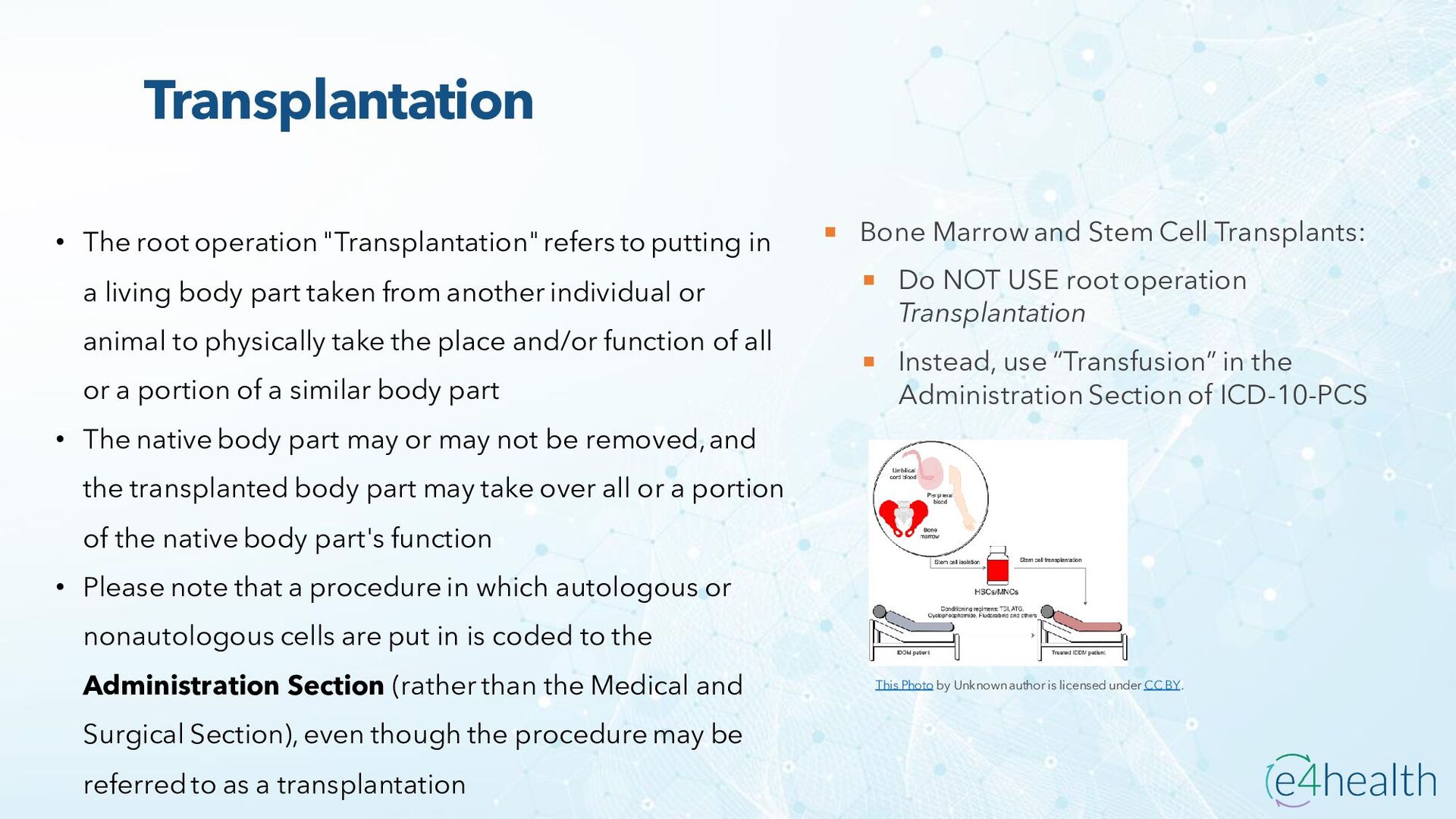 • Question: There is some confusion among coders regarding what is coded when coding a heart transplant. The patient was admitted and underwent an orthostatic cardiac allograft transplantation utilizing total cardiopulmonary bypass along with an open sternotomy covered with Ioban. Because excessive transfusions were required, a Mahurkar catheter was inserted percutaneously through the left common femoral vein and the end tip placed in the inferior vena cava (IVC). The patient also had an intra-aortic balloon pump for counterpulsation which was left in place after the procedure. The pacemaker was also left in place due to coagulopathy. How should this procedure be coded in ICD-10-PCS? • Answer: For the heart transplantation surgery, assign the following ICD-10-PCS codes: • 02YA0Z0, Transplantation of heart, allogeneic, open approach • 5A02210, Assistance with cardiac output using balloon pump, continuous** • 5A1223Z, Performance of cardiac pacing, continuous • 5A1221Z, Performance of cardiac output, continuous • 06H033Z, Insertion of infusion device into inferior vena cava, percutaneous approach • Typically, auxiliary procedures done solely to support the performance of a surgical procedure are not coded separately. Cardiopulmonary bypass is an exception. When a surgical procedure is performed with cardiopulmonary bypass it is coded separately in ICD-9-CM and ICD-10-PCS. In this case, the transfusion catheter, the intra-aortic balloon pump and the temporary pacing were all required to be continued beyond the operative episode of the heart transplant. In that sense they are more than just temporary auxiliary support of the surgical procedure, and should be separately coded. **Superceded Advice: This advice regarding intra-aortic balloon pump insertion has been superceded by Coding Clinic, Second Quarter, 2018, page 3. This Photo by Unknown author is licensed under CC BY-SA-NC.