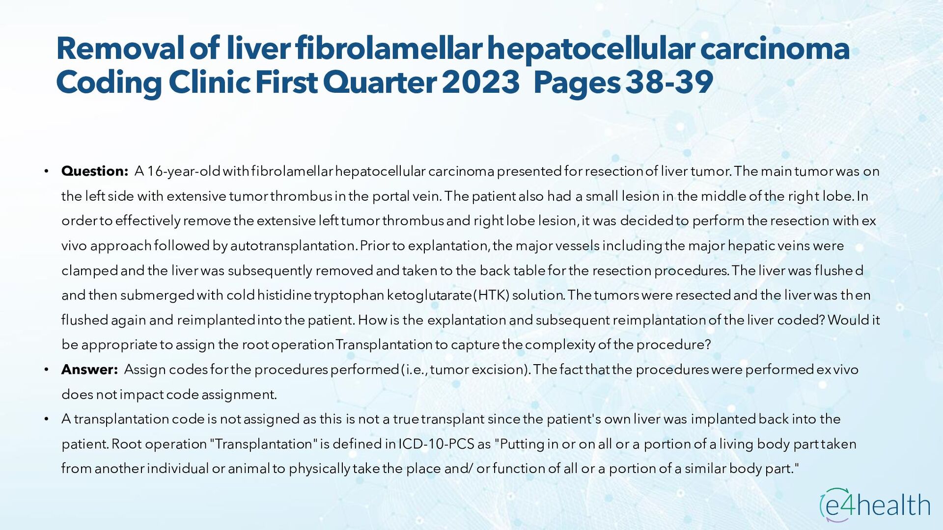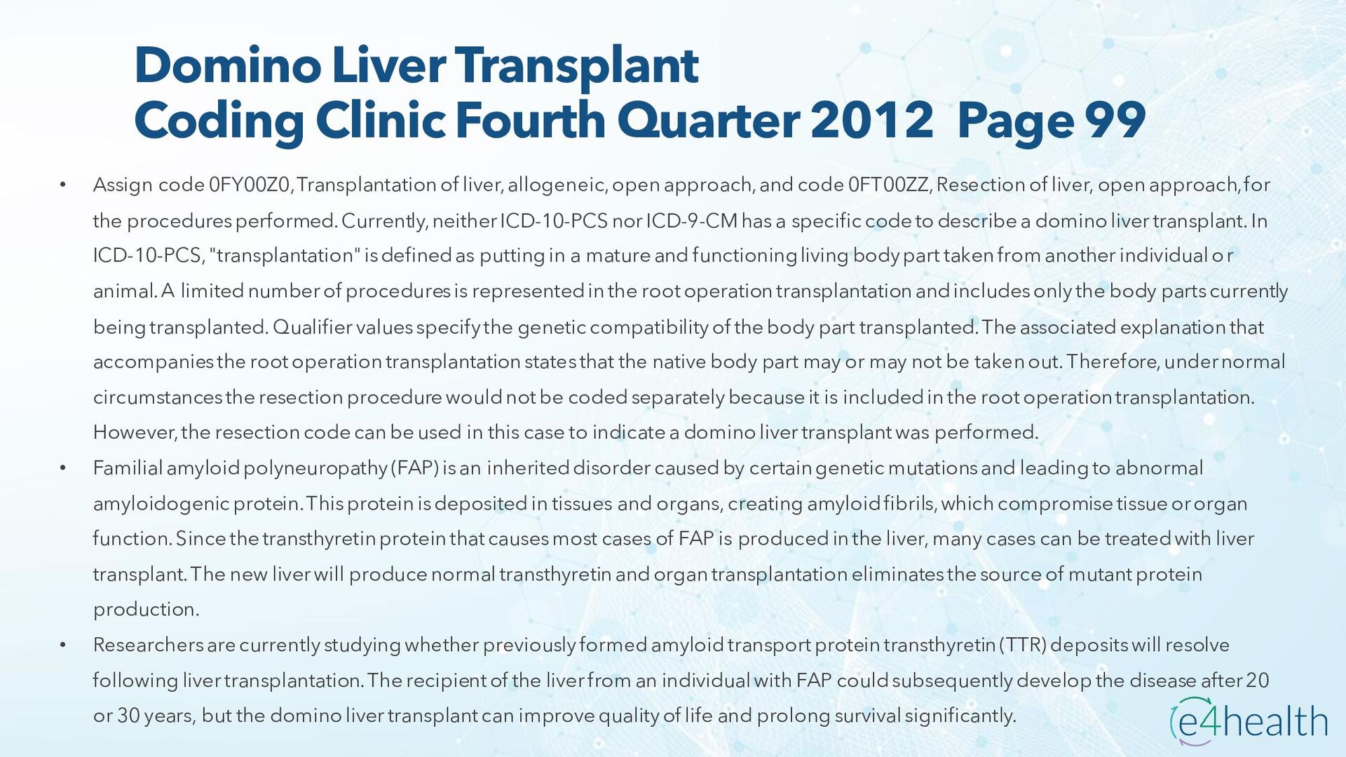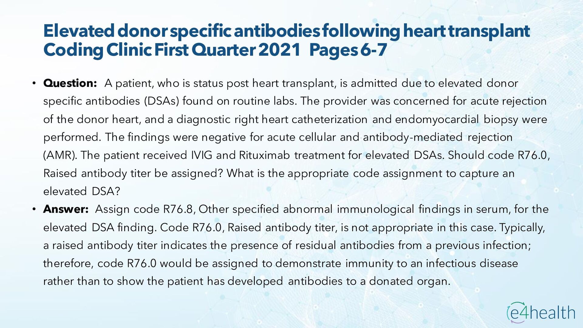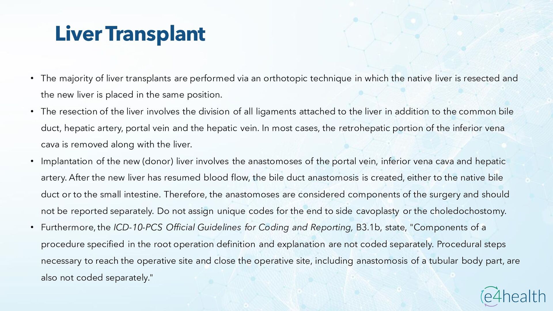 • Question: There is some confusion among coders regarding what is coded when coding a heart transplant. The patient was admitted and underwent an orthostatic cardiac allograft transplantation utilizing total cardiopulmonary bypass along with an open sternotomy covered with Ioban. Because excessive transfusions were required, a Mahurkar catheter was inserted percutaneously through the left common femoral vein and the end tip placed in the inferior vena cava (IVC). The patient also had an intra-aortic balloon pump for counterpulsation which was left in place after the procedure. The pacemaker was also left in place due to coagulopathy. How should this procedure be coded in ICD-10-PCS? • Answer: For the heart transplantation surgery, assign the following ICD-10-PCS codes: • 02YA0Z0, Transplantation of heart, allogeneic, open approach • 5A02210, Assistance with cardiac output using balloon pump, continuous** • 5A1223Z, Performance of cardiac pacing, continuous • 5A1221Z, Performance of cardiac output, continuous • 06H033Z, Insertion of infusion device into inferior vena cava, percutaneous approach • Typically, auxiliary procedures done solely to support the performance of a surgical procedure are not coded separately. Cardiopulmonary bypass is an exception. When a surgical procedure is performed with cardiopulmonary bypass it is coded separately in ICD-9-CM and ICD-10-PCS. In this case, the transfusion catheter, the intra-aortic balloon pump and the temporary pacing were all required to be continued beyond the operative episode of the heart transplant. In that sense they are more than just temporary auxiliary support of the surgical procedure, and should be separately coded. **Superceded Advice: This advice regarding intra-aortic balloon pump insertion has been superceded by Coding Clinic, Second Quarter, 2018, page 3. This Photo by Unknown author is licensed under CC BY-SA-NC.