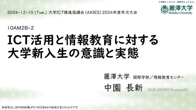 大学ICT推進協議会(AXIES)2024年度年次大会 本研究は、JSPS科研費JP21K02864の助成を受けたものです 10AM2B-2
