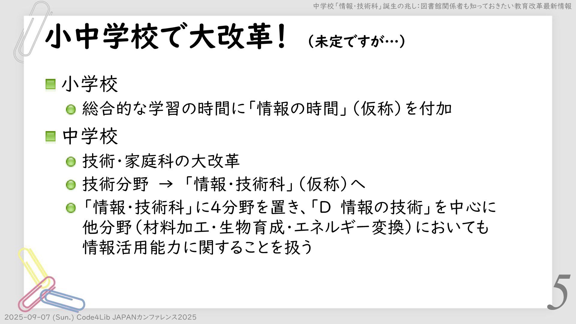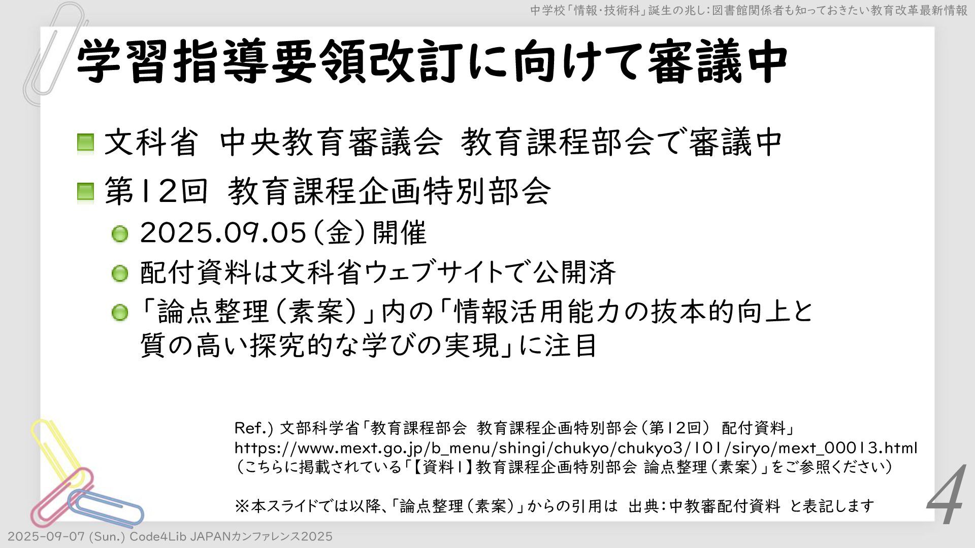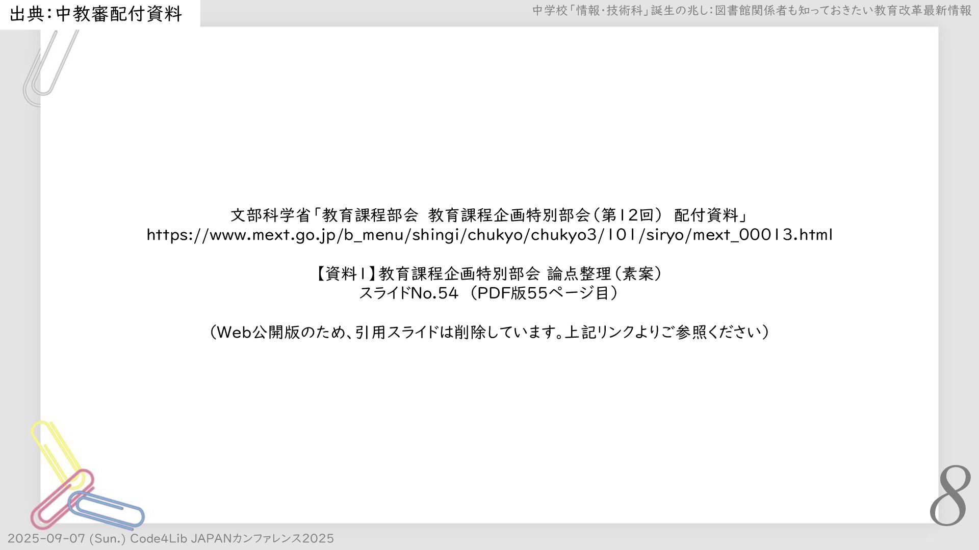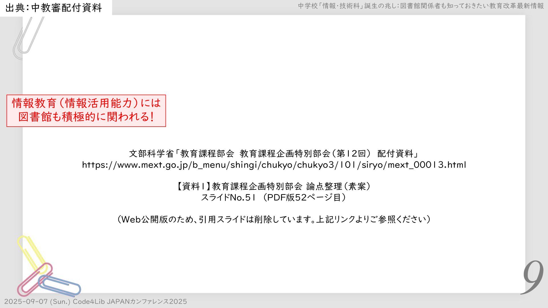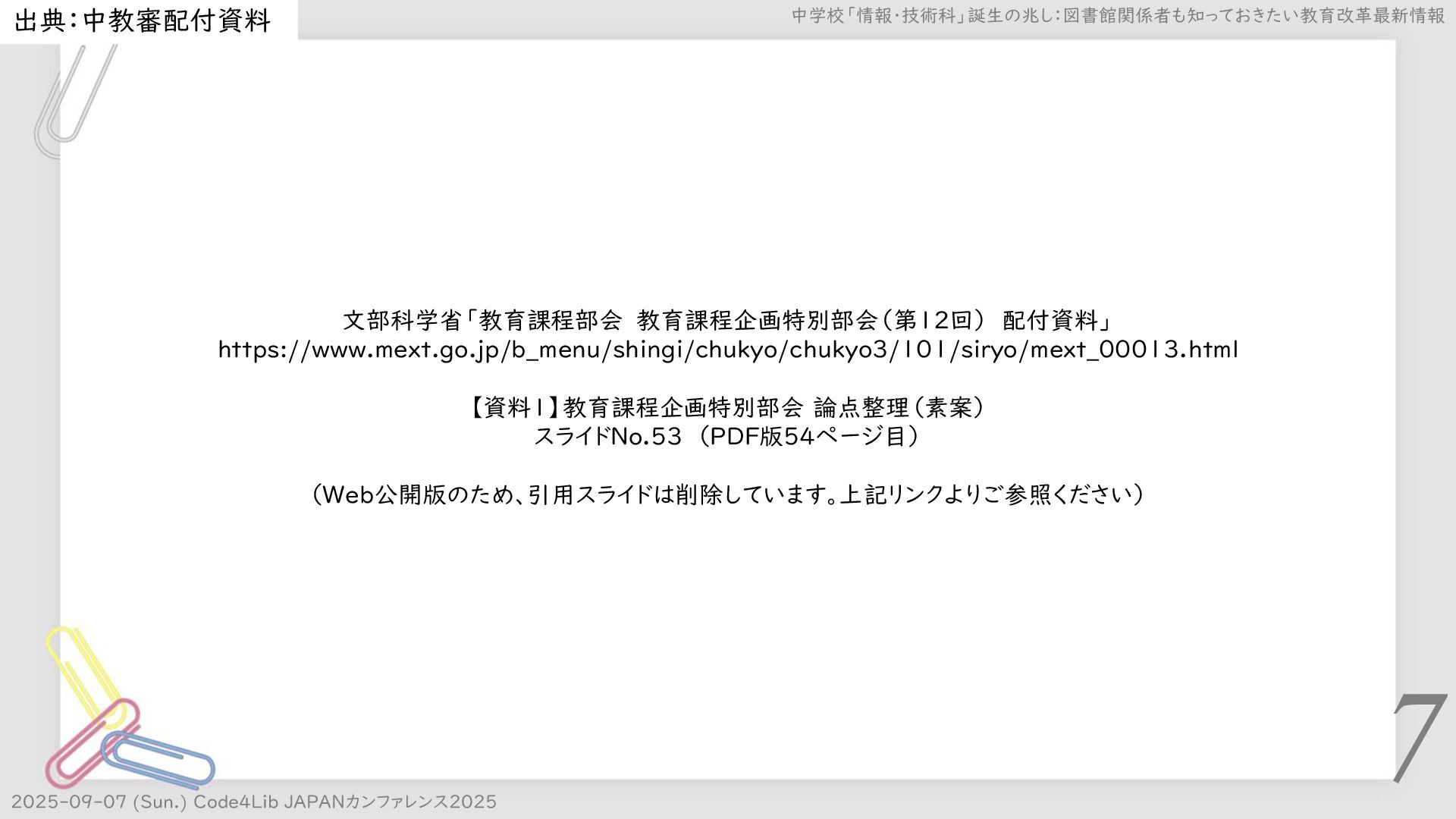 質の高い探究的な学びの実現」に注目 2025-09-07 (Sun.) Code4Lib JAPANカンファレンス2025 中学校「情報・技術科」誕生の兆し:図書館関係者も知っておきたい教育改革最新情報 Ref.) 文部科学省「教育課程部会 教育課程企画特別部会(第12回) 配付資料」 https://www.mext.go.jp/b_menu/shingi/chukyo/chukyo3/101/siryo/mext_00013.html (こちらに掲載されている「【資料1】教育課程企画特別部会 論点整理(素案)」をご参照ください) ※本スライドでは以降、「論点整理(素案)」からの引用は 出典:中教審配付資料 と表記します