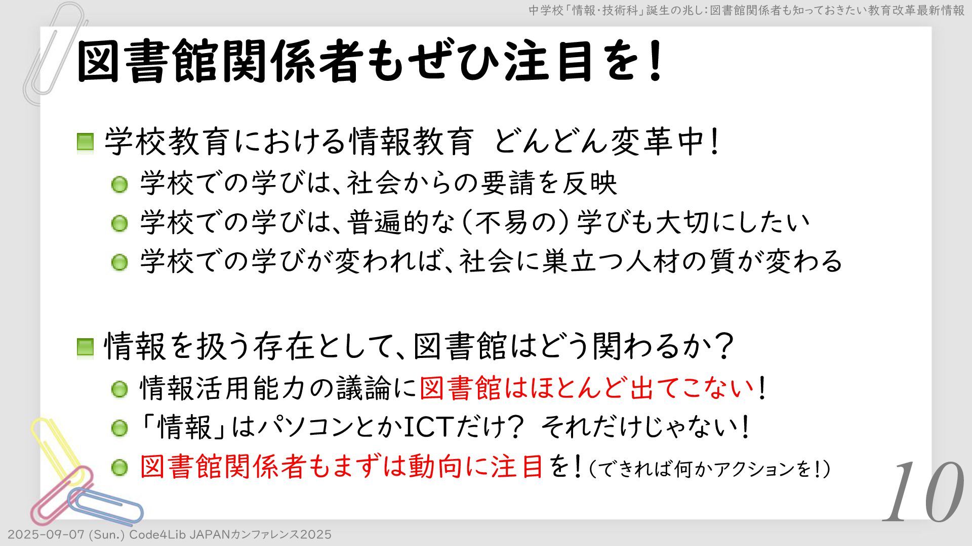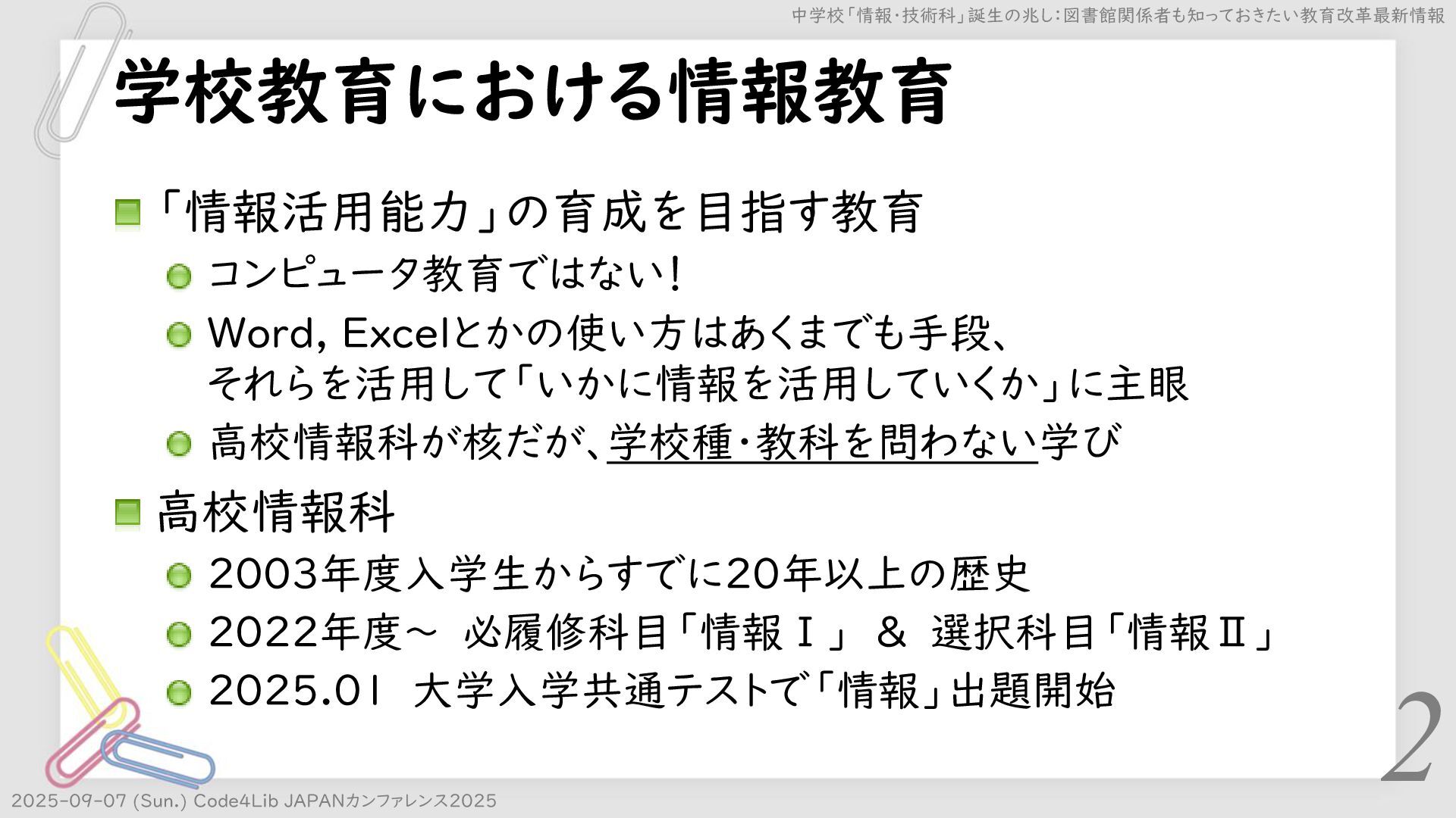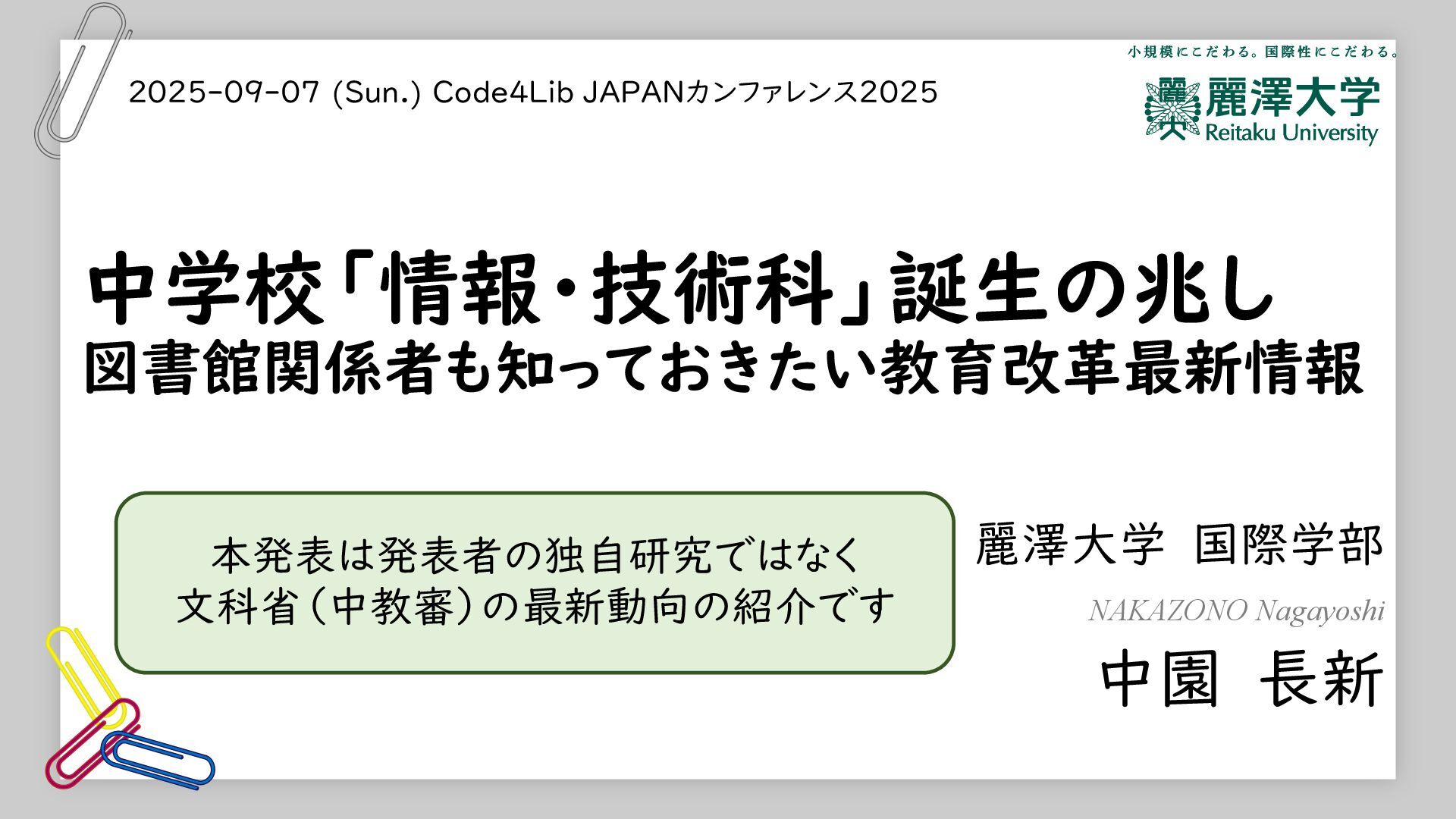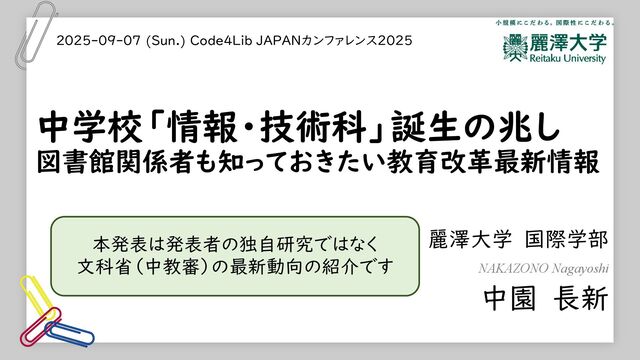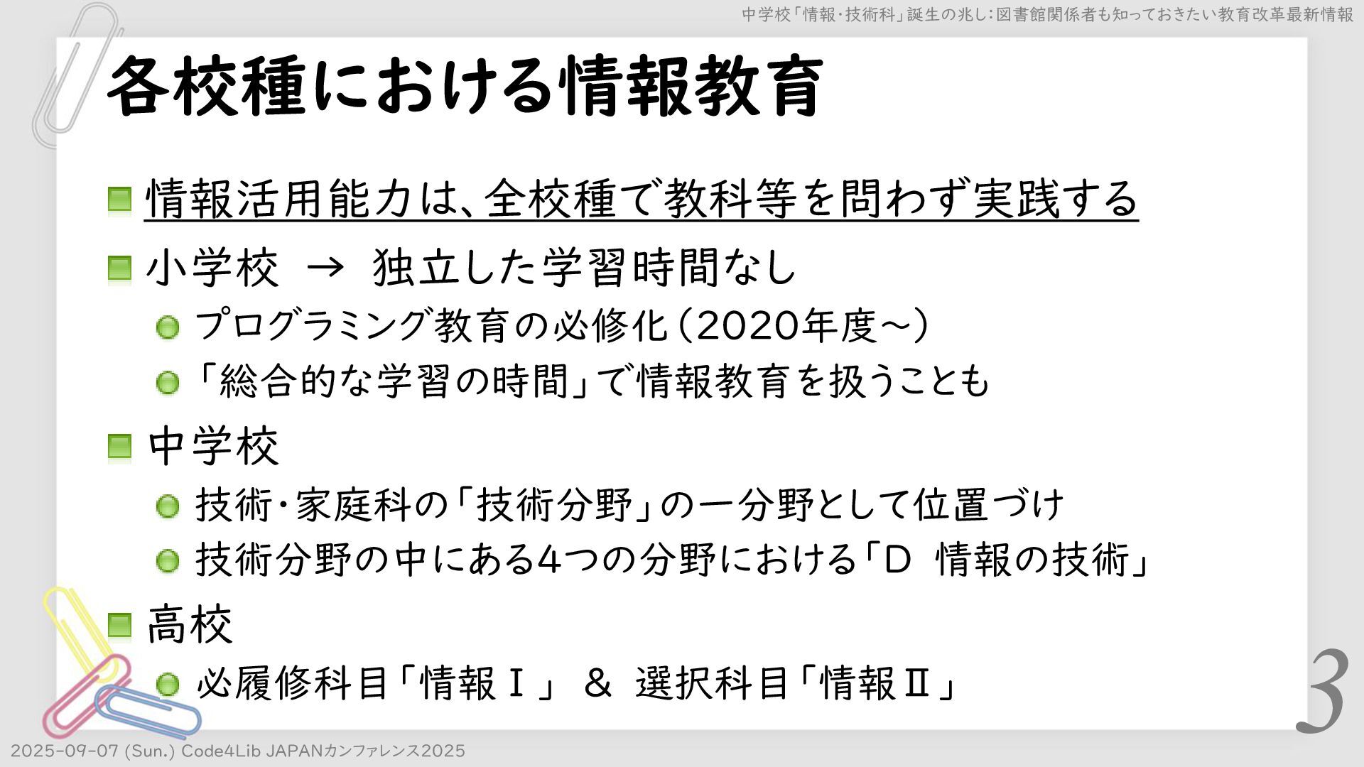 質の高い探究的な学びの実現」に注目 2025-09-07 (Sun.) Code4Lib JAPANカンファレンス2025 中学校「情報・技術科」誕生の兆し:図書館関係者も知っておきたい教育改革最新情報 Ref.) 文部科学省「教育課程部会 教育課程企画特別部会(第12回) 配付資料」 https://www.mext.go.jp/b_menu/shingi/chukyo/chukyo3/101/siryo/mext_00013.html (こちらに掲載されている「【資料1】教育課程企画特別部会 論点整理(素案)」をご参照ください) ※本スライドでは以降、「論点整理(素案)」からの引用は 出典:中教審配付資料 と表記します