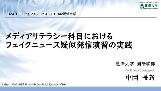 3. Moodle から【演習用】フォーム(Slido)を開き、 各ニュースタイトルの「タイトルのみ」を提出する (氏名や真偽は書かない) 4. 受講者全員の提出が終わったら、Slidoですべての タイトルを参照し、もっとも真実っぽい「フェイク ニュース」のタイトル(1つ)に投票する 5. 投票が終わったら、どのタイトルが多くの票を獲得 したか、クラス内で確認する 6. 【提出用】フォームの提出内容をクラス内で共有し、 答え合わせをする 2024-03-09 (Sat.) IPSJ-CE174@麗澤大学 メディアリテラシー科目におけるフェイクニュース疑似発信演習の実践 7 Slido News 1 News 2 News 3 News 4 … Google Forms ID, Name Truth News Fake News ID, Name Truth News Fake News … Truth? Fake? (2) judgment (1) post (3) checking answers