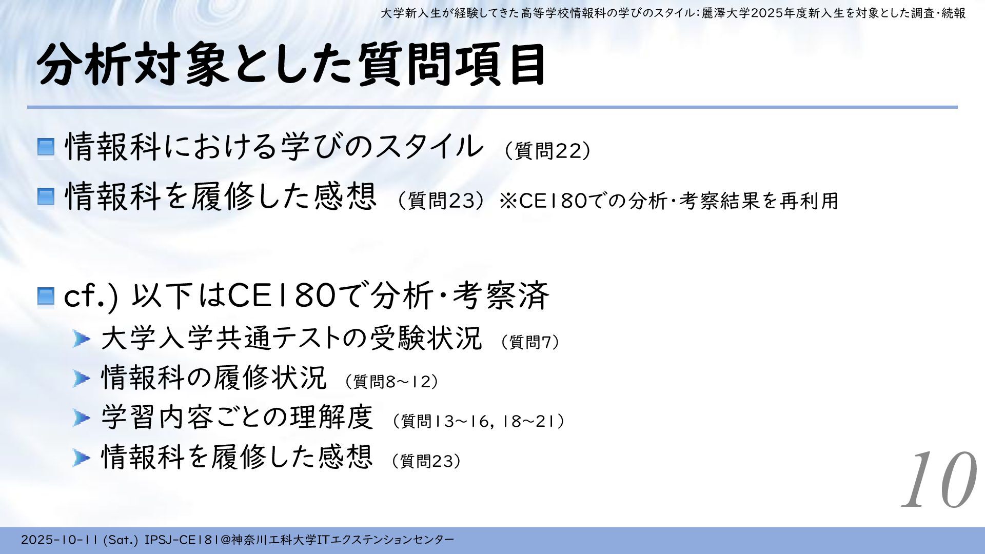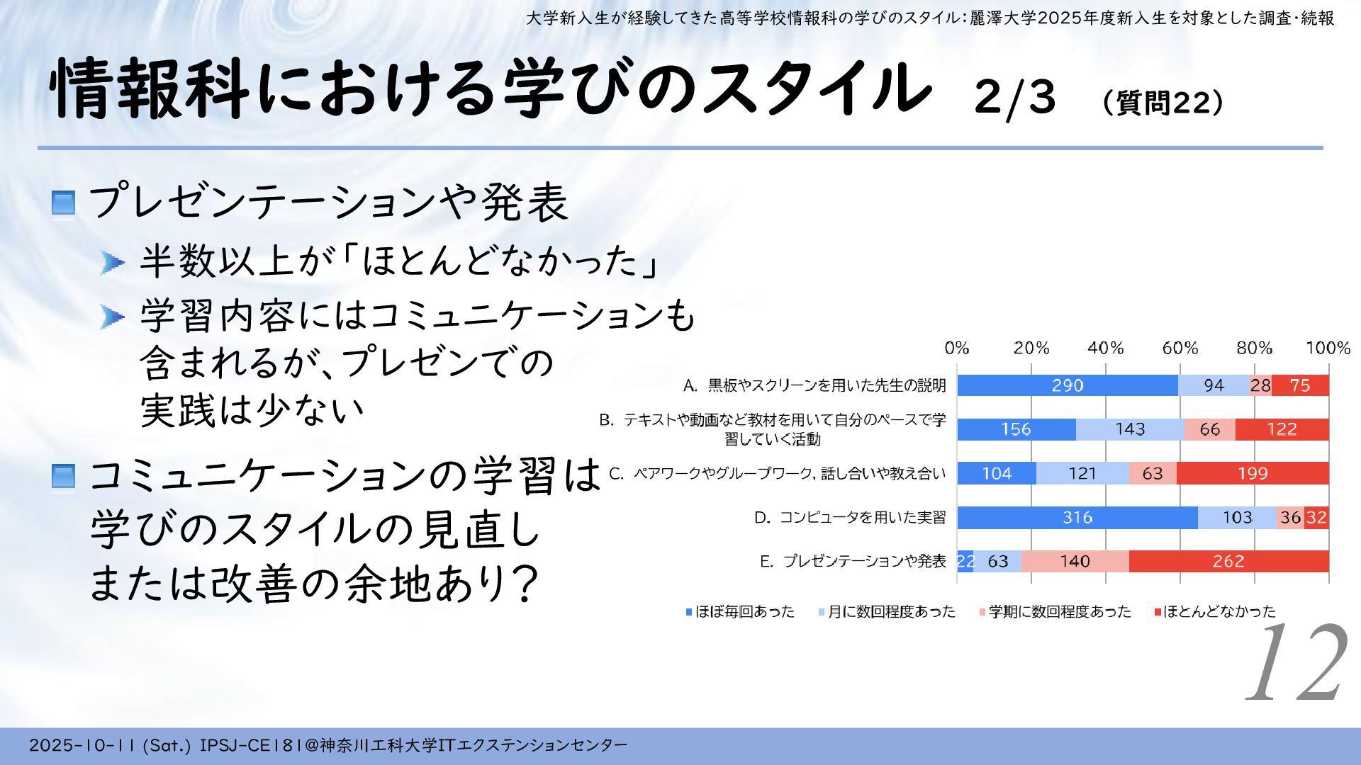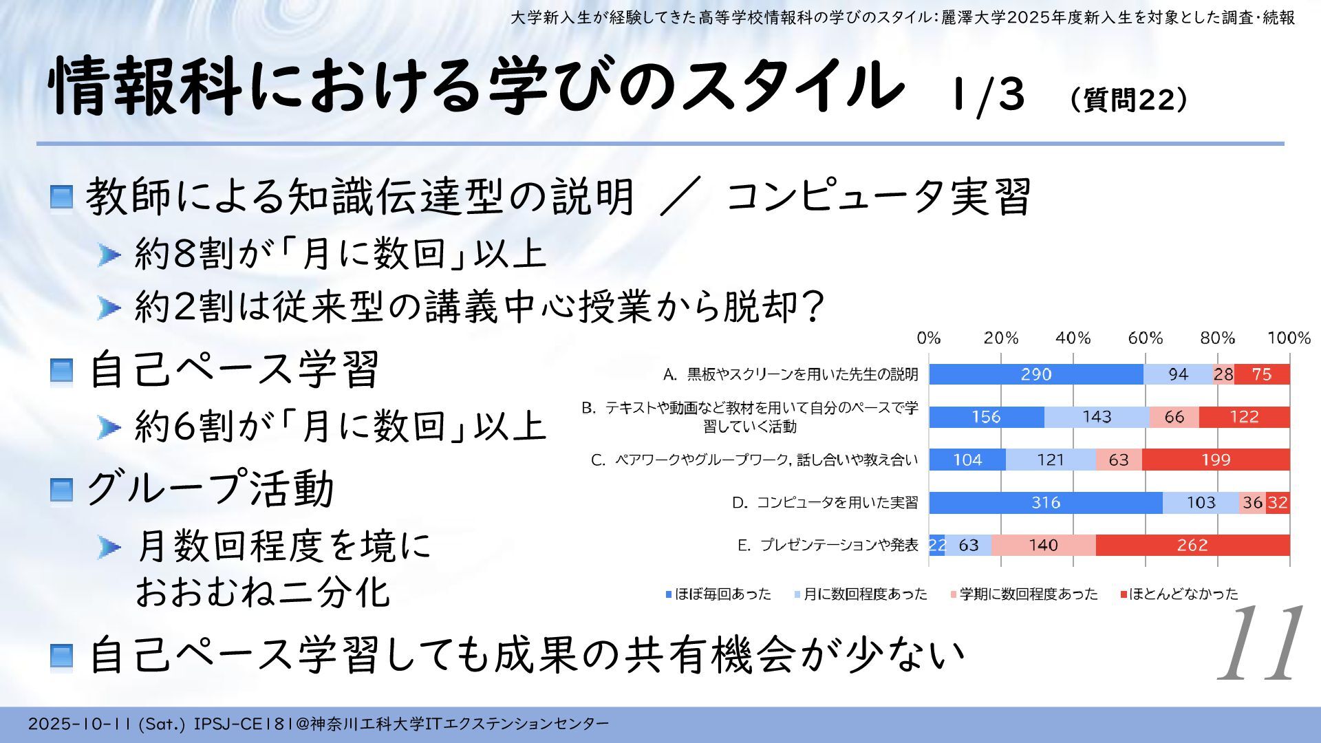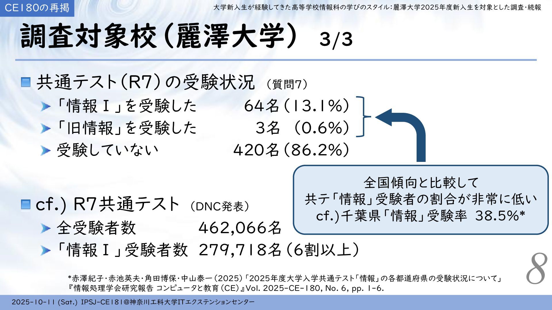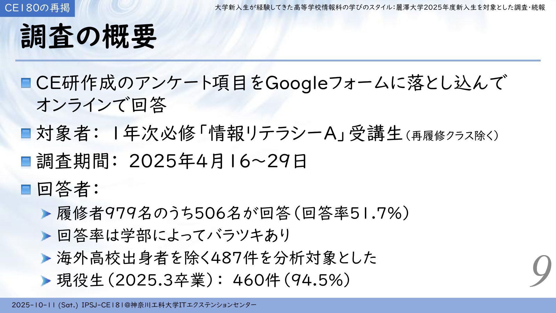 420名(86.2%) cf.) R7共通テスト (DNC発表) 全受験者数 462,066名 「情報Ⅰ」受験者数 279,718名(6割以上) 2025-10-11 (Sat.) IPSJ-CE181@神奈川工科大学ITエクステンションセンター 大学新入生が経験してきた高等学校情報科の学びのスタイル:麗澤大学2025年度新入生を対象とした調査・続報 8 全国傾向と比較して 共テ「情報」受験者の割合が非常に低い cf.)千葉県「情報」受験率 38.5%* *赤澤紀子・赤池英夫・角田博保・中山泰一(2025)「2025年度大学入学共通テスト「情報」の各都道府県の受験状況について」 『情報処理学会研究報告 コンピュータと教育(CE)』Vol. 2025-CE-180, No. 6, pp. 1-6. CE180の再掲