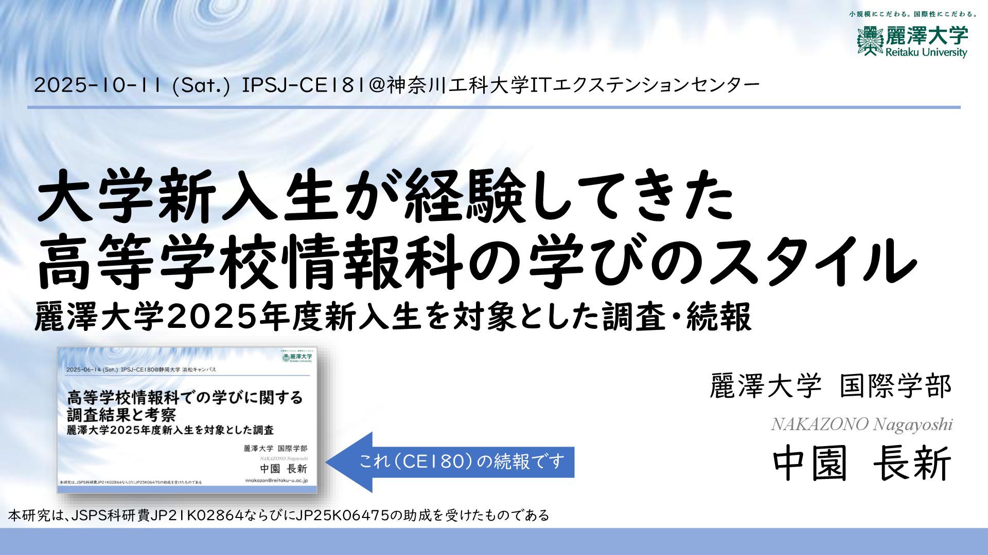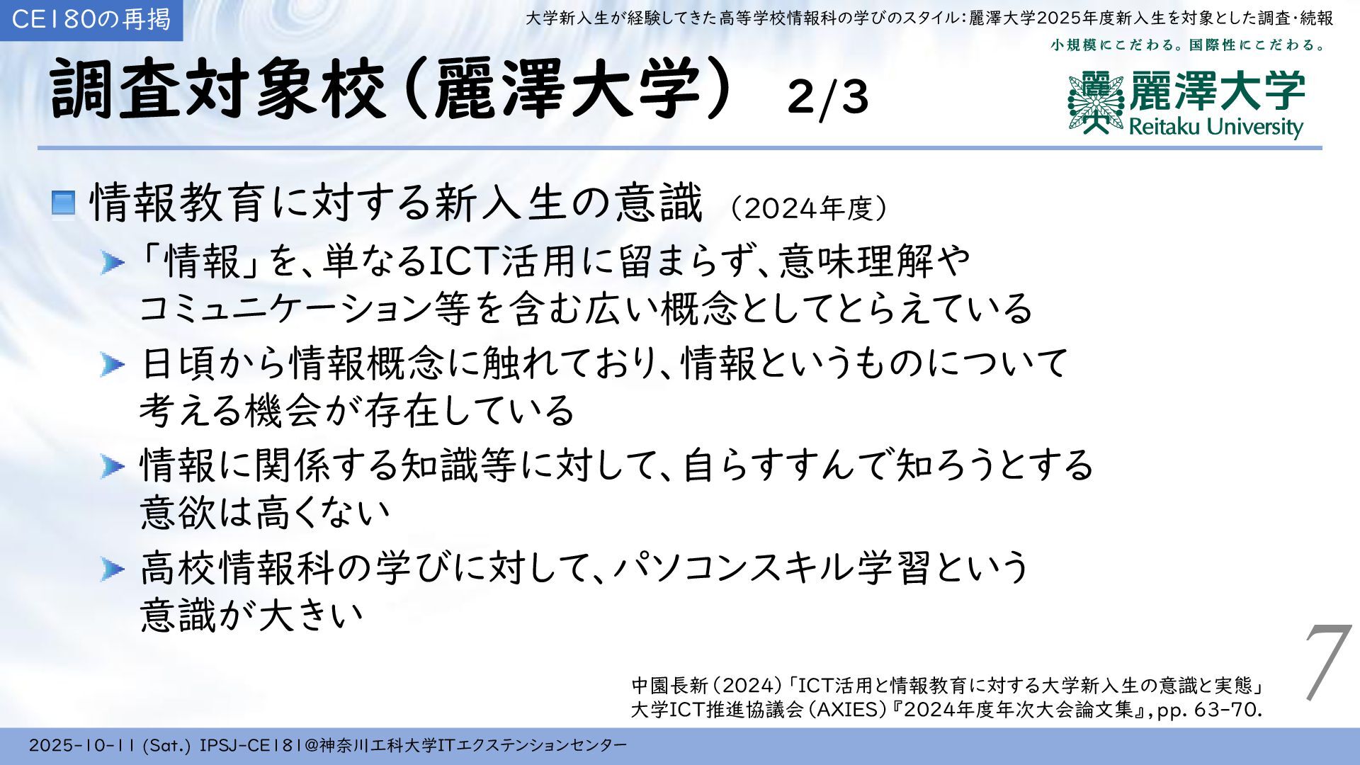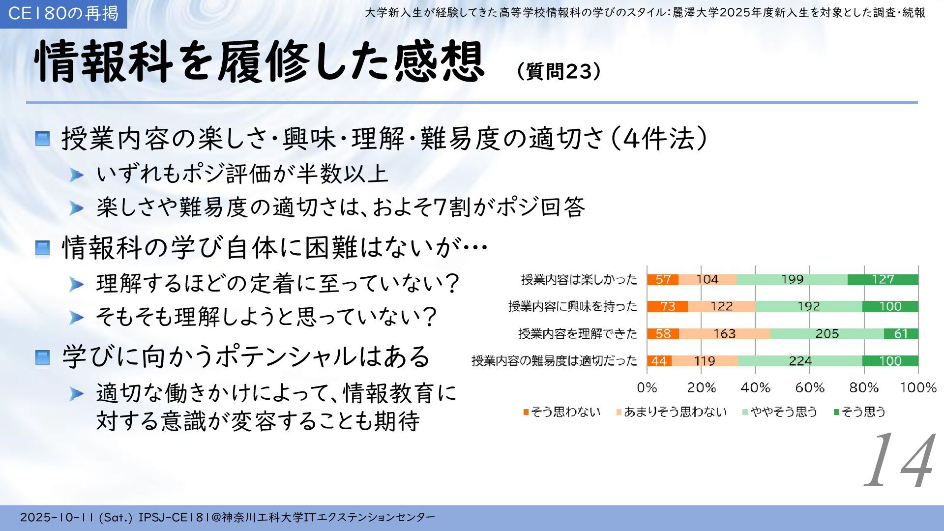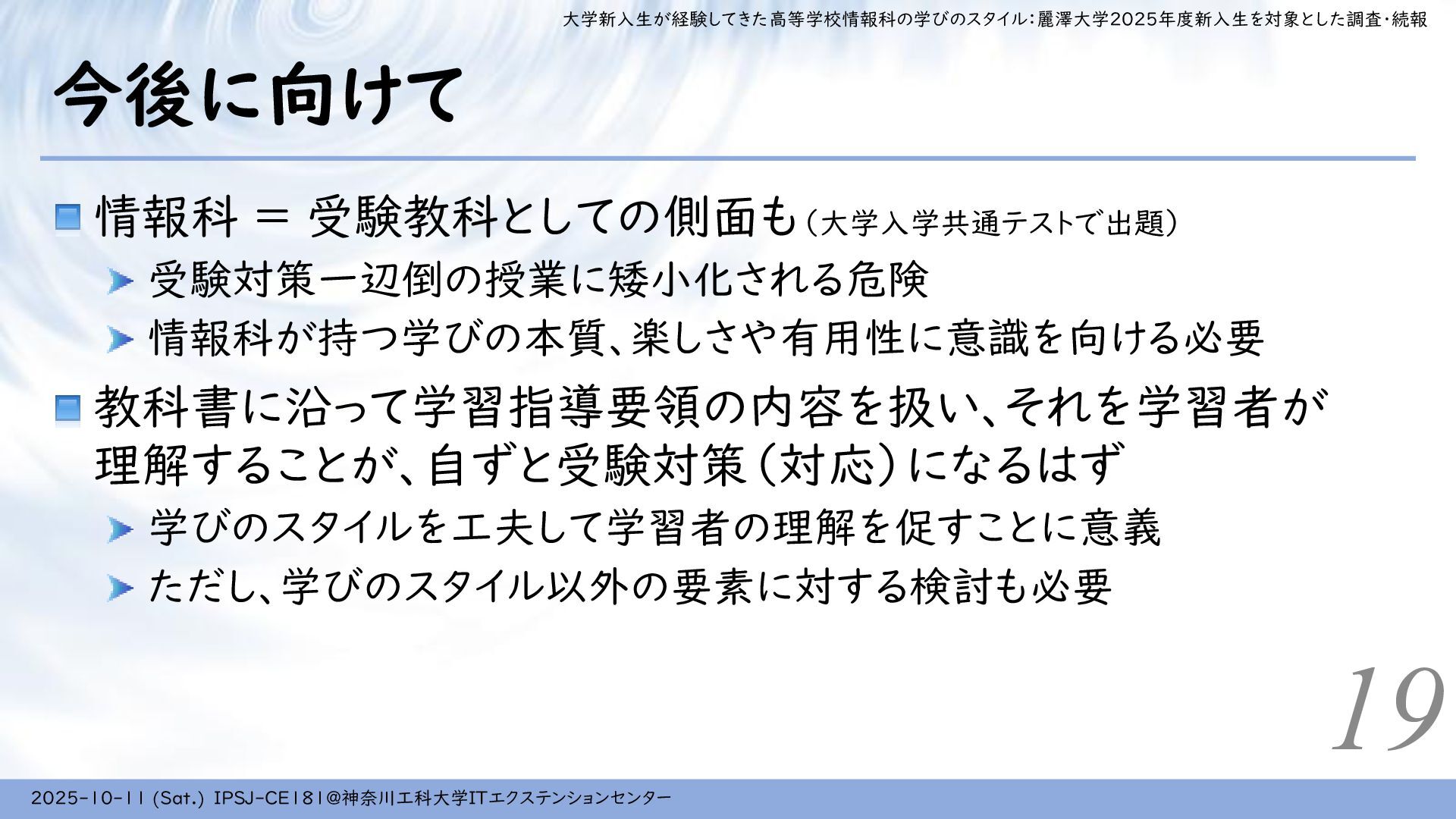420名(86.2%) cf.) R7共通テスト (DNC発表) 全受験者数 462,066名 「情報Ⅰ」受験者数 279,718名(6割以上) 2025-10-11 (Sat.) IPSJ-CE181@神奈川工科大学ITエクステンションセンター 大学新入生が経験してきた高等学校情報科の学びのスタイル:麗澤大学2025年度新入生を対象とした調査・続報 8 全国傾向と比較して 共テ「情報」受験者の割合が非常に低い cf.)千葉県「情報」受験率 38.5%* *赤澤紀子・赤池英夫・角田博保・中山泰一(2025)「2025年度大学入学共通テスト「情報」の各都道府県の受験状況について」 『情報処理学会研究報告 コンピュータと教育(CE)』Vol. 2025-CE-180, No. 6, pp. 1-6. CE180の再掲