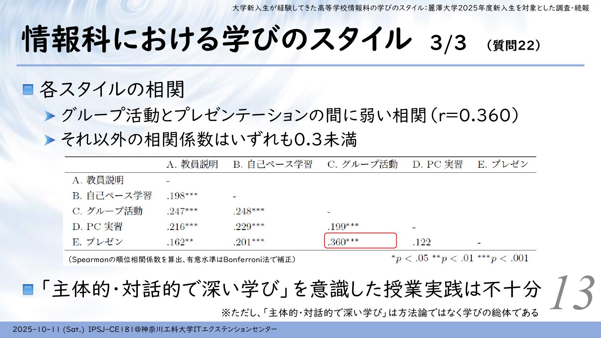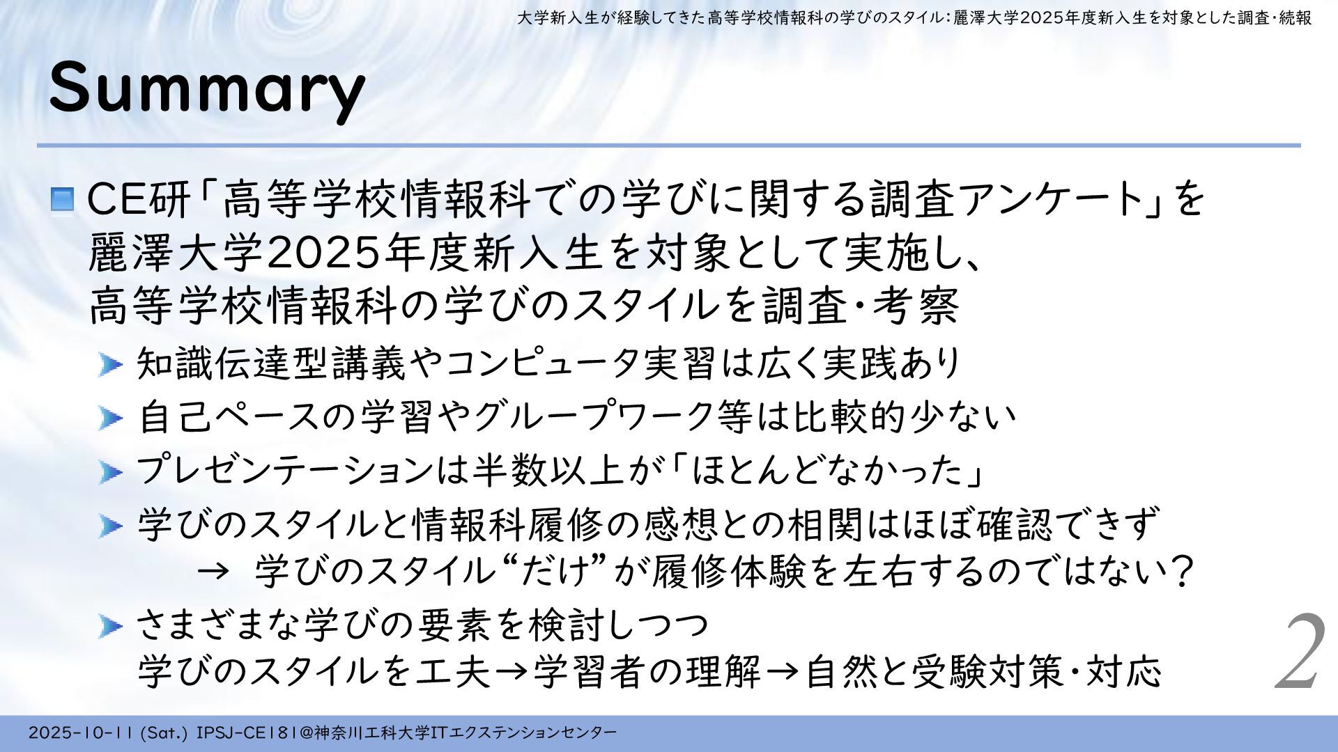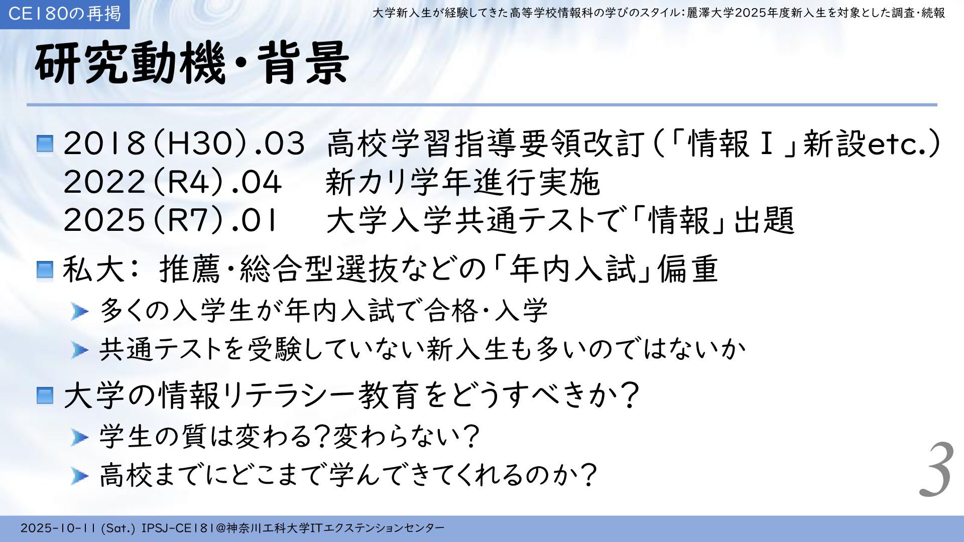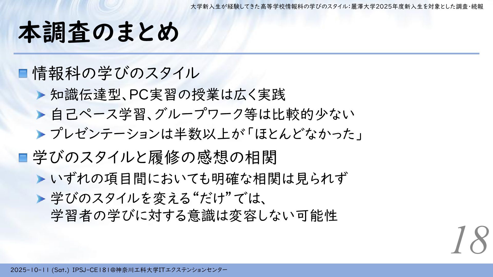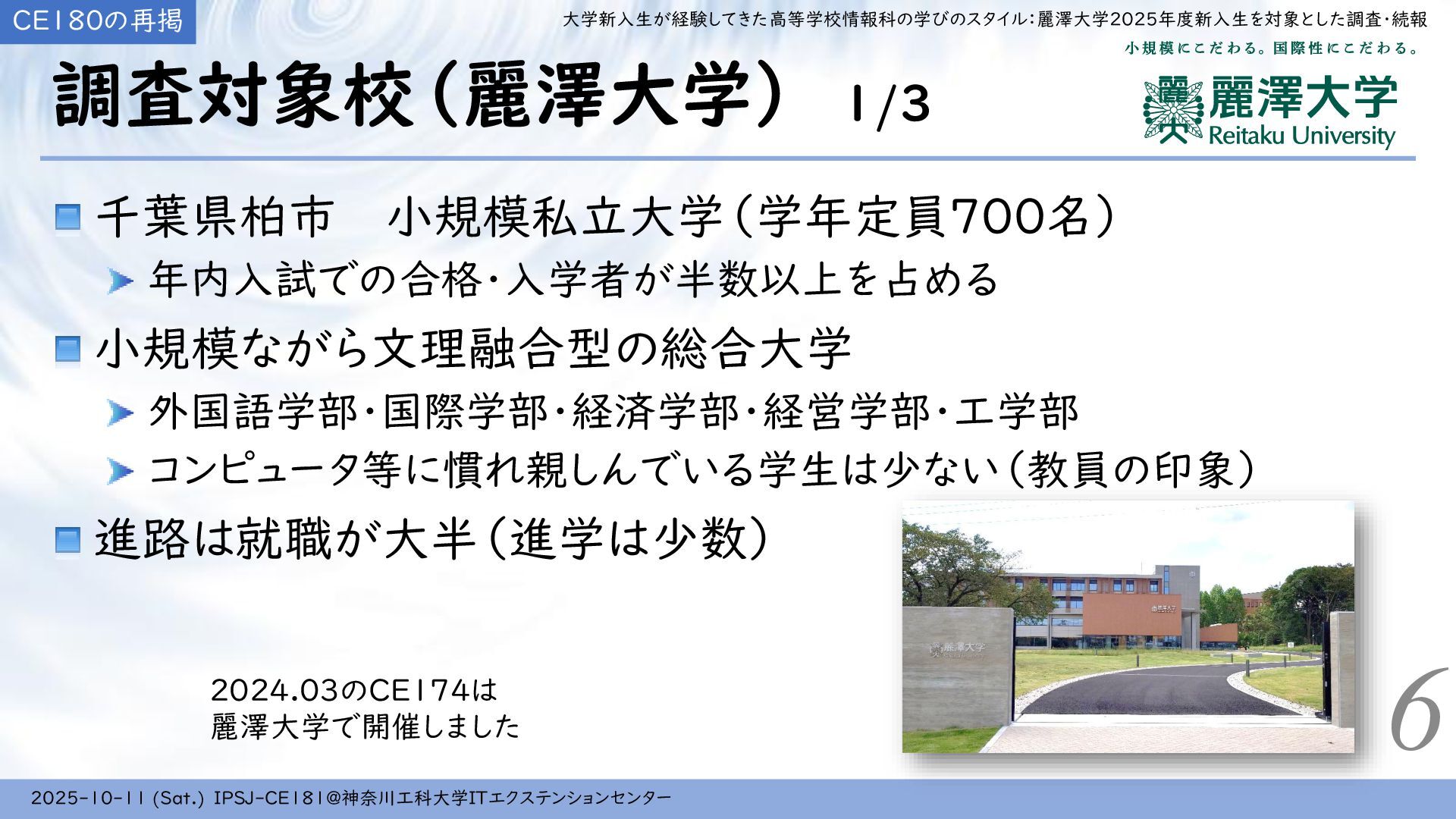 420名(86.2%) cf.) R7共通テスト (DNC発表) 全受験者数 462,066名 「情報Ⅰ」受験者数 279,718名(6割以上) 2025-10-11 (Sat.) IPSJ-CE181@神奈川工科大学ITエクステンションセンター 大学新入生が経験してきた高等学校情報科の学びのスタイル:麗澤大学2025年度新入生を対象とした調査・続報 8 全国傾向と比較して 共テ「情報」受験者の割合が非常に低い cf.)千葉県「情報」受験率 38.5%* *赤澤紀子・赤池英夫・角田博保・中山泰一(2025)「2025年度大学入学共通テスト「情報」の各都道府県の受験状況について」 『情報処理学会研究報告 コンピュータと教育(CE)』Vol. 2025-CE-180, No. 6, pp. 1-6. CE180の再掲