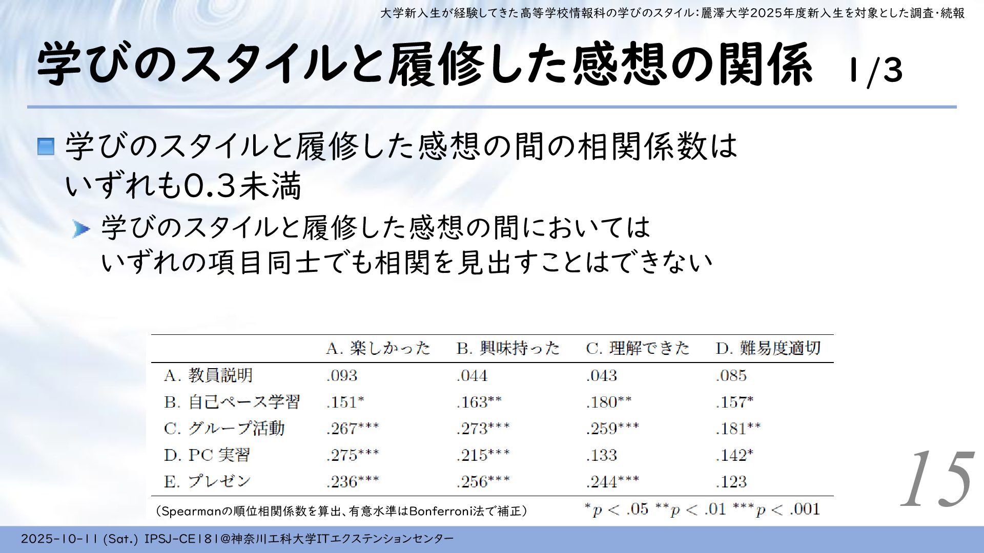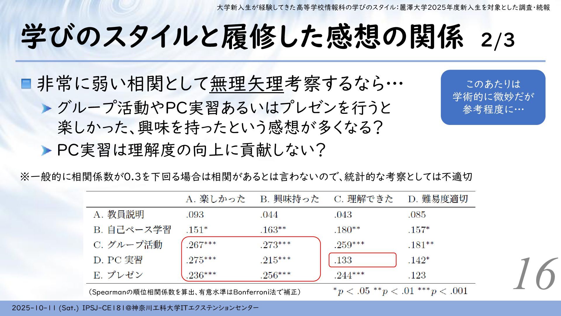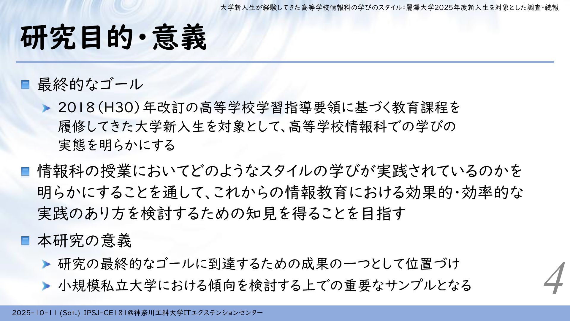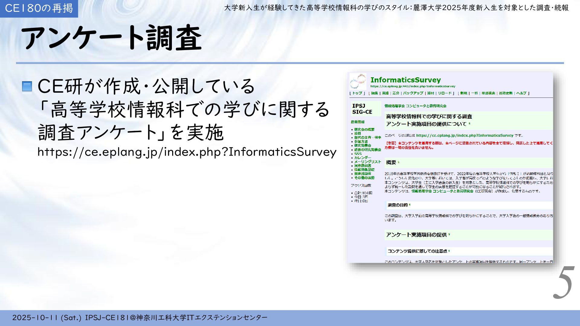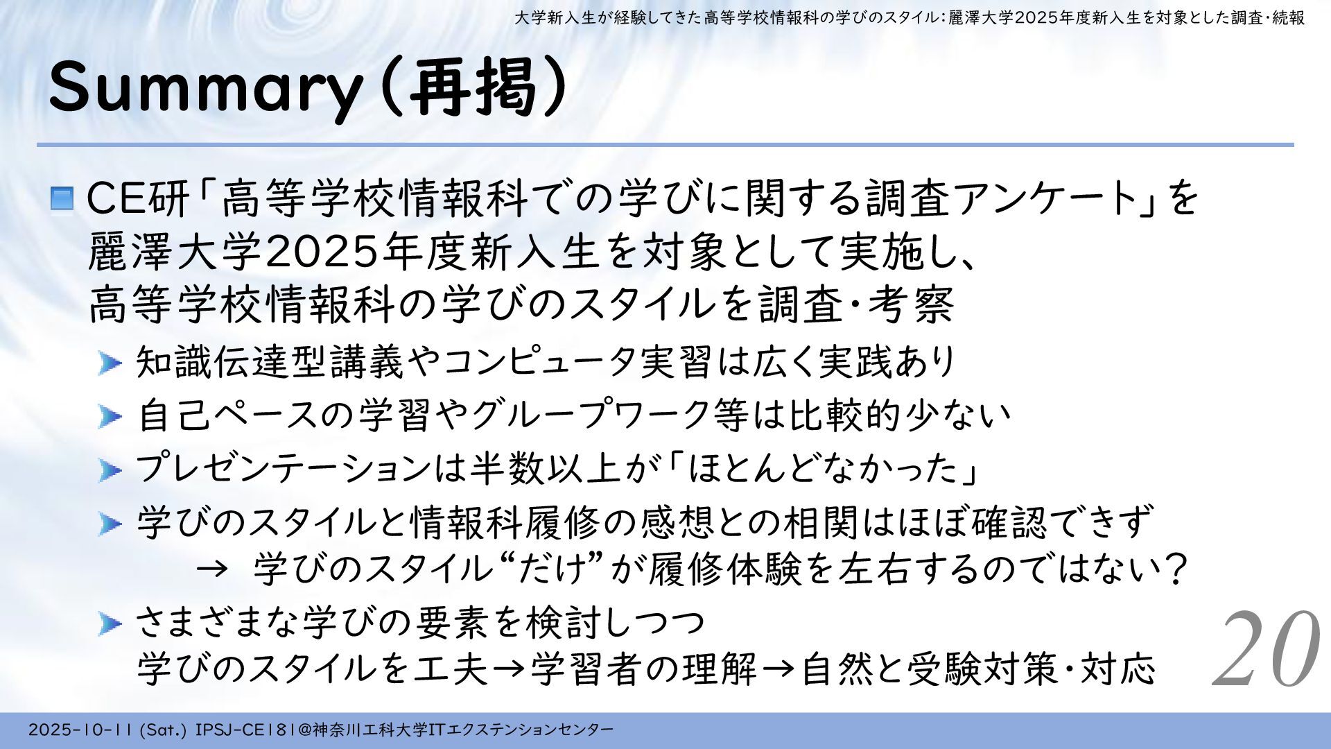 420名(86.2%) cf.) R7共通テスト (DNC発表) 全受験者数 462,066名 「情報Ⅰ」受験者数 279,718名(6割以上) 2025-10-11 (Sat.) IPSJ-CE181@神奈川工科大学ITエクステンションセンター 大学新入生が経験してきた高等学校情報科の学びのスタイル:麗澤大学2025年度新入生を対象とした調査・続報 8 全国傾向と比較して 共テ「情報」受験者の割合が非常に低い cf.)千葉県「情報」受験率 38.5%* *赤澤紀子・赤池英夫・角田博保・中山泰一(2025)「2025年度大学入学共通テスト「情報」の各都道府県の受験状況について」 『情報処理学会研究報告 コンピュータと教育(CE)』Vol. 2025-CE-180, No. 6, pp. 1-6. CE180の再掲